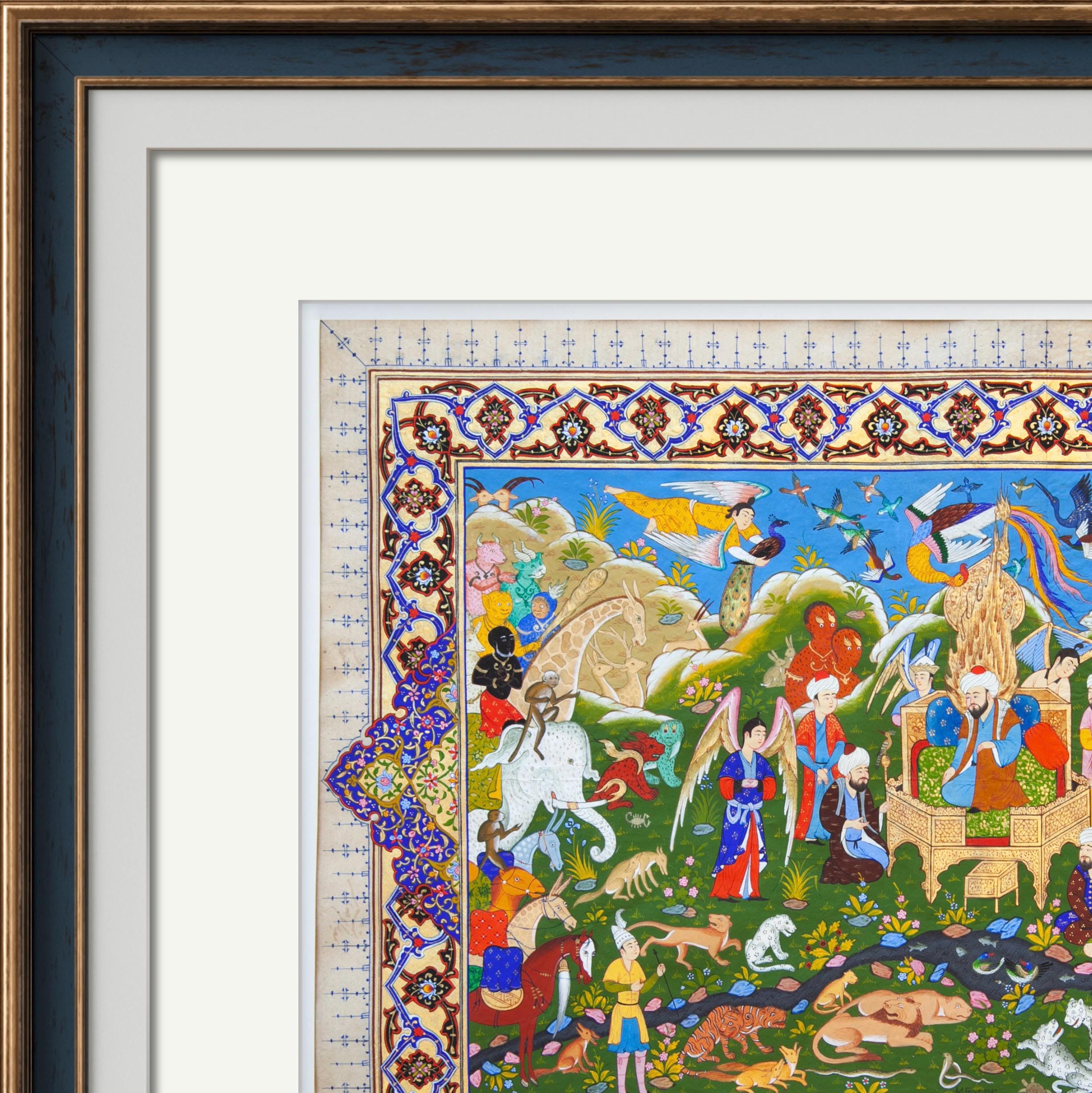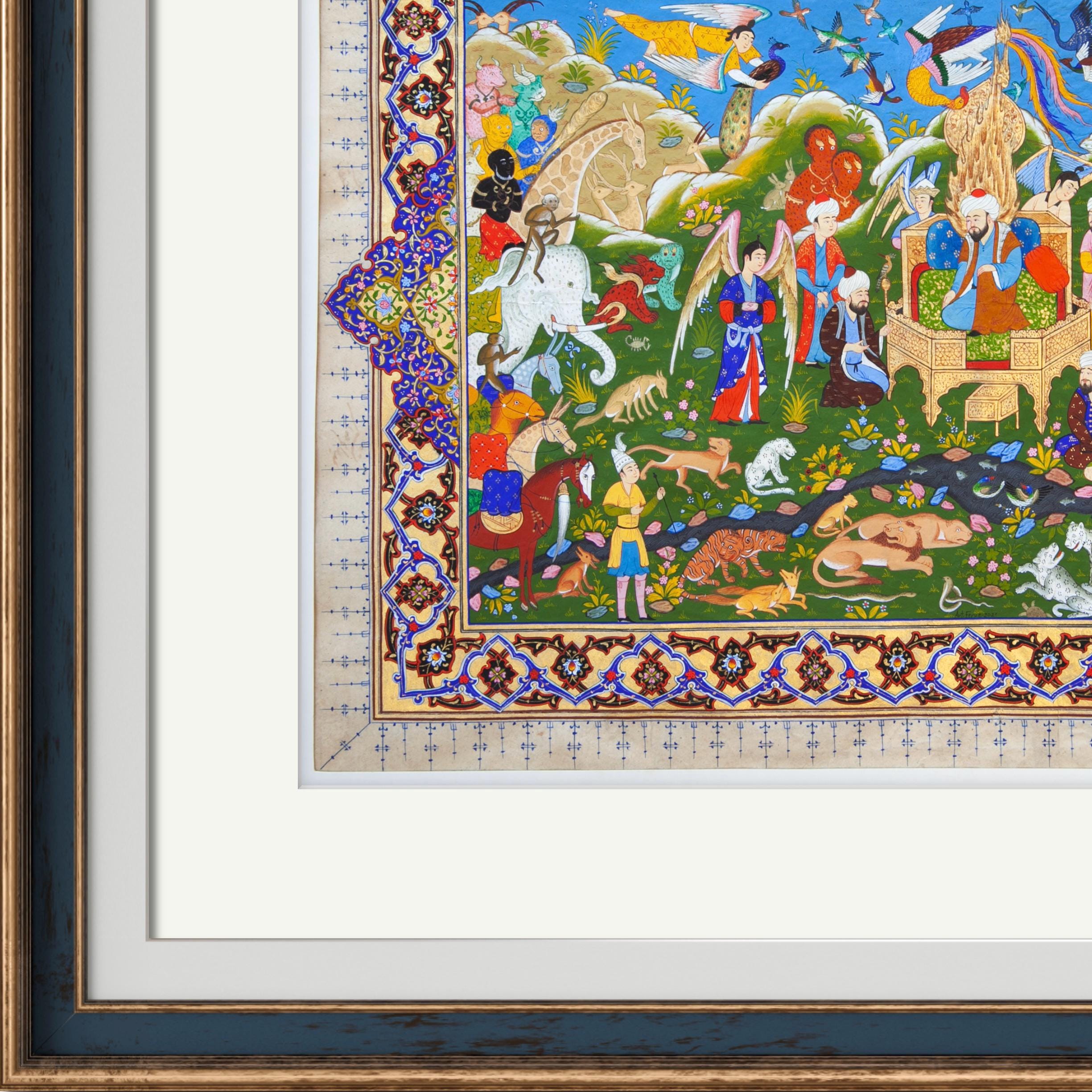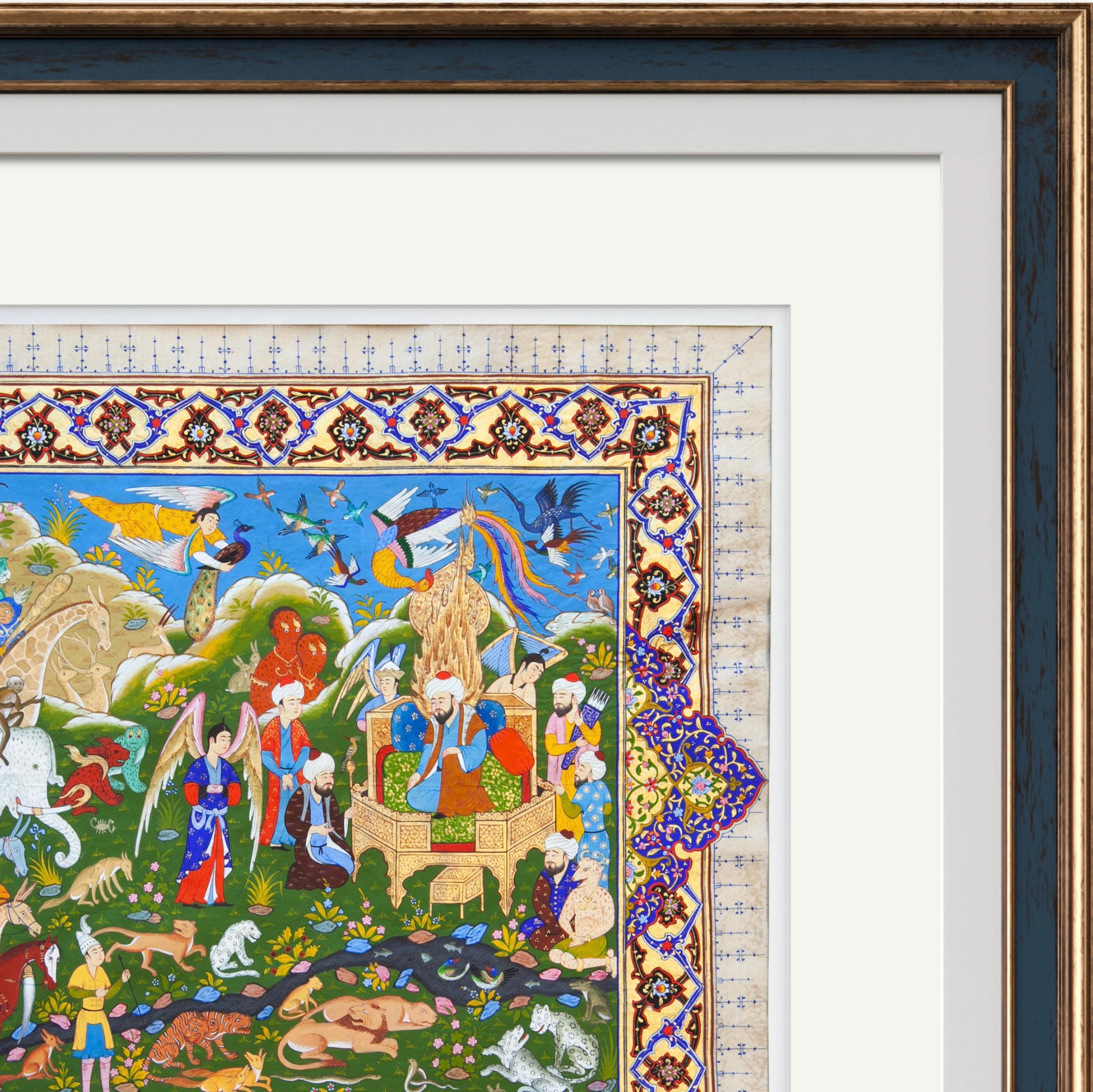 Each element of this masterpiece is meticulously crafted, reflecting the harmony and balance of Prophet Solomon’s kingdom. The lush greenery, vibrant colors, and intricate details of the celestial beings, animals, and birds symbolize unity and peace under divine guidance. The elaborate patterns of the border, painted in the tradition of Bukhara miniature art, frame the scene with elegance, drawing the viewer deeper into this timeless story.