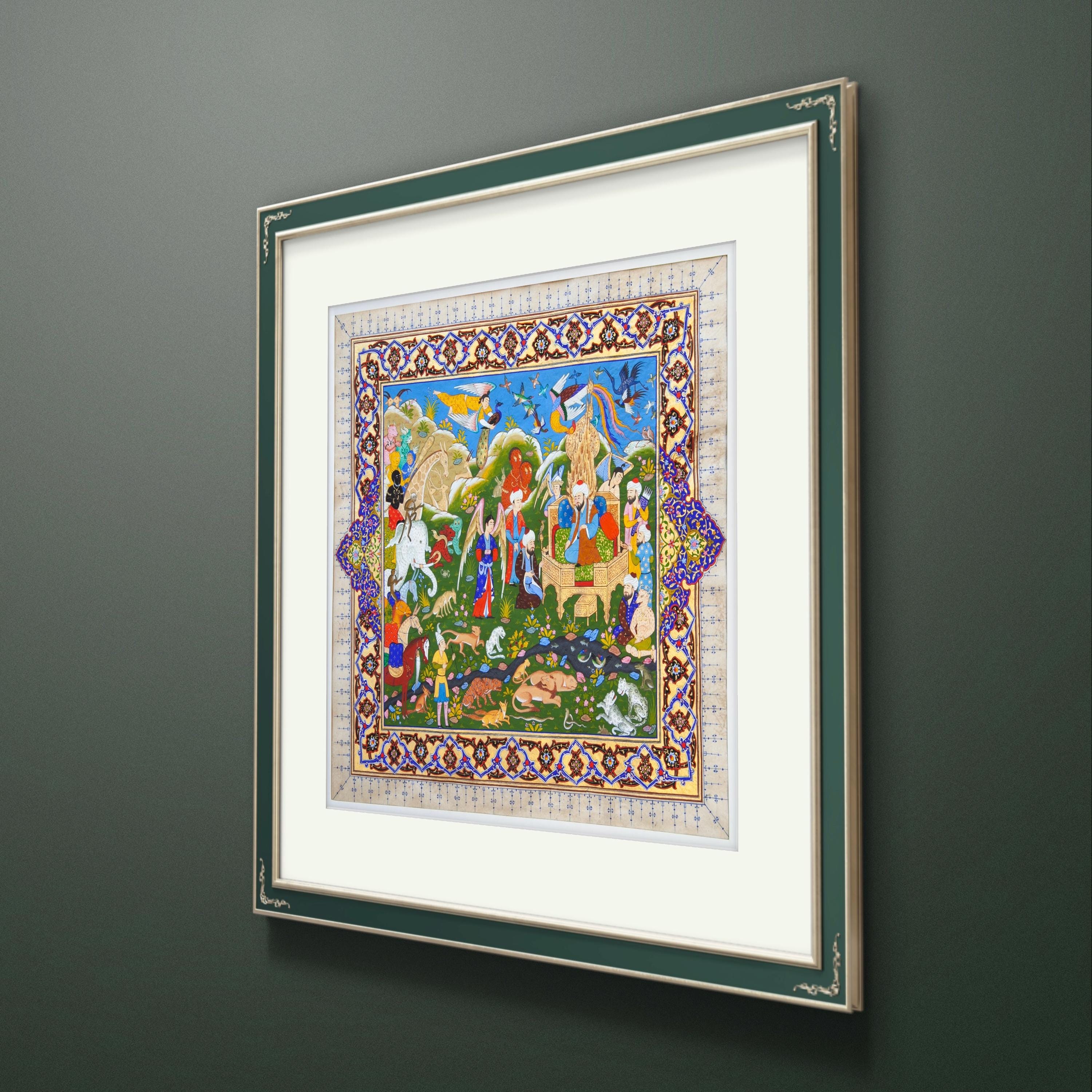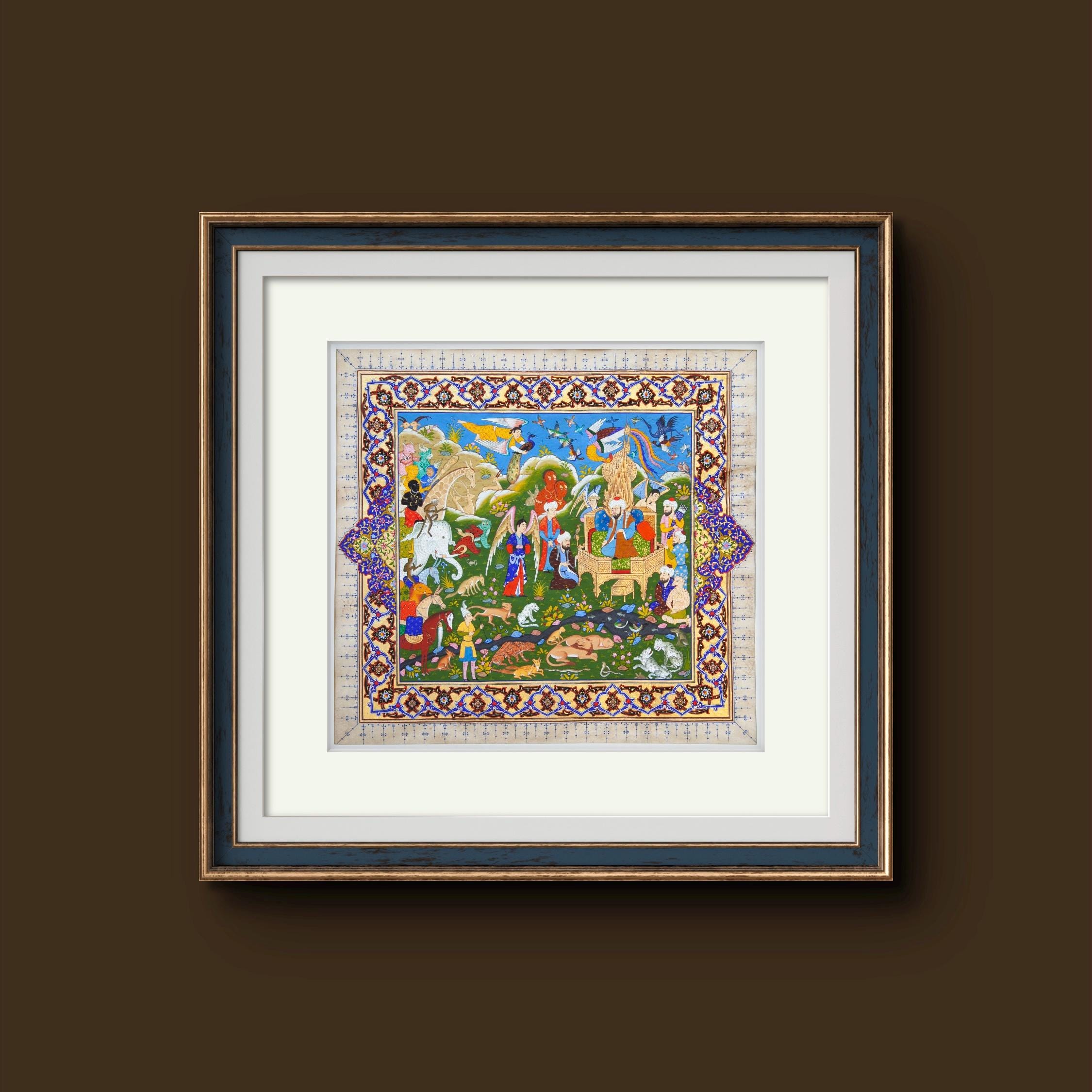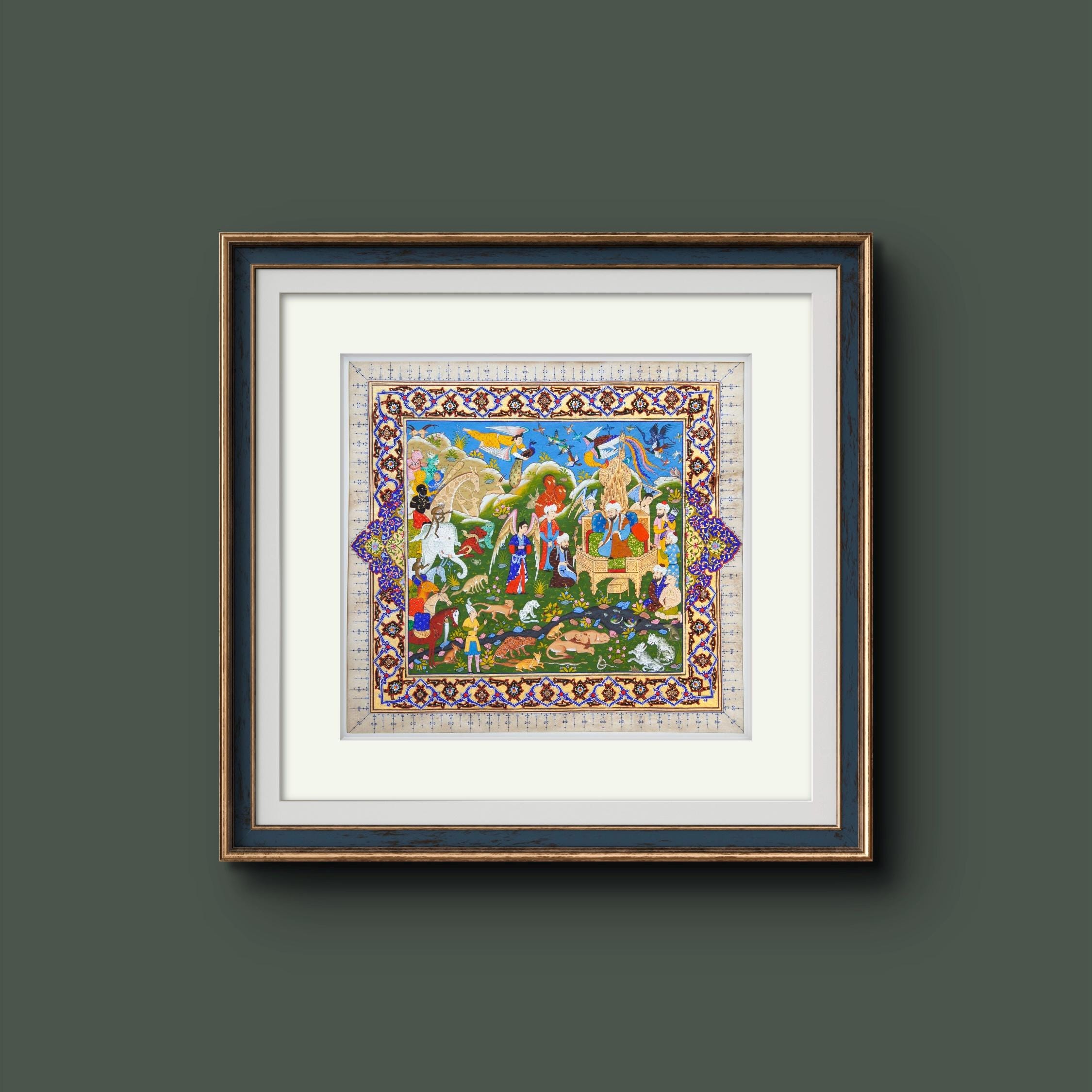 “The Gathering at Solomon’s Throne” is more than just a painting—it is a narrative of divine wisdom, harmony, and the beauty of creation. A perfect addition to any fine art collection, this piece is a tribute to the enduring legacy of Prophet Solomon and the cultural heritage of miniature painting.