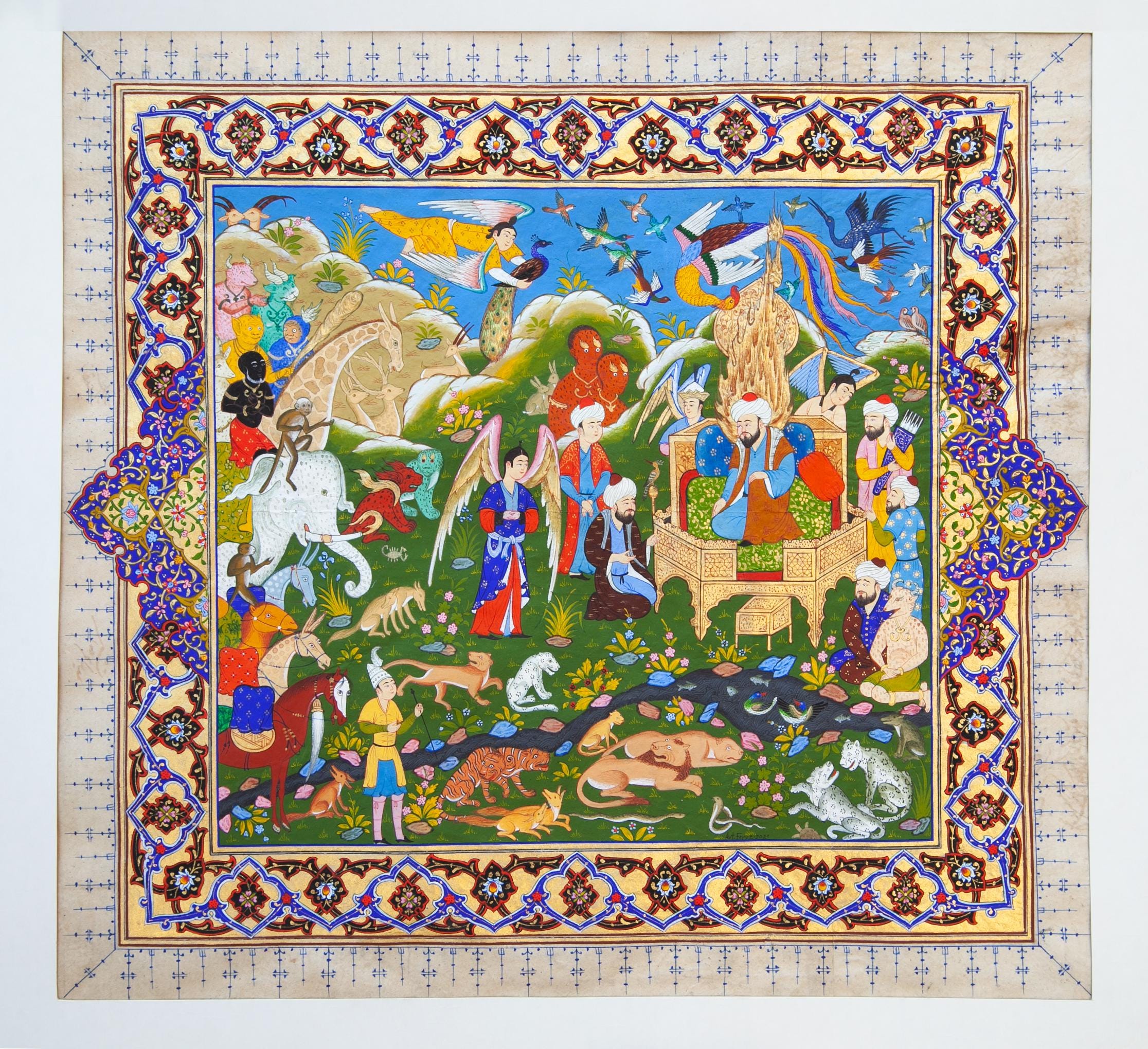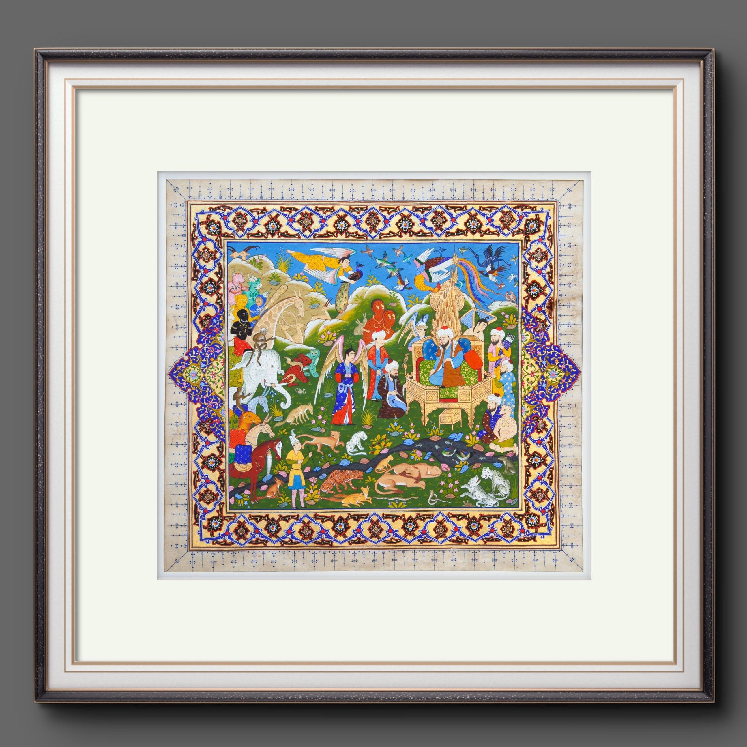 Immerse yourself in the mesmerizing world of miniature painting with “The Gathering at Solomon’s Throne,” an exquisite depiction of the wisdom and majesty of Prophet Solomon (Sulaiman). This artwork brings to life the legendary scene where Solomon, seated on his resplendent golden throne, presides over a divine assembly of humans, animals, and birds, showing his God-given ability to communicate with all of creation.