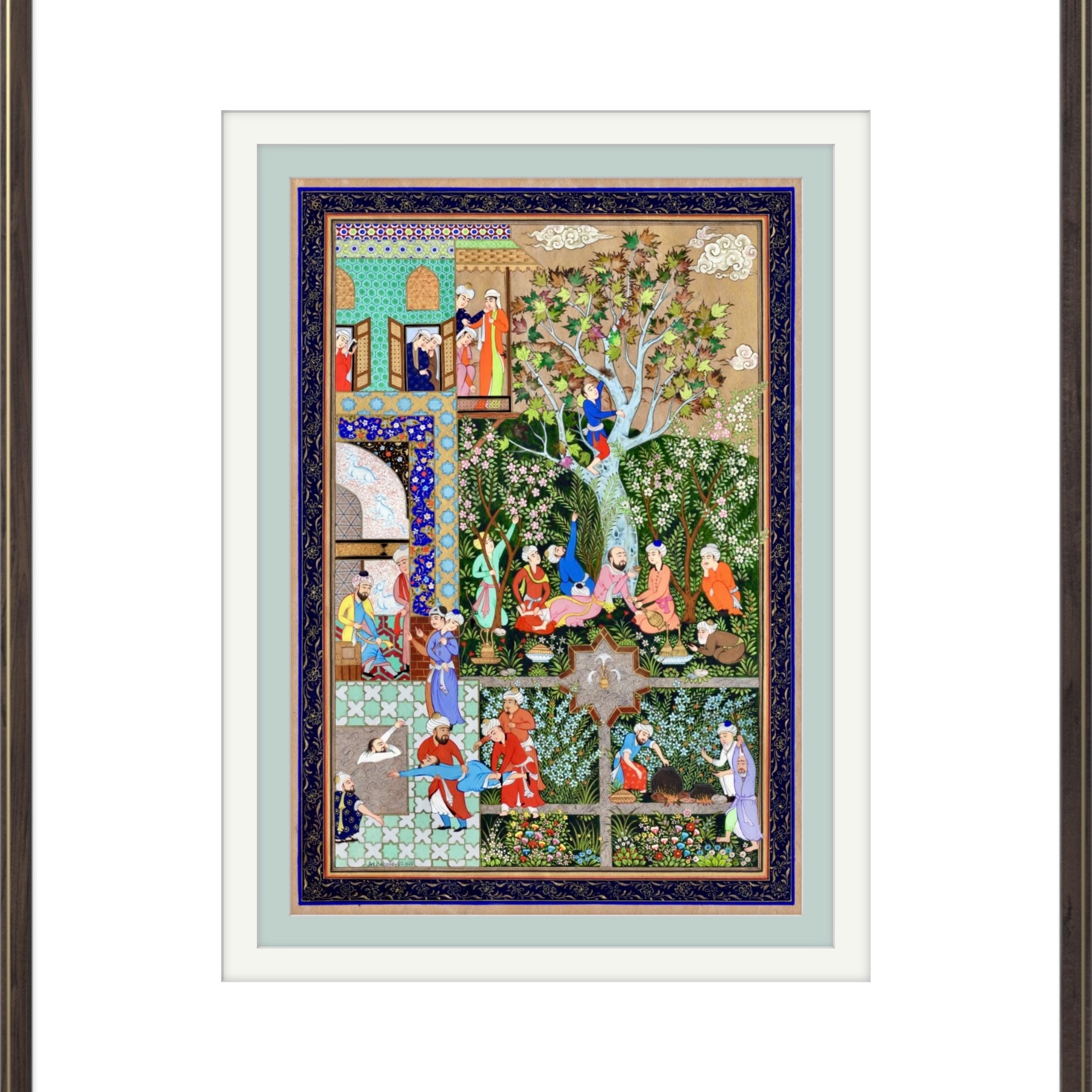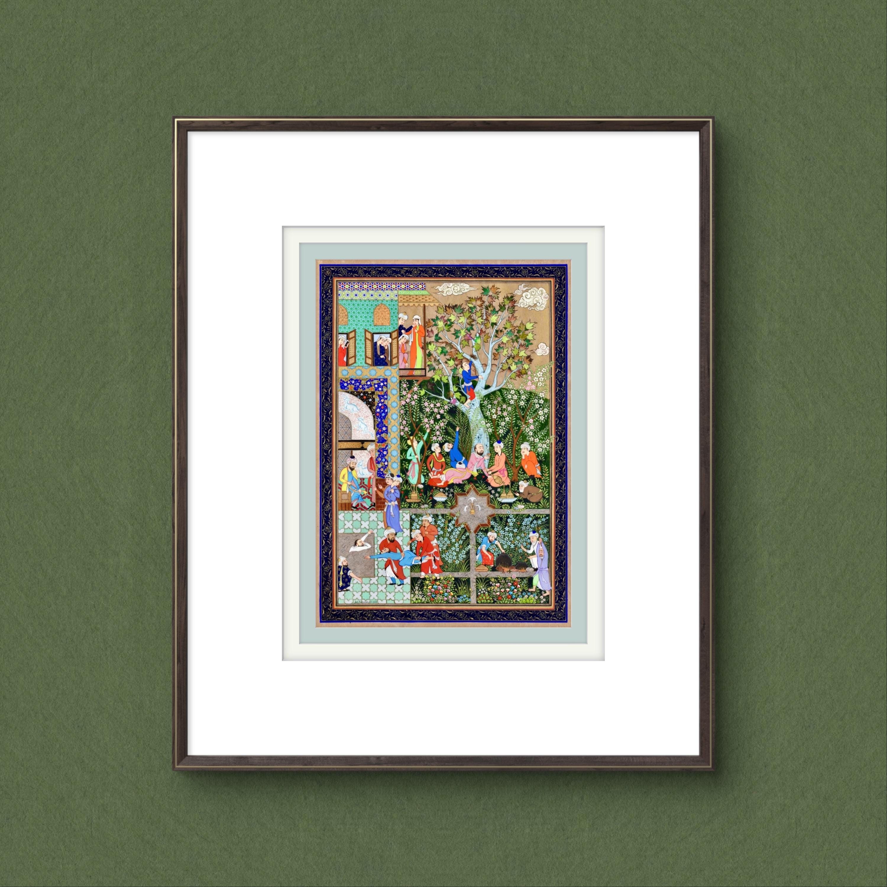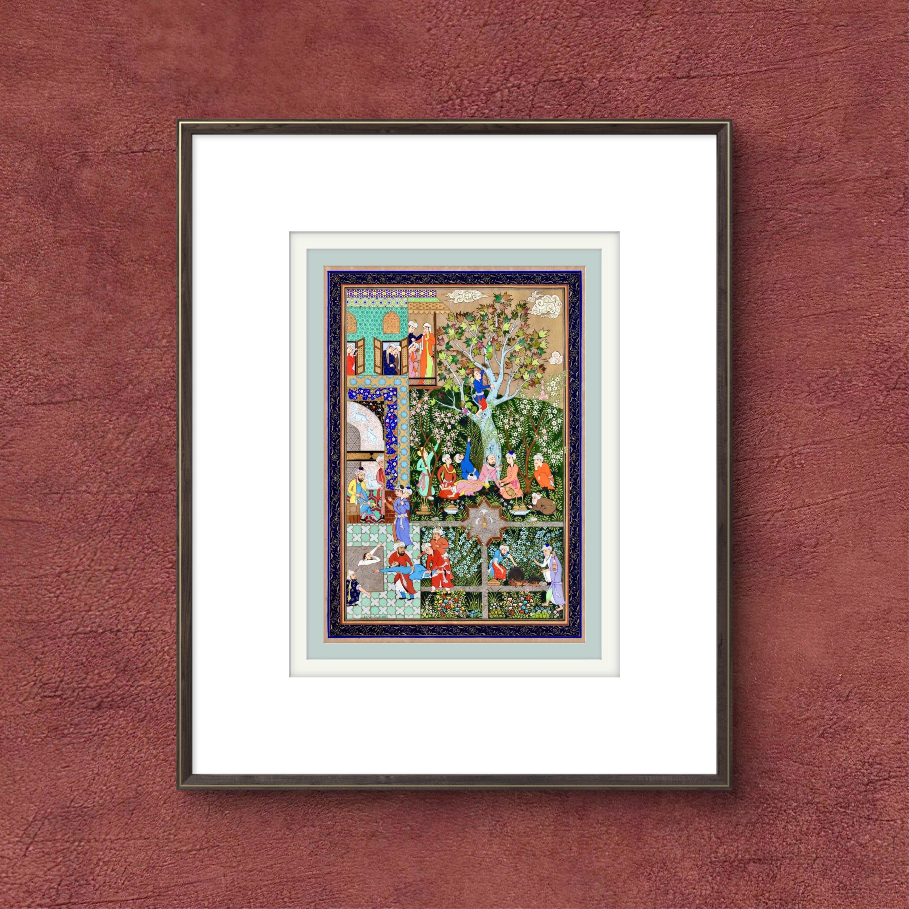 The scene depicts a lavish gathering in the gardens of Babur, the first Mughal emperor (1483–1530), a ruler renowned for his poetic soul and deep appreciation for nature. Babur’s passion for Persian-style charbagh gardens transformed Mughal landscape design, creating serene spaces that symbolized paradise. This composition reflects the cultural vibrancy of the Mughal court, where art, poetry, and intellectual discourse flourished.