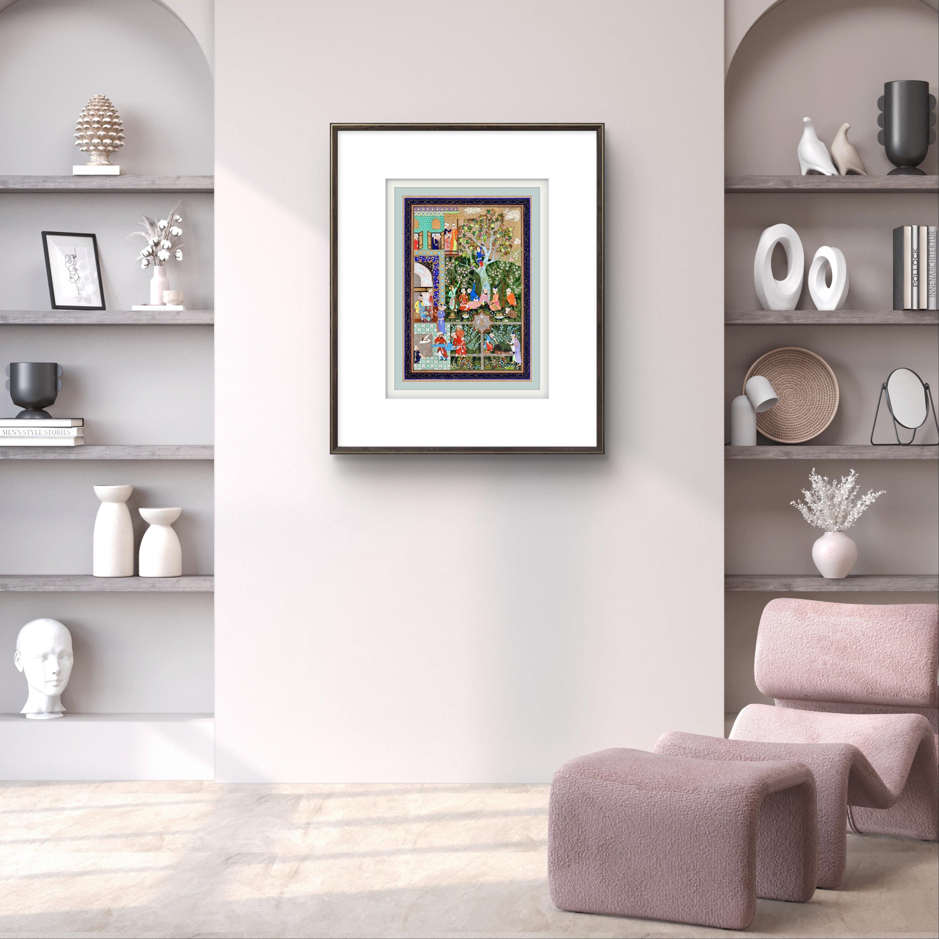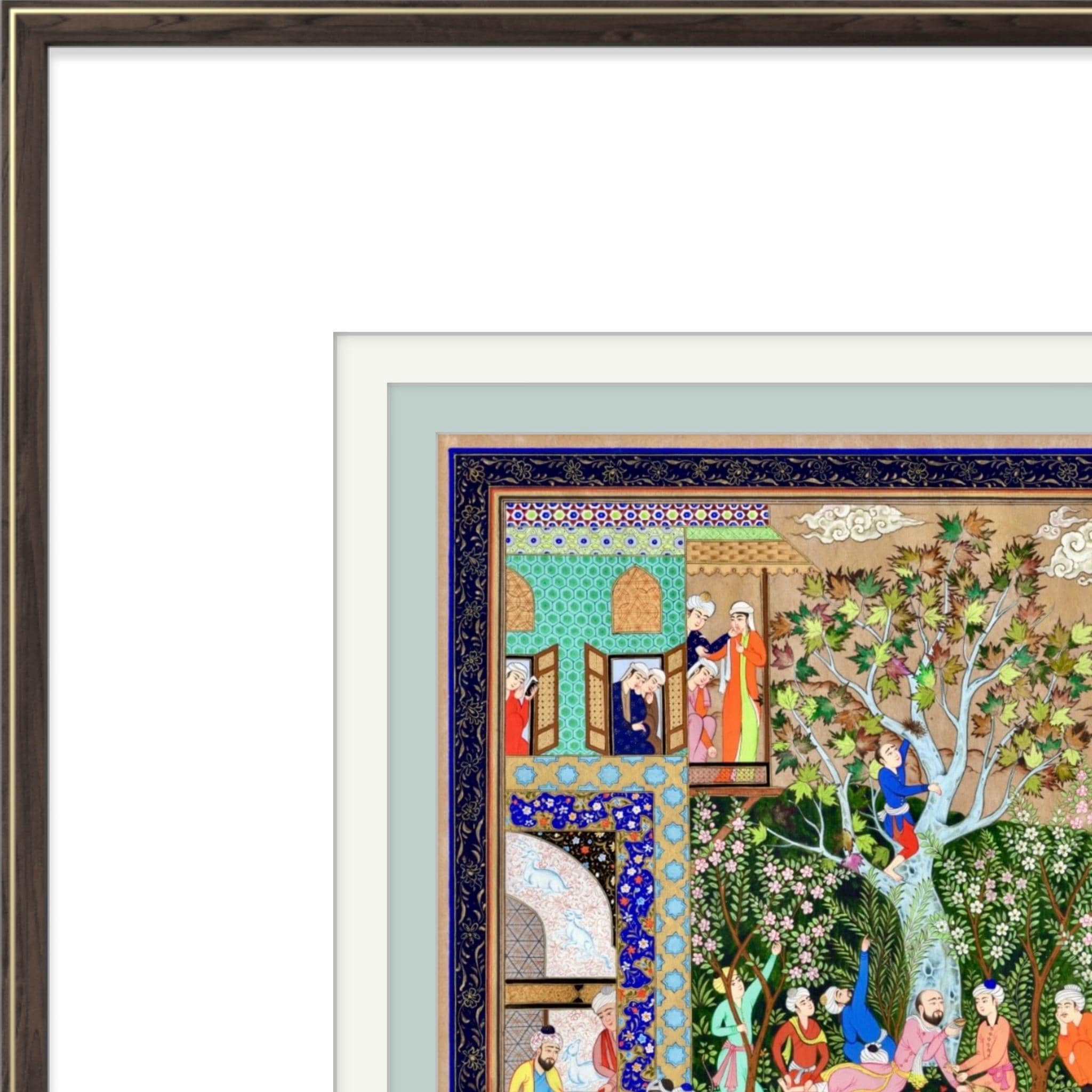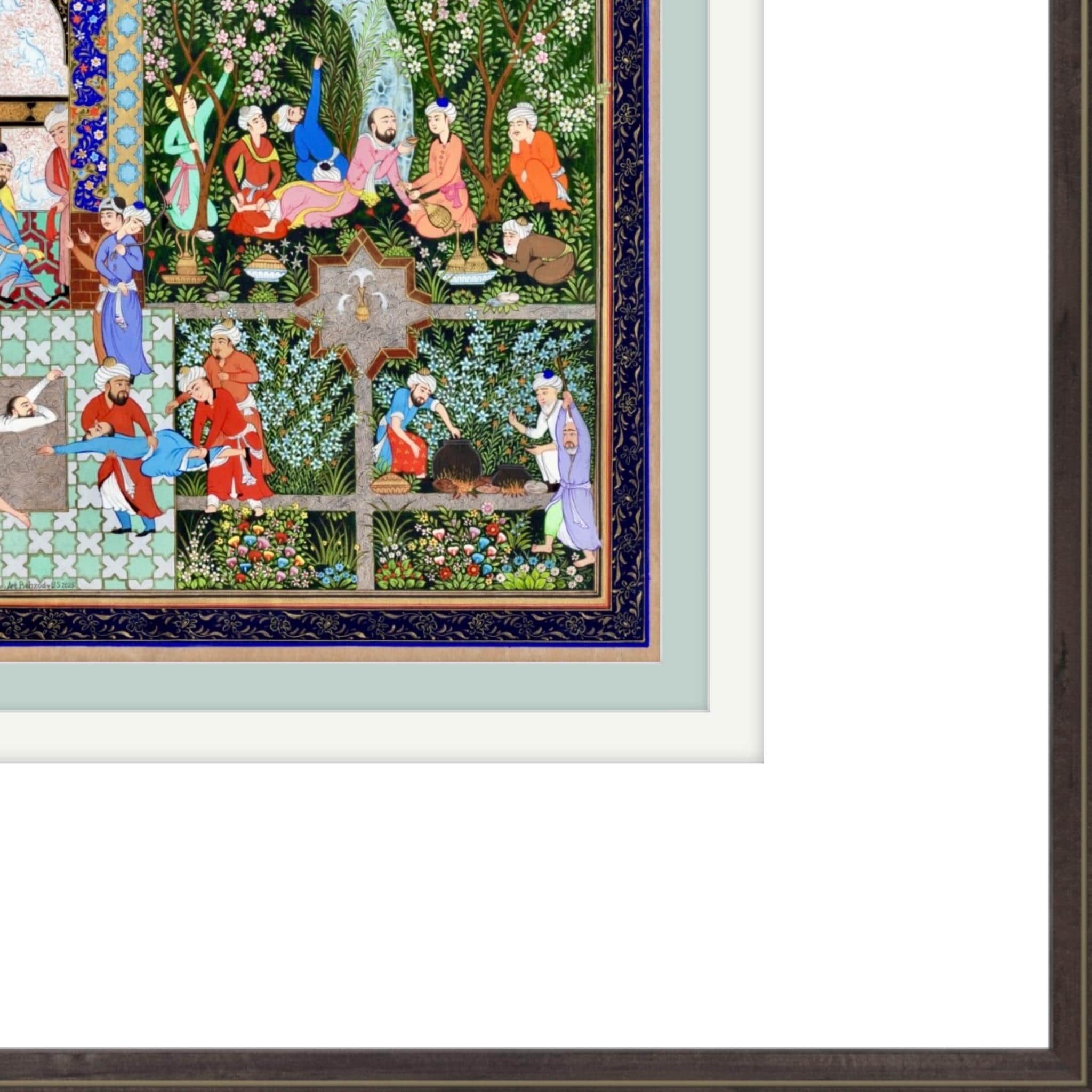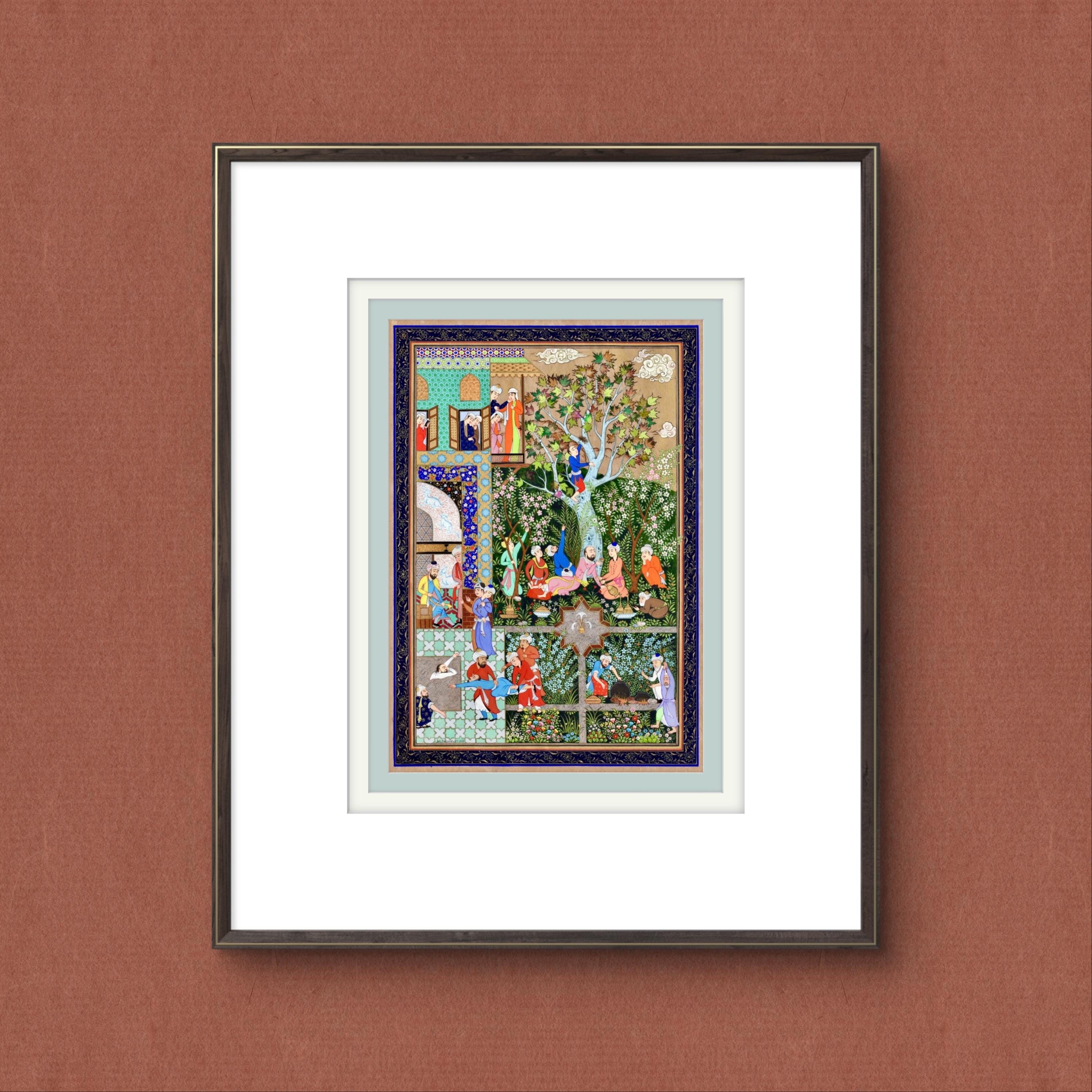 The scene depicts a lavish gathering in the gardens of Babur, the first Mughal emperor (1483–1530), a ruler renowned for his poetic soul and deep appreciation for nature. Babur’s passion for Persian-style charbagh gardens transformed Mughal landscape design, creating serene spaces that symbolized paradise. This composition reflects the cultural vibrancy of the Mughal court, where art, poetry, and intellectual discourse flourished.
