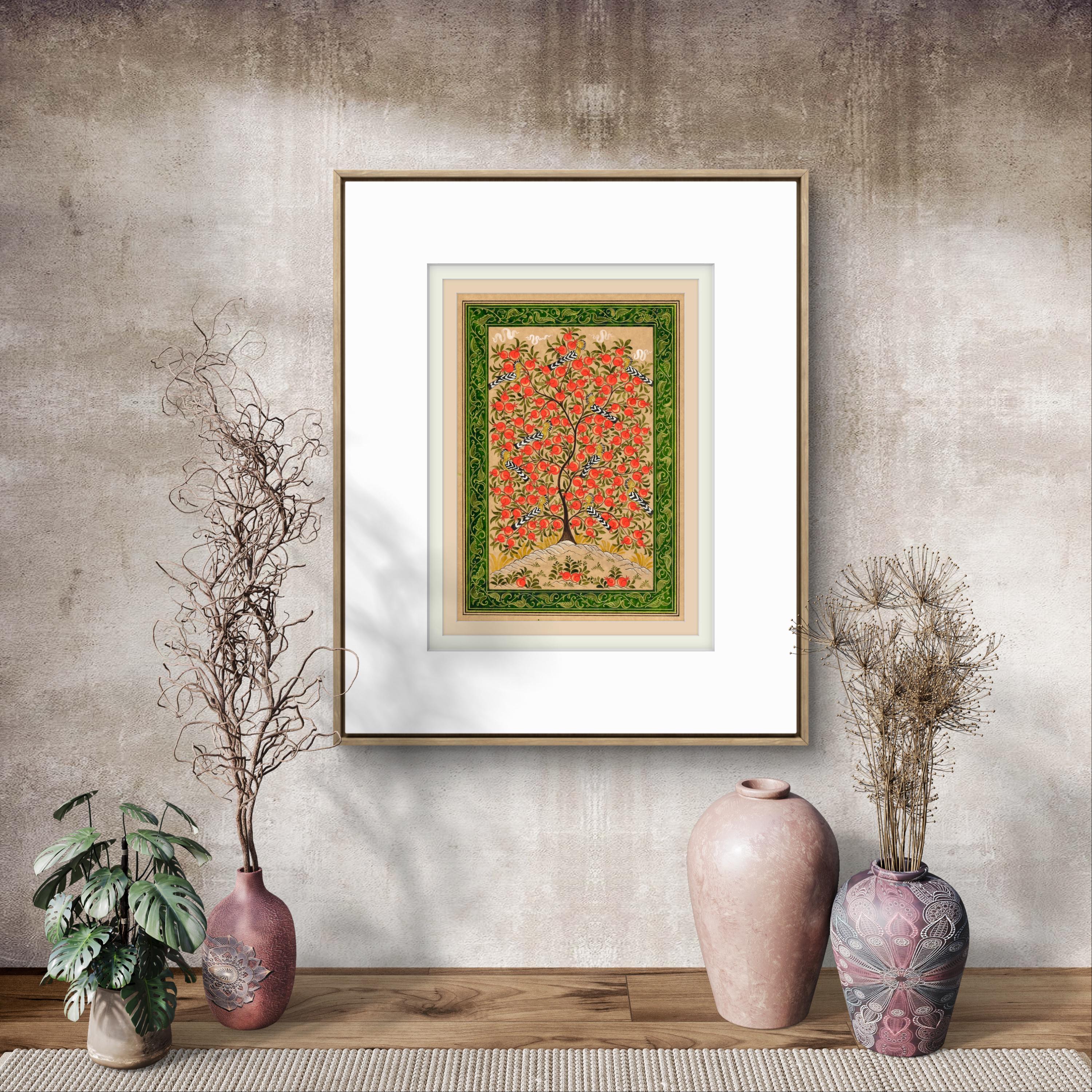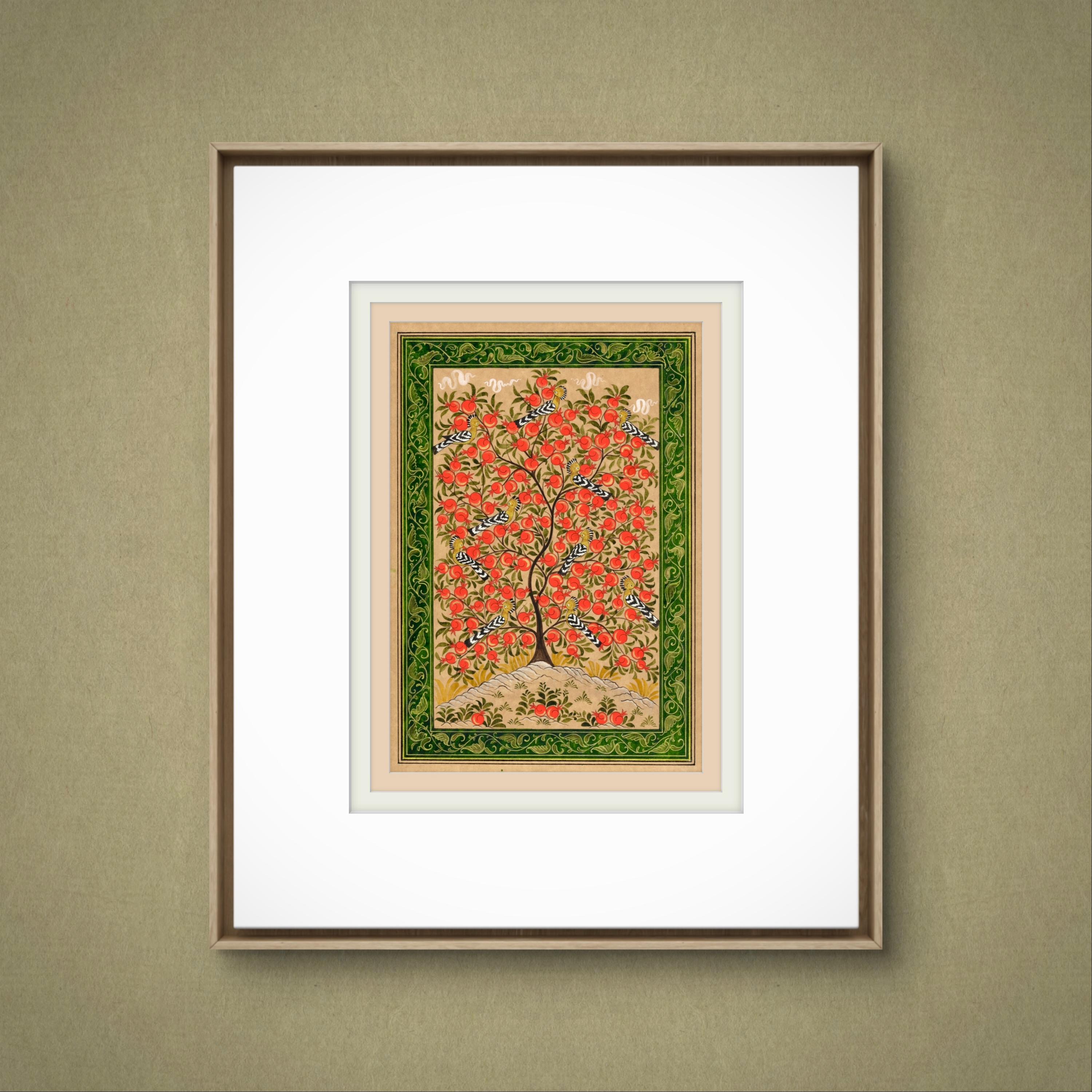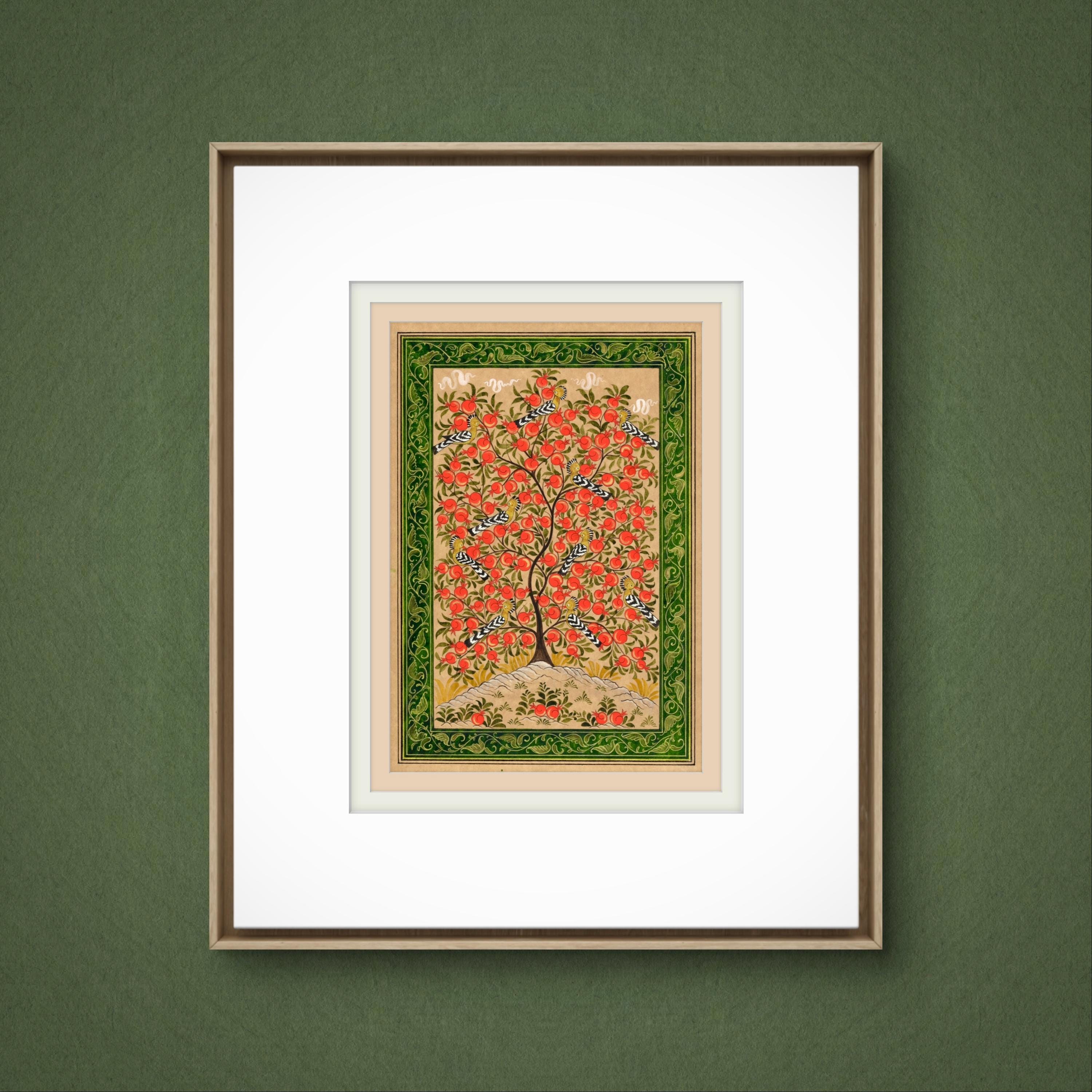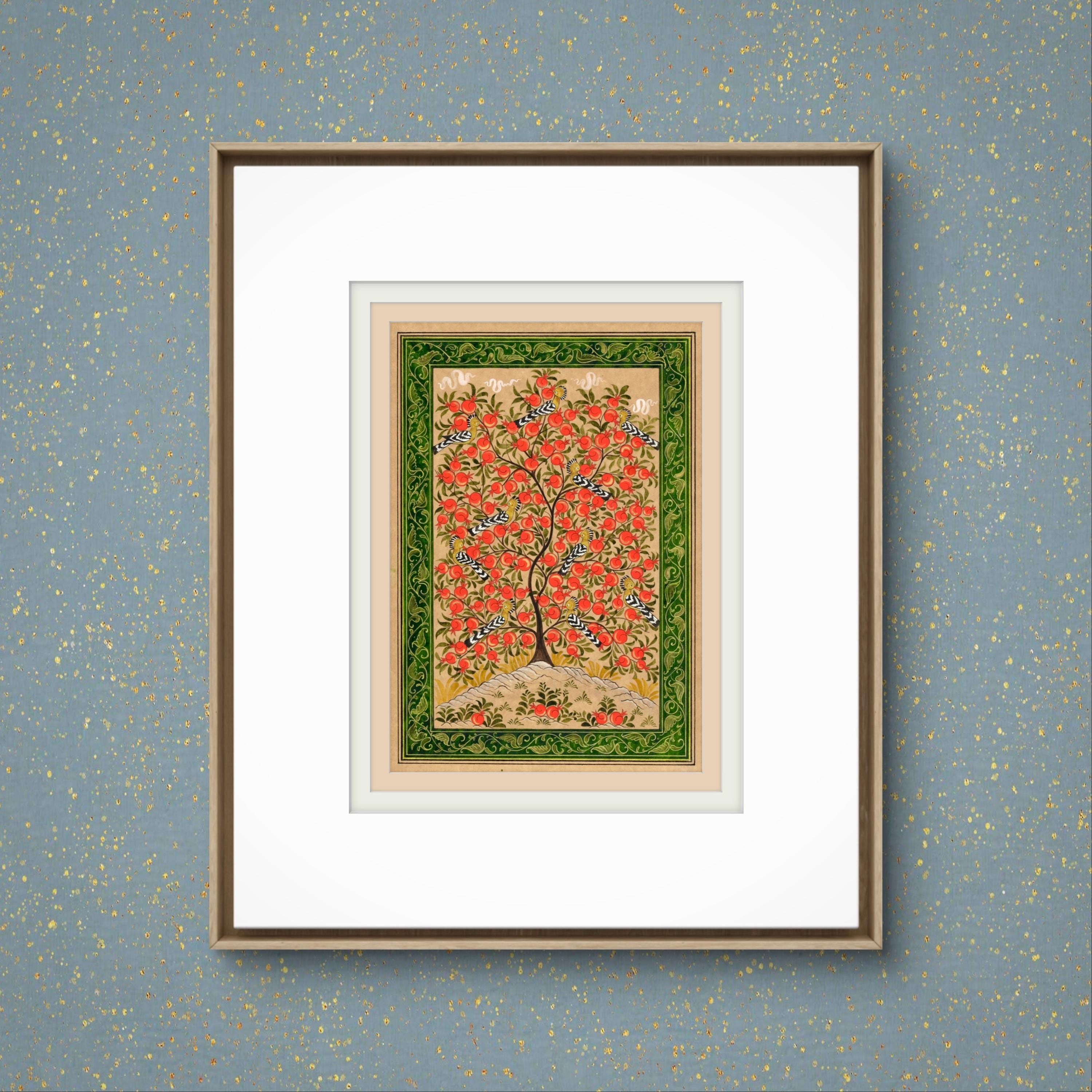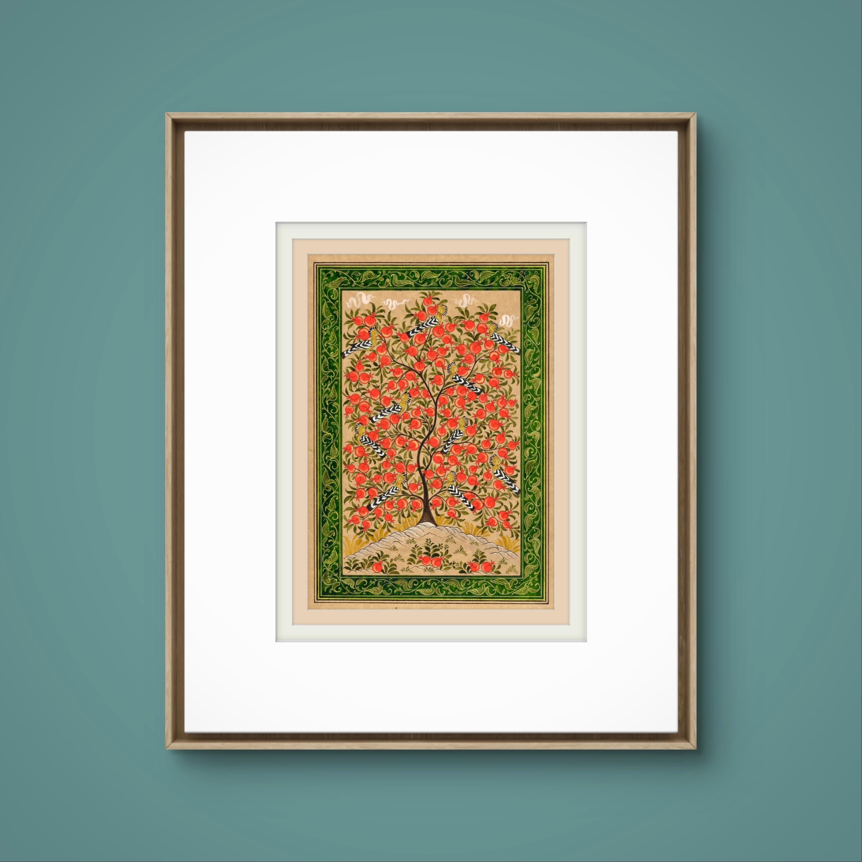 This exquisite miniature painting on silk paper depicts the Tree of Paradise, its branches elegantly adorned with ripe pomegranates, symbolizing fertility, prosperity, and the eternal cycle of life. The intricate details of the tree are brought to life through meticulous brushwork, showcasing its lush foliage and the radiant, textured fruits that provide a striking visual contrast to the soft background.