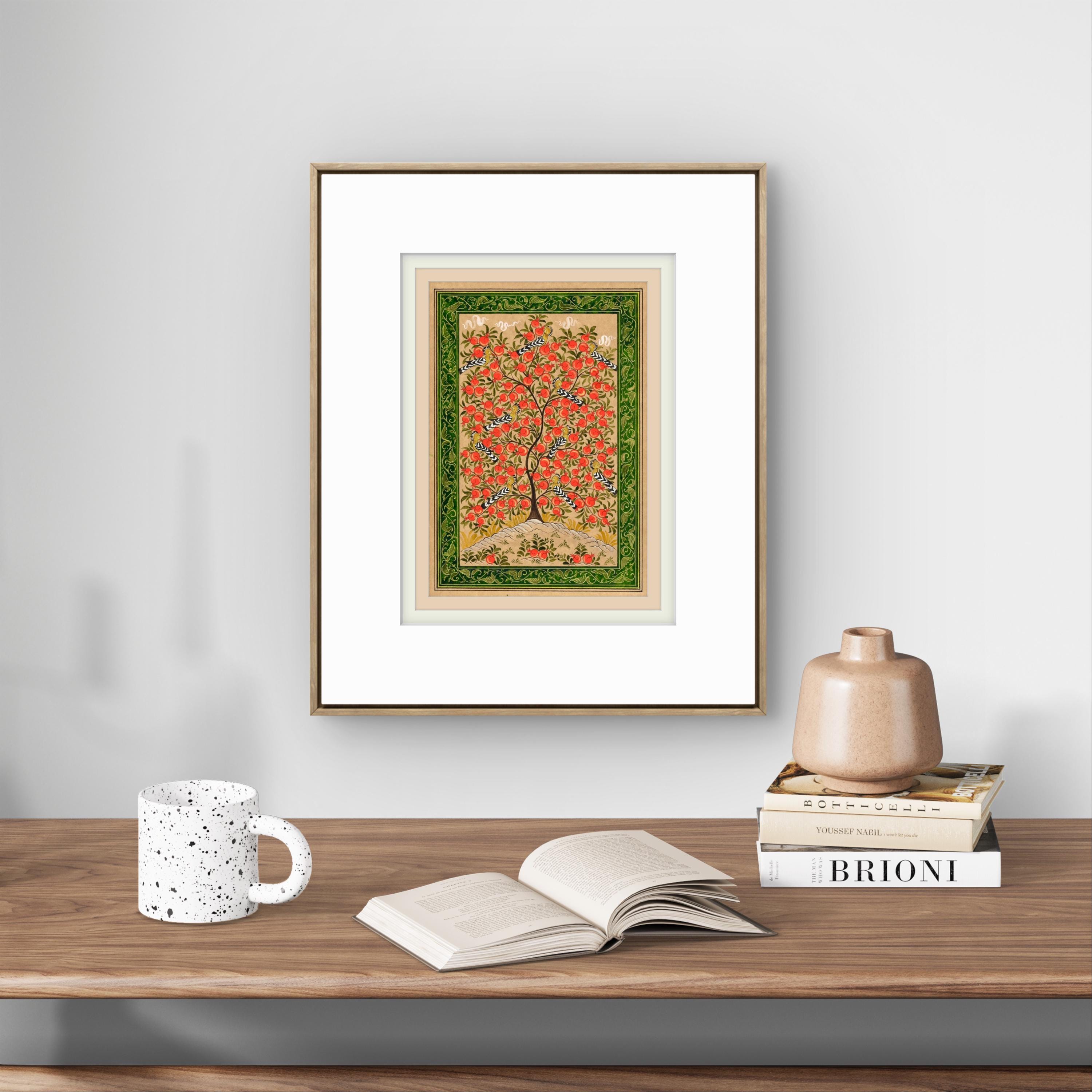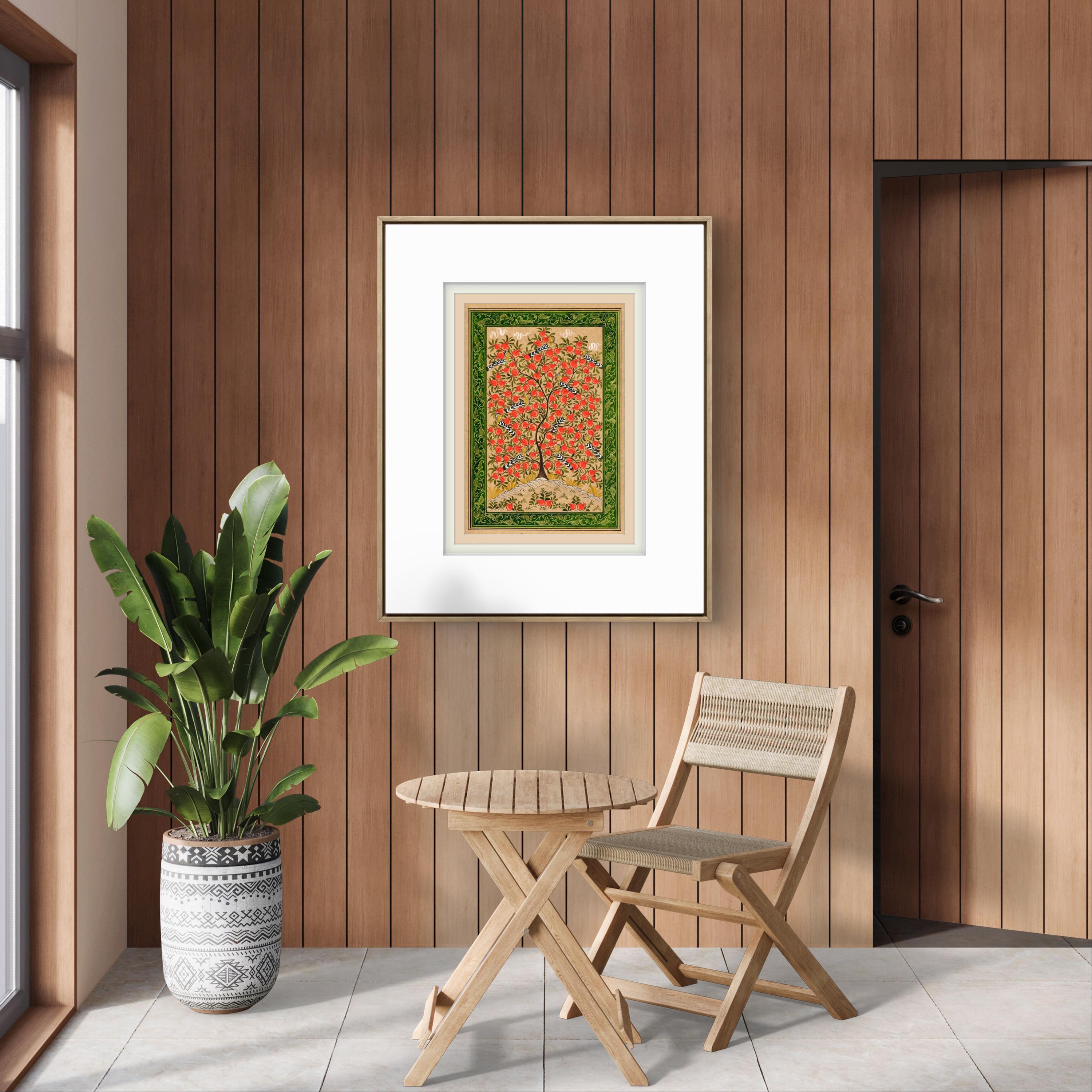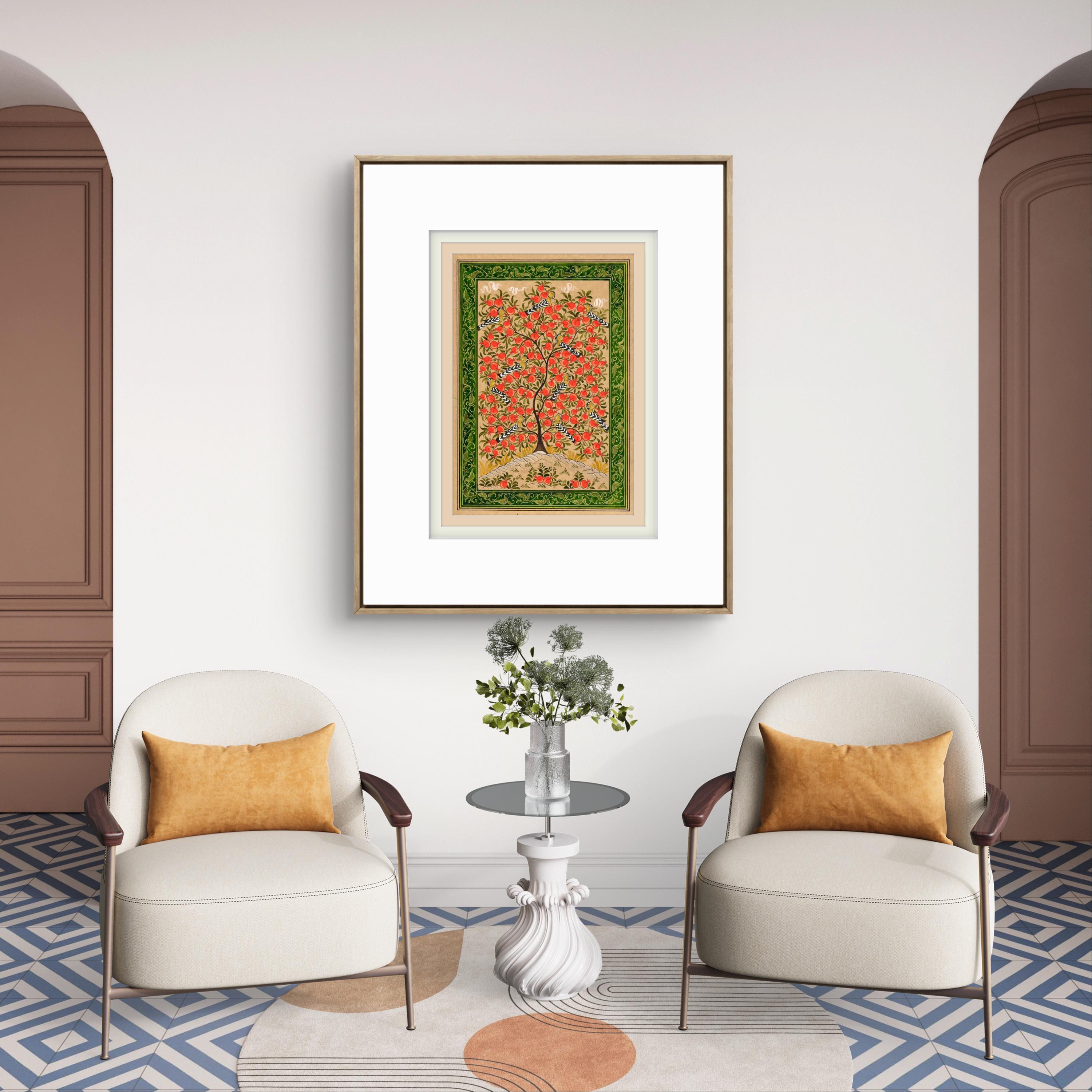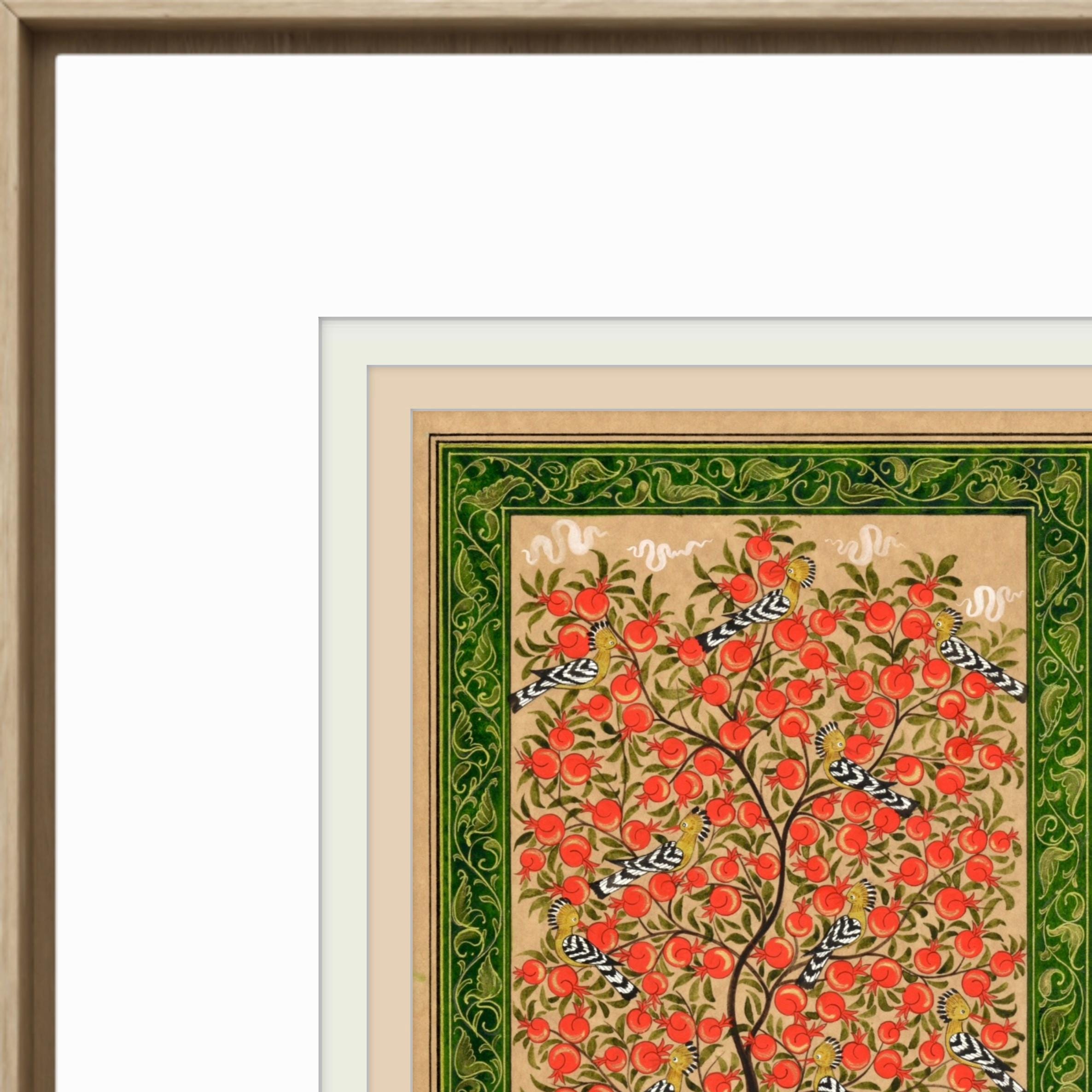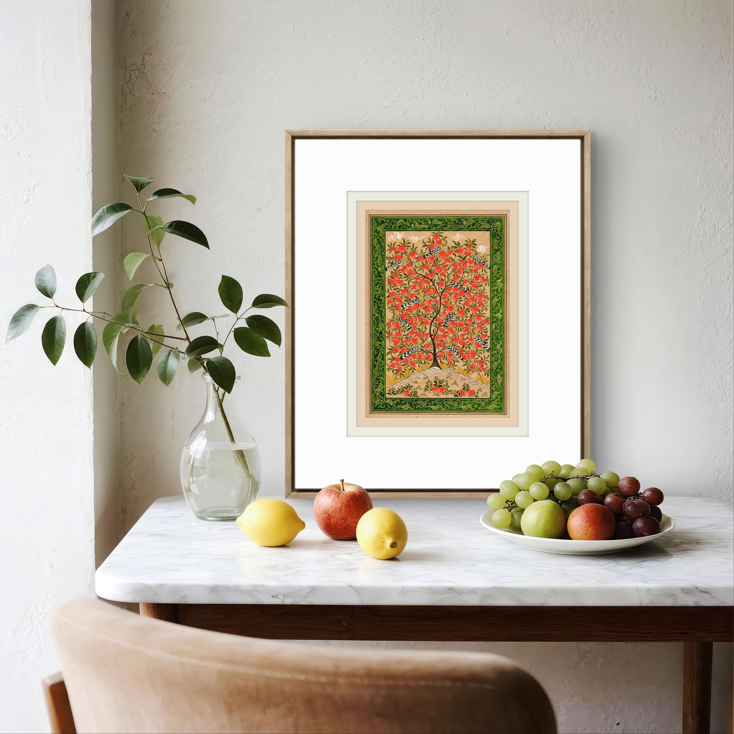 This exquisite miniature painting on silk paper depicts the Tree of Paradise, its branches elegantly adorned with ripe pomegranates, symbolizing fertility, prosperity, and the eternal cycle of life. The intricate details of the tree are brought to life through meticulous brushwork, showcasing its lush foliage and the radiant, textured fruits that provide a striking visual contrast to the soft background.