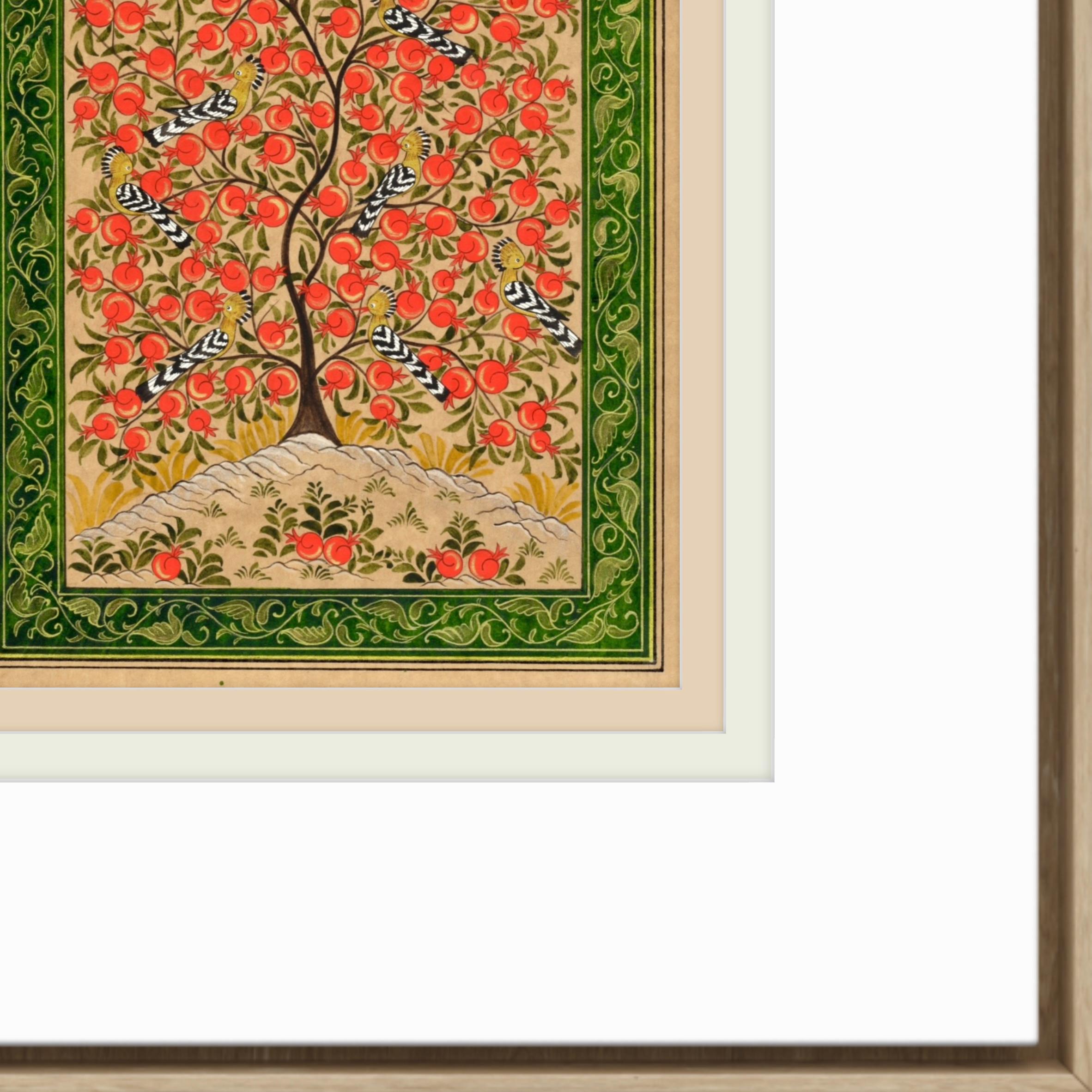 “Tree of Paradise: Pomegranates and Hoopoe Birds” captures the essence of spiritual beauty, the interconnectedness of life, and the serene balance of nature, all encapsulated in the timeless art of miniature painting.