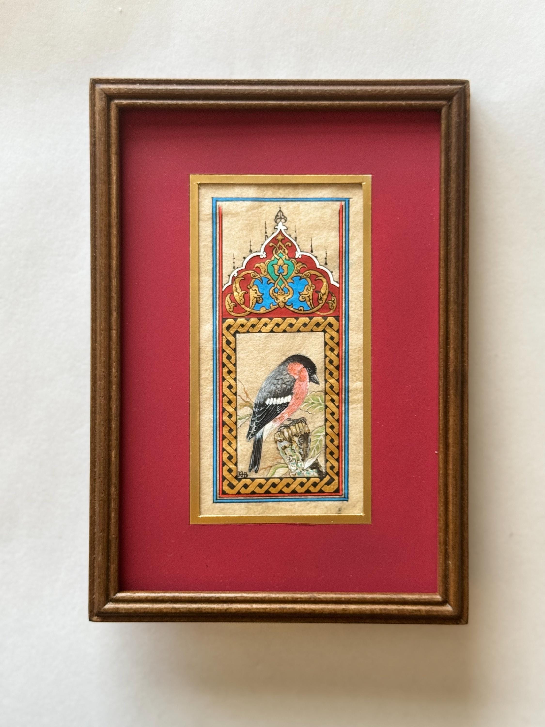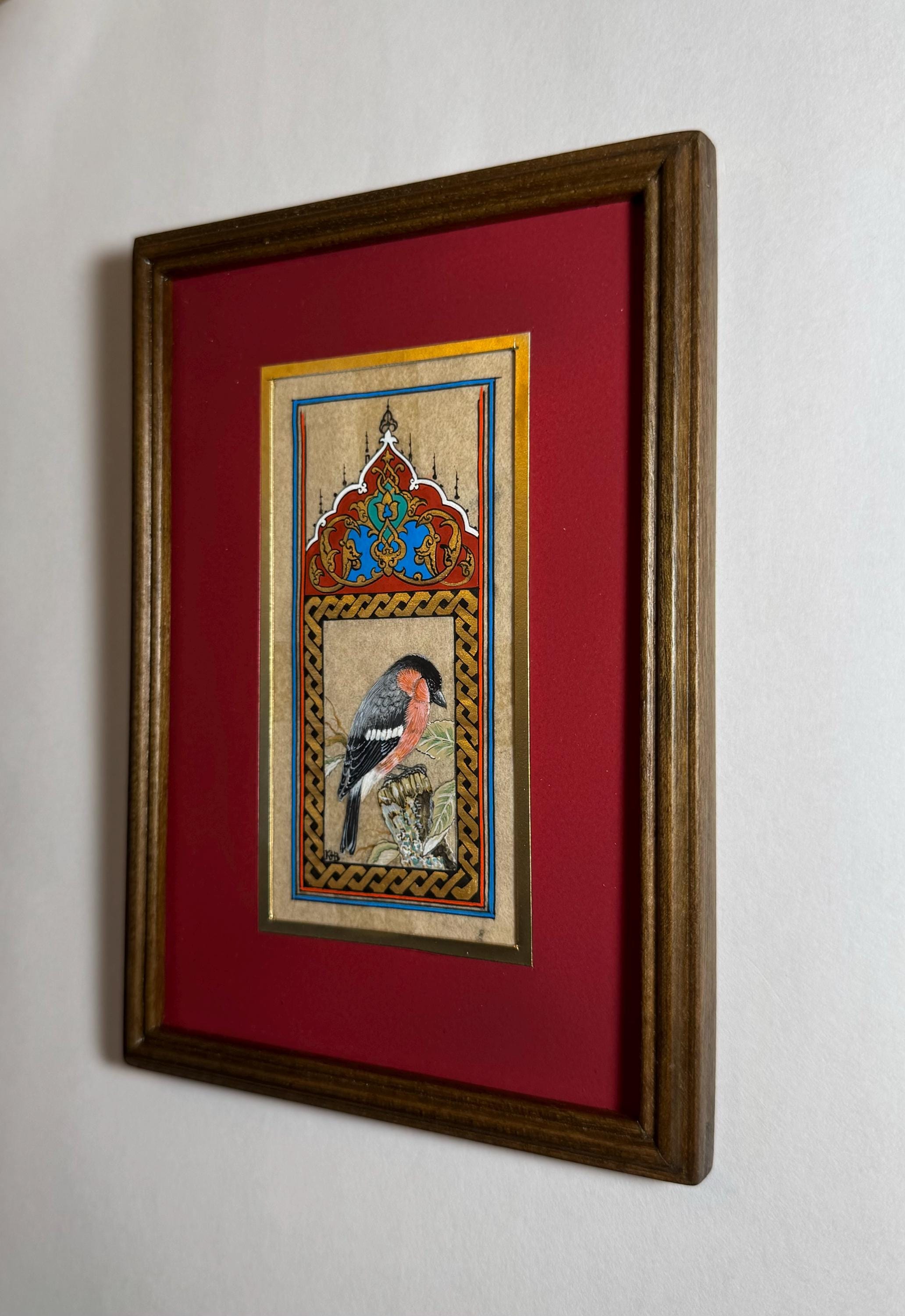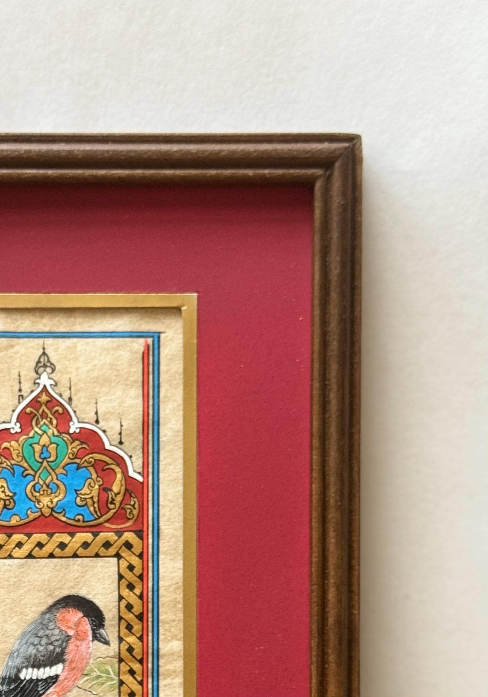 This extraordinary framed miniature painting is a masterful representation of Bird and ornaments, rendered in the intricate Central Asian miniature painting style. Each detail has been painstakingly painted under a magnifying glass, allowing for an exceptional level of precision. The finest brushes were used to create delicate lines, capturing the essence of movement and the intricate interplay between the characters and the natural world.