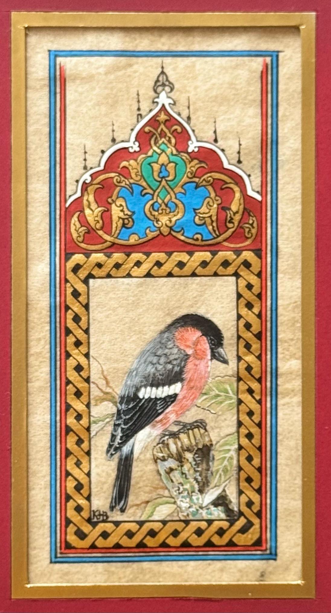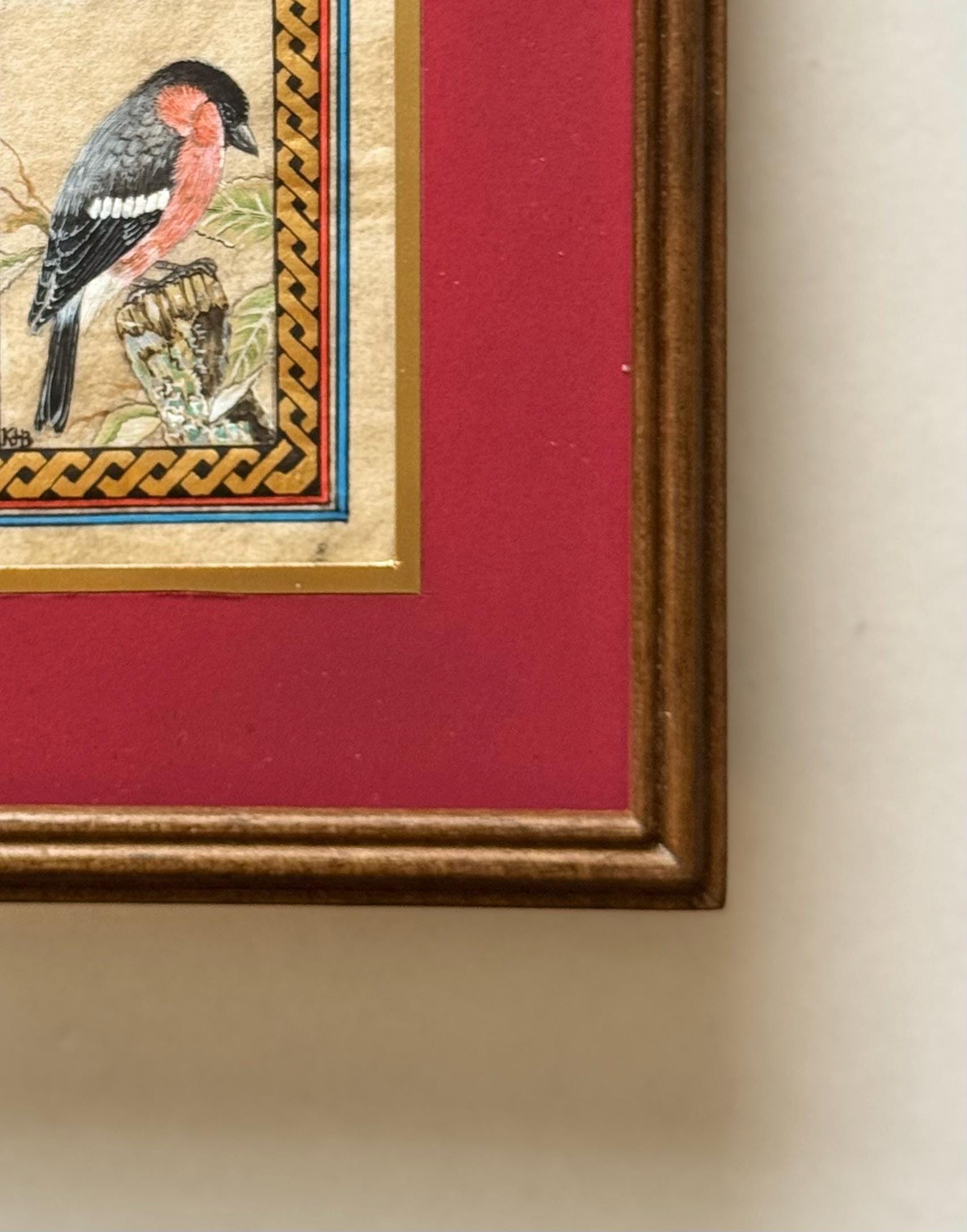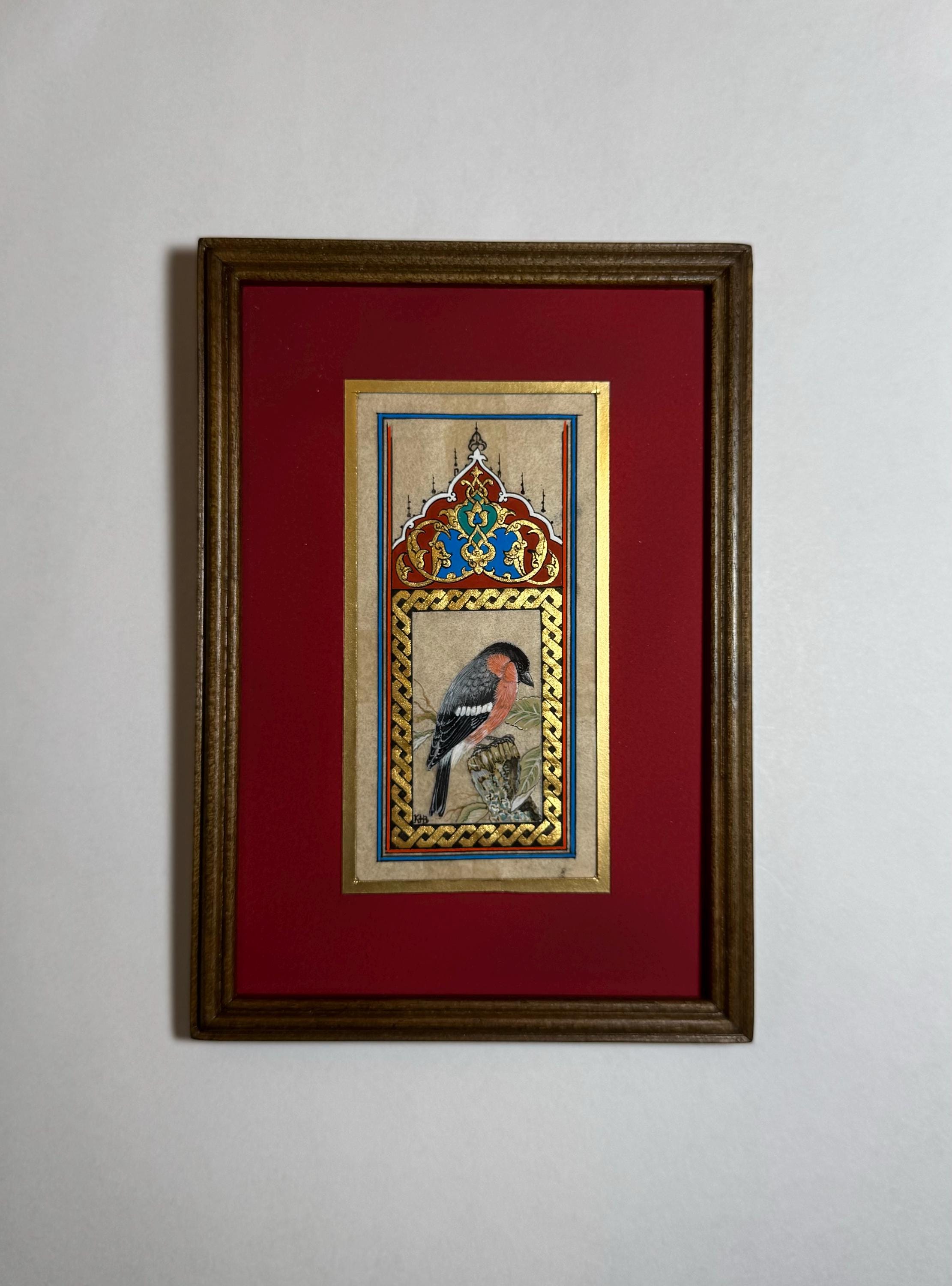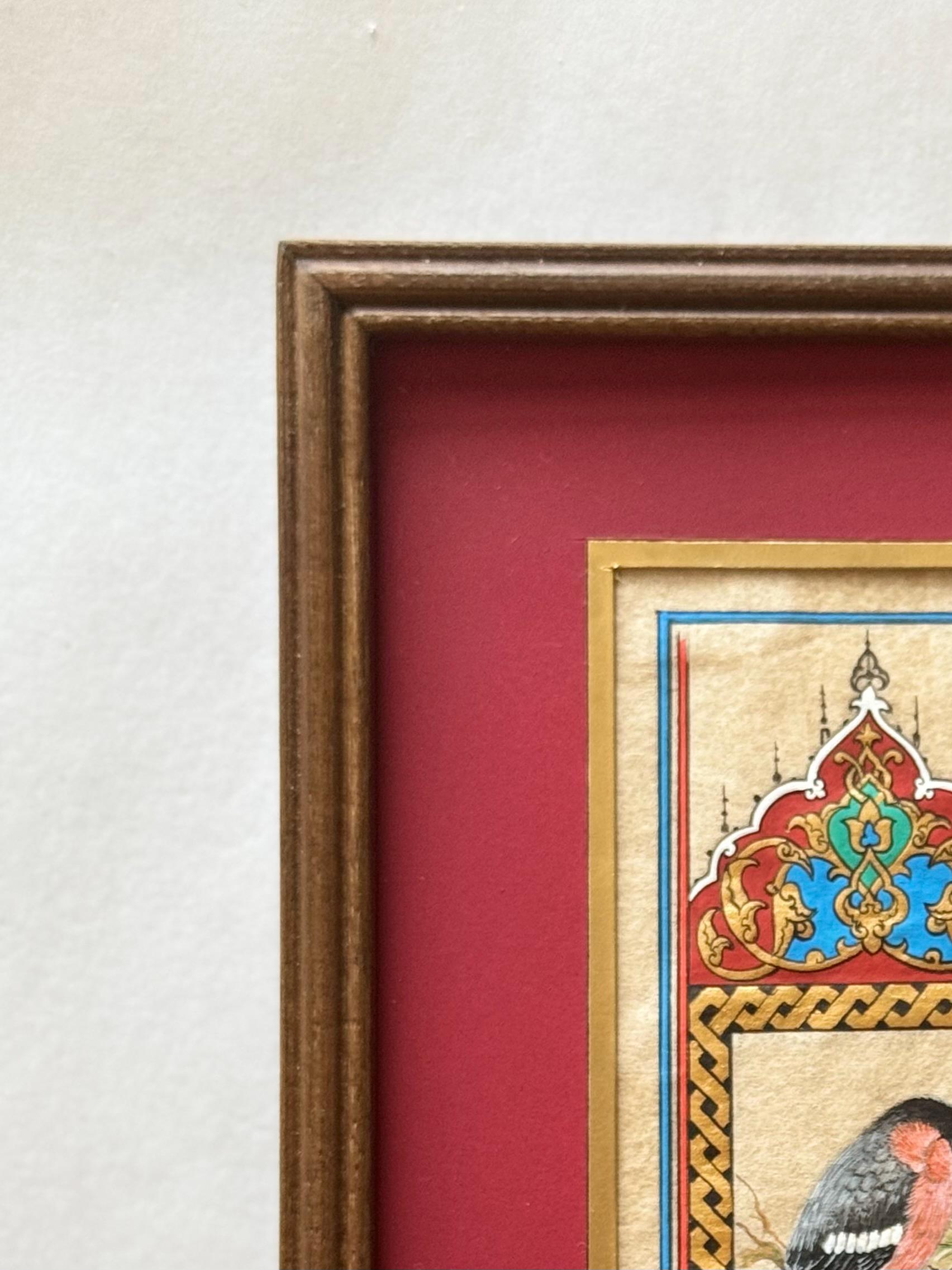 This extraordinary framed miniature painting is a masterful representation of Bird and ornaments, rendered in the intricate Central Asian miniature painting style. Each detail has been painstakingly painted under a magnifying glass, allowing for an exceptional level of precision. The finest brushes were used to create delicate lines, capturing the essence of movement and the intricate interplay between the characters and the natural world.