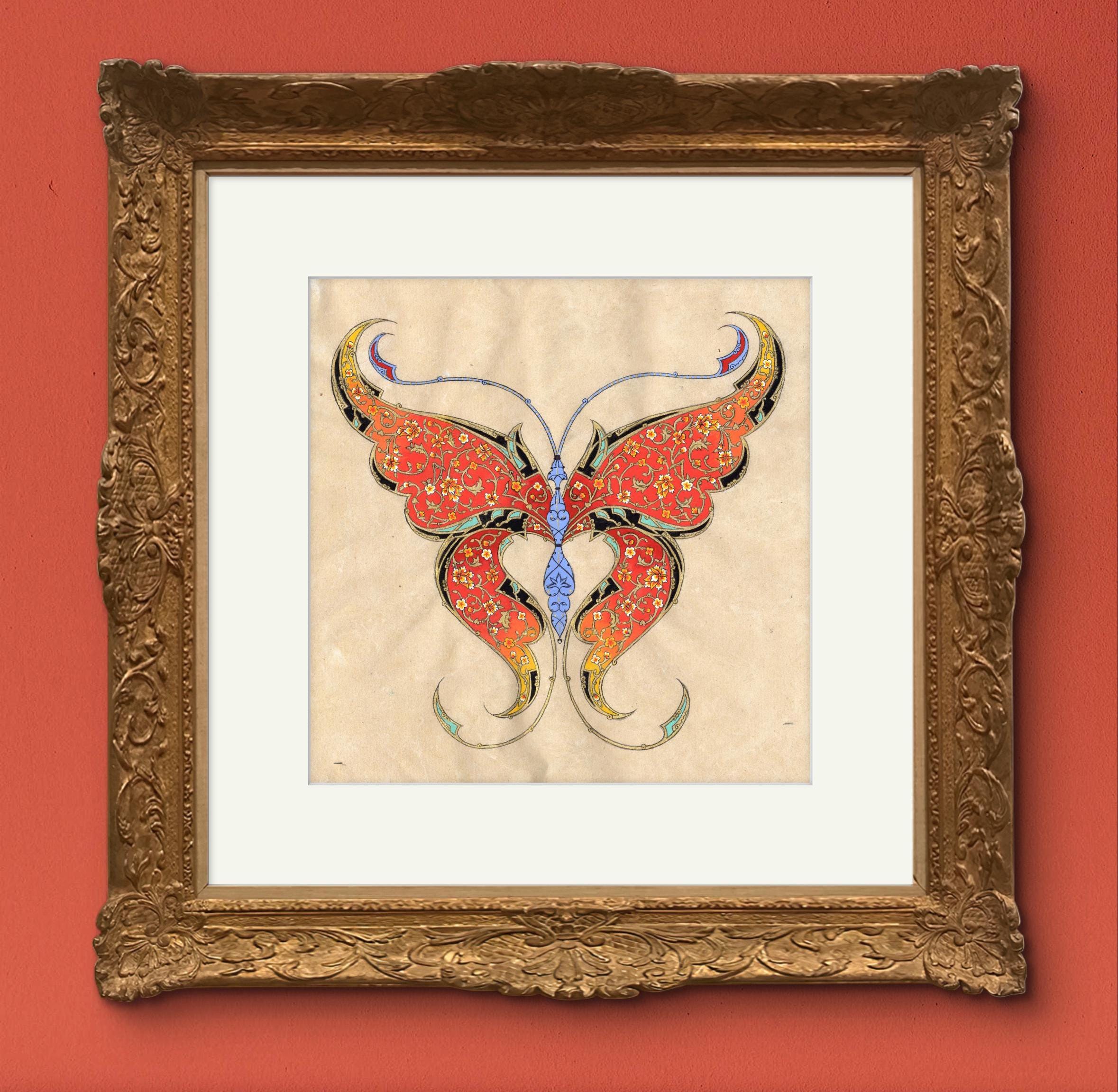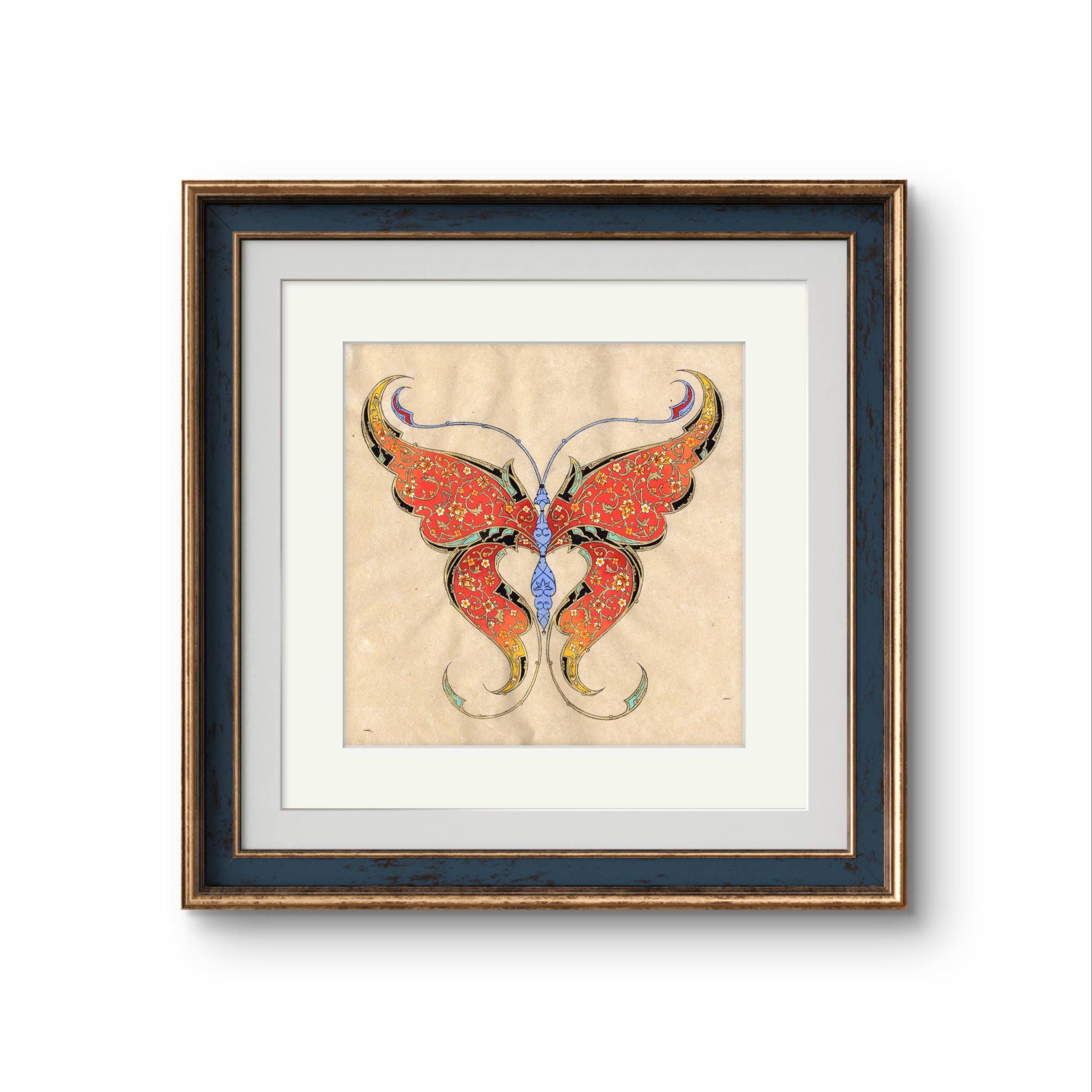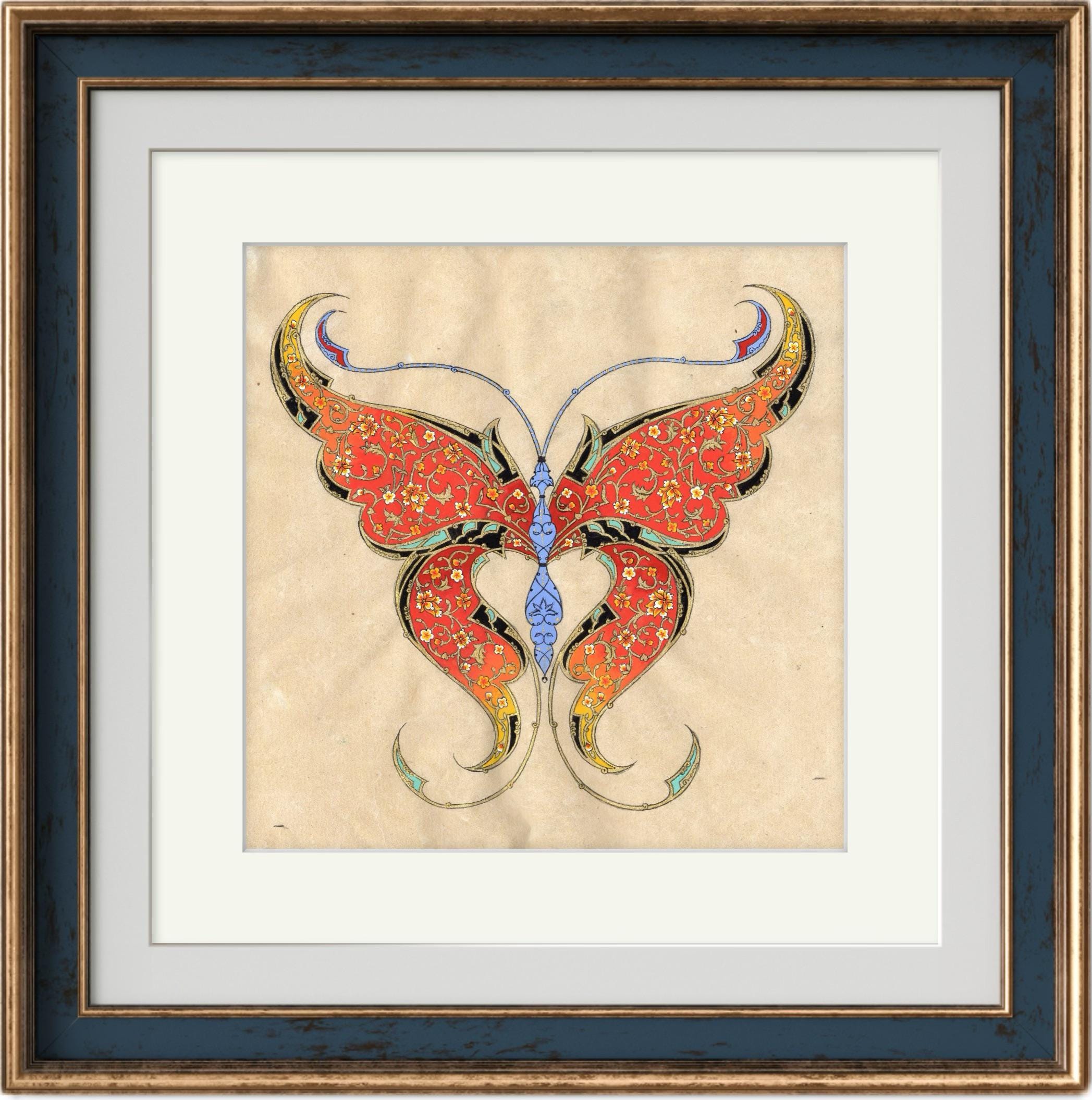 Fine Art - Butterfly Ornamental Illustration, Fine Miniature painting, “ FLORAL FLIGHT “ Central Asian Fine Art piece ( MATTED )