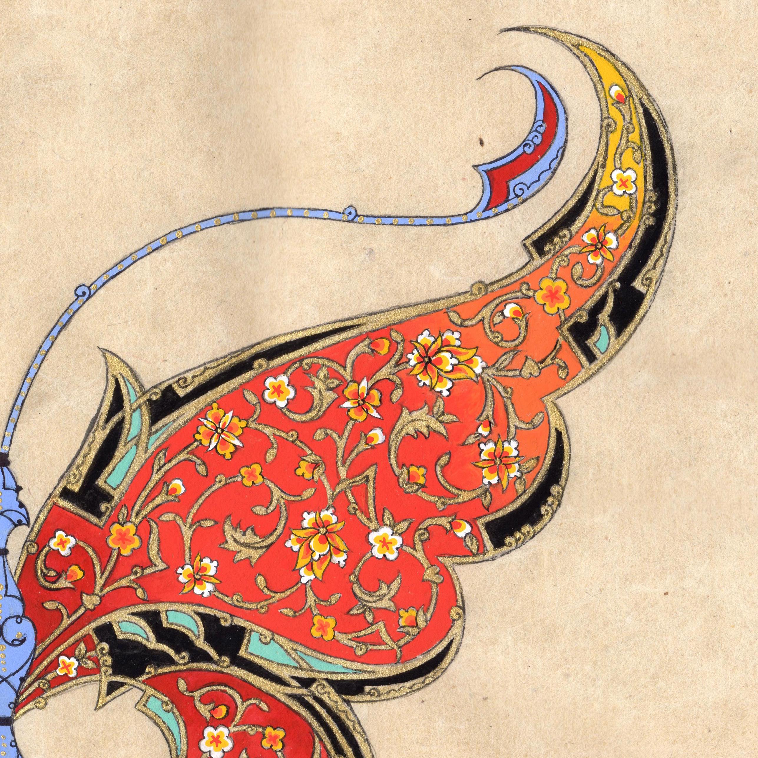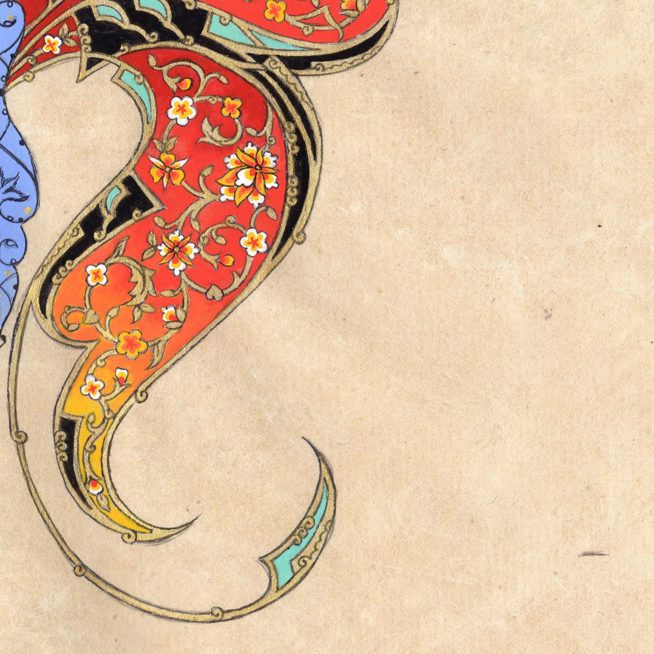 “Floral Flight” is a masterful expression of Ornamental Miniature Painting, rendered with extraordinary finesse on handmade mulberry silk paper. The paper, polished to perfection with special stones, offers a smooth, lustrous foundation that elevates the artistry within. Each line, impossibly fine and unique, has been painstakingly painted under a magnifying glass, creating an unparalleled level of precision that is rare in the art world.