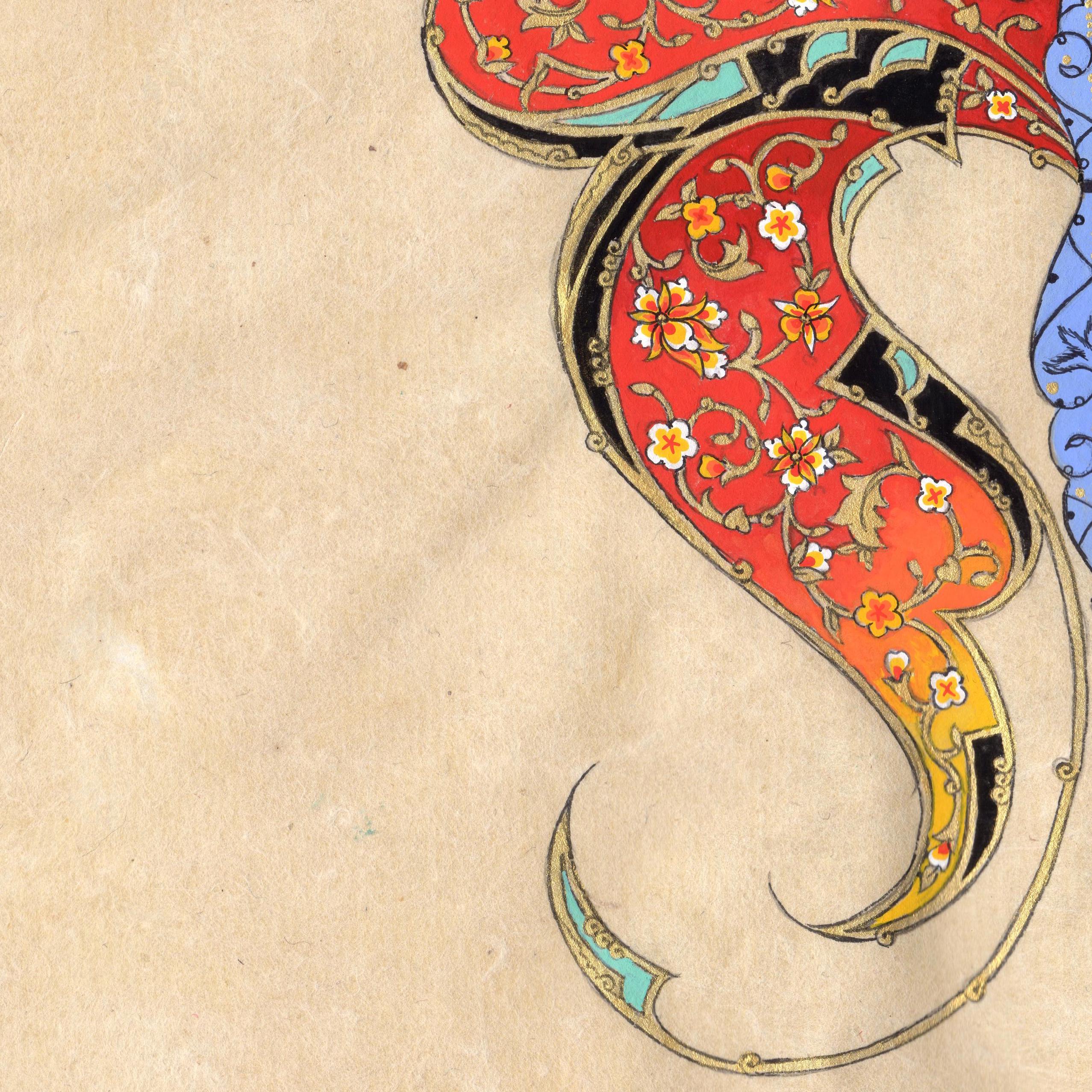 The harmonious blend of colors invites the viewer to explore the intricate beauty of the composition. From the delicate curves to the rich textures, the painting’s vibrancy comes to life through the use of high-quality materials: mulberry silk paper, a fine brush, watercolor, liquid ink, acrylic, and delicate applications of gold leaf. Every medium contributes to the layered complexity, creating a piece that is both visually striking and technically profound.