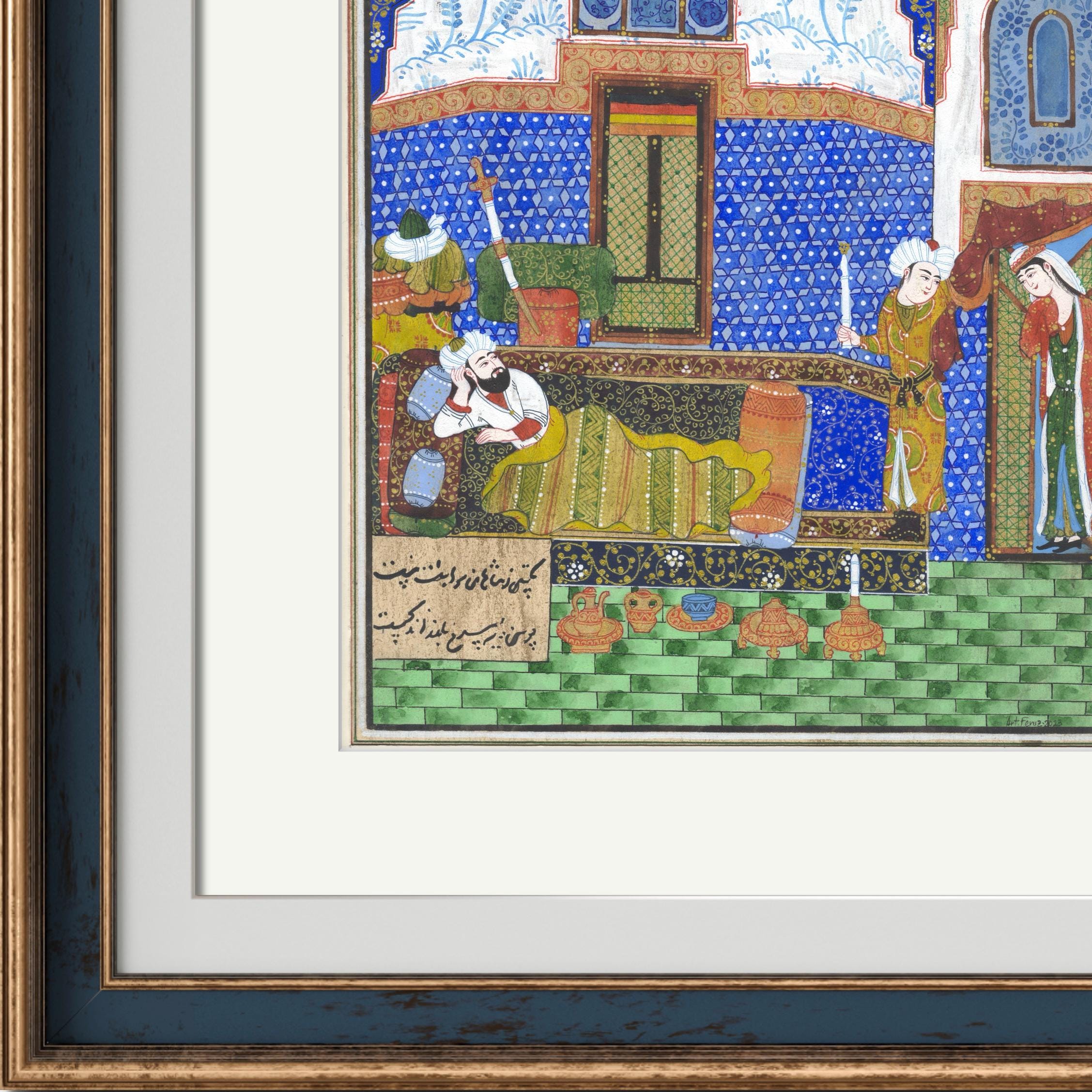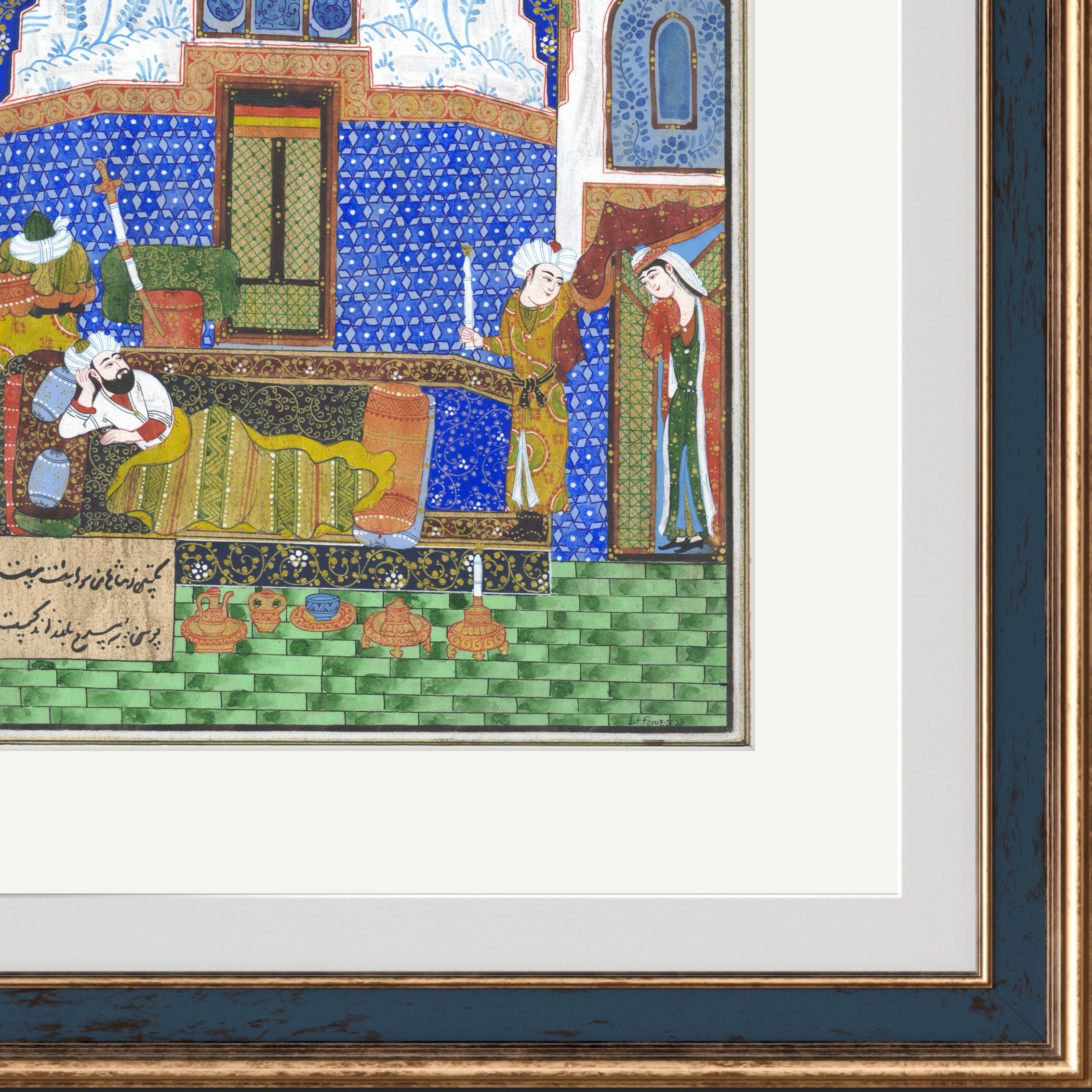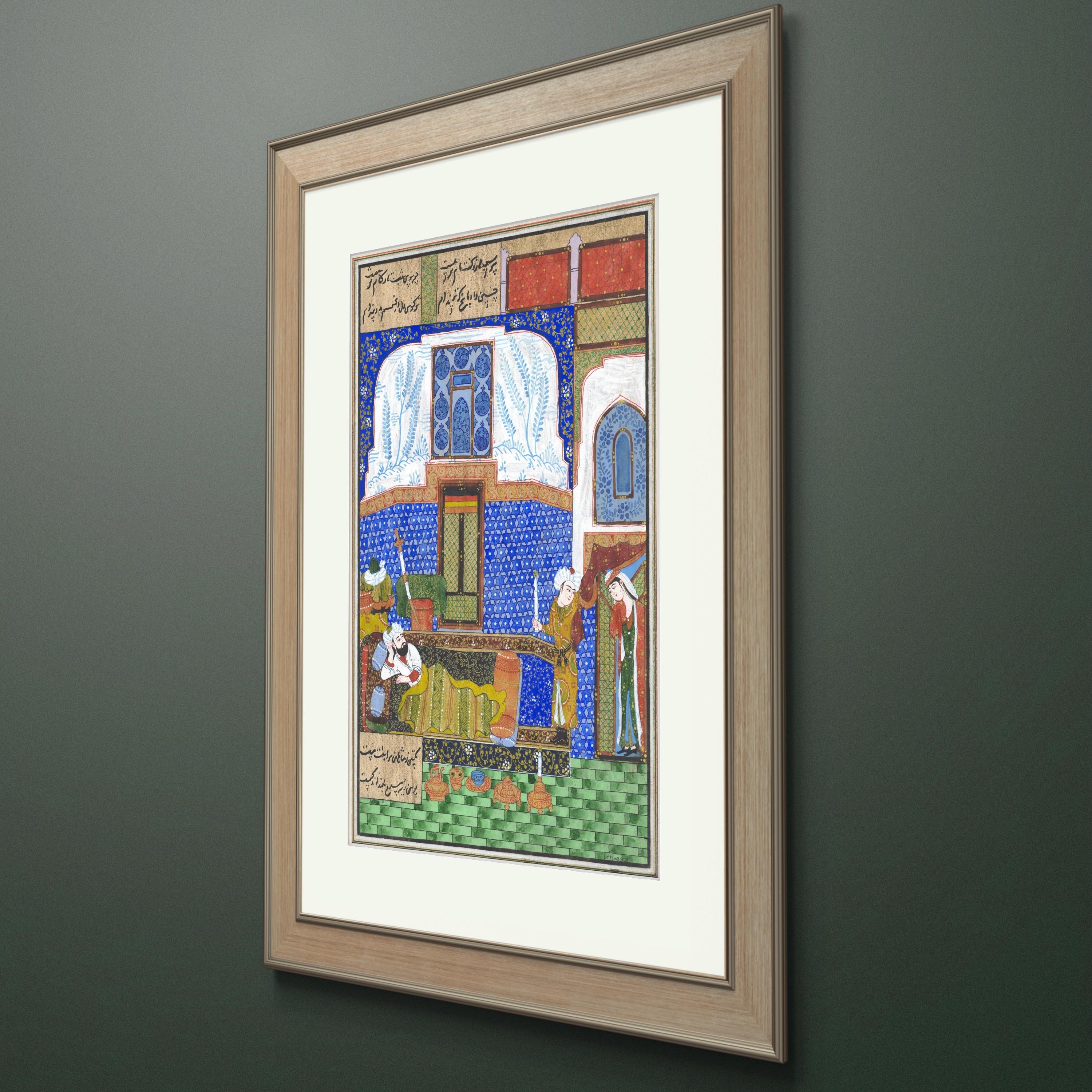 Hand-painted either on mulberry made silk paper or fine birch-made paper, this artwork brings together watercolor, acrylic, liquid ink, and radiant gold leaf. The piece showcases meticulous brushwork, embodying the sophistication and precision that define the art of Central Asian miniatures. Each detail reflects the skill and dedication of traditional craftsmanship, creating a piece that invites viewers into a serene and poetic moment of learning and inspiration.