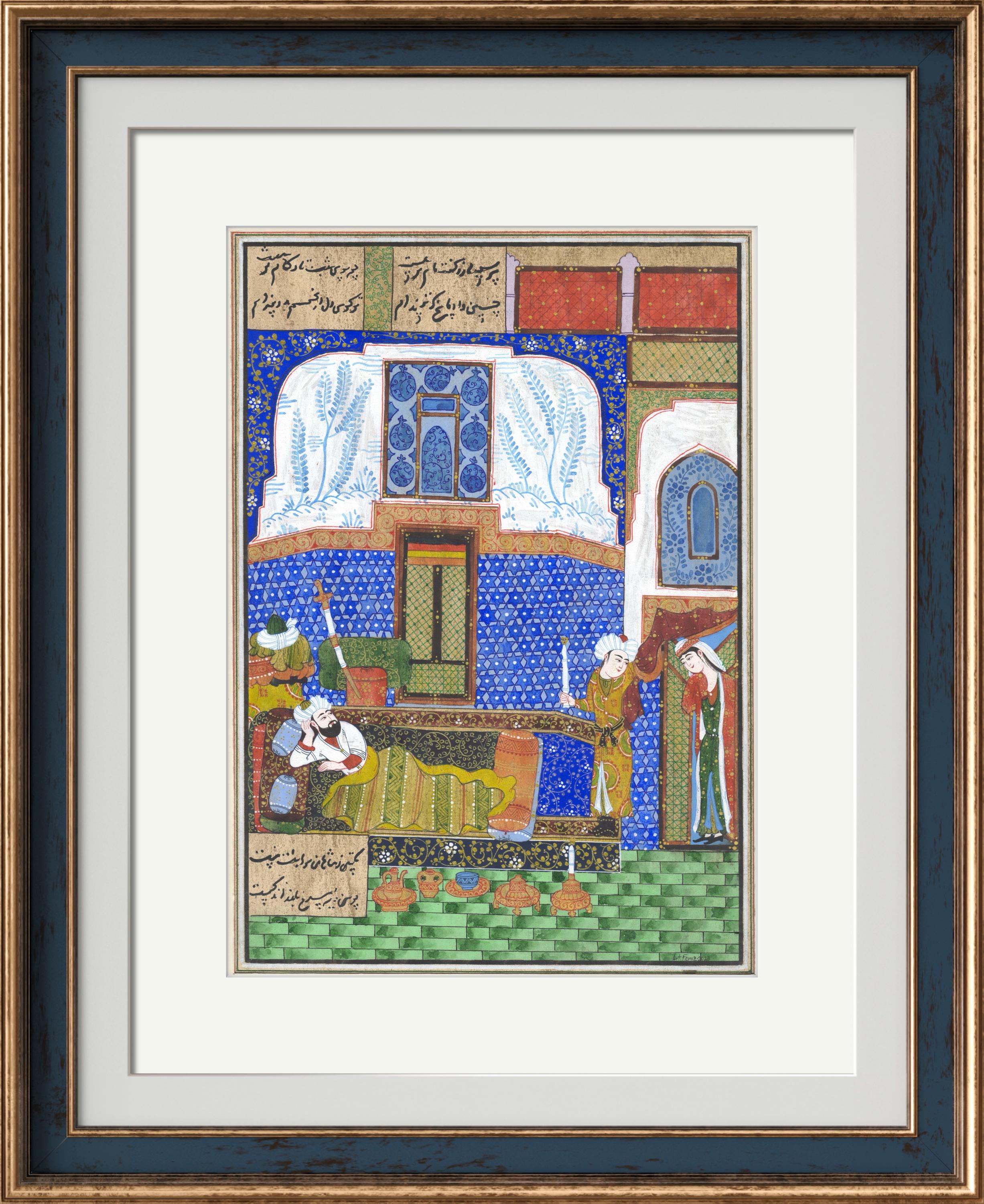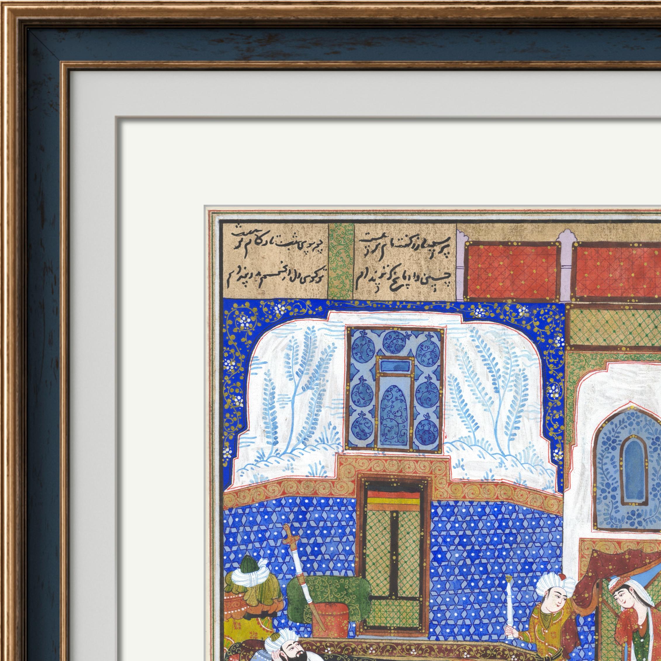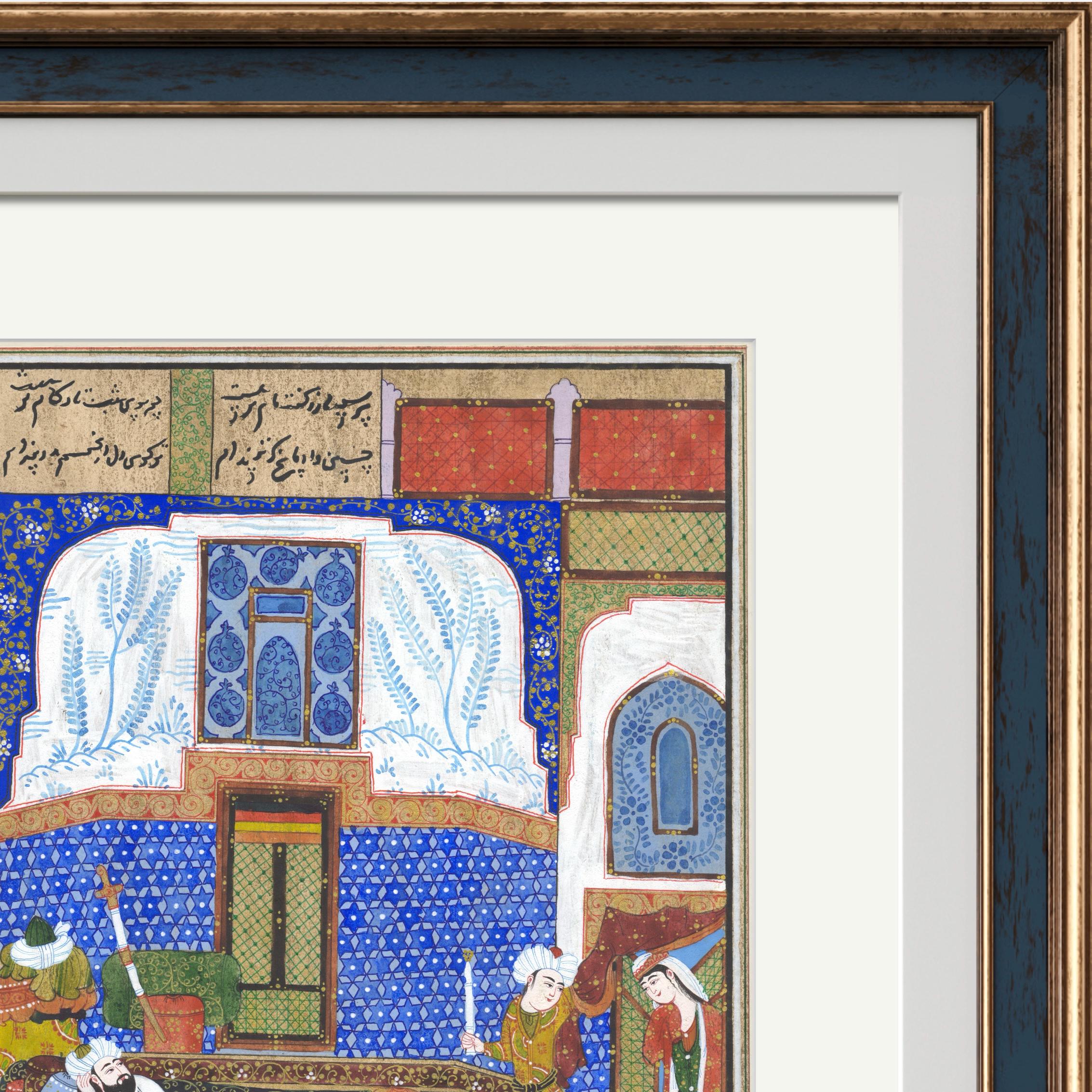 Hand-painted either on mulberry made silk paper or fine birch-made paper, this artwork brings together watercolor, acrylic, liquid ink, and radiant gold leaf. The piece showcases meticulous brushwork, embodying the sophistication and precision that define the art of Central Asian miniatures. Each detail reflects the skill and dedication of traditional craftsmanship, creating a piece that invites viewers into a serene and poetic moment of learning and inspiration.