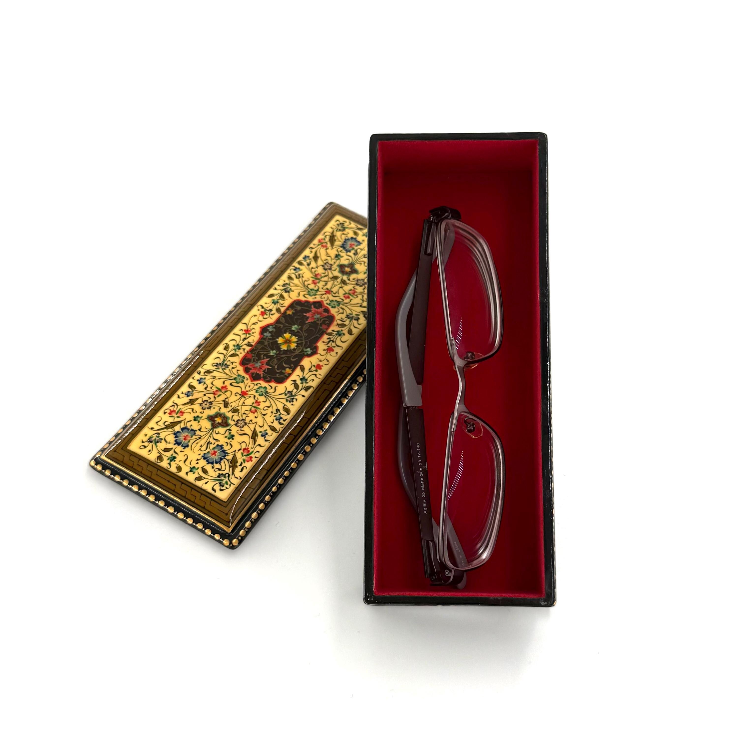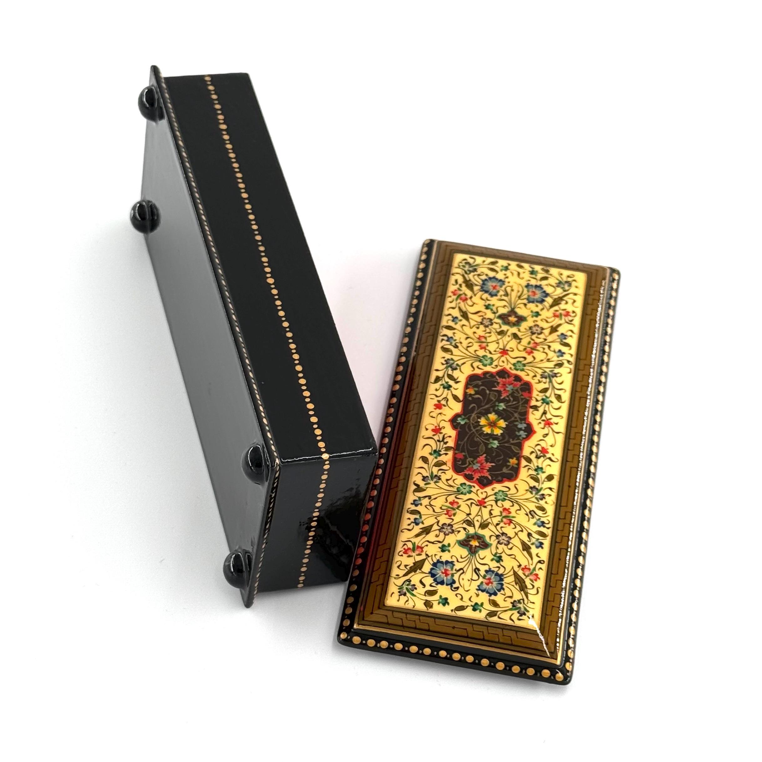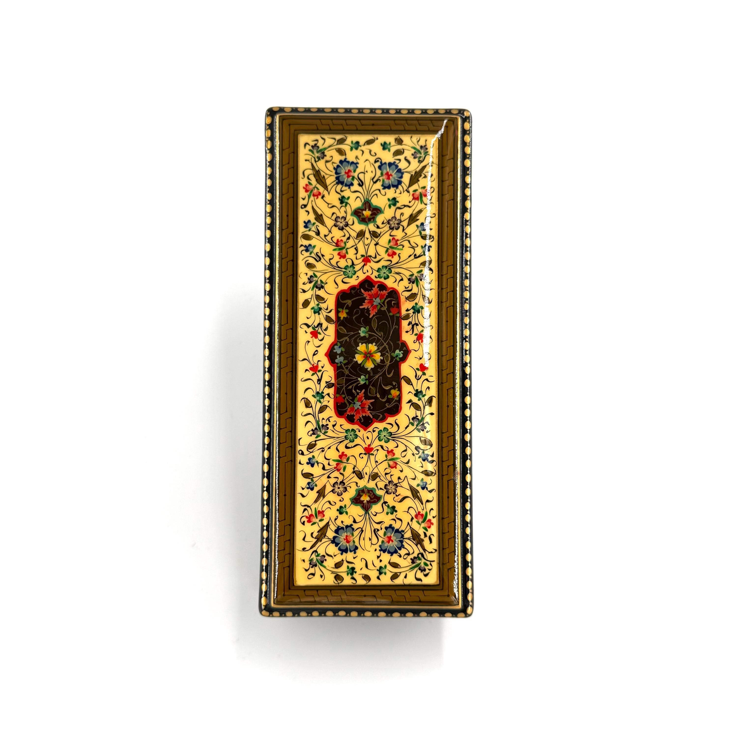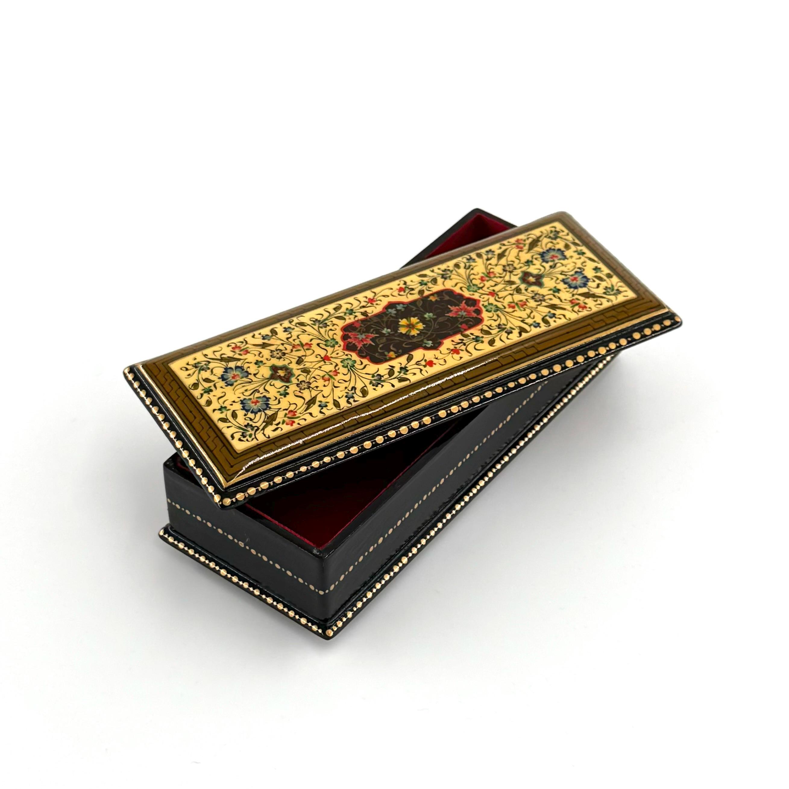 Crafted using a multilayered papier-mâché technique, enhanced with walnut wood, and finished with special lacquer, this box is a true labor of love. The intricate designs, painted with the utmost precision under a magnifying glass, shimmer with vibrant colors, gold leaf, and delicate patterns. Each piece is entirely unique, a product of the artist’s imagination, making it a rare and irreplaceable work of art.