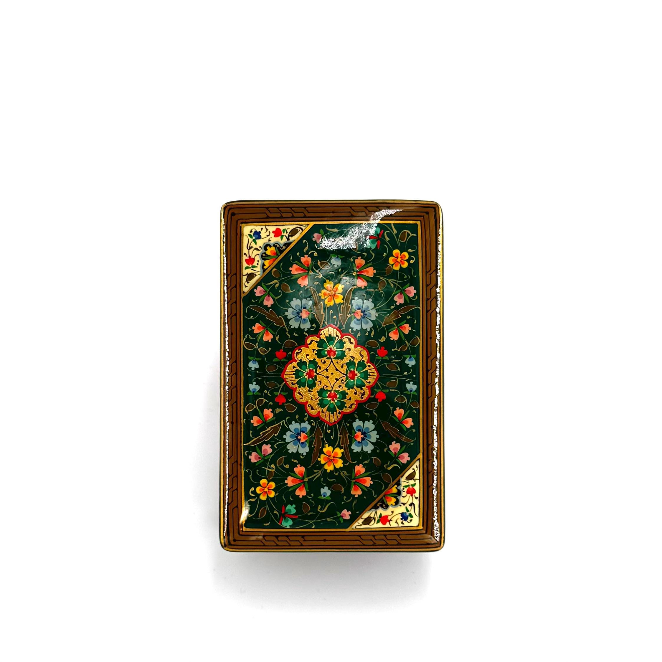 Crafted using a multilayered papier-mâché technique, enhanced with walnut wood, and finished with special lacquer, this box is a true labor of love. The intricate designs, painted with the utmost precision under a magnifying glass, shimmer with vibrant colors, gold leaf, and delicate patterns. Each piece is entirely unique, a product of the artist’s imagination, making it a rare and irreplaceable work of art.