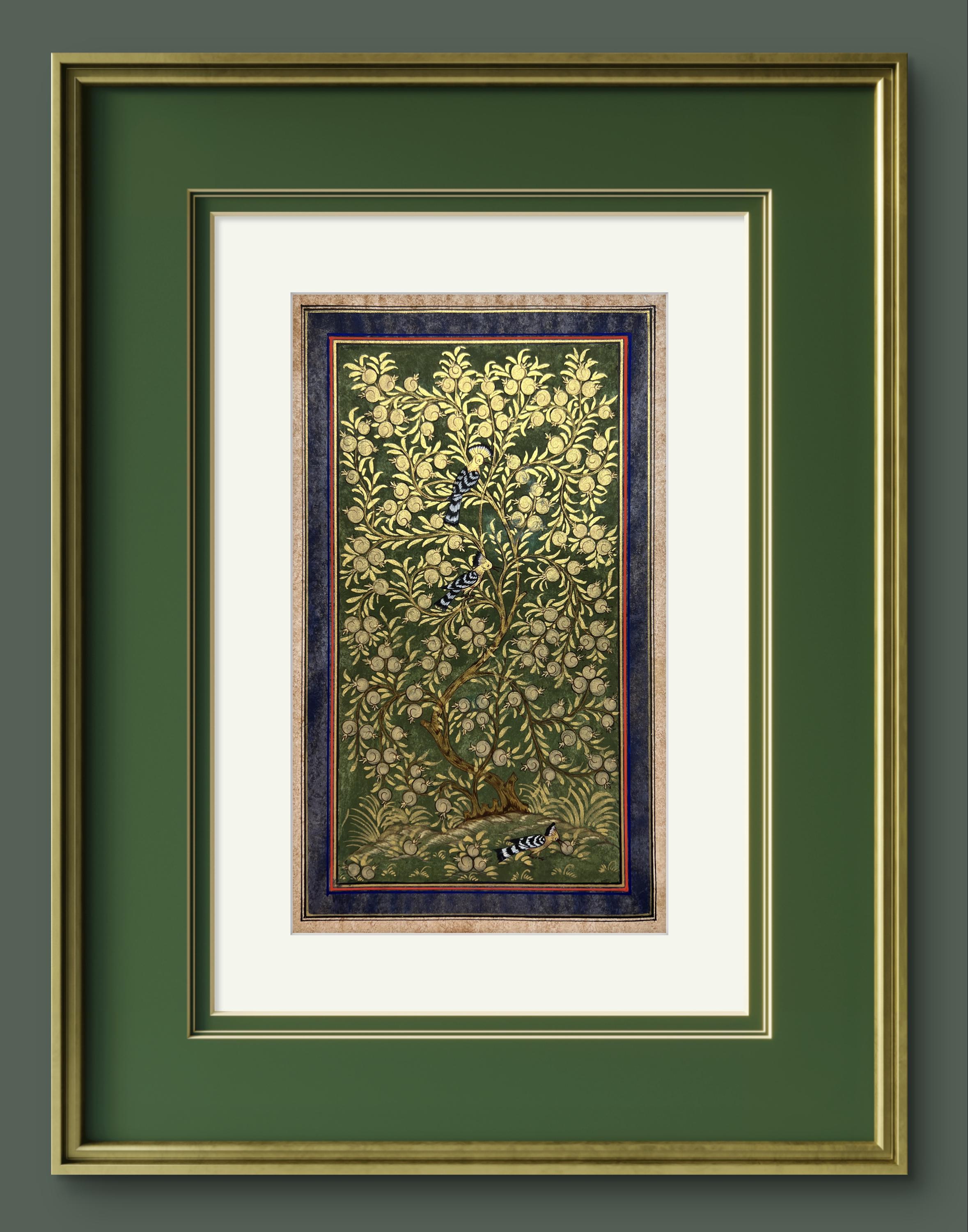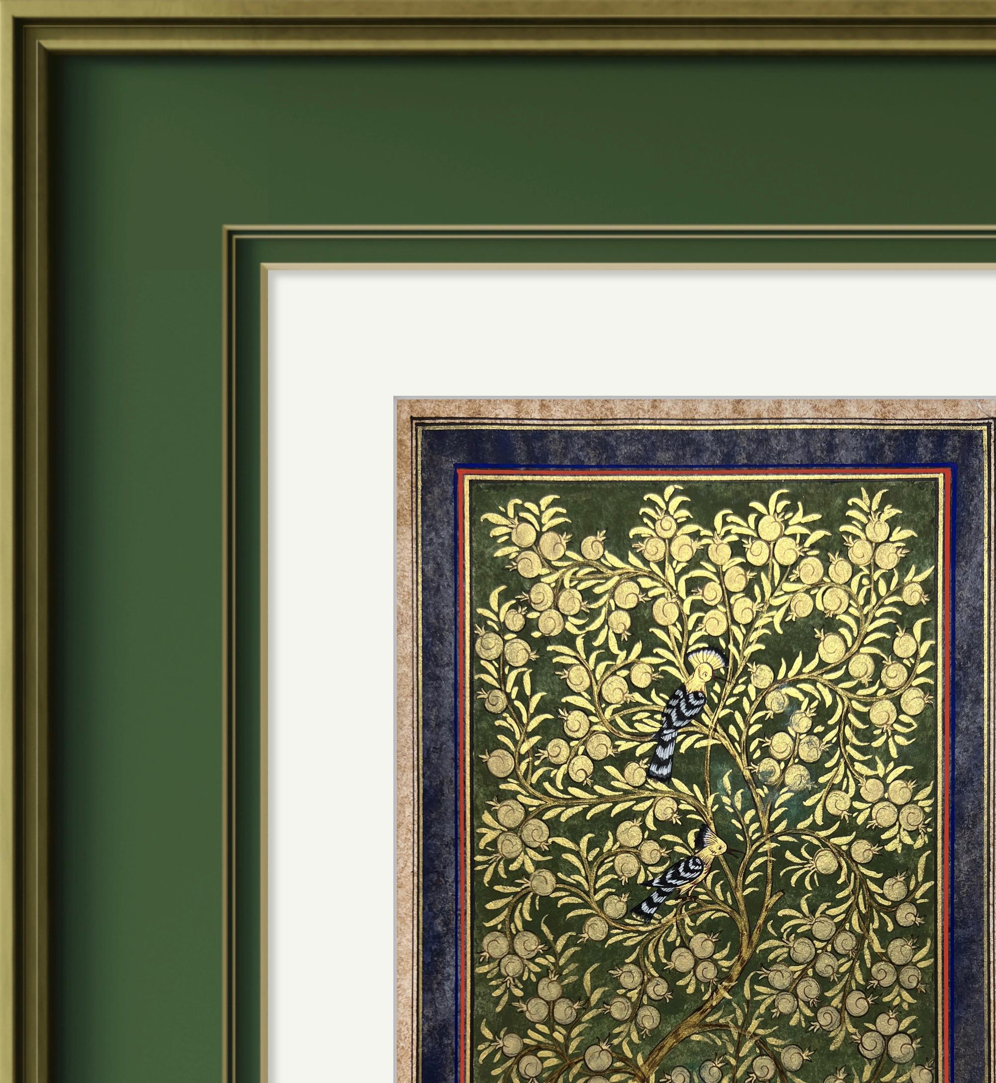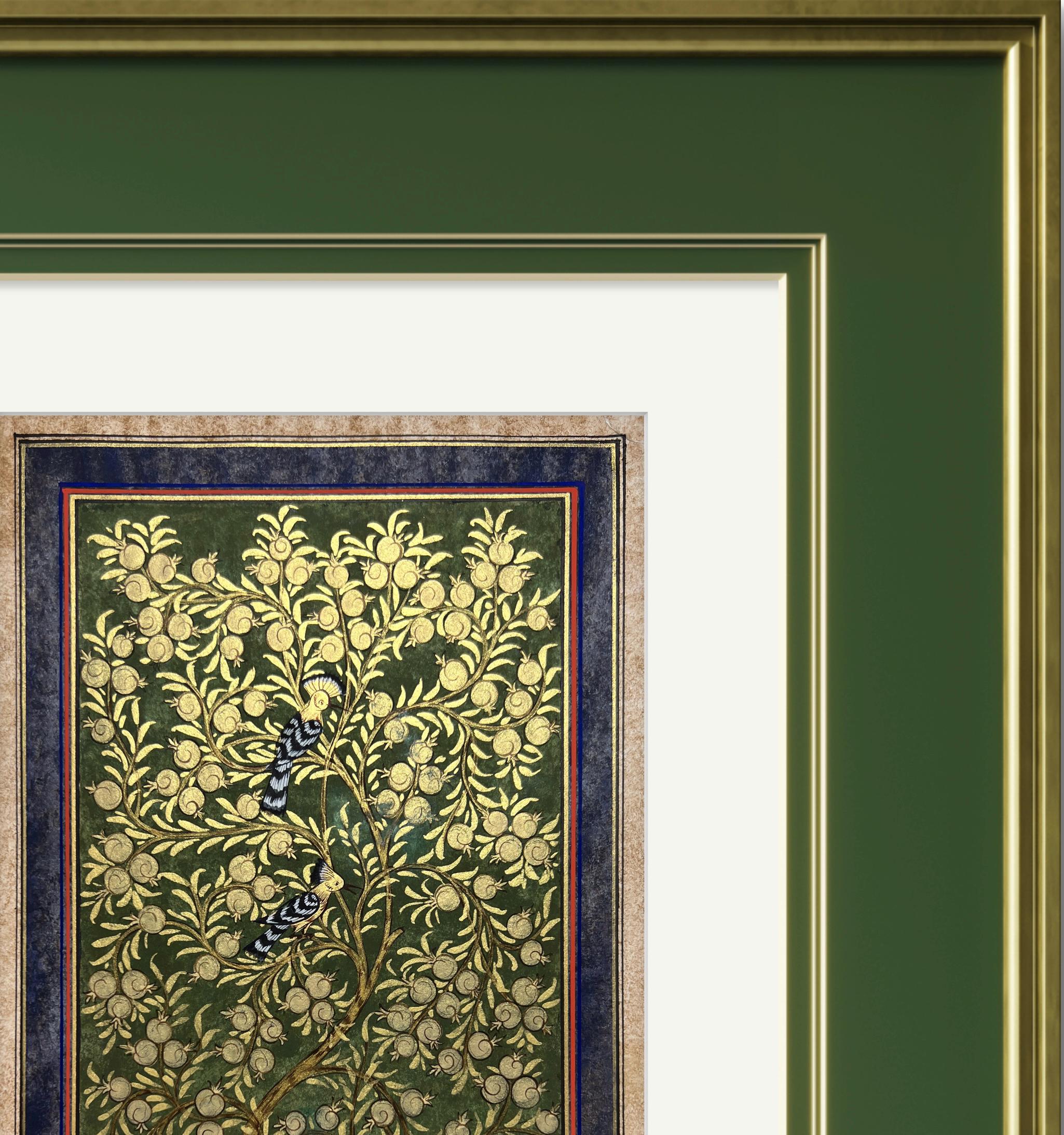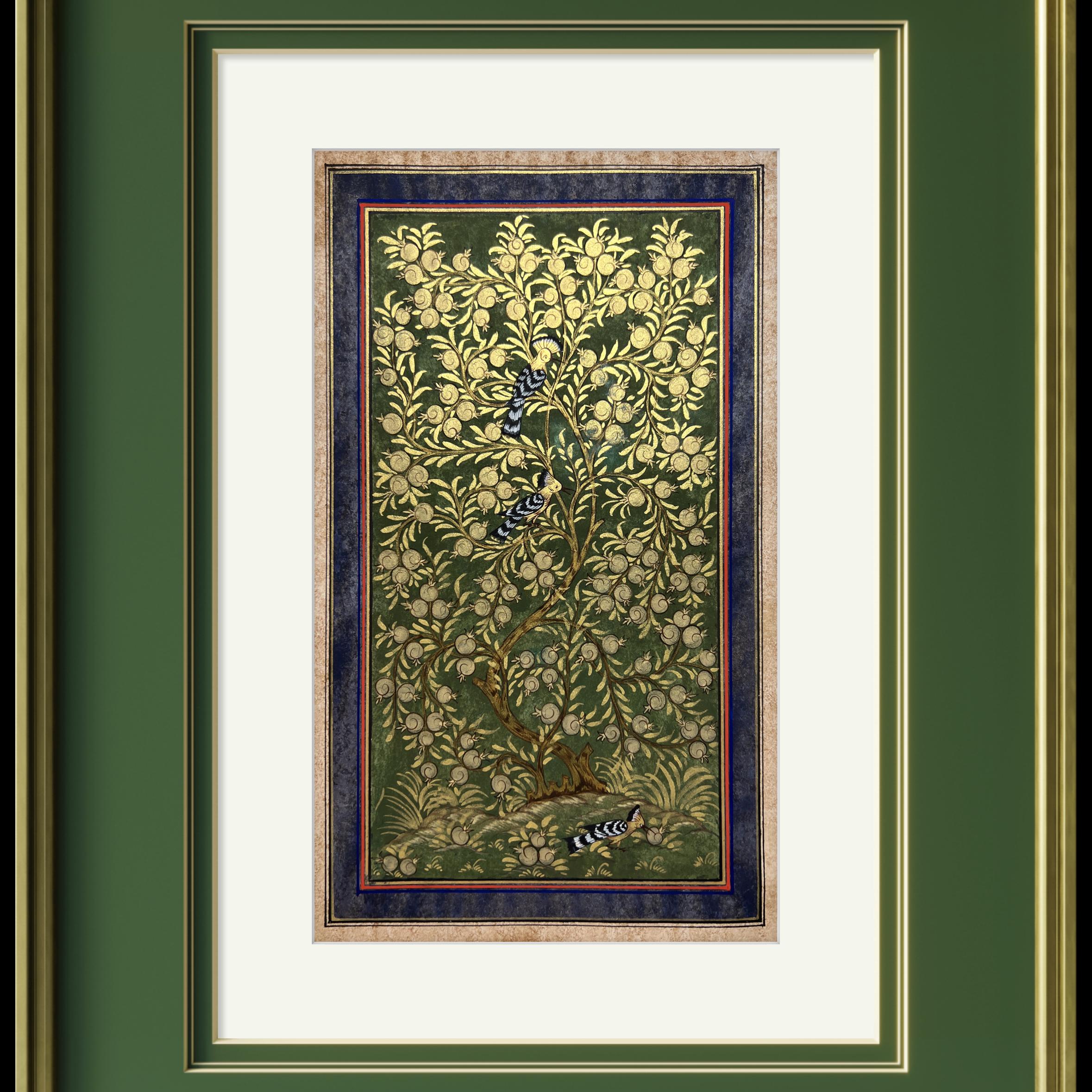 Tree of Paradise - Hoopoe Bird Miniature Painting on Antique Fine Silk Paper | Central Asian Cultural Heritage | Luxury Home Decor (MATTED)