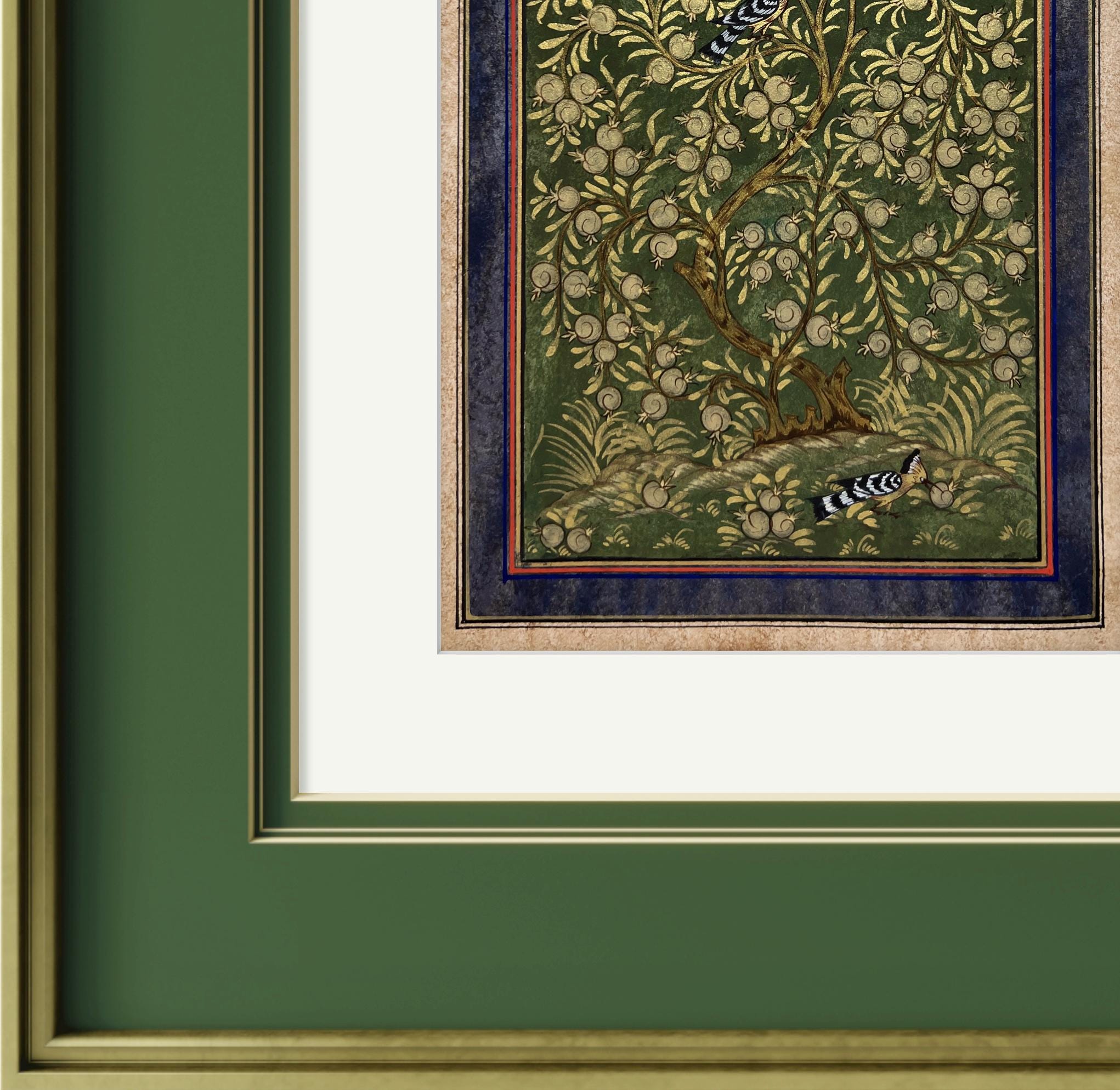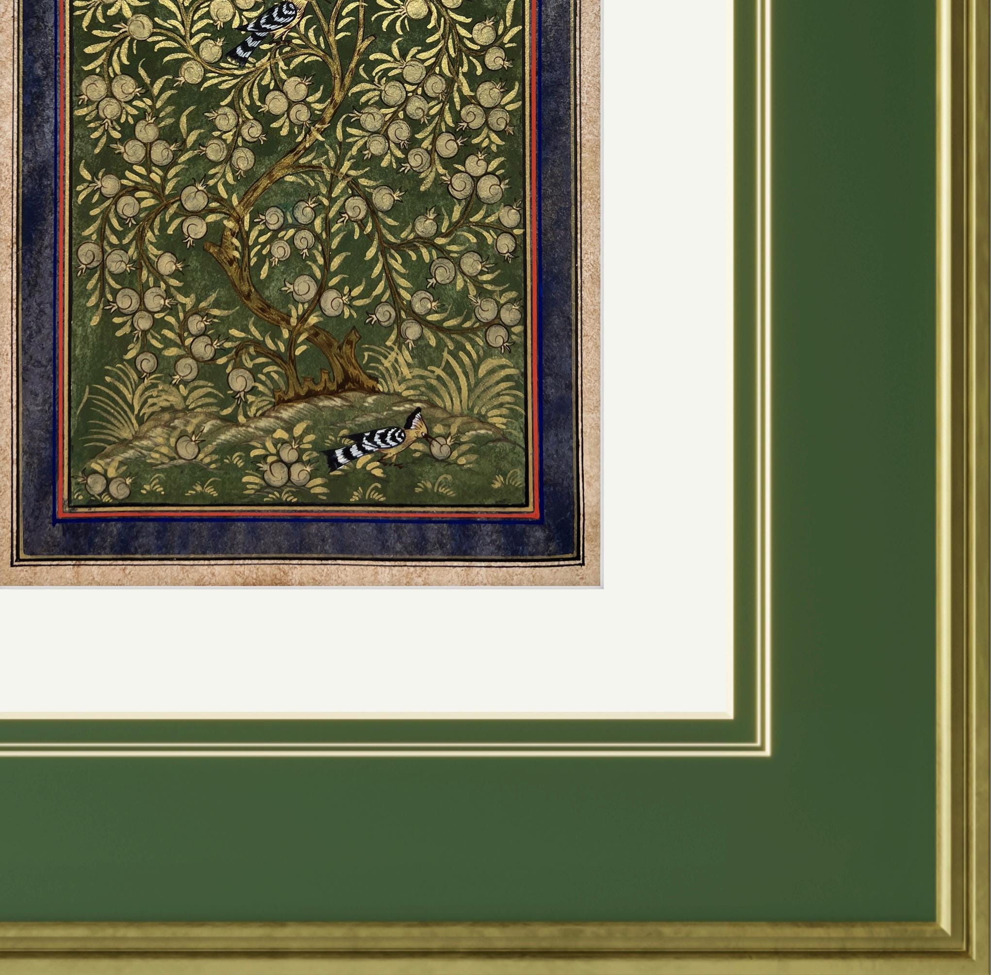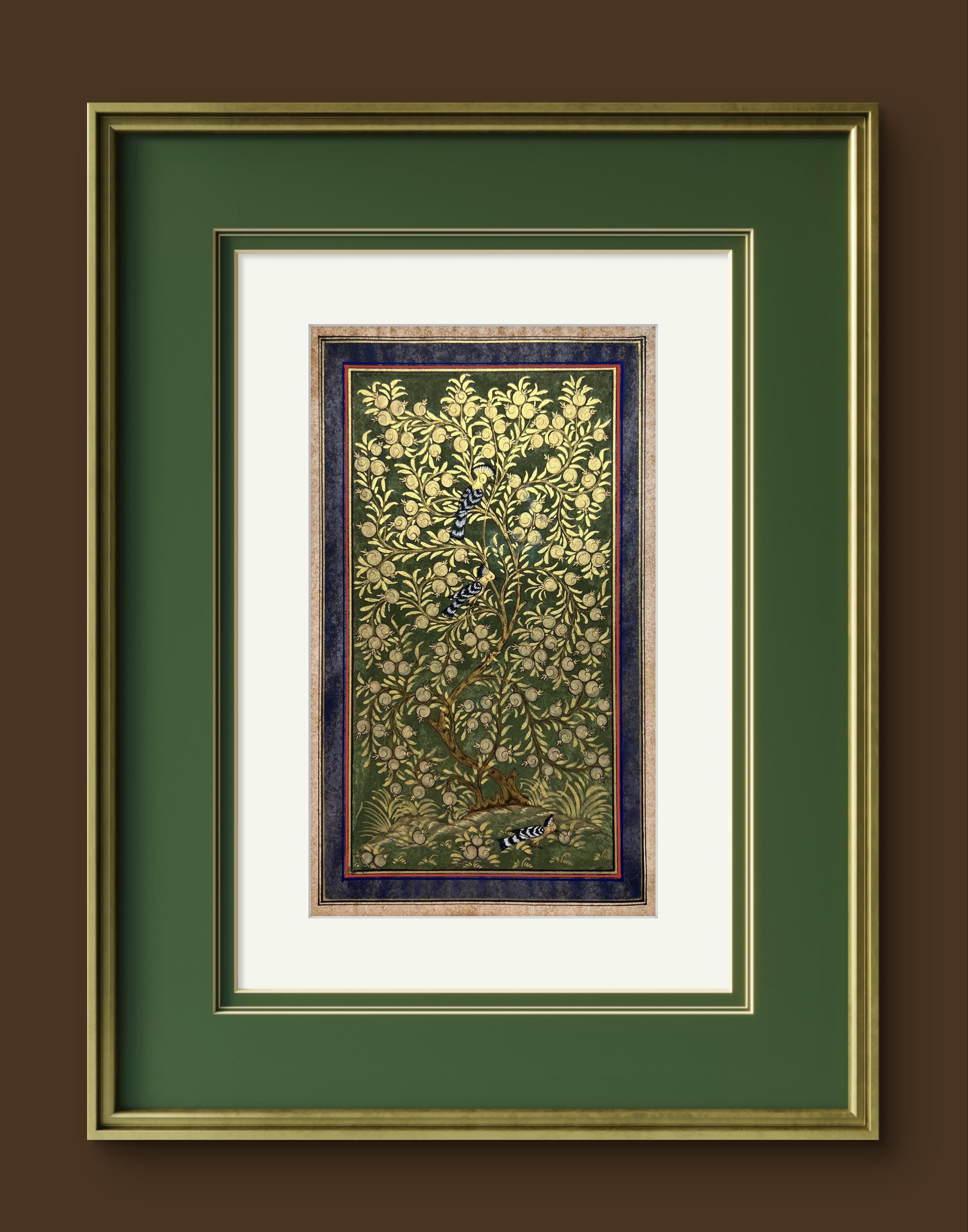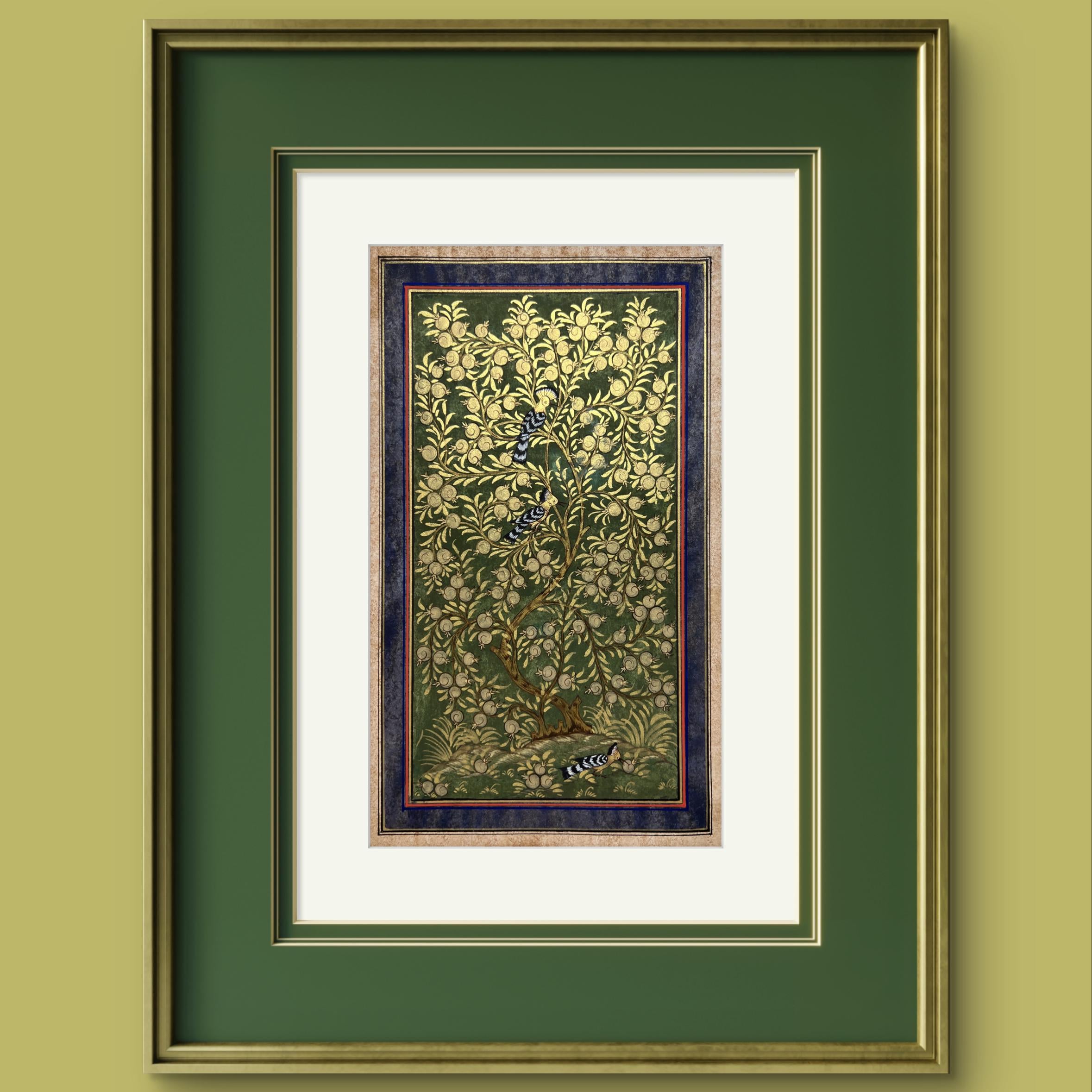 Tree of Paradise - Hoopoe Bird Miniature Painting on Antique Fine Silk Paper | Central Asian Cultural Heritage | Luxury Home Decor (MATTED)