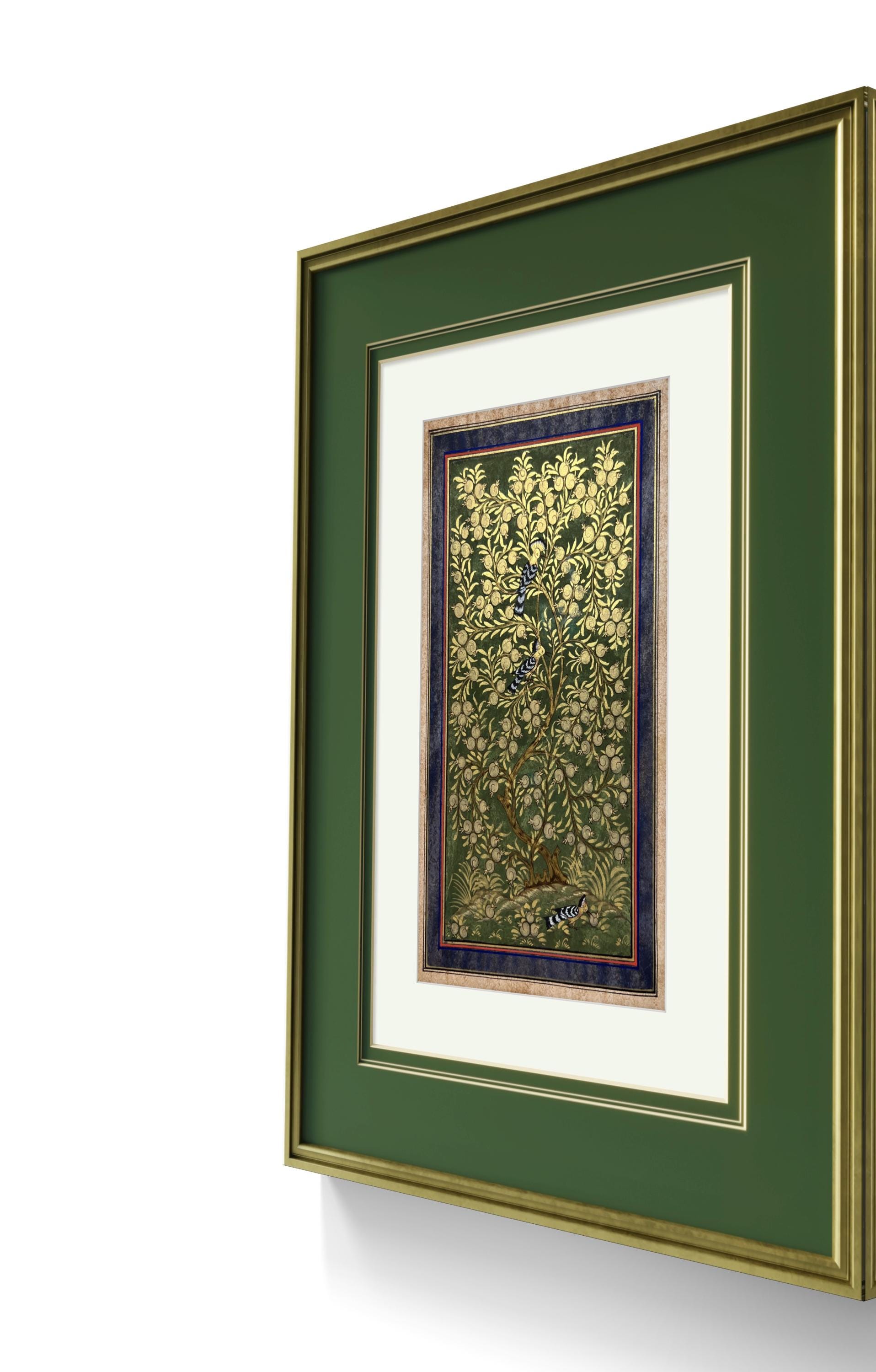 “Tree of Paradise: Pomegranates and Hoopoe Birds” captures the essence of spiritual beauty, the interconnectedness of life, and the serene balance of nature, all encapsulated in the timeless art of miniature painting.