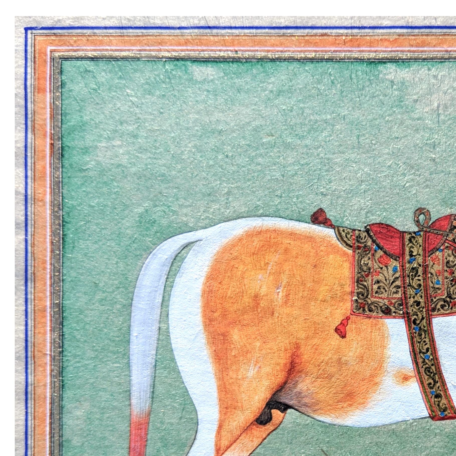 This unique artwork, titled “Royal Steed,” celebrates the nobility, strength, and elegance of a majestic horse. The painting captures the regal essence of a royal steed, standing as a symbol of grace and power. Every detail, from the flowing mane to the intricate embellishments on the saddle and bridle, is a testament to the mastery of fine miniature art. The piece invites viewers to immerse themselves in the beauty and timeless legacy of equestrian culture, evoking admiration for its elegance and sophistication.