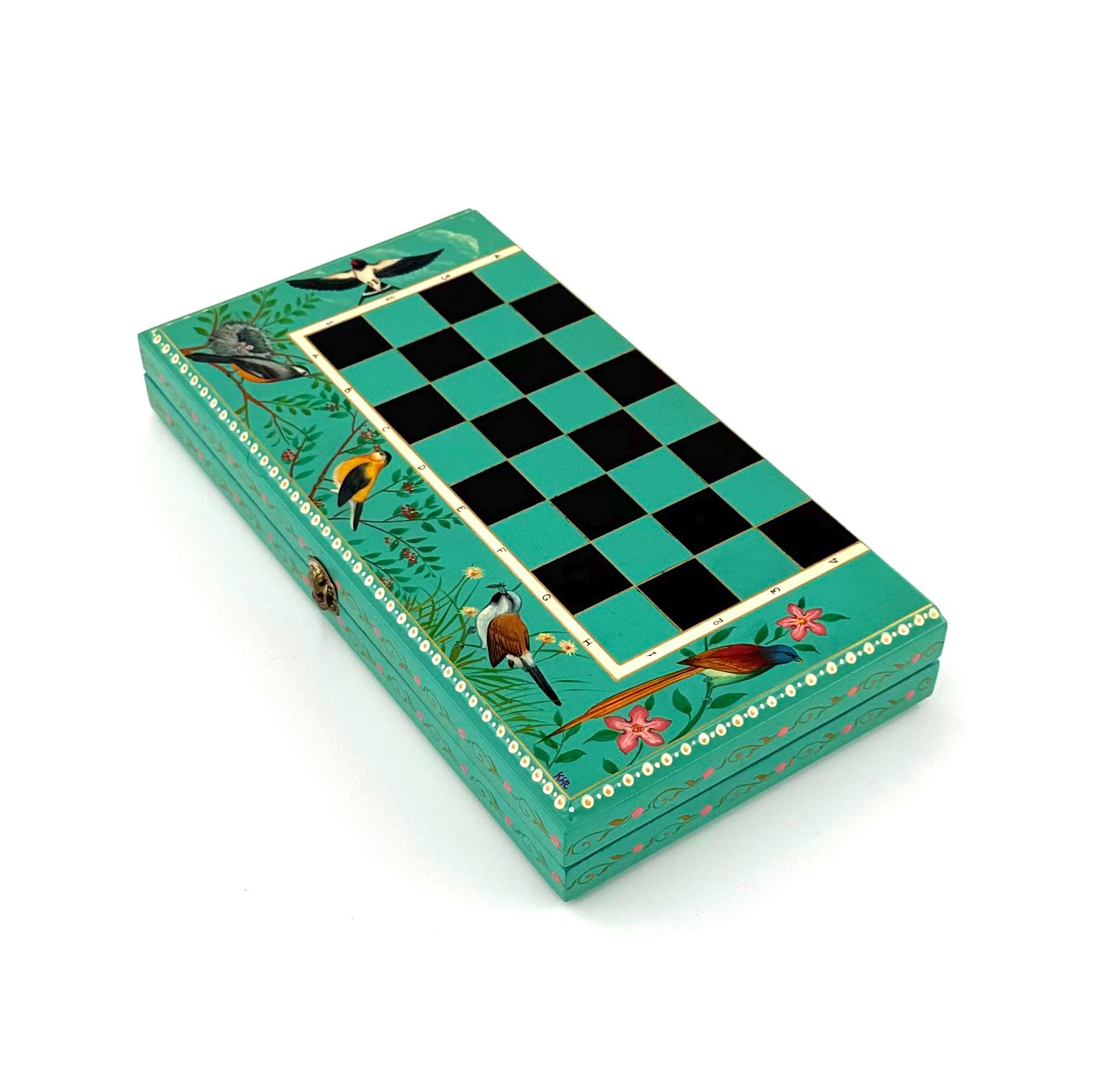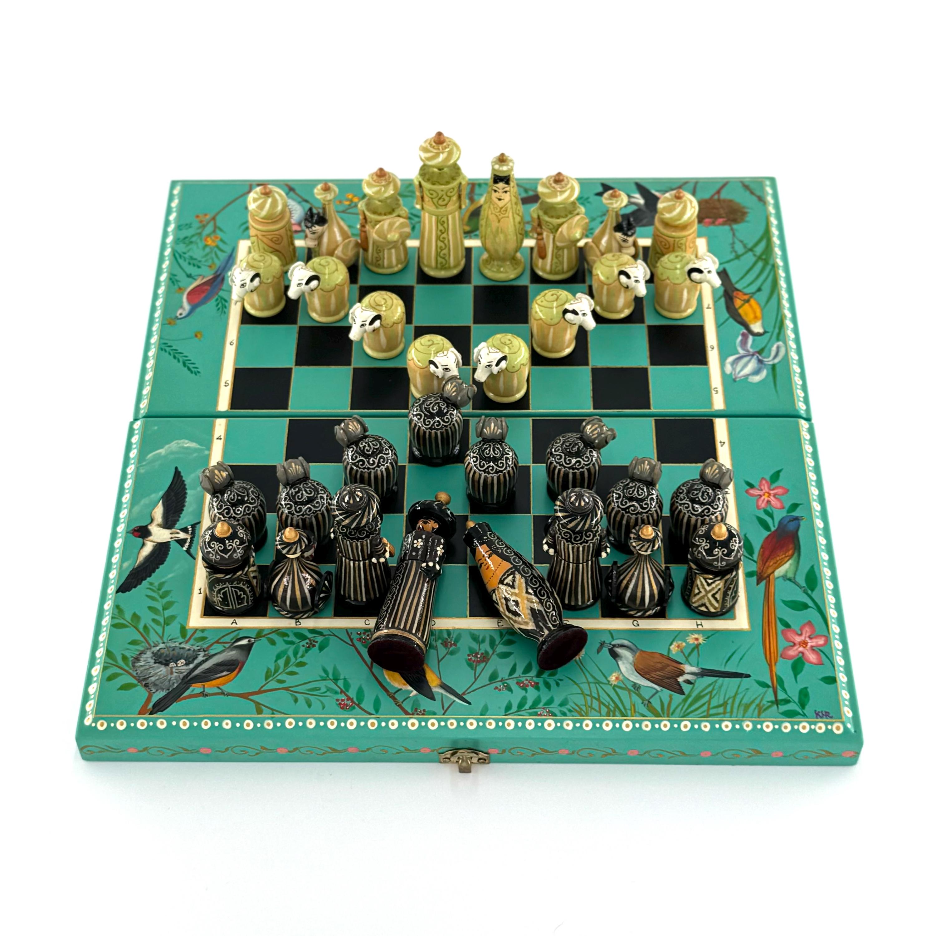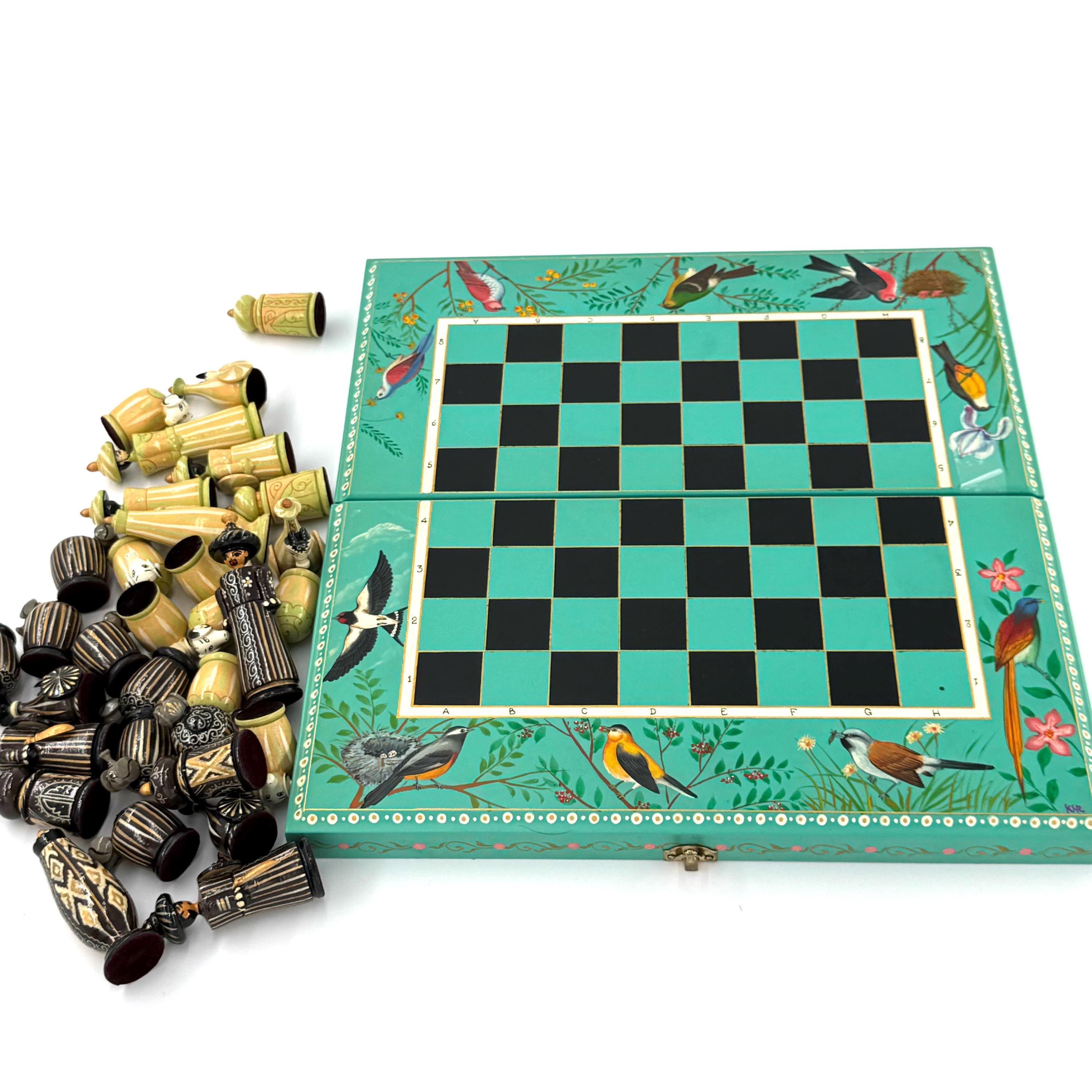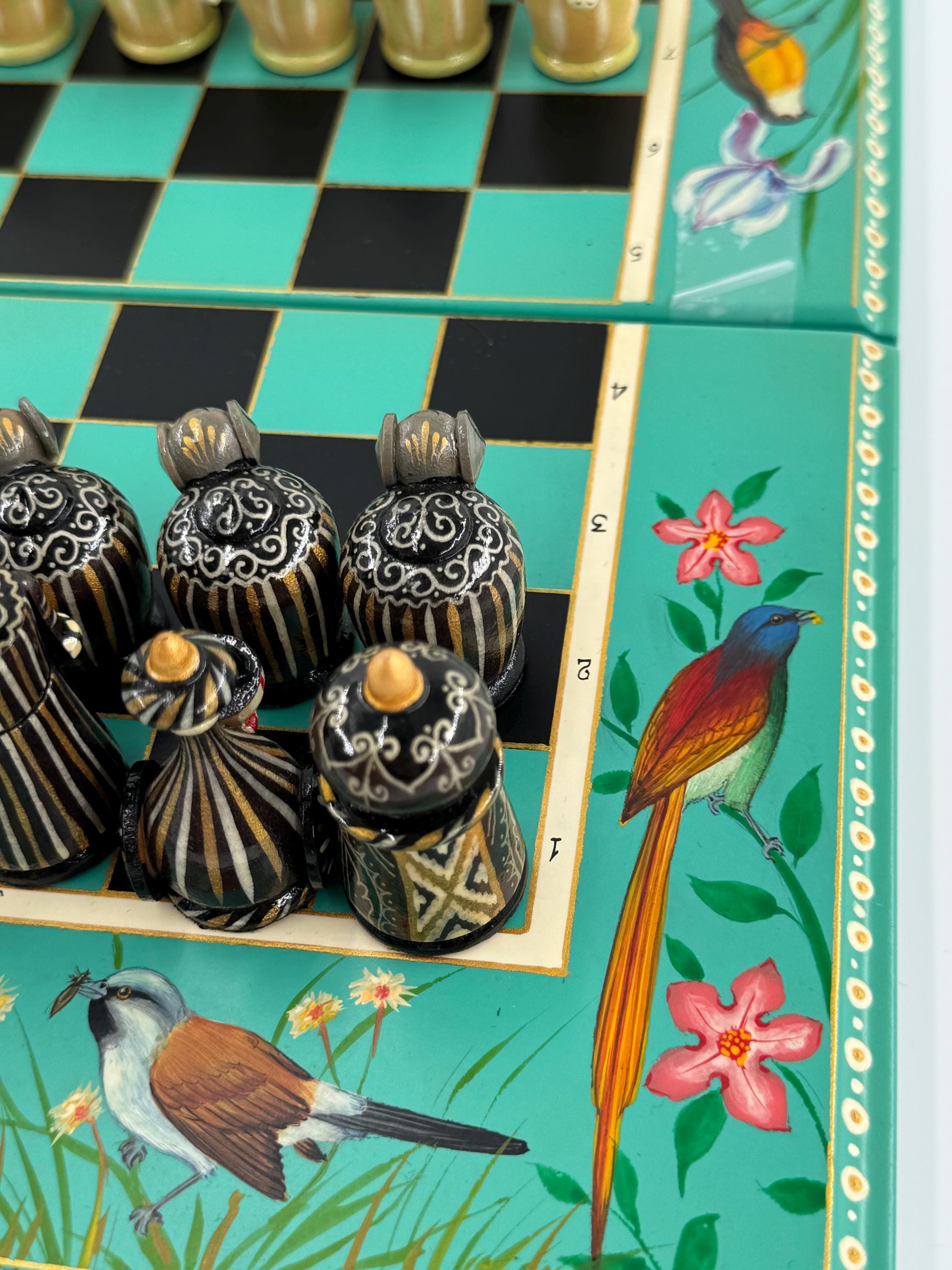The foldable chessboard, with its secure locking mechanism, is adorned with stunning hand-painted designs inspired by nature, including delicate birds and floral patterns. Each chess piece is a miniature work of art, hand-painted with fine detail using vintage-style patterns and a step-by-step lacquer technique. This labor-intensive process ensures not only unmatched intricacy but also a durable, polished finish that will last for generations.