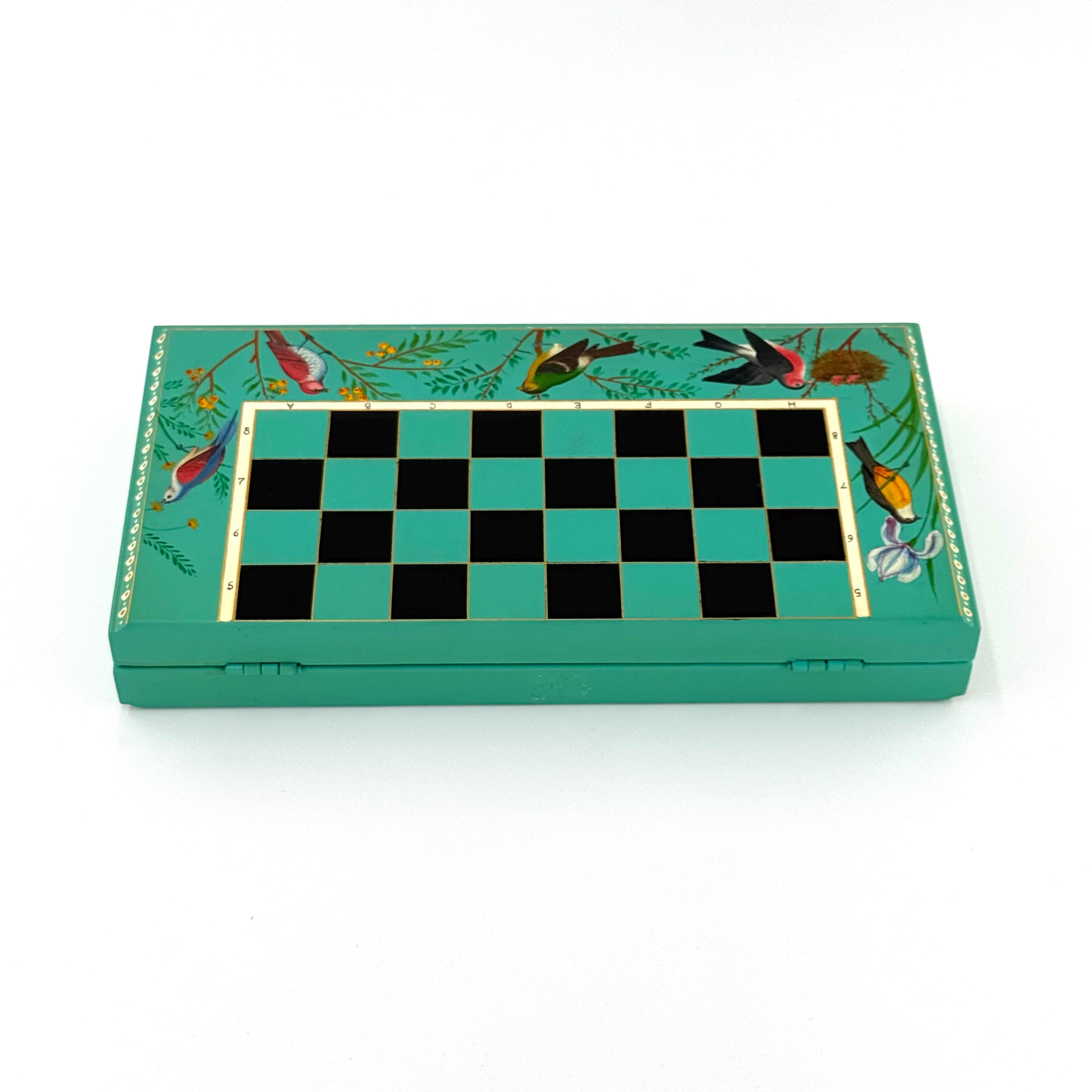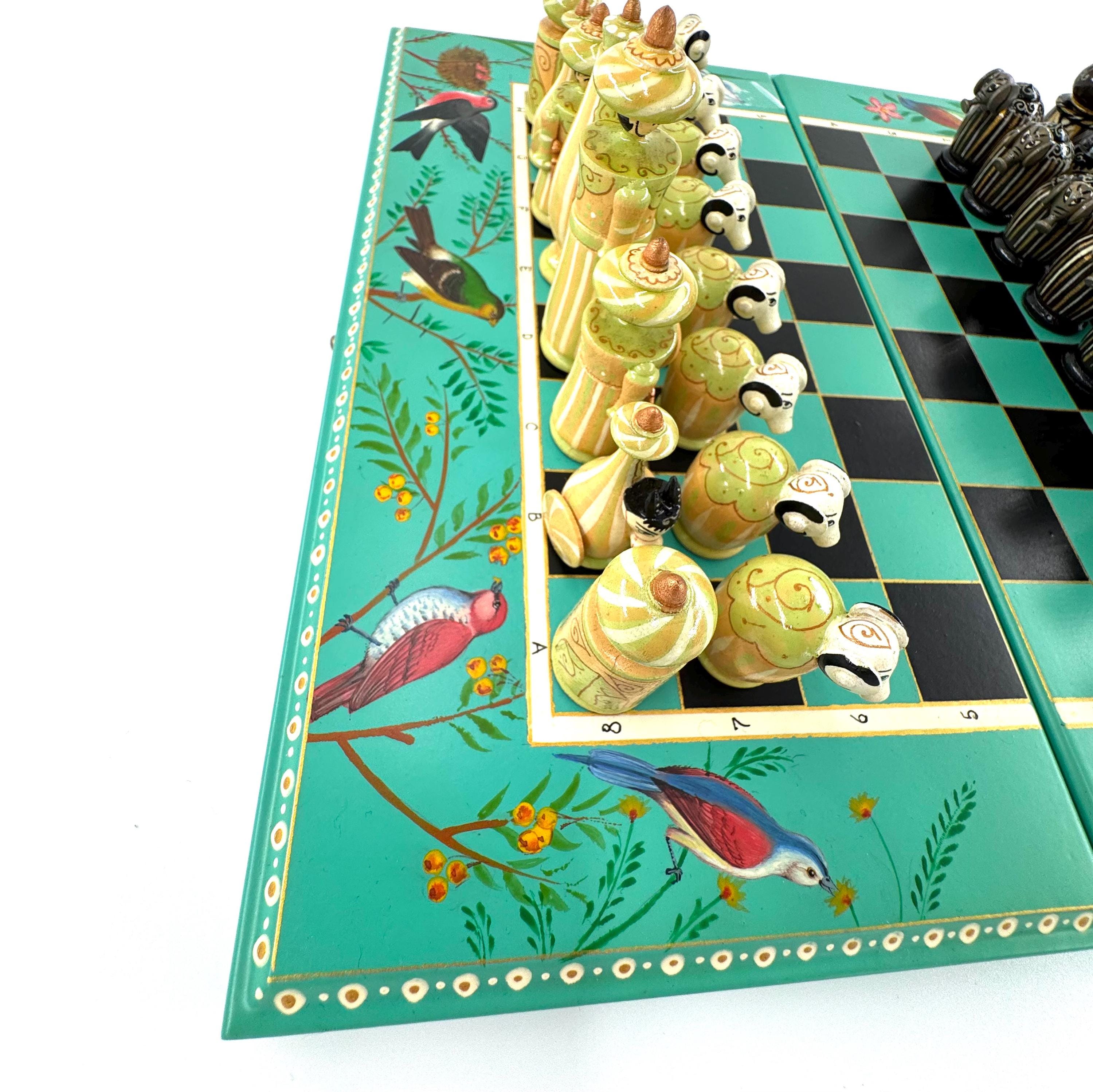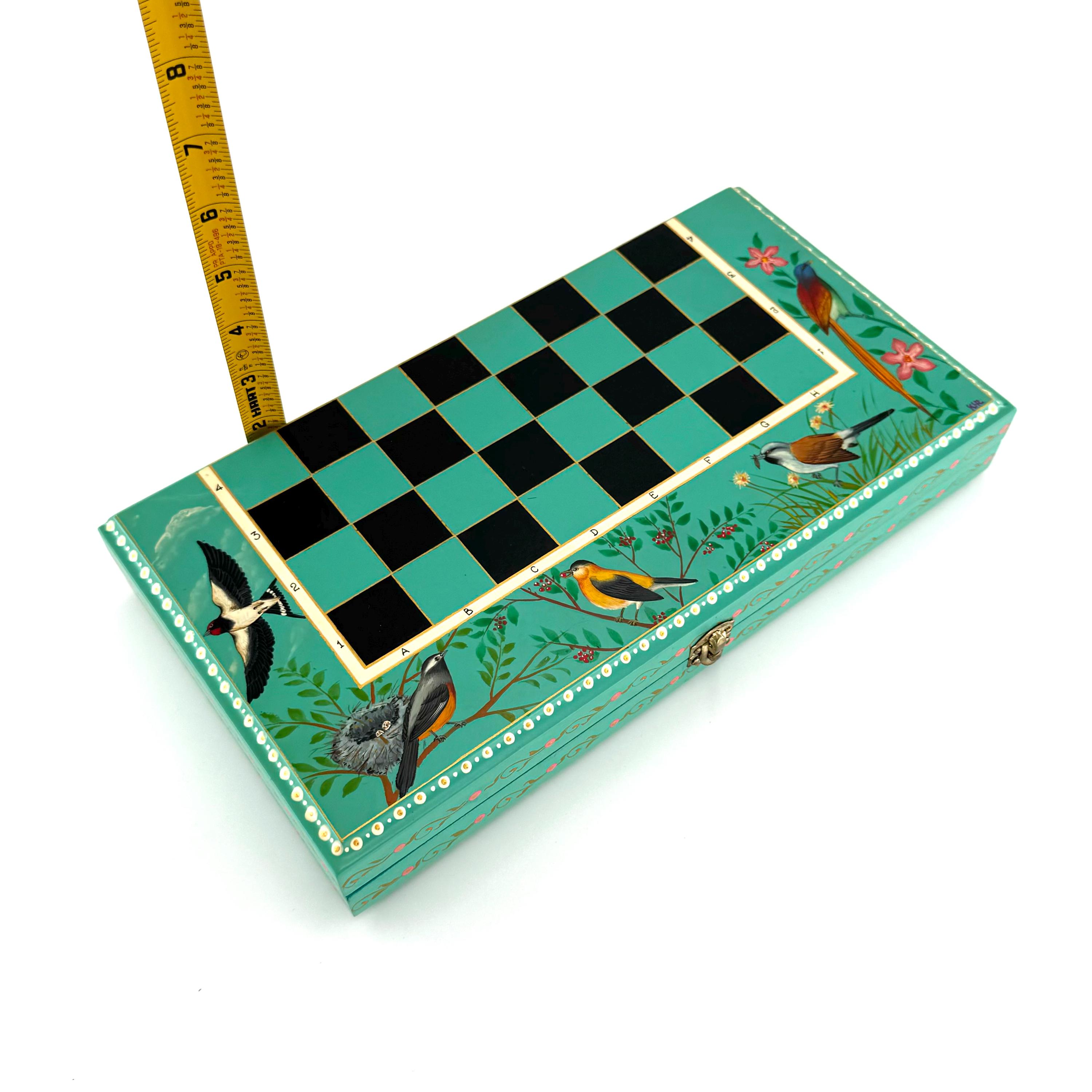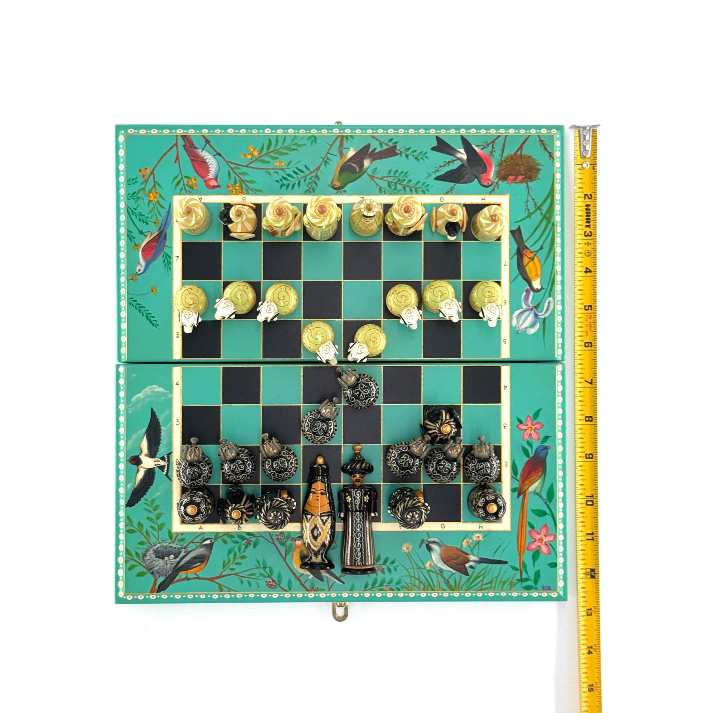 The foldable chessboard, with its secure locking mechanism, is adorned with stunning hand-painted designs inspired by nature, including delicate birds and floral patterns. Each chess piece is a miniature work of art, hand-painted with fine detail using vintage-style patterns and a step-by-step lacquer technique. This labor-intensive process ensures not only unmatched intricacy but also a durable, polished finish that will last for generations.
