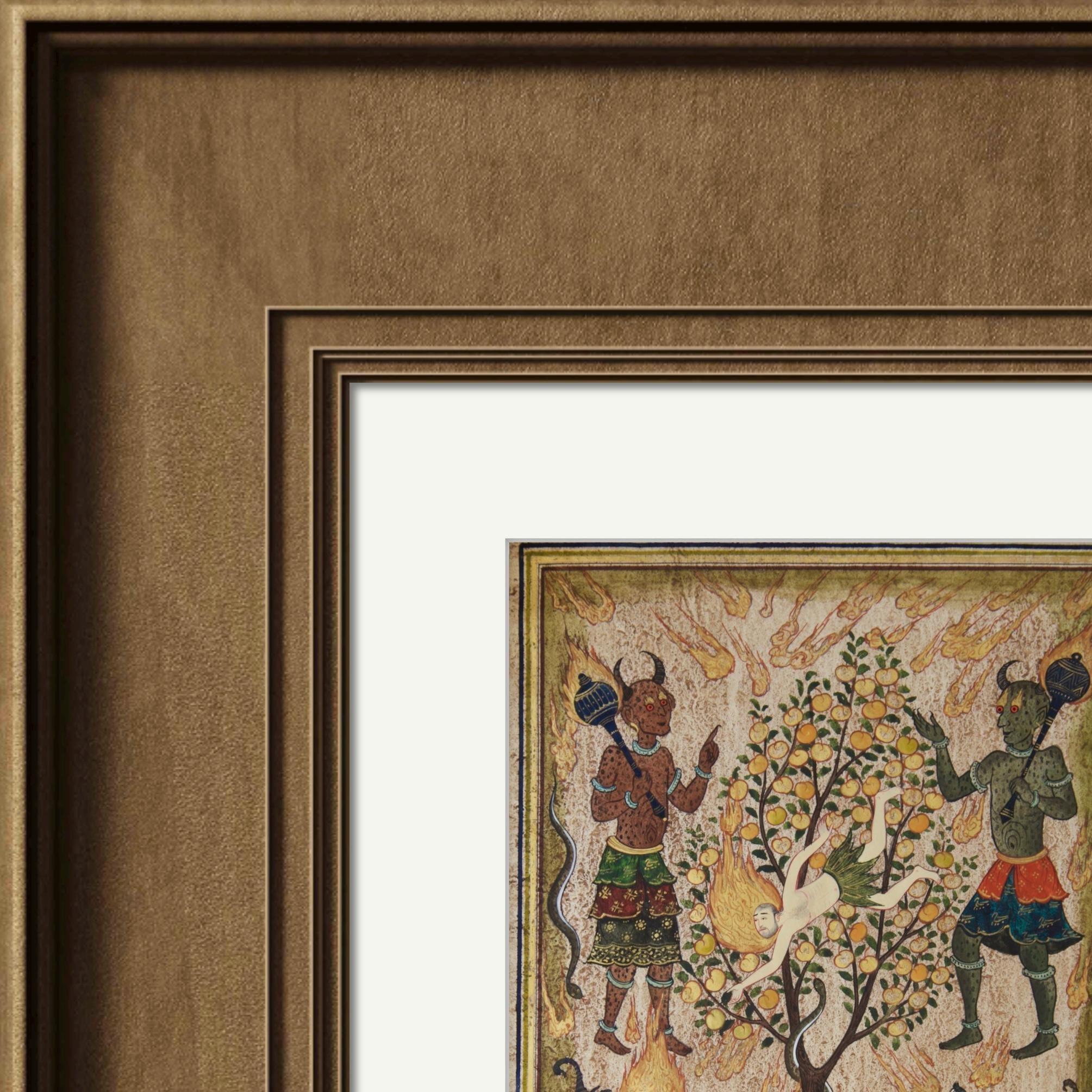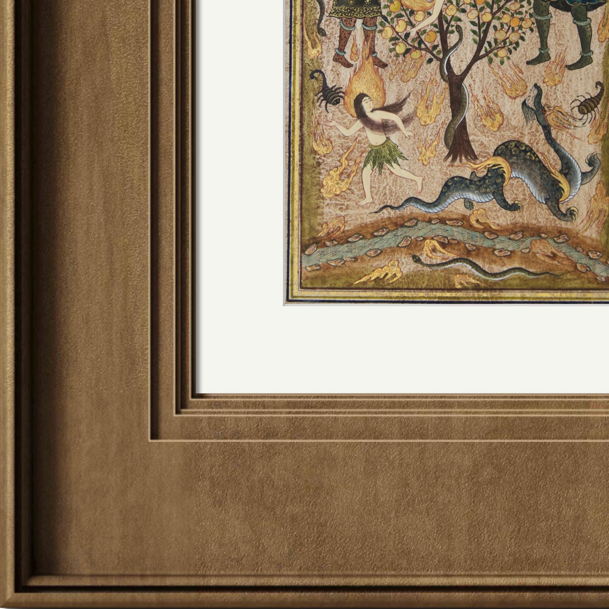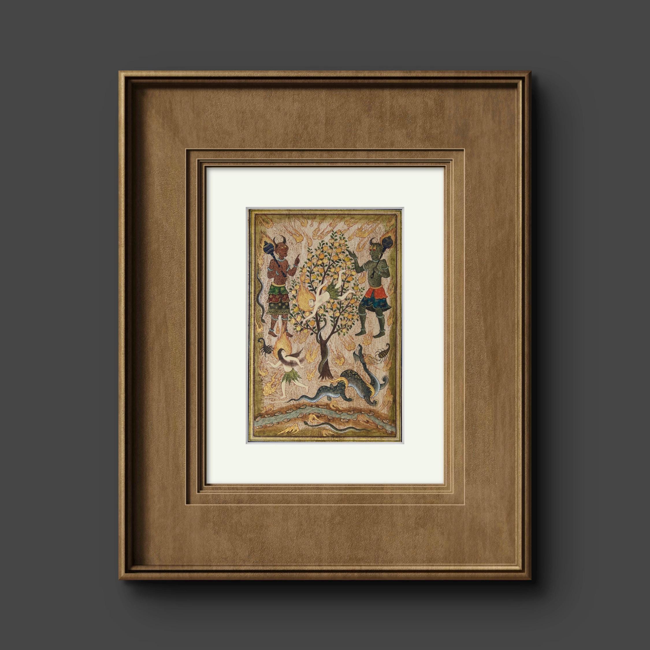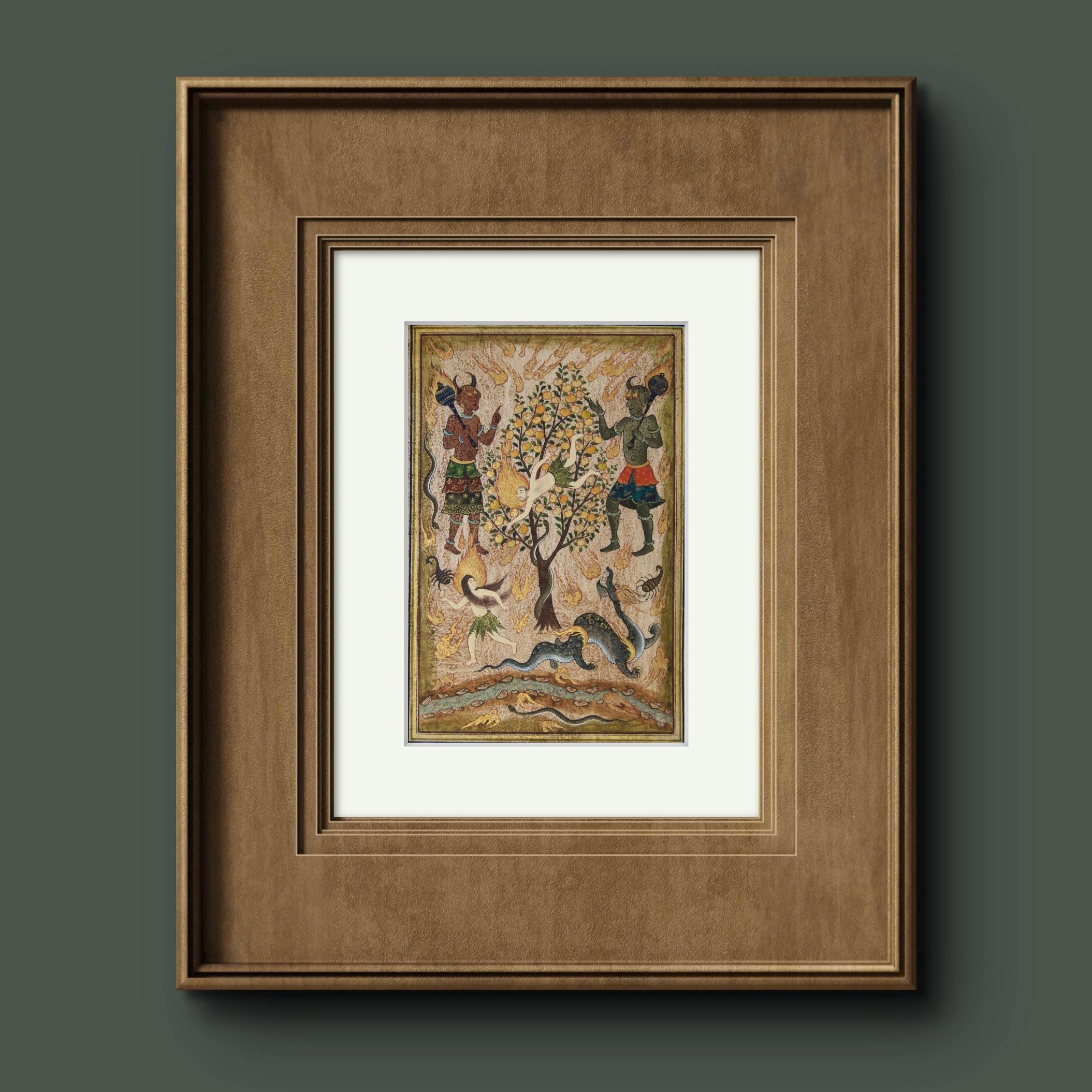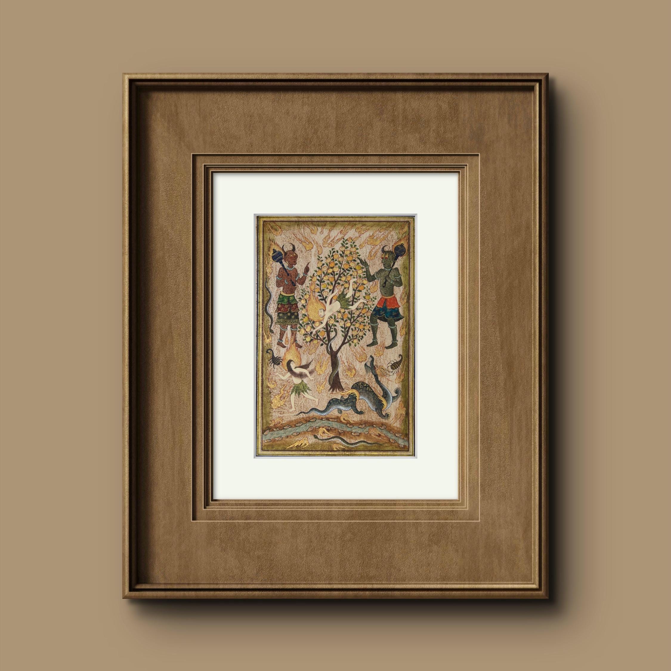 Immerse yourself in the breathtaking beauty of “The Eternal Garden”, a masterfully handcrafted Persian miniature painting that portrays the timeless story of Adam and Eve’s fall from paradise, as recounted in Islamic tradition. This exquisite artwork captures the Garden of Eden in all its splendor, featuring Adam, Eve, the angels, the forbidden tree, and the serpent, surrounded by intricate details and vibrant compositions.