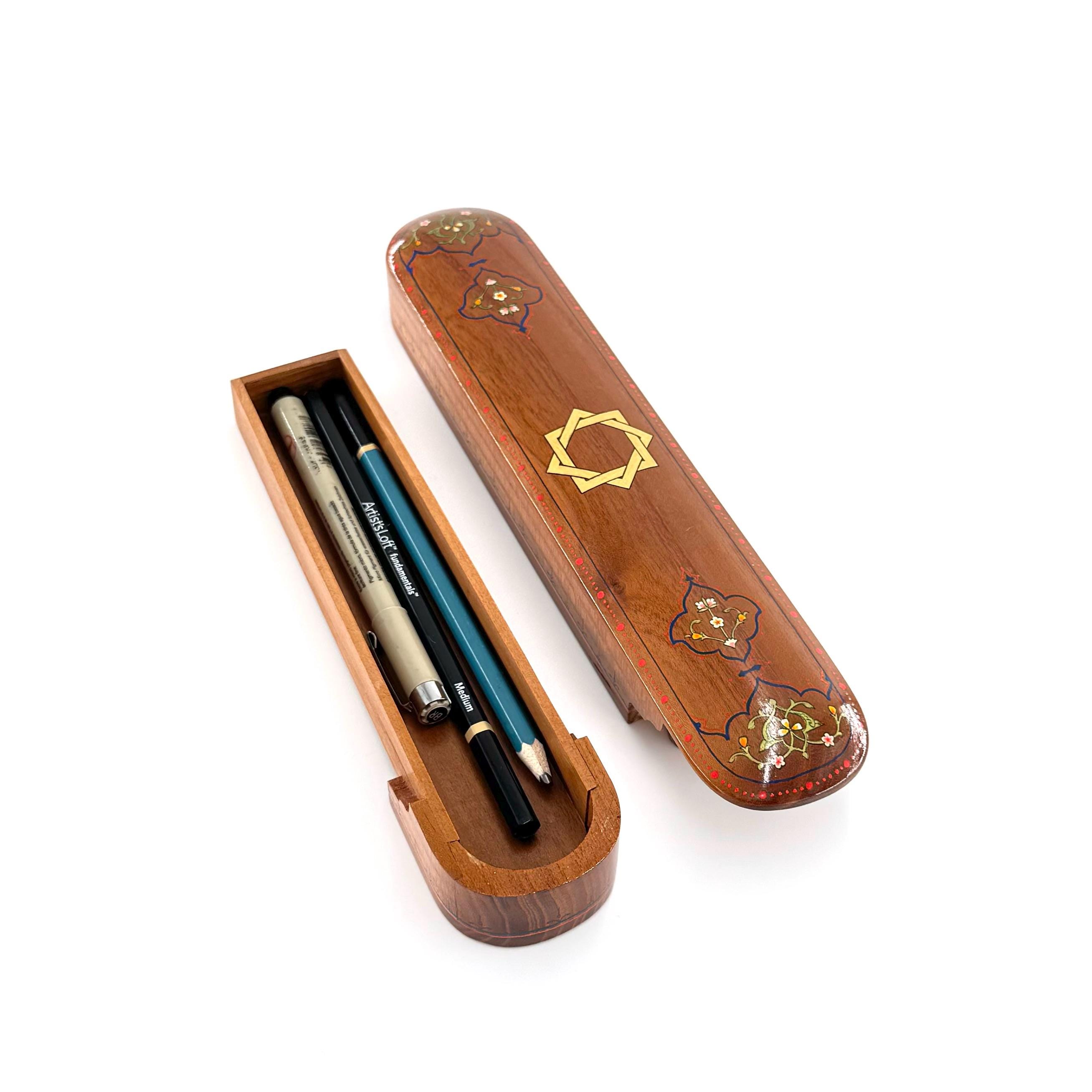 Handcrafted Walnut Wood Pencil Box | Ornamental Lacquered Case with Fine Patterns | Multipurpose Cigar, Jewelry, or Pencil Case.
