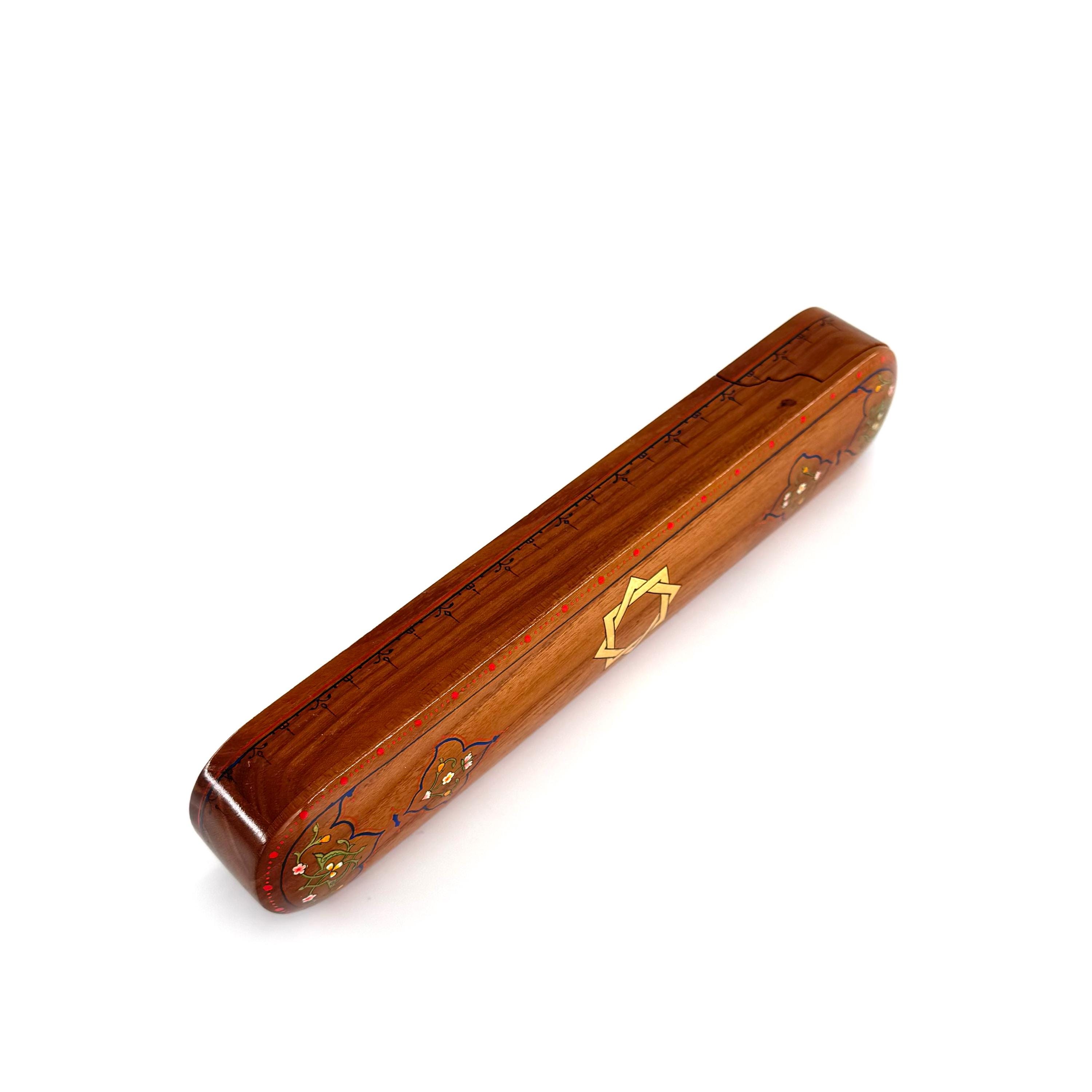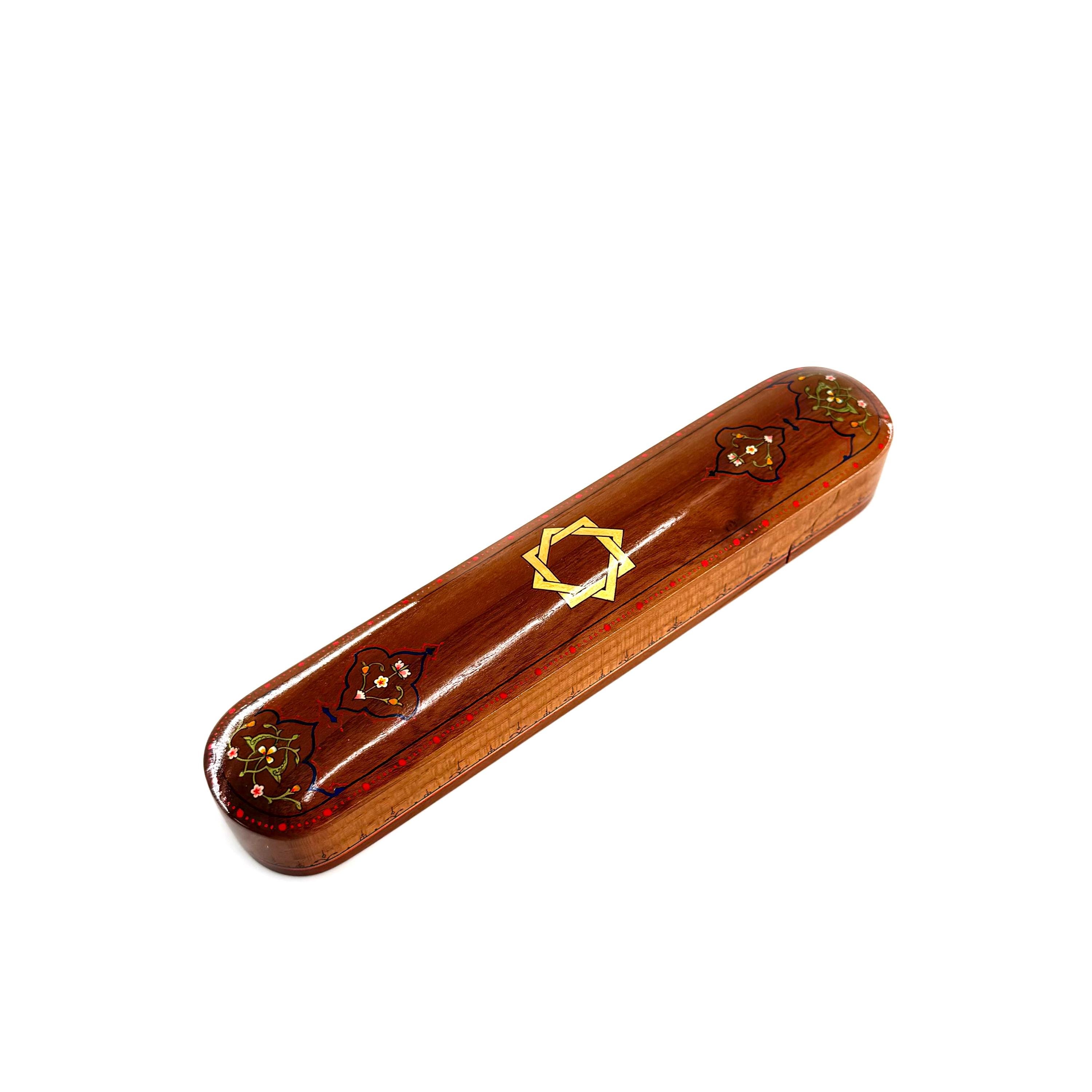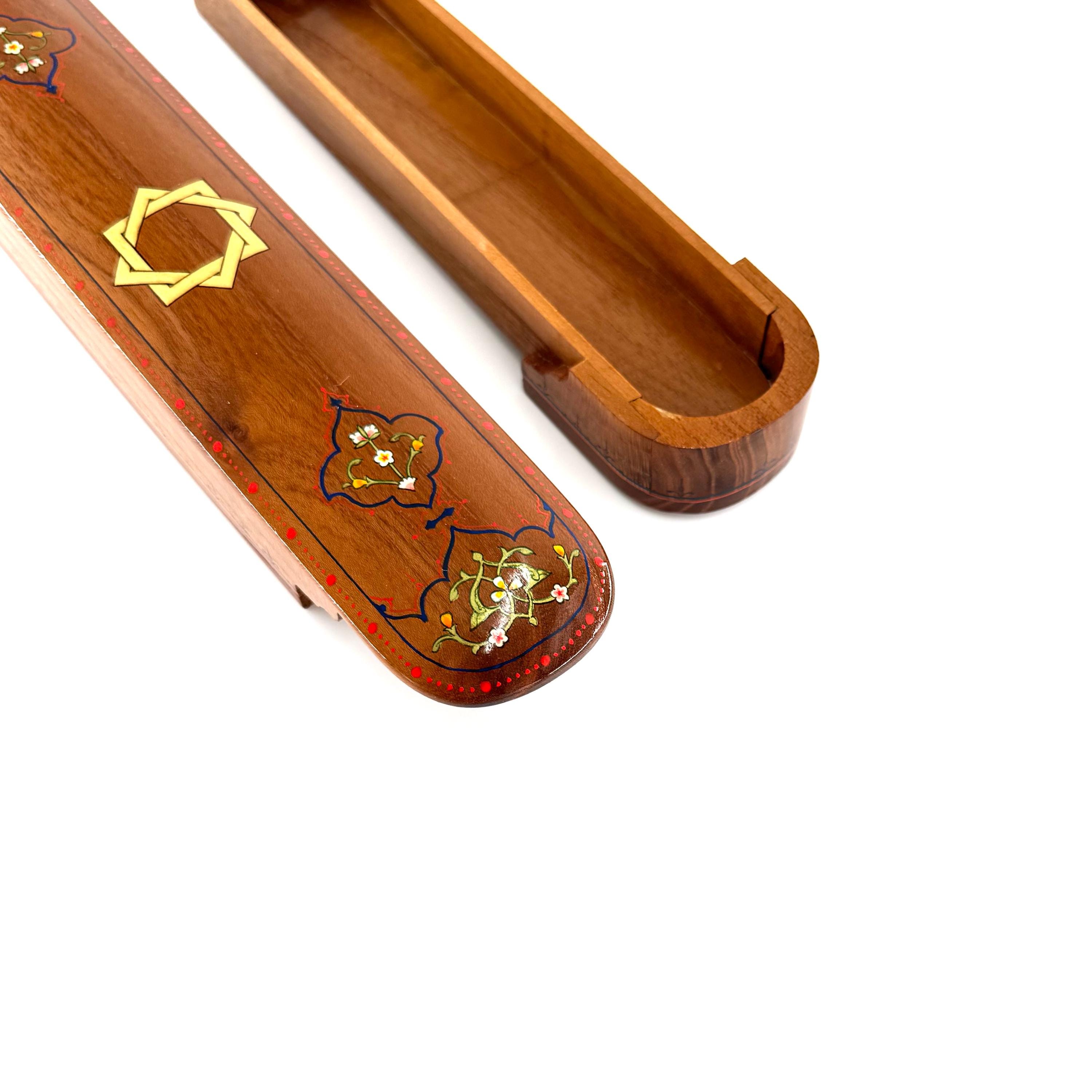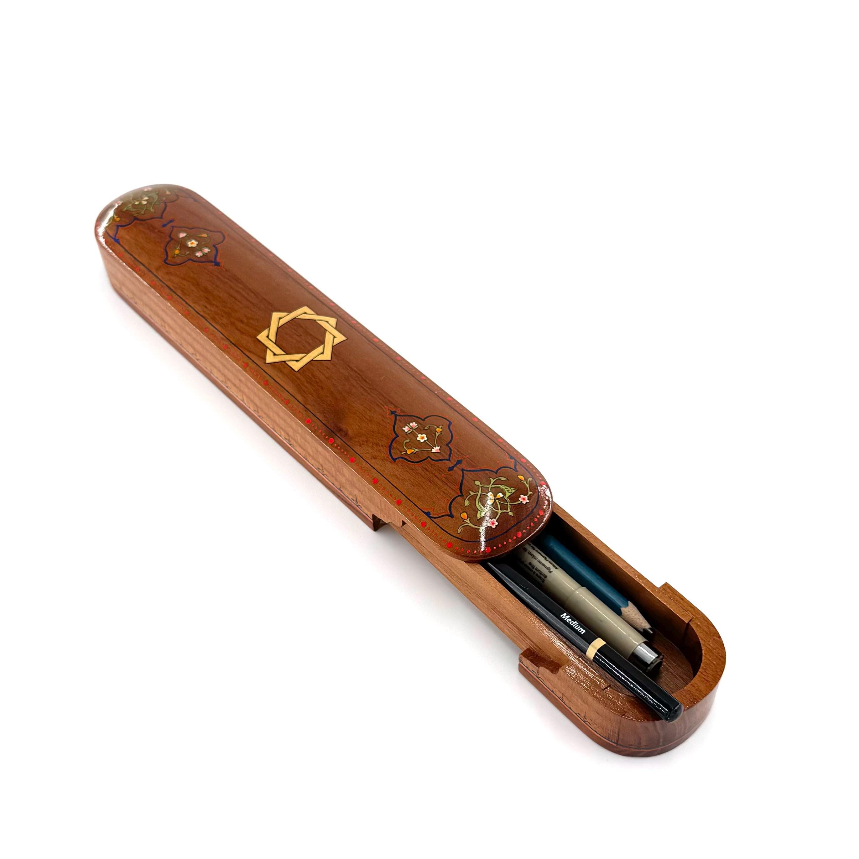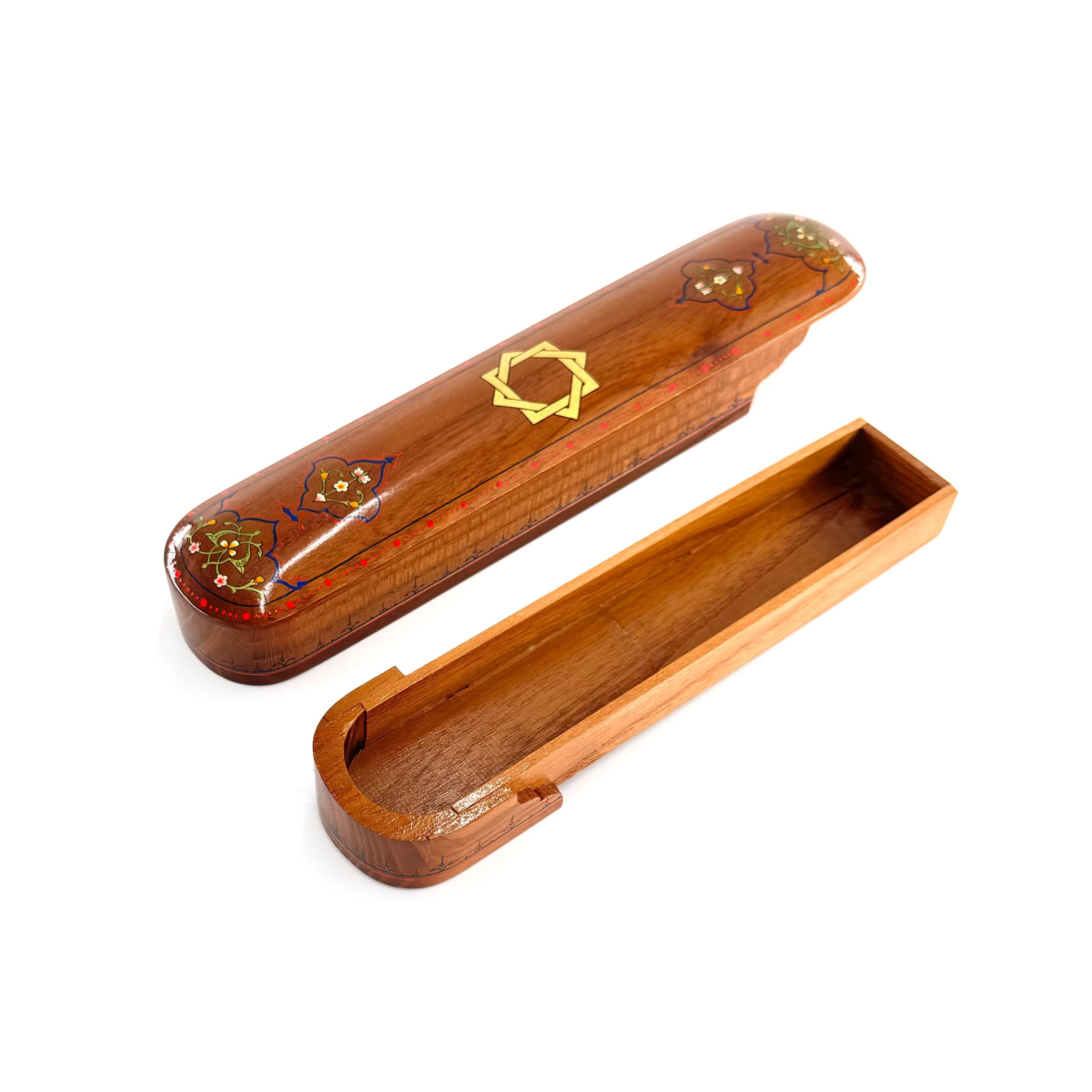 Step into the world of exquisite craftsmanship with this elegant pencil box, made entirely from fine walnut wood using traditional joinery techniques—completely free of nails. Every inch of this stunning piece reflects the dedication and skill of the artisan, featuring intricate, hand-painted ornamental patterns that are as functional as they are beautiful.