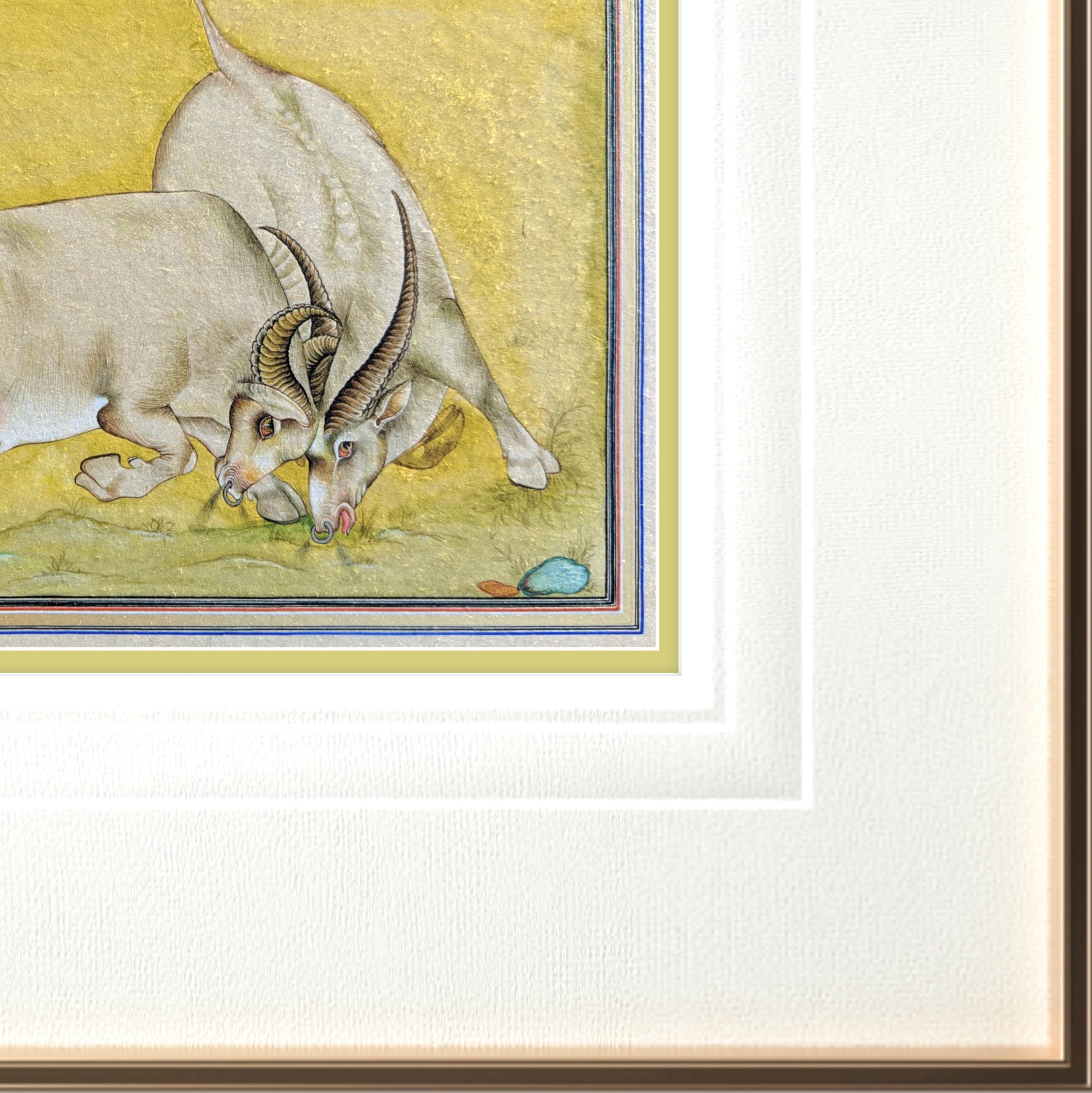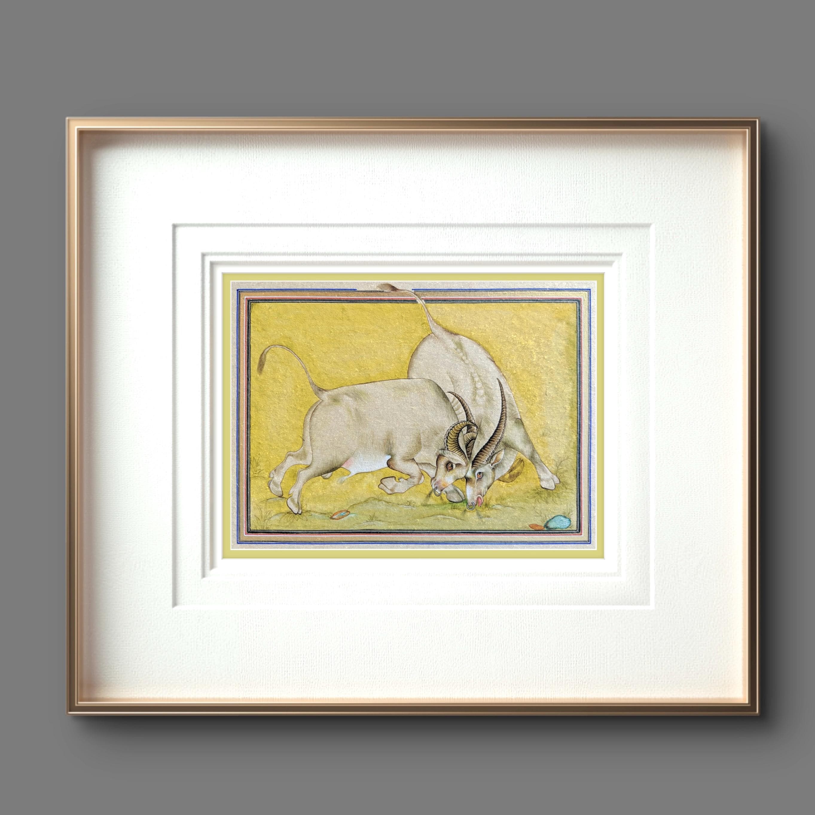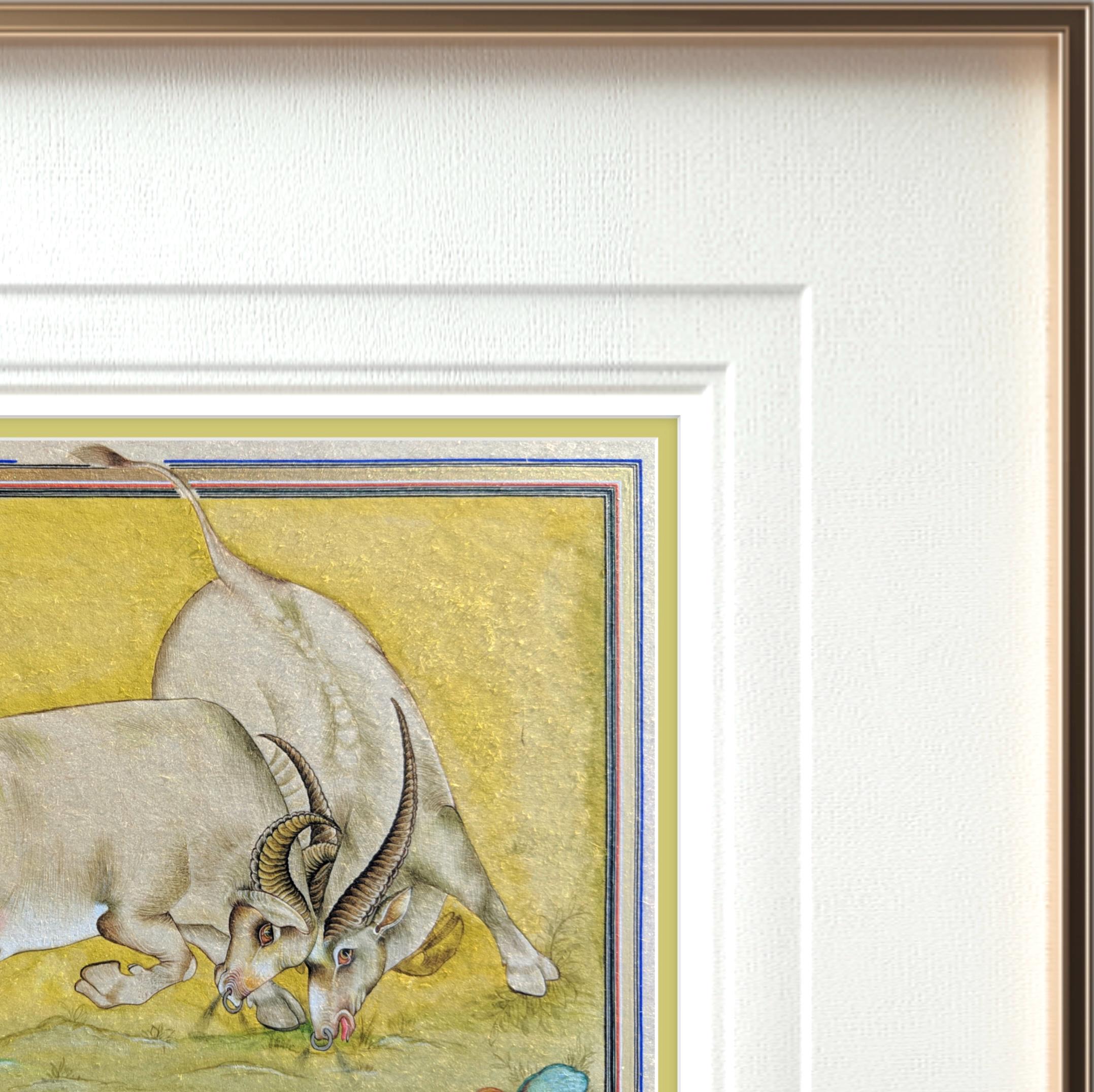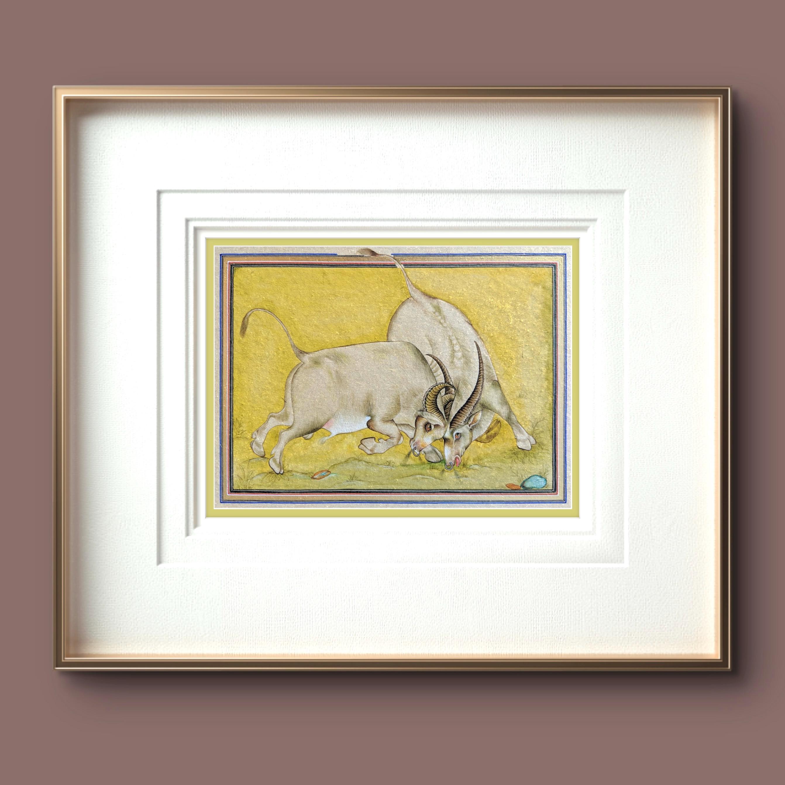 Majestic Miniature Illustration of Clash of Titans: Battling Bulls on Fine Silk | A Timeless Masterpiece of Strength, Elegance, and Fine Art