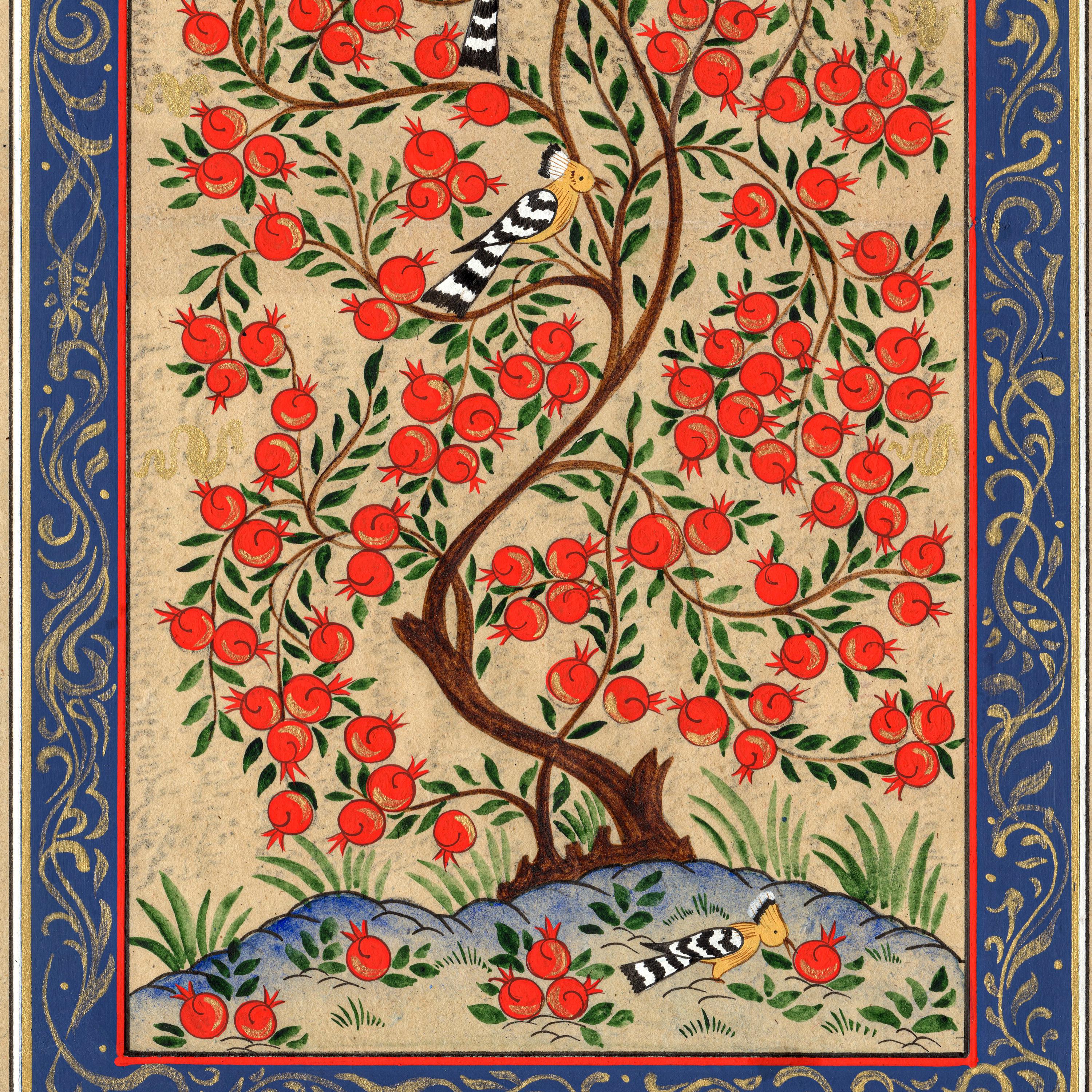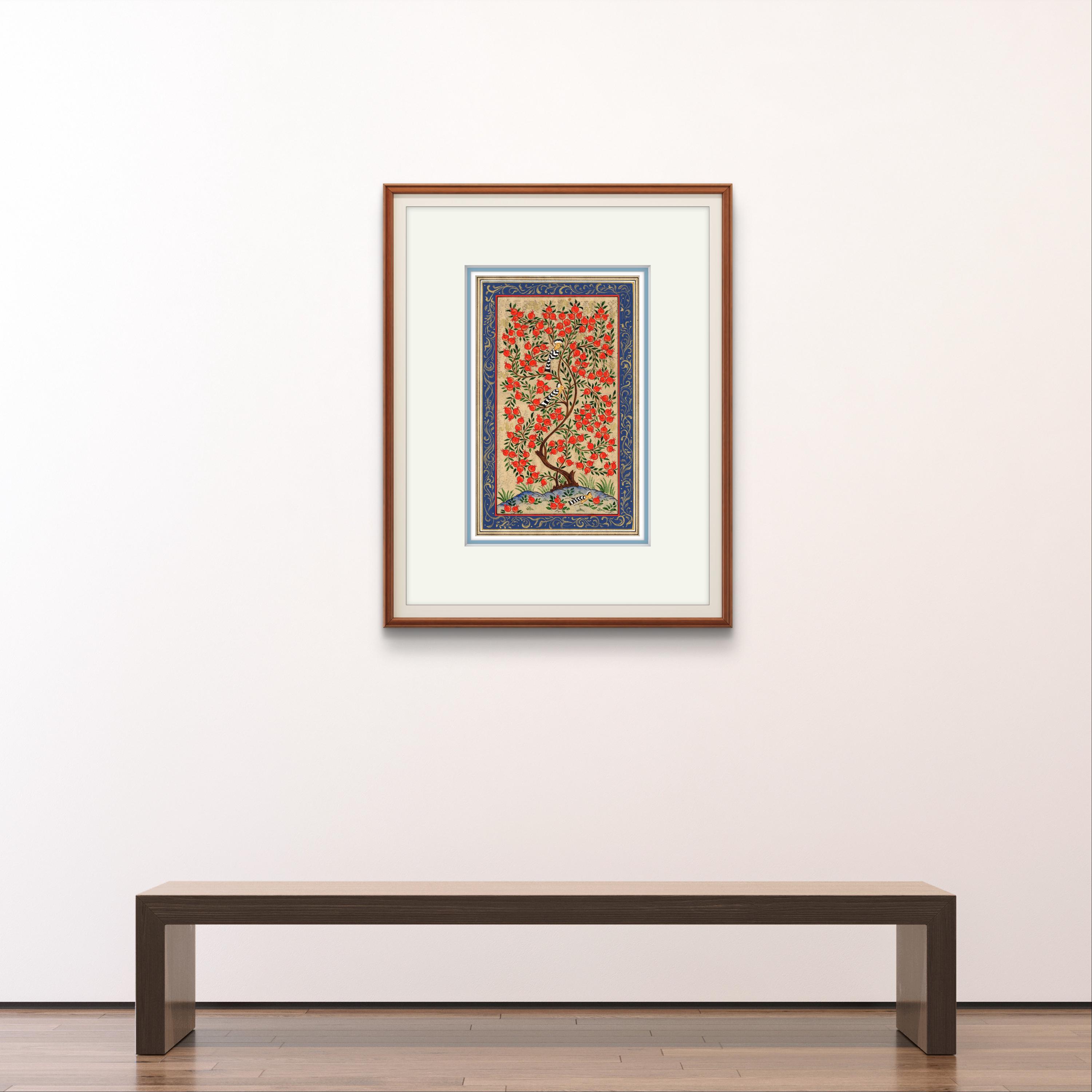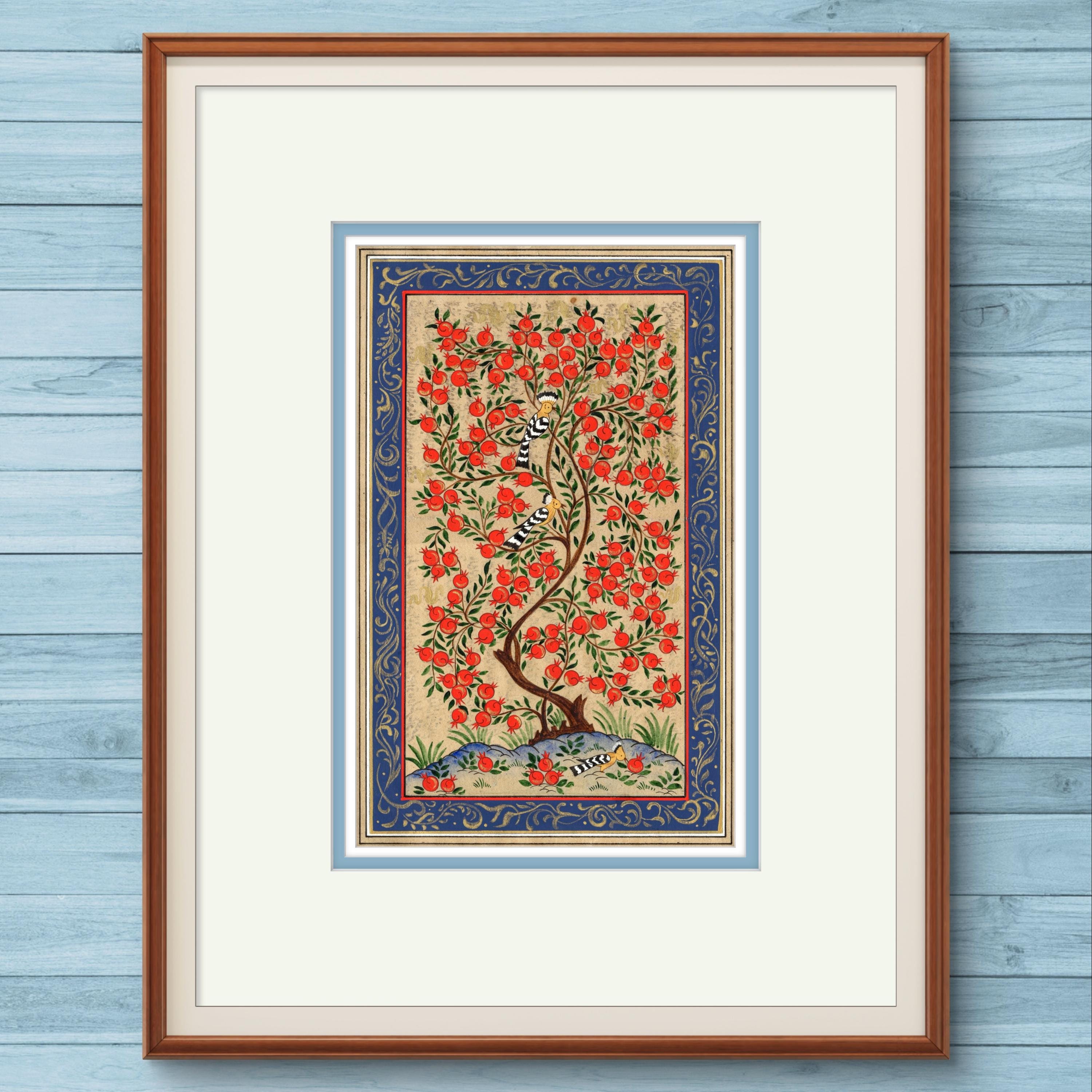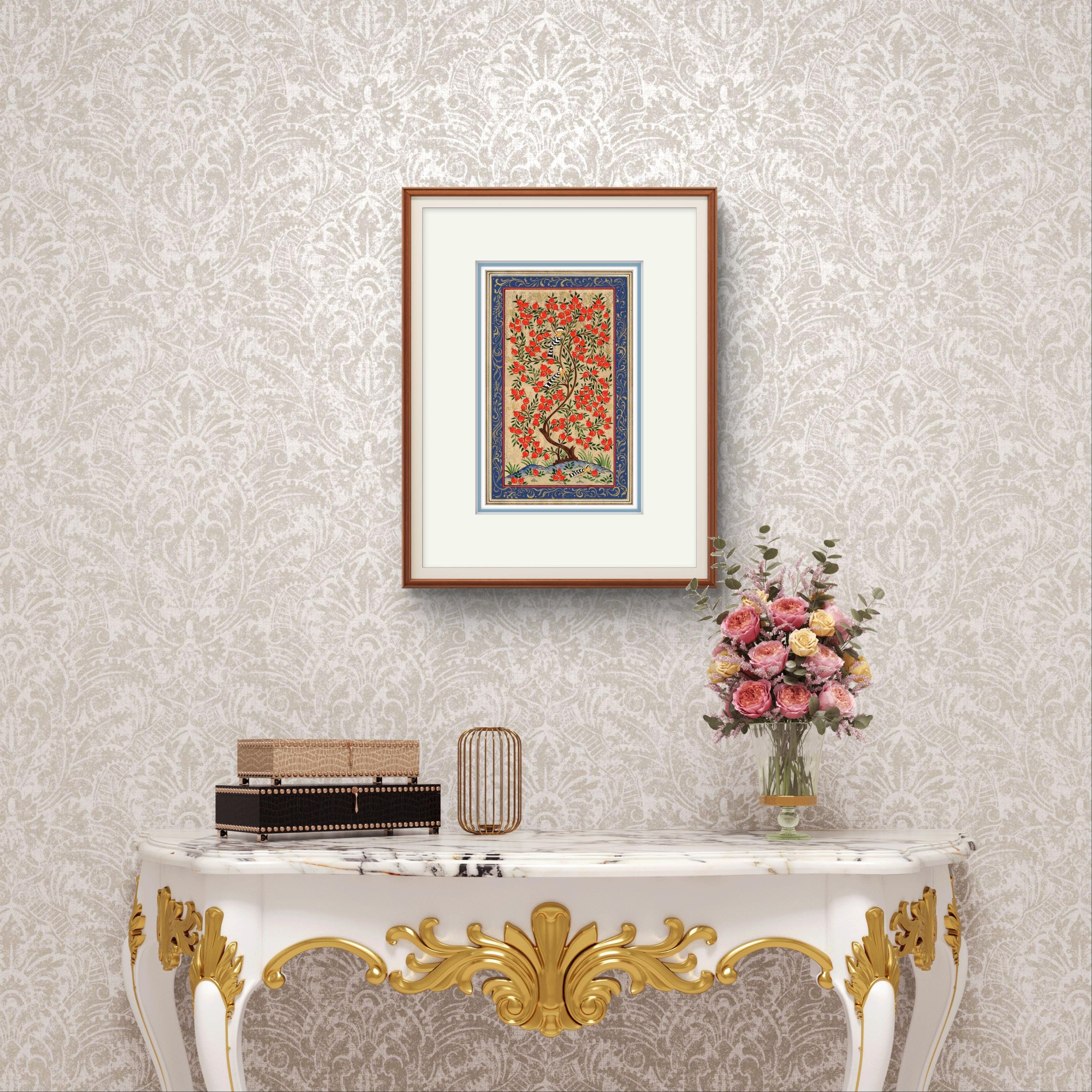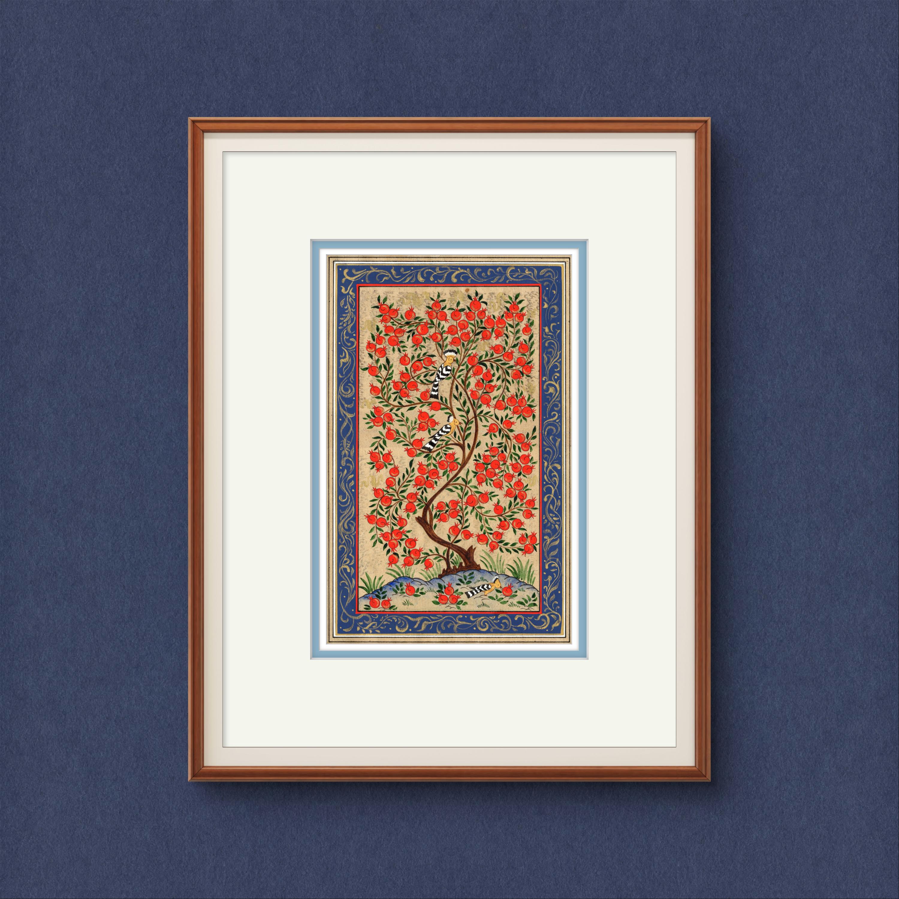 This exquisite miniature painting on silk paper depicts the Tree of Paradise, its branches elegantly adorned with ripe pomegranates, symbolizing fertility, prosperity, and the eternal cycle of life. The intricate details of the tree are brought to life through meticulous brushwork, showcasing its lush foliage and the radiant, textured fruits that provide a striking visual contrast to the soft background.