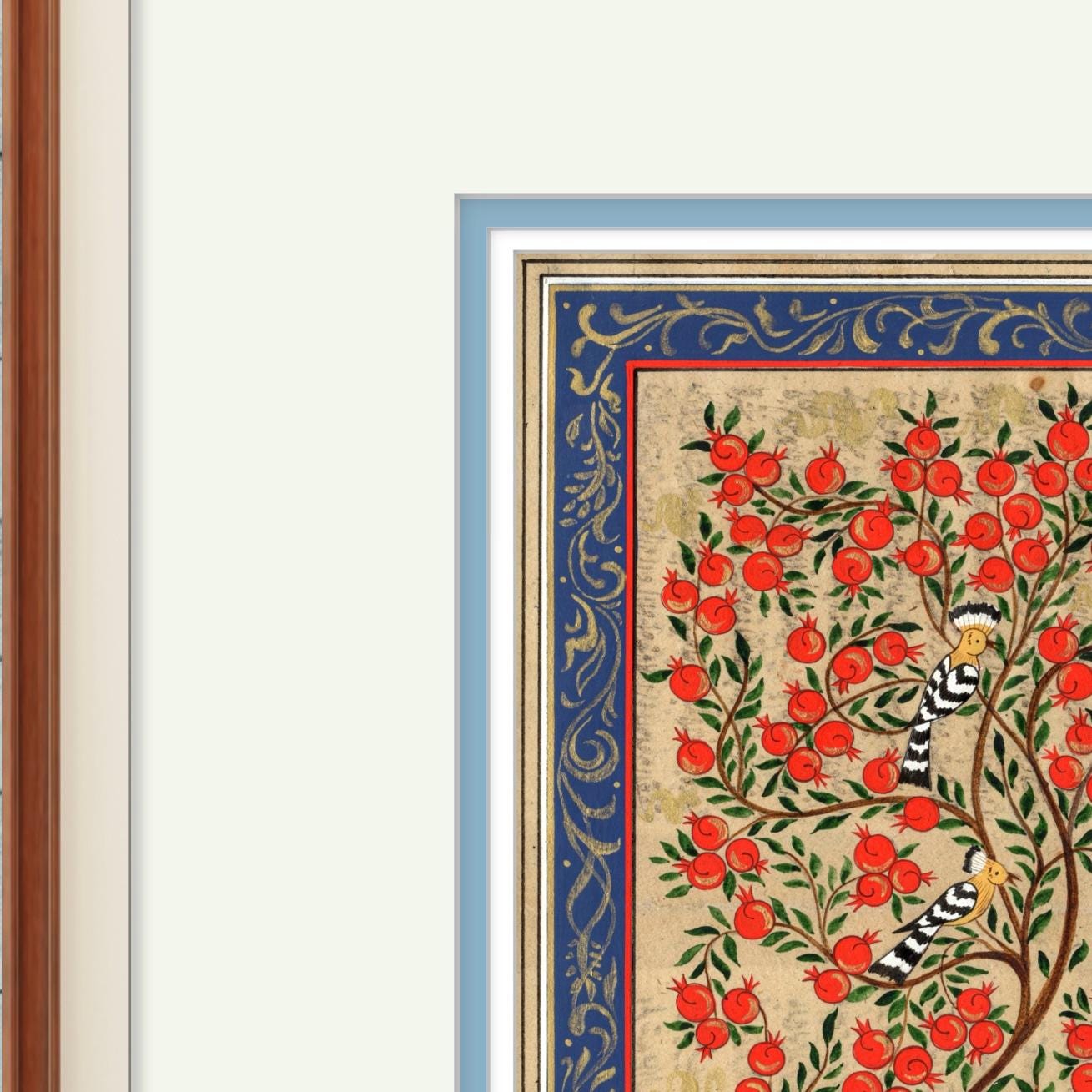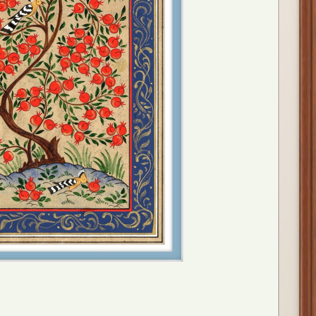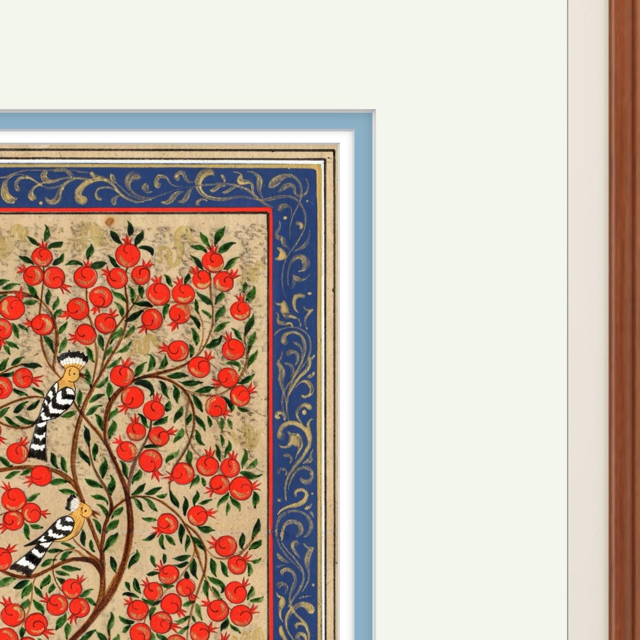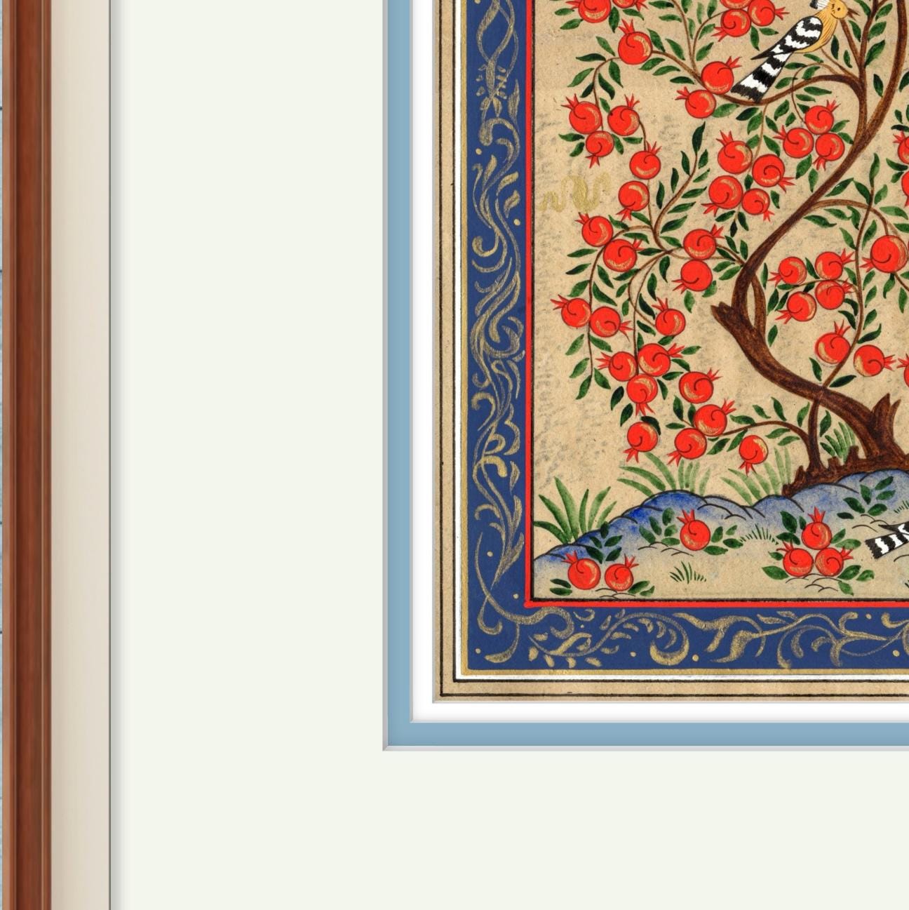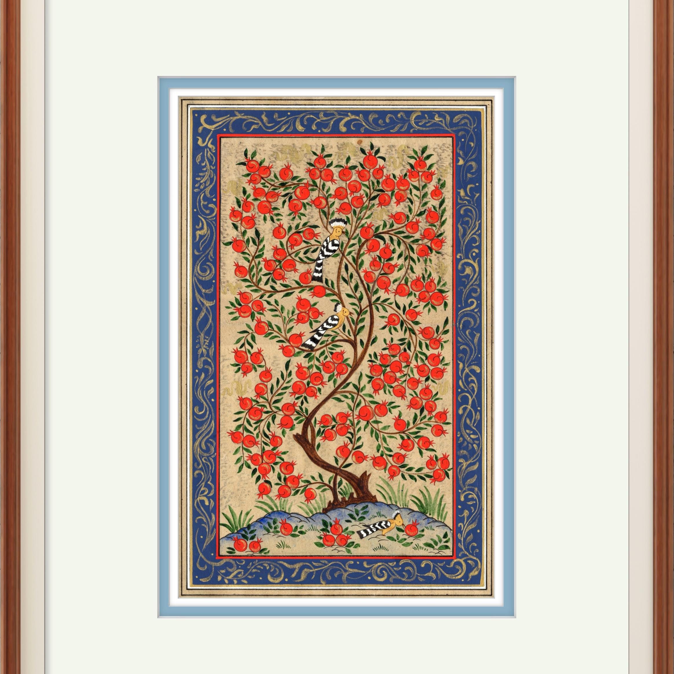 “Tree of Paradise: Pomegranates and Hoopoe Birds” captures the essence of spiritual beauty, the interconnectedness of life, and the serene balance of nature, all encapsulated in the timeless art of miniature painting.