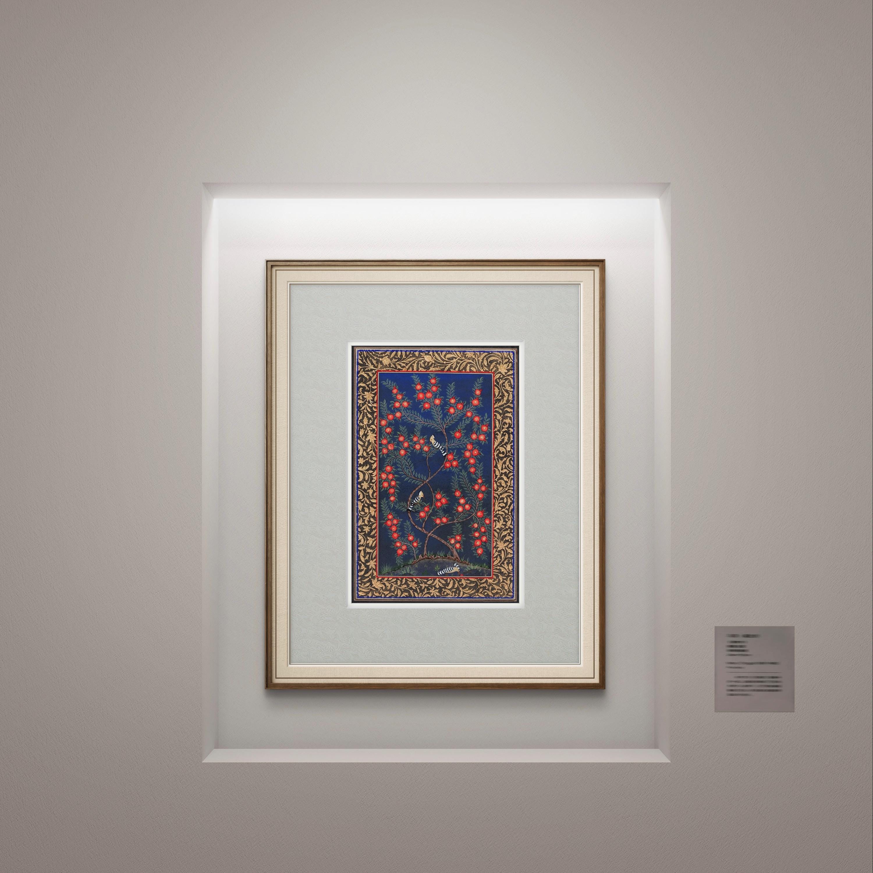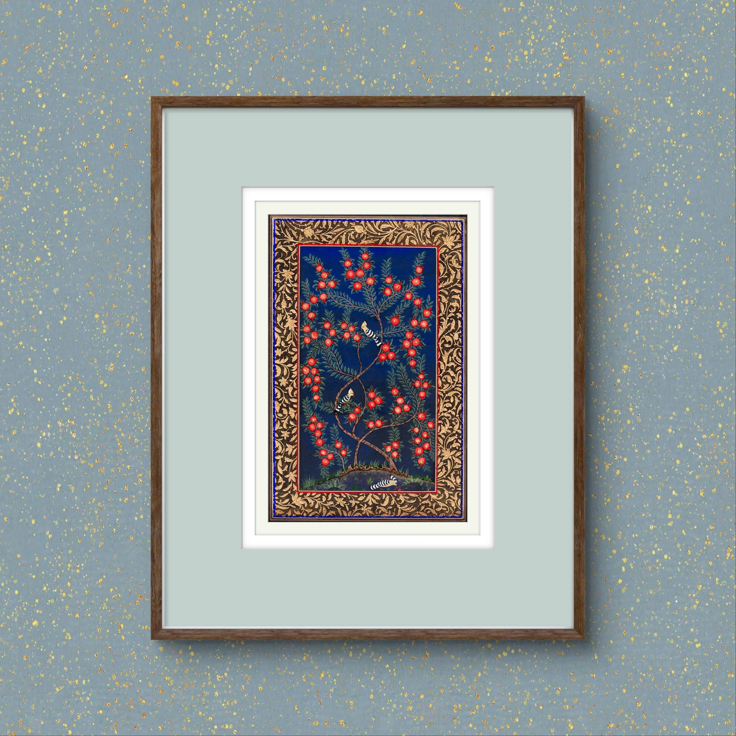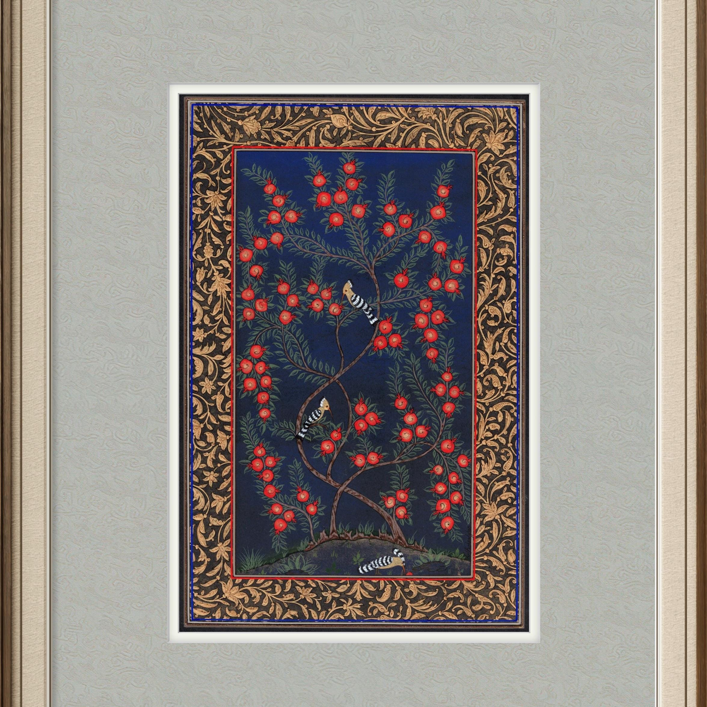 “Tree of Paradise: Pomegranates and Hoopoe Birds” captures the essence of spiritual beauty, the interconnectedness of life, and the serene balance of nature, all encapsulated in the timeless art of miniature painting.