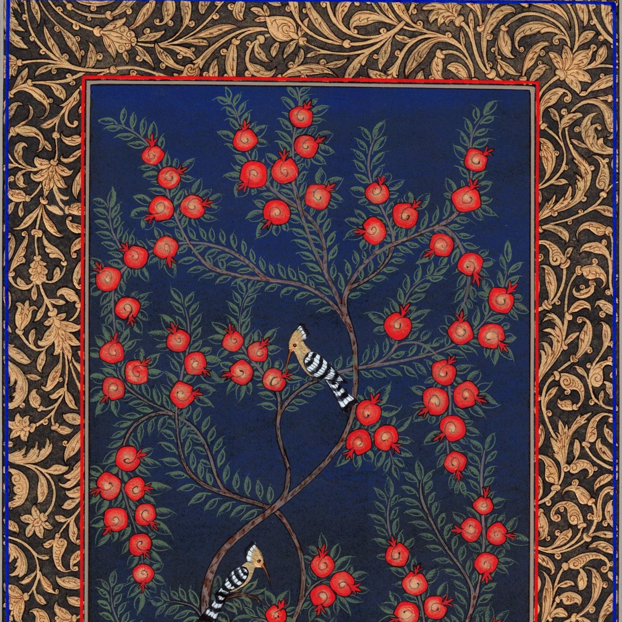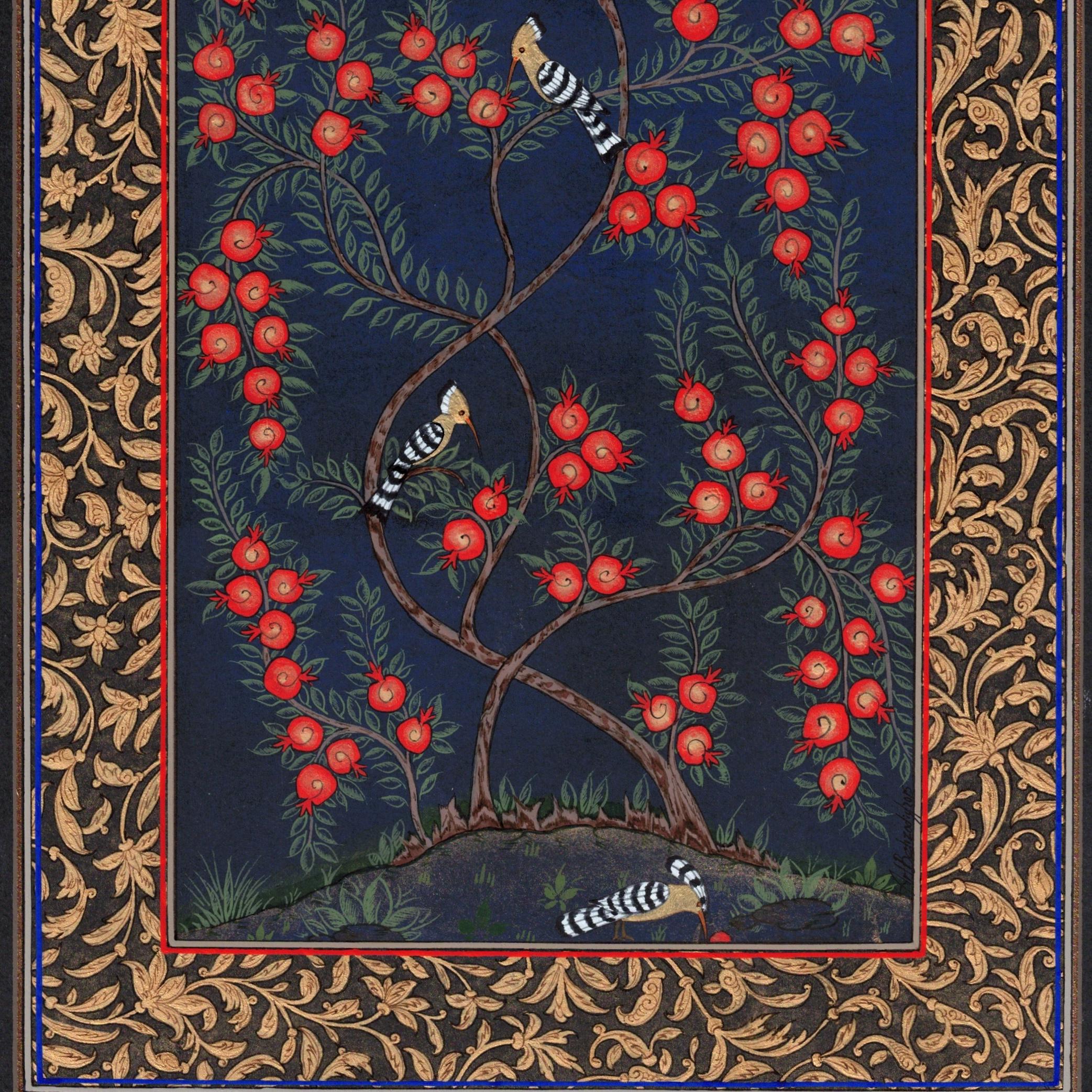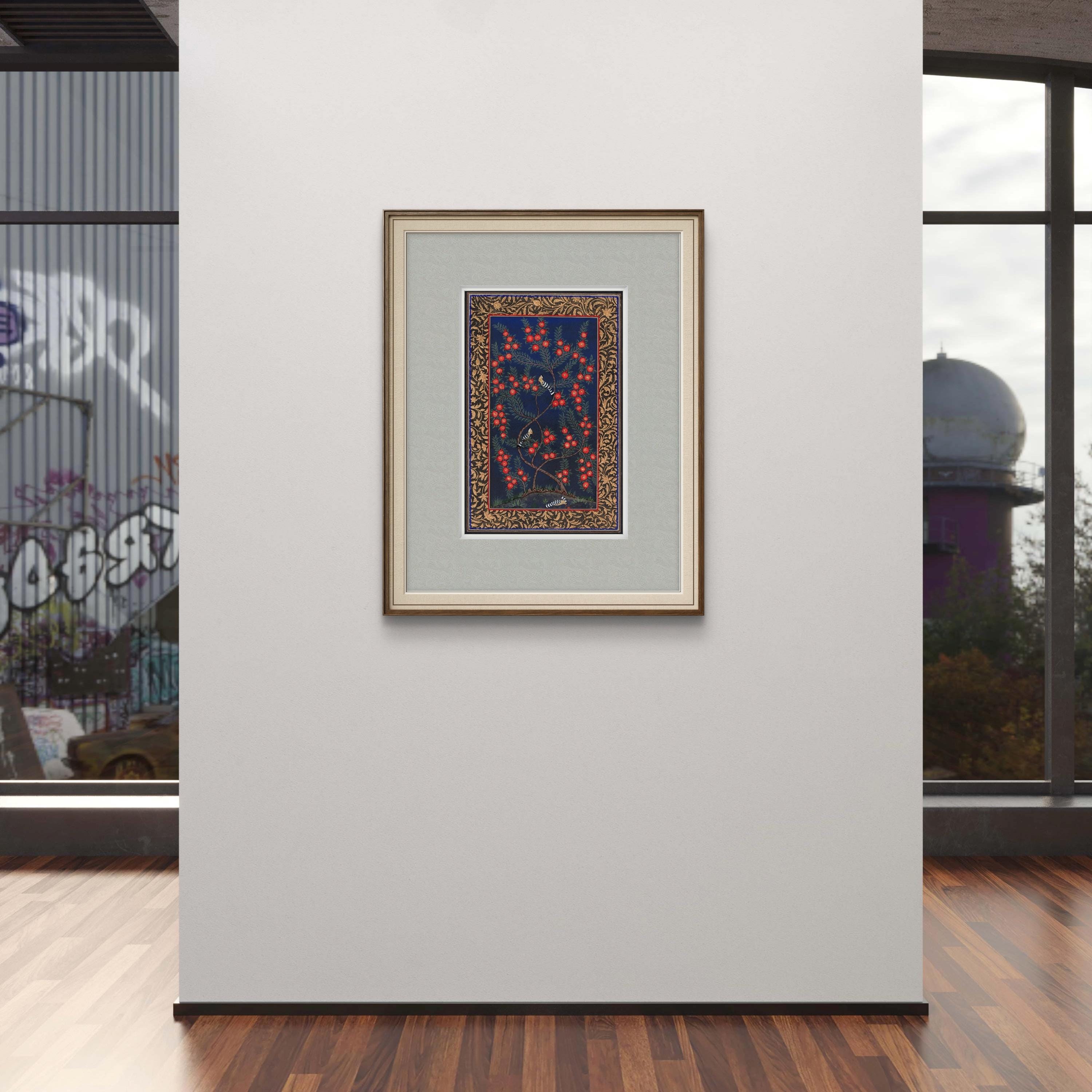 “Tree of Paradise: Pomegranates and Hoopoe Birds” captures the essence of spiritual beauty, the interconnectedness of life, and the serene balance of nature, all encapsulated in the timeless art of miniature painting.