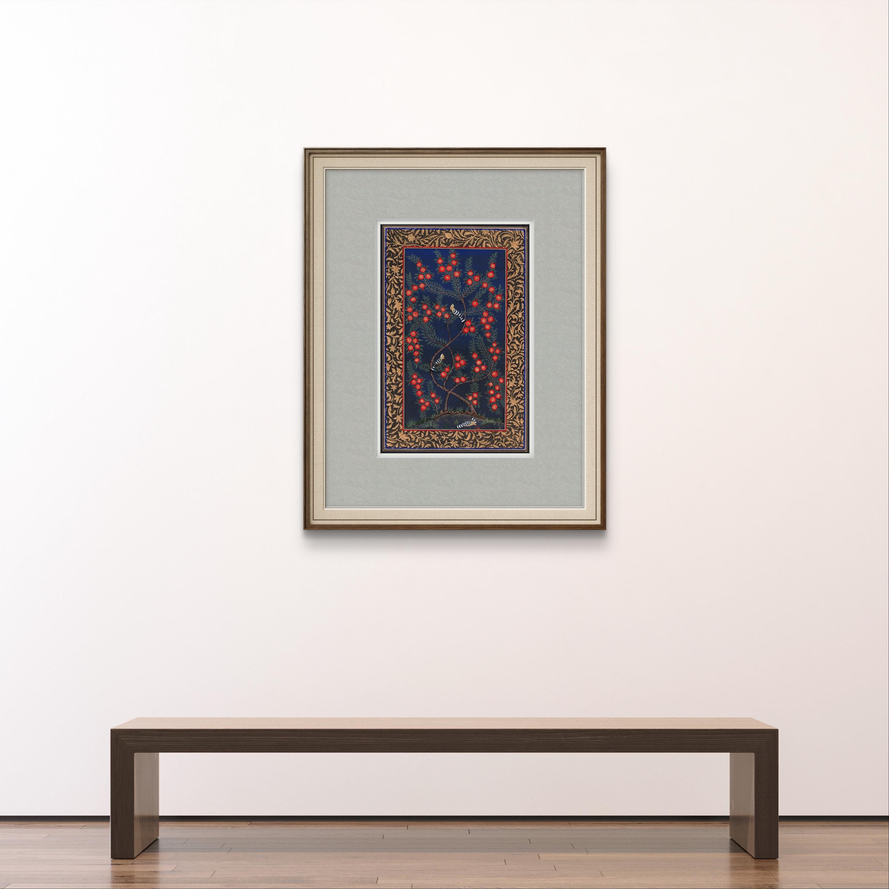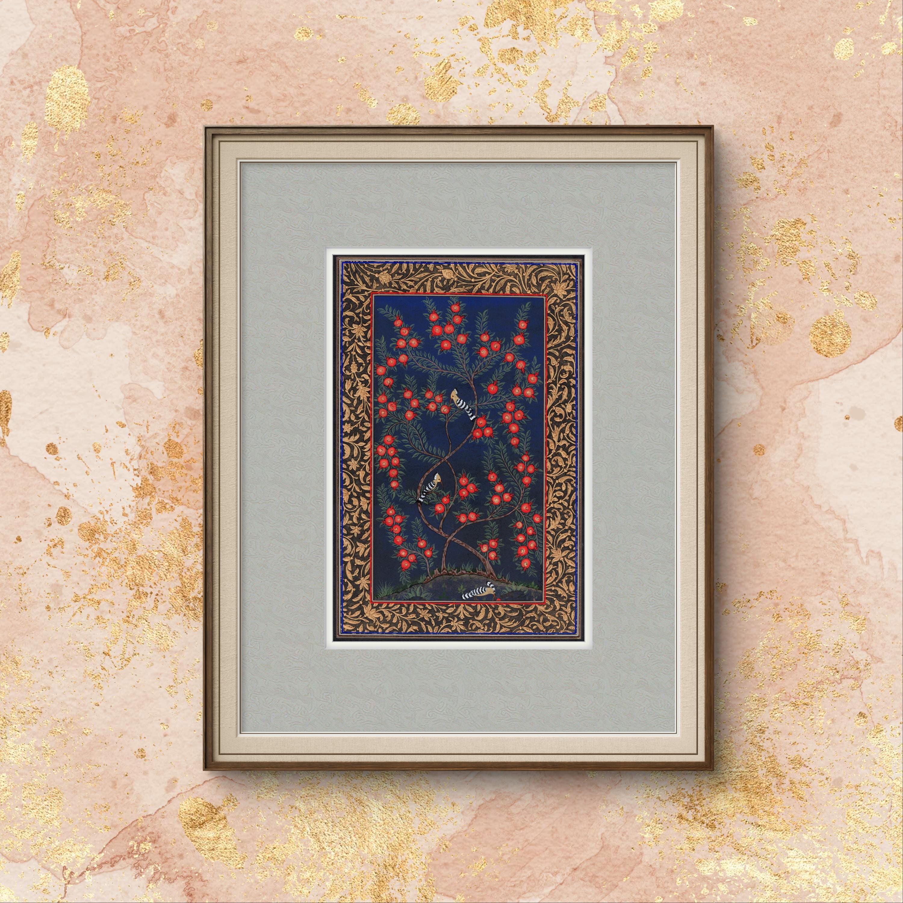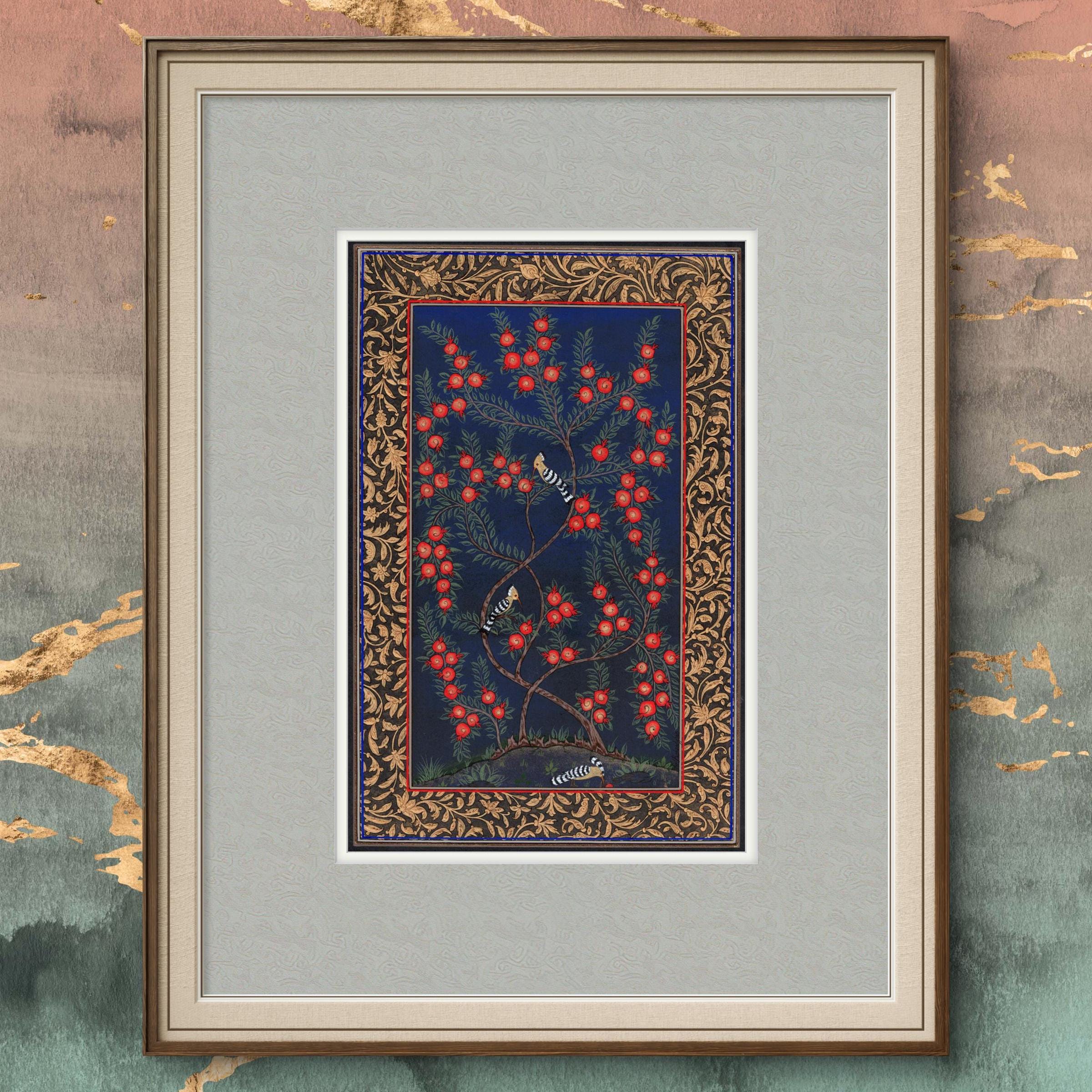 This exquisite miniature painting on black matted paper depicts the Tree of Paradise, its branches elegantly adorned with ripe pomegranates, symbolizing fertility, prosperity, and the eternal cycle of life. The intricate details of the tree are brought to life through meticulous brushwork, showcasing its lush foliage and the radiant, textured fruits that provide a striking visual contrast to the soft background.