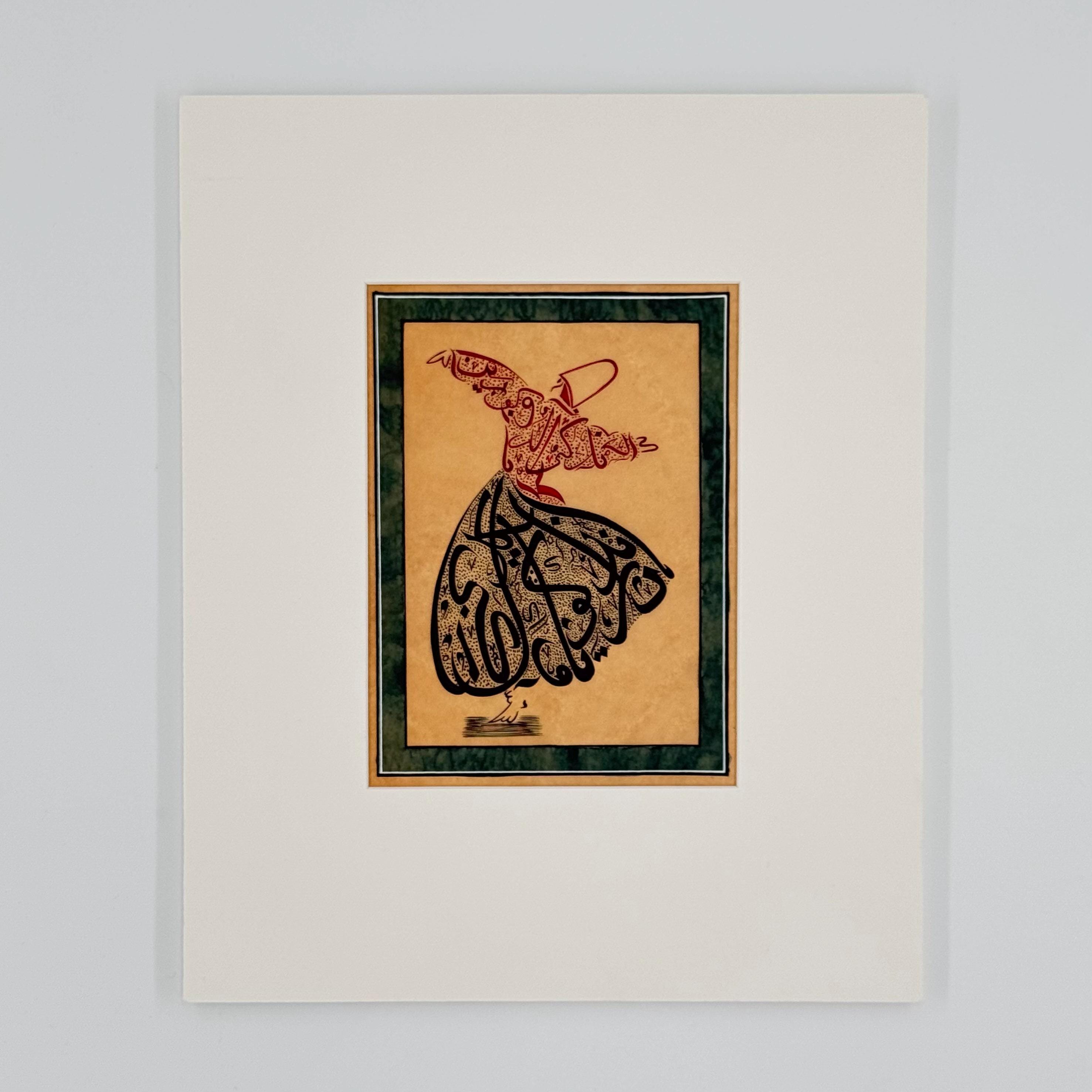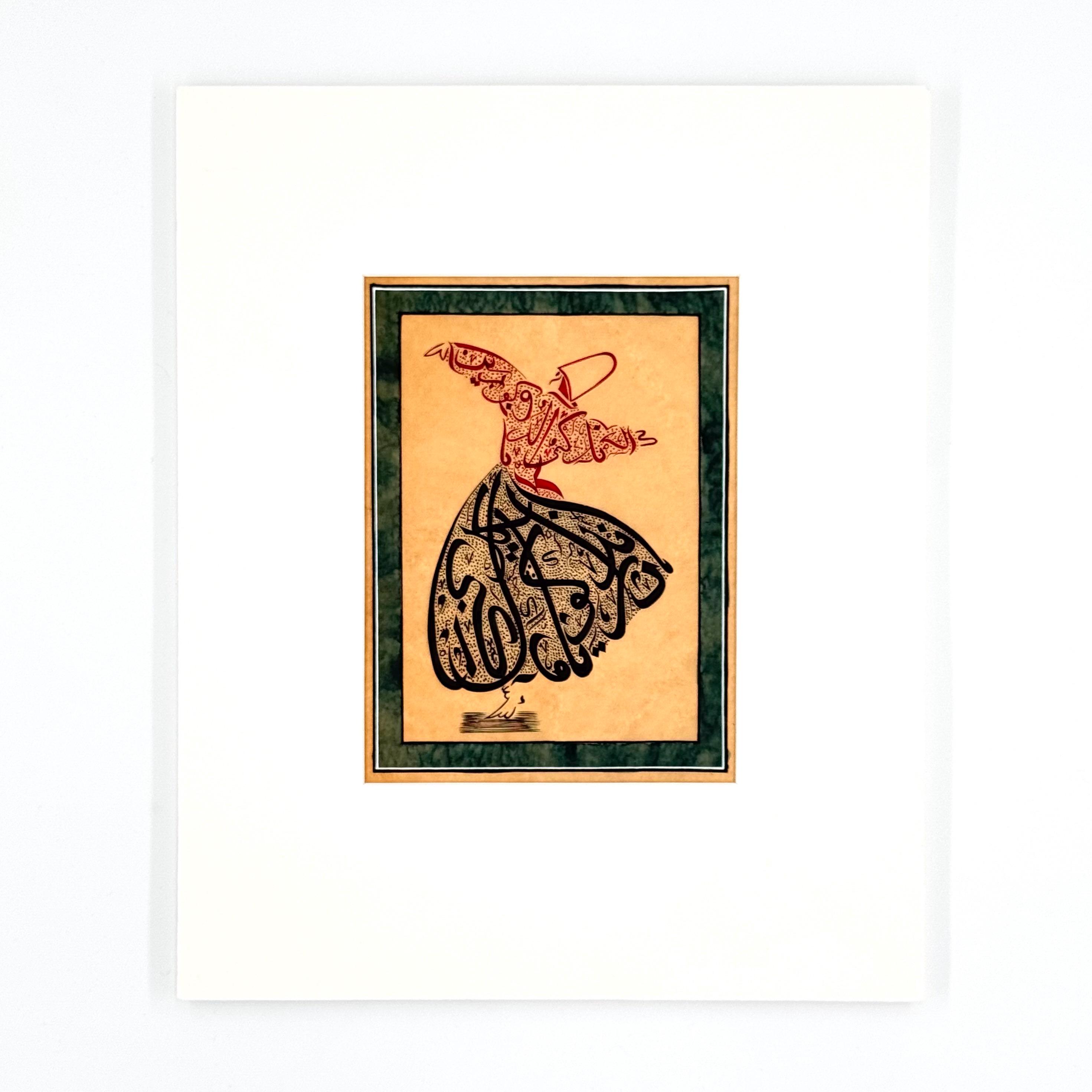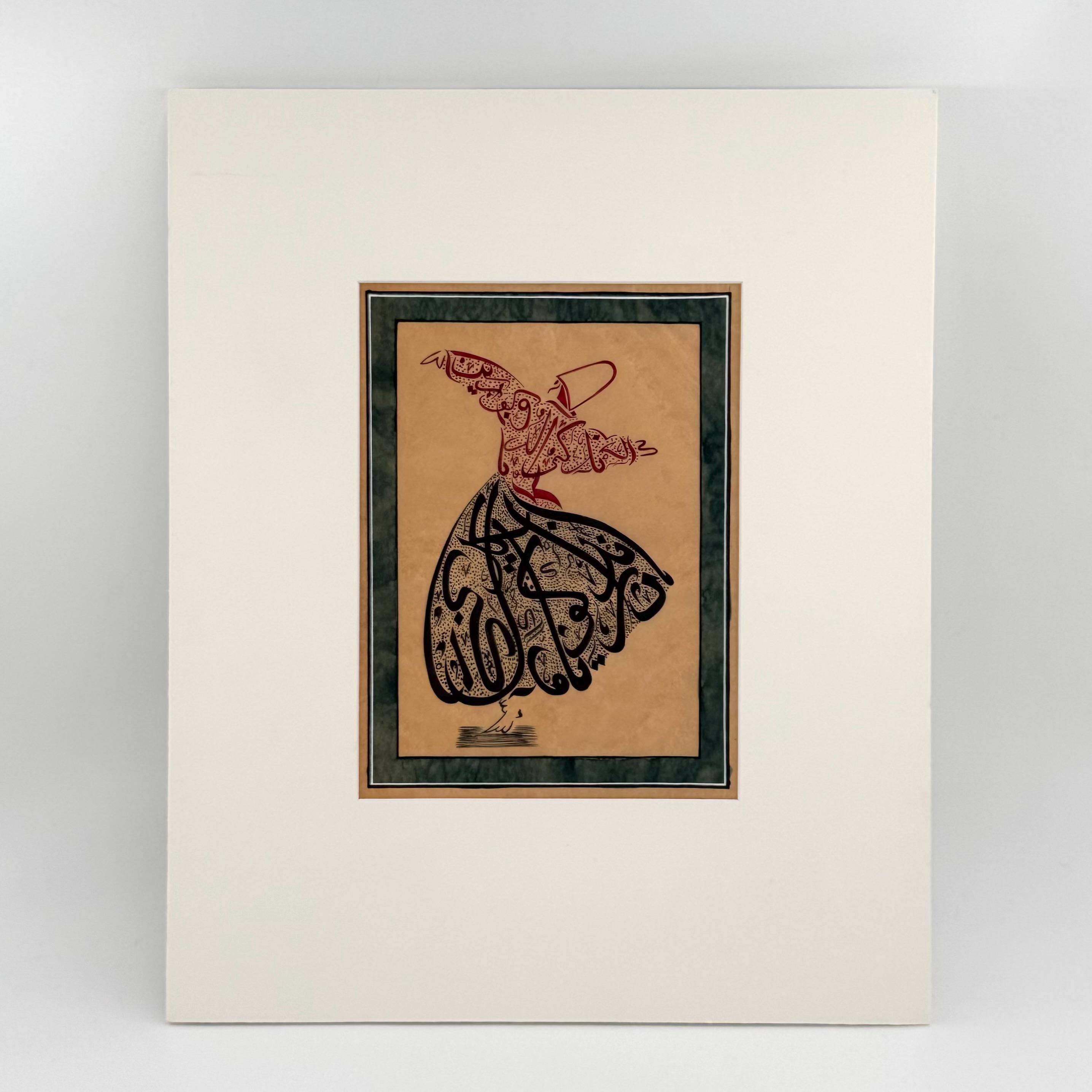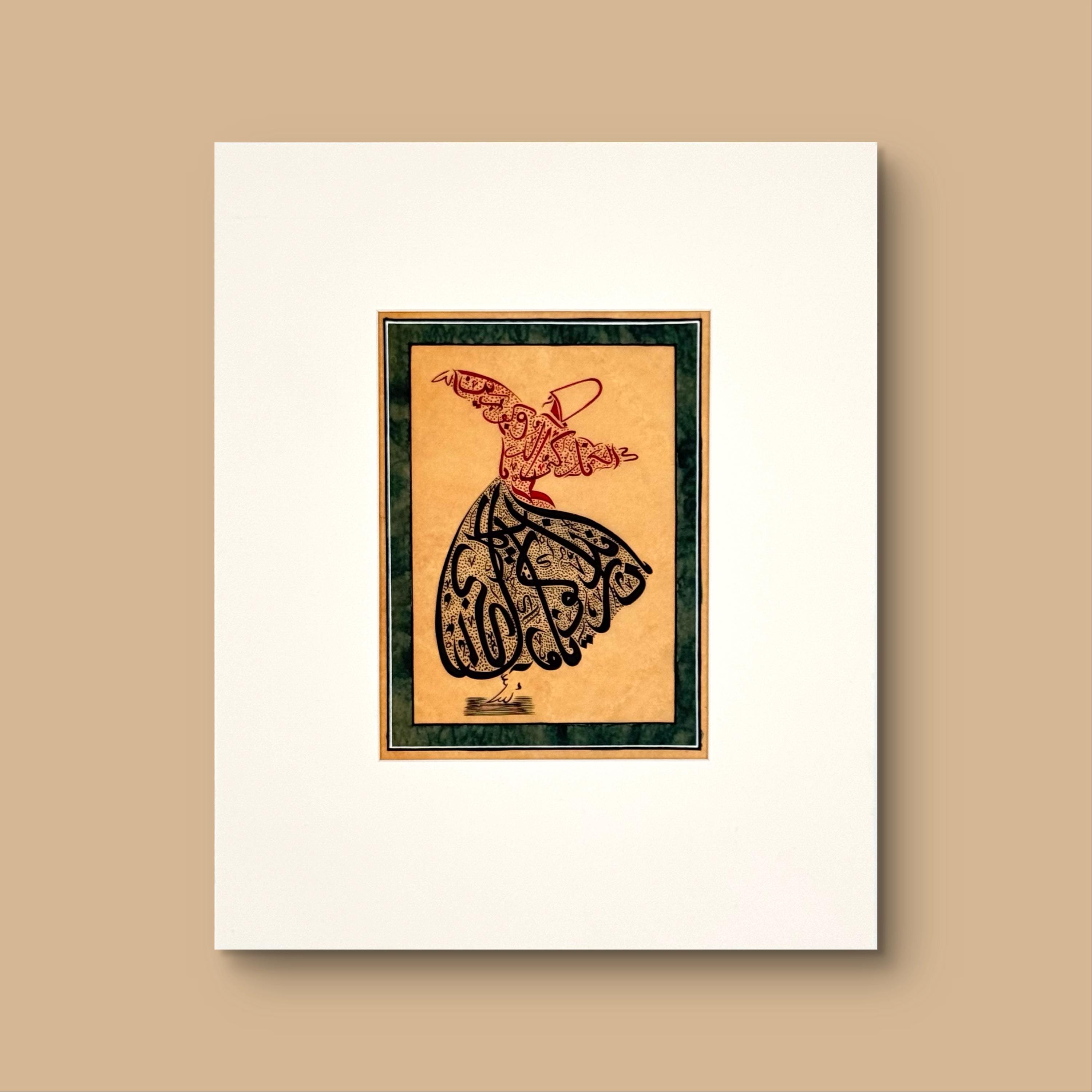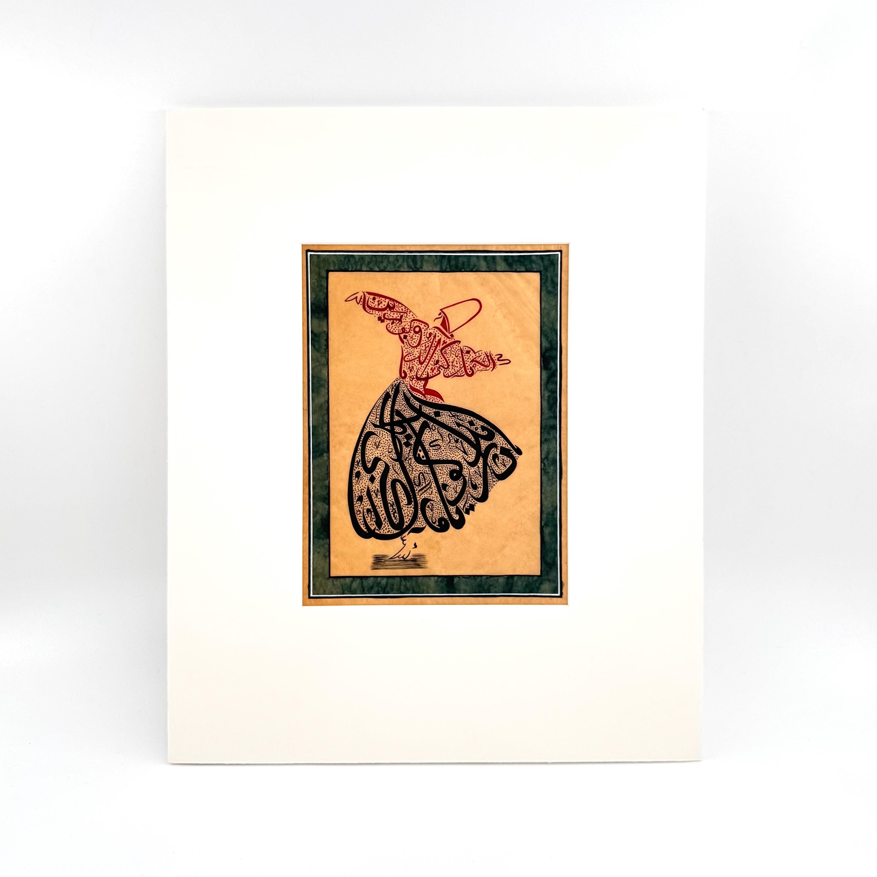 Dancing Dervish - Islamic World Sufism Inspired Calligraphy Art Work | Handcrafted Fine Silk Paper | Unique Interior Decoration (MATTED)