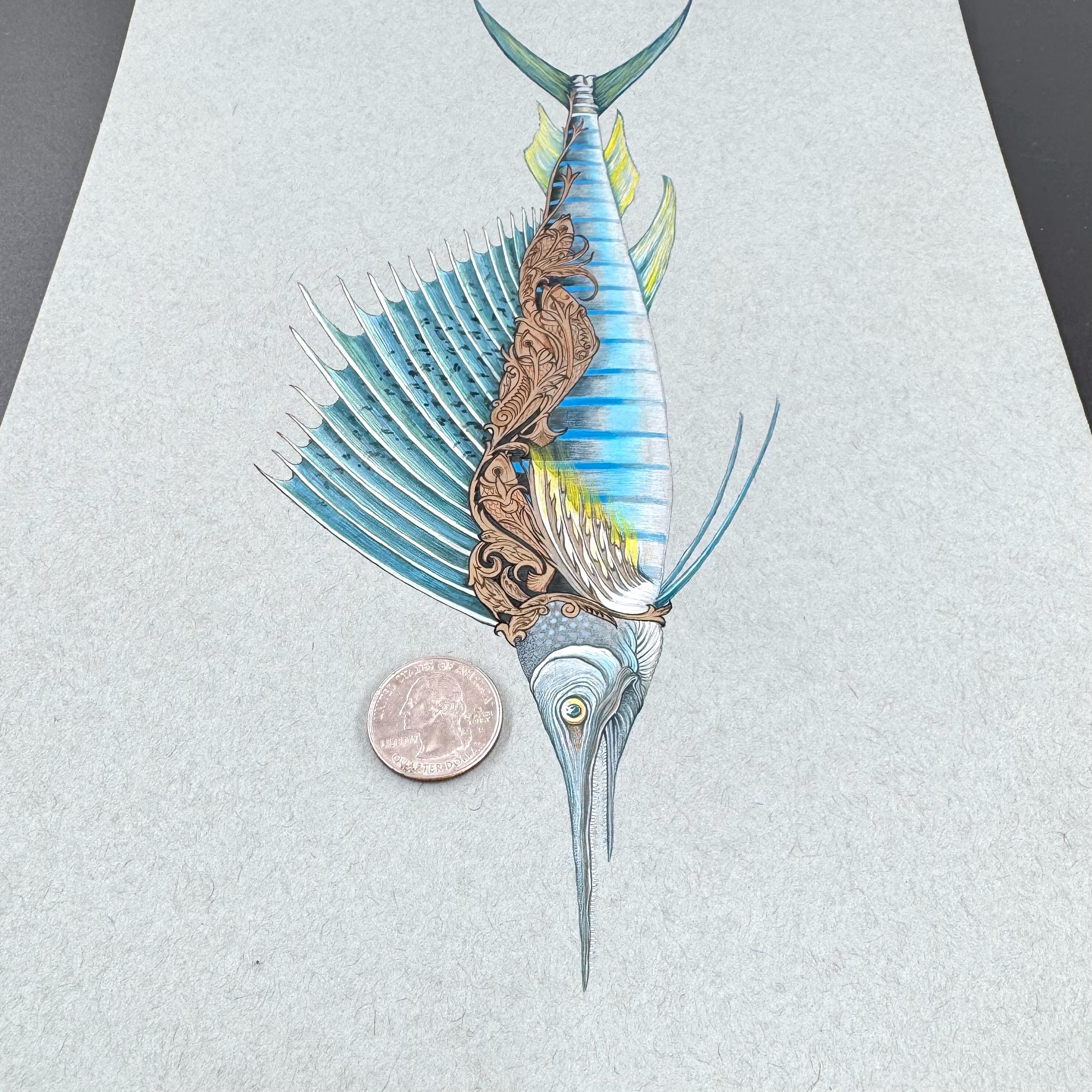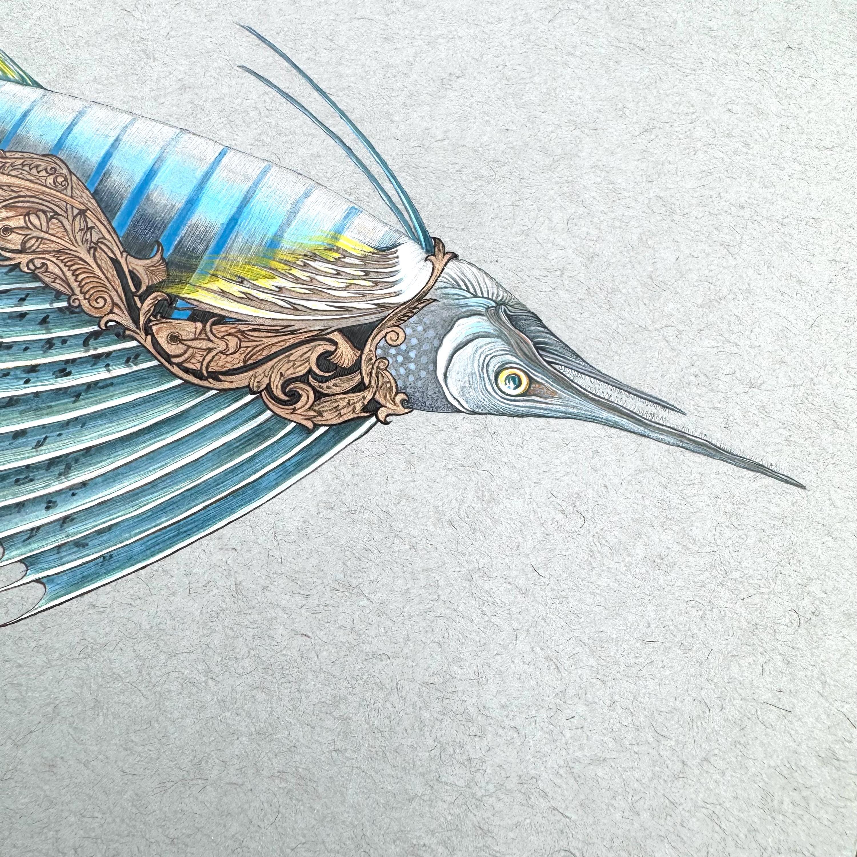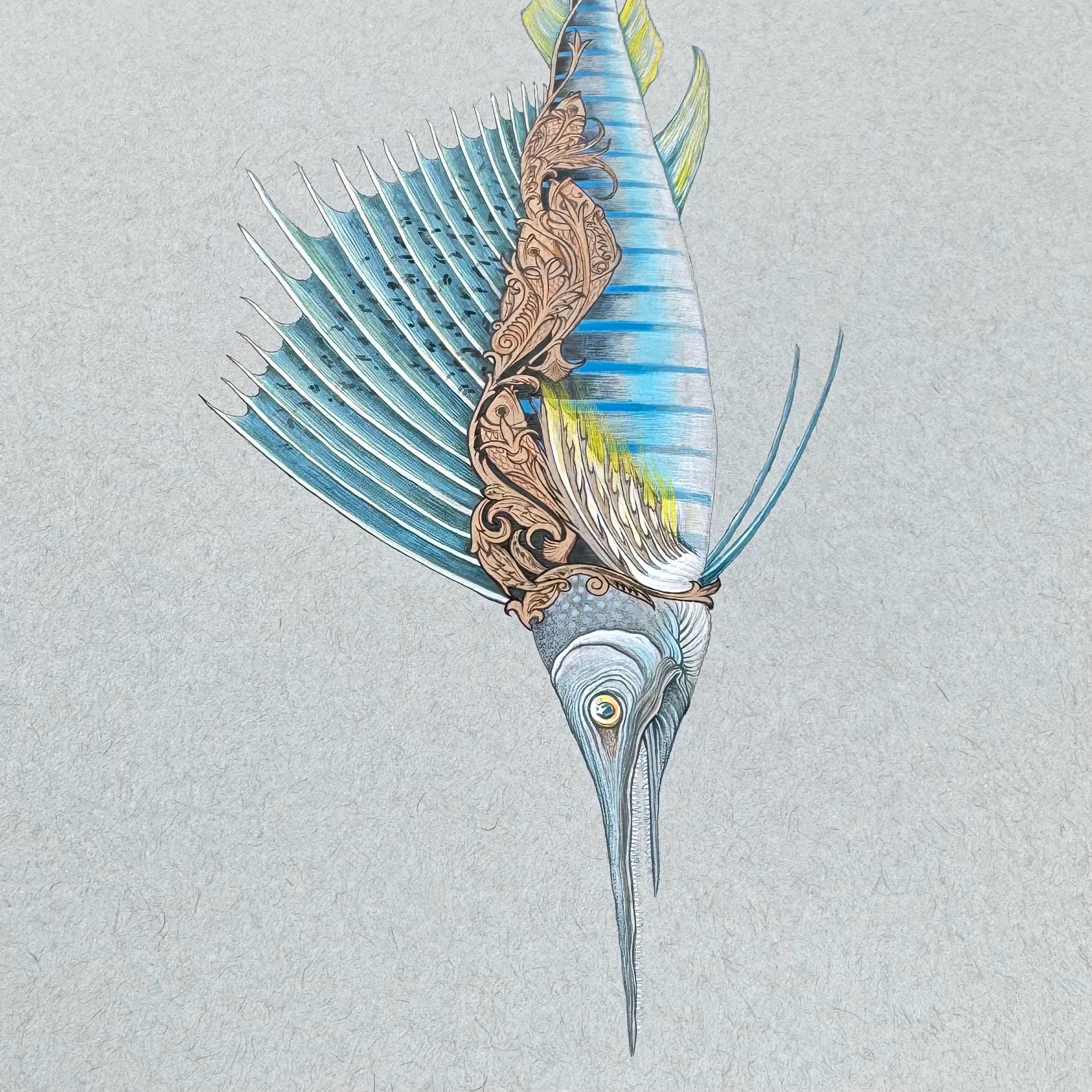 Sailfish Inspired Ultra-Fine Detailed Illustration | Deep Blue Marine Inspired Fine Painting, Ornamental Sailfish Art, Exclusive Decoration