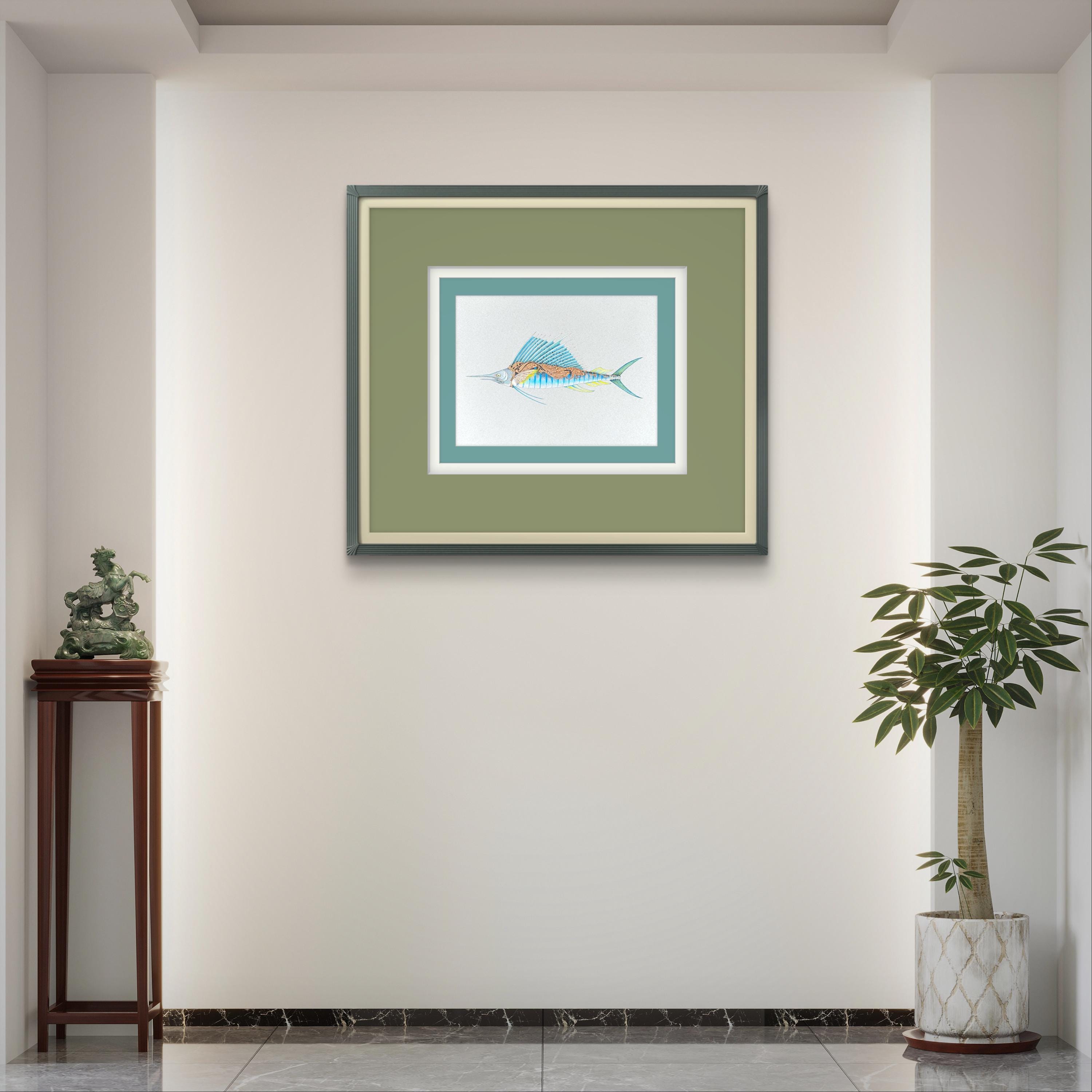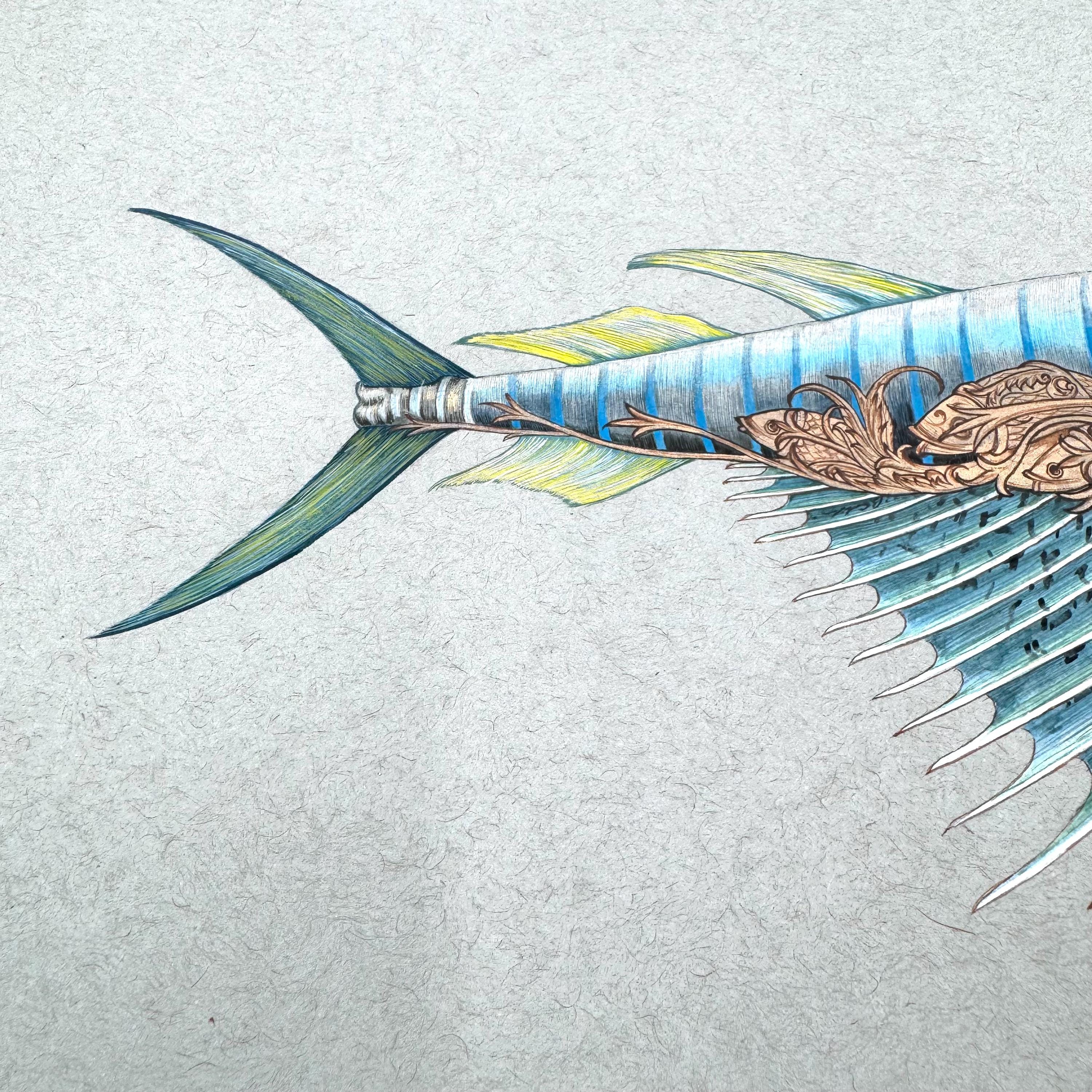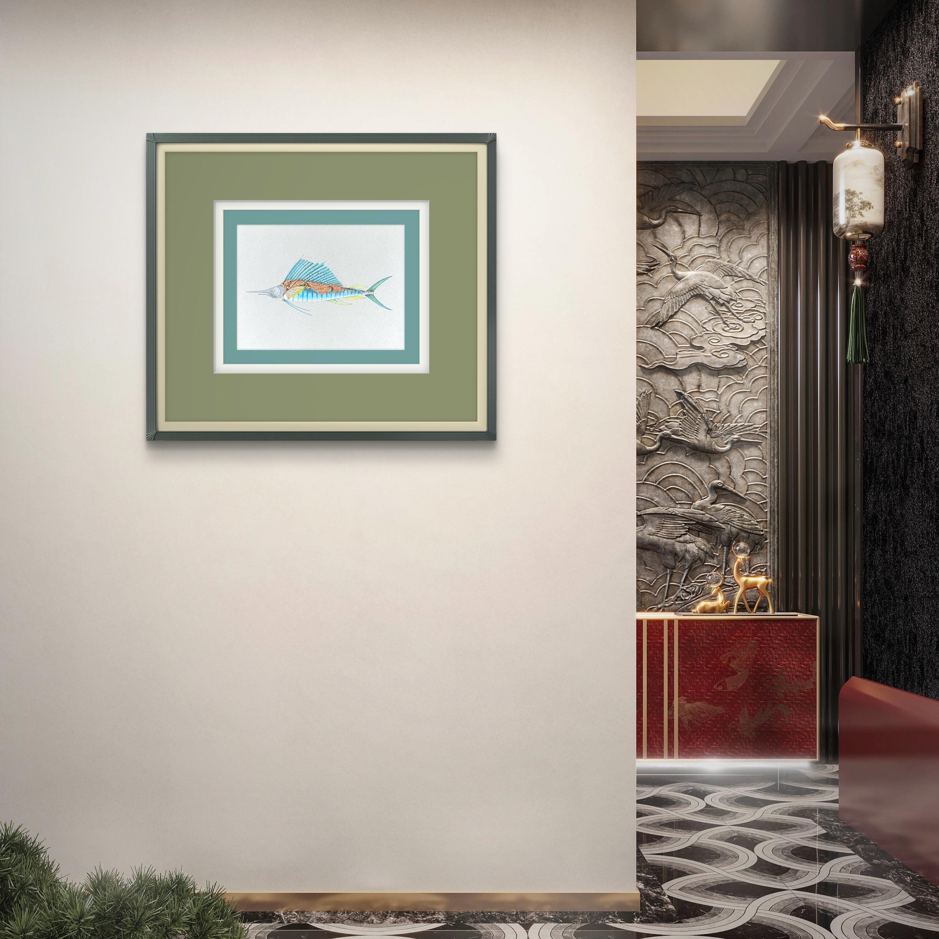 This exquisite fine painting captures the elegance and fluid motion of the sailfish, a majestic creature of the sea. Merging artistic precision with ornamental finesse, this piece embodies the rich traditions of fine miniature painting. Every detail is meticulously rendered using ultra-fine brushes, ensuring an extraordinary level of refinement.