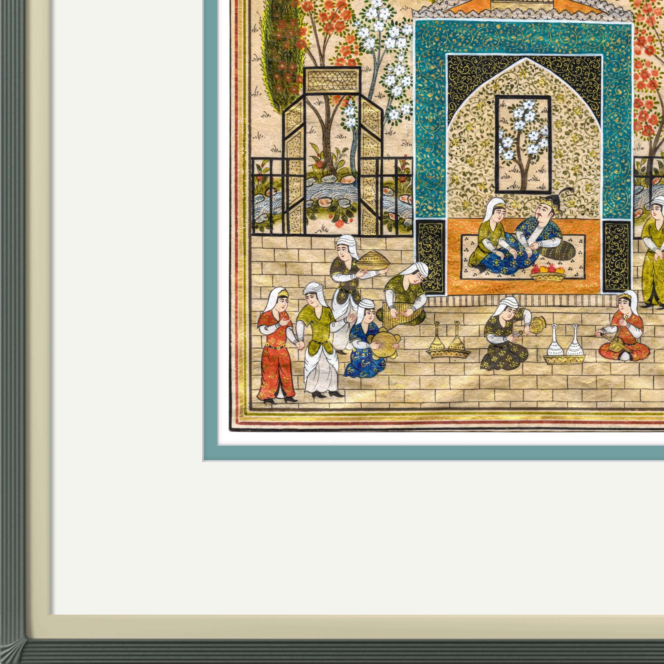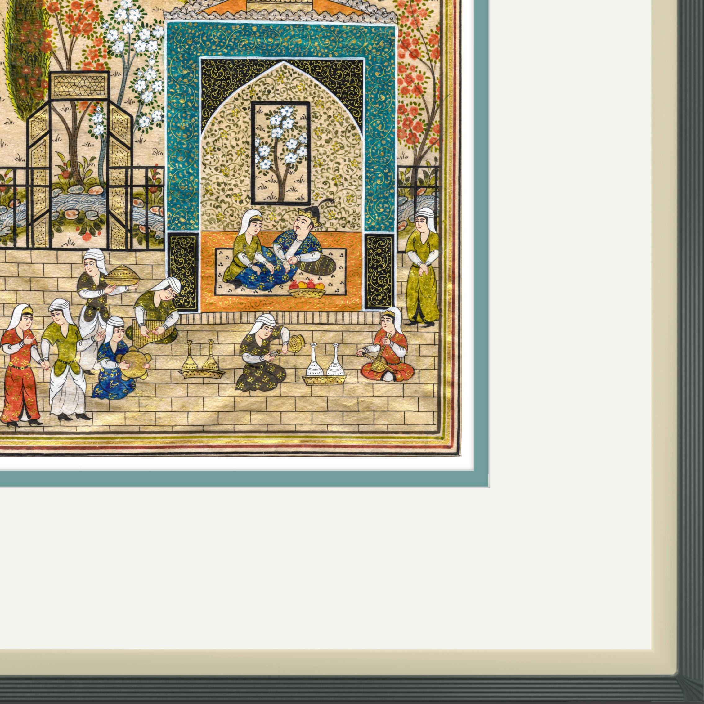 Meticulously crafted using the time-honored techniques of Persian and Central Asian miniature painting, this masterpiece is created on handcrafted mulberry silk paper, prepared with a special multi-stage polishing process to achieve a flawless surface. The finest watercolors, liquid inks, and delicate gold leaf embellishments enhance the intricate details, reflecting the unparalleled craftsmanship of this historic art form. Every brushstroke is applied with precision using a special fine brush, ensuring the richness of expression and depth of composition.