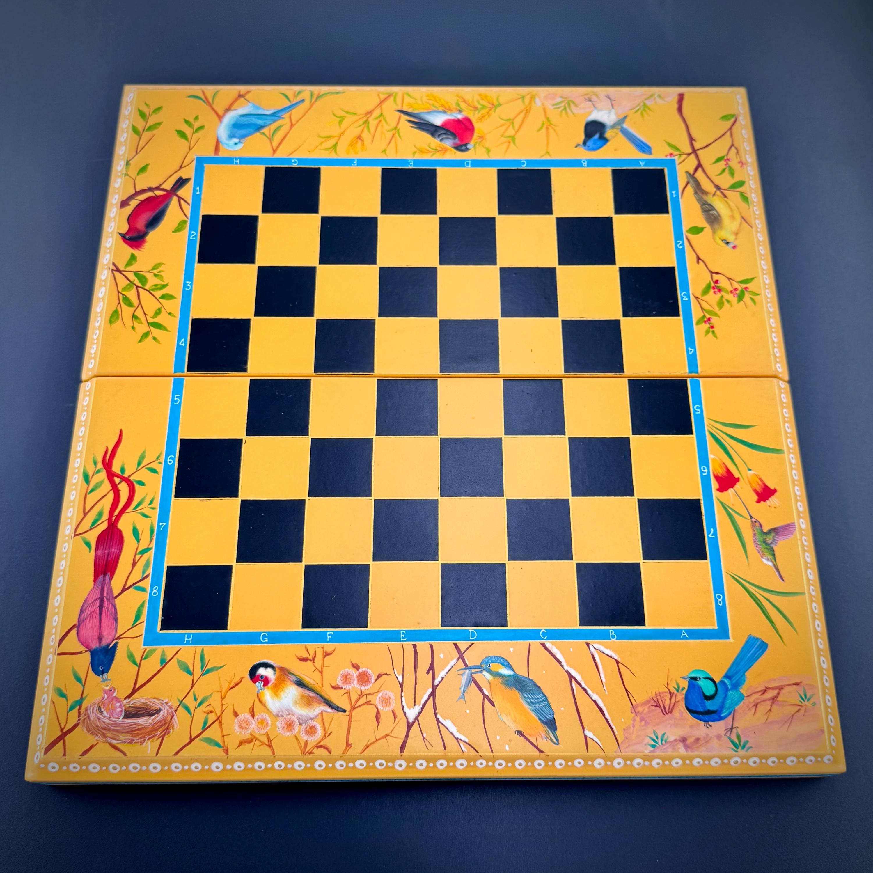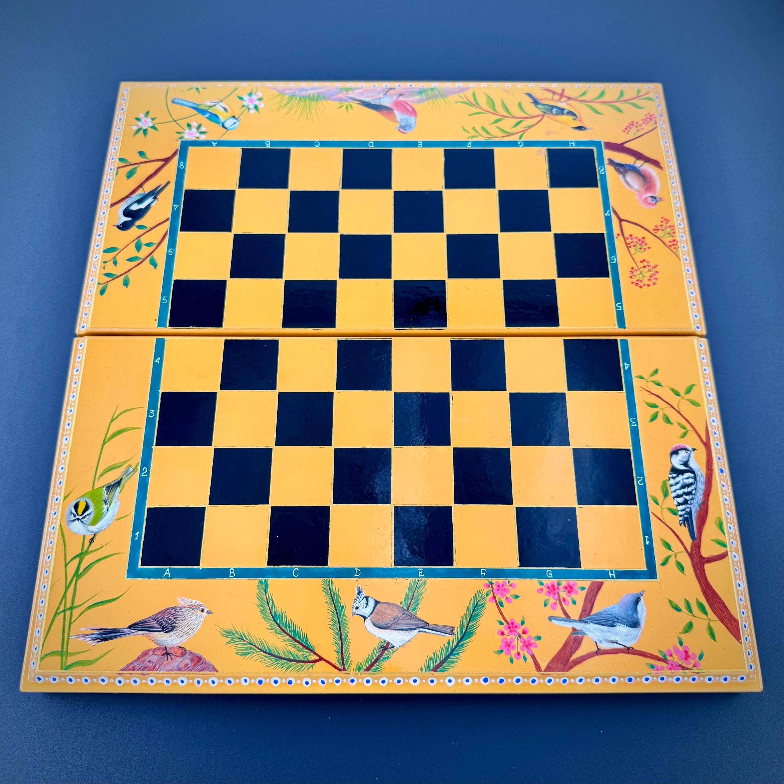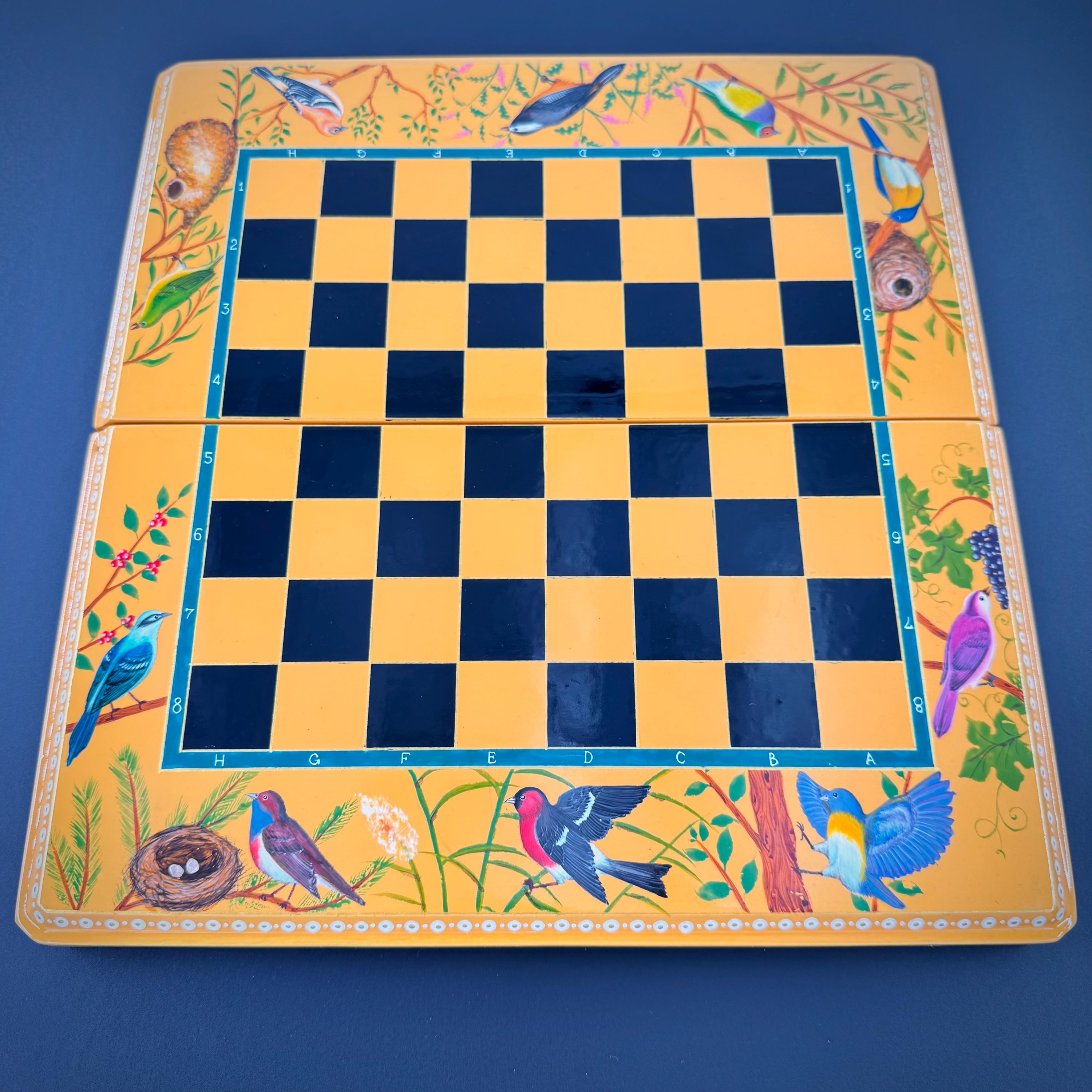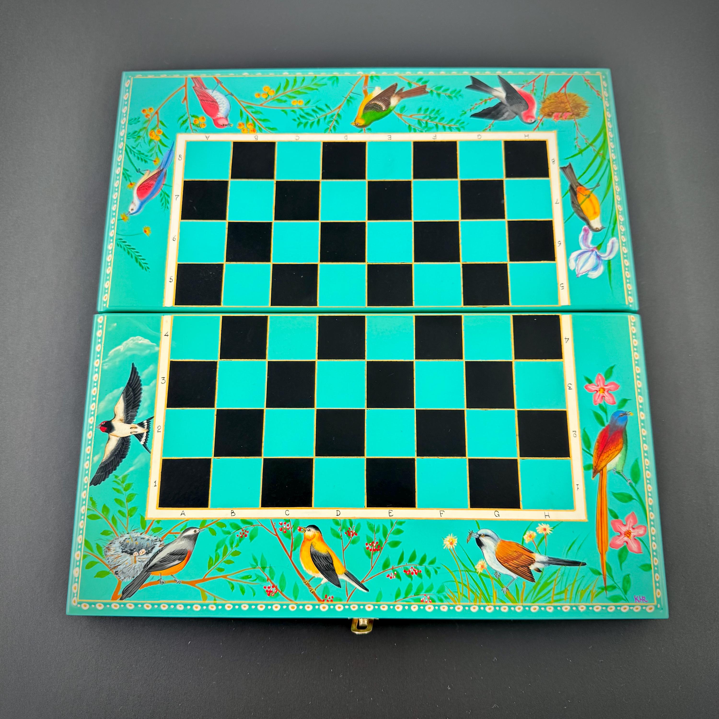 The foldable chessboard, with its secure locking mechanism, is adorned with stunning hand-painted designs inspired by nature, including delicate birds and floral patterns. Each chess piece is a miniature work of art, hand-painted with fine detail using vintage-style patterns and a step-by-step lacquer technique. This labor-intensive process ensures not only unmatched intricacy but also a durable, polished finish that will last for generations.