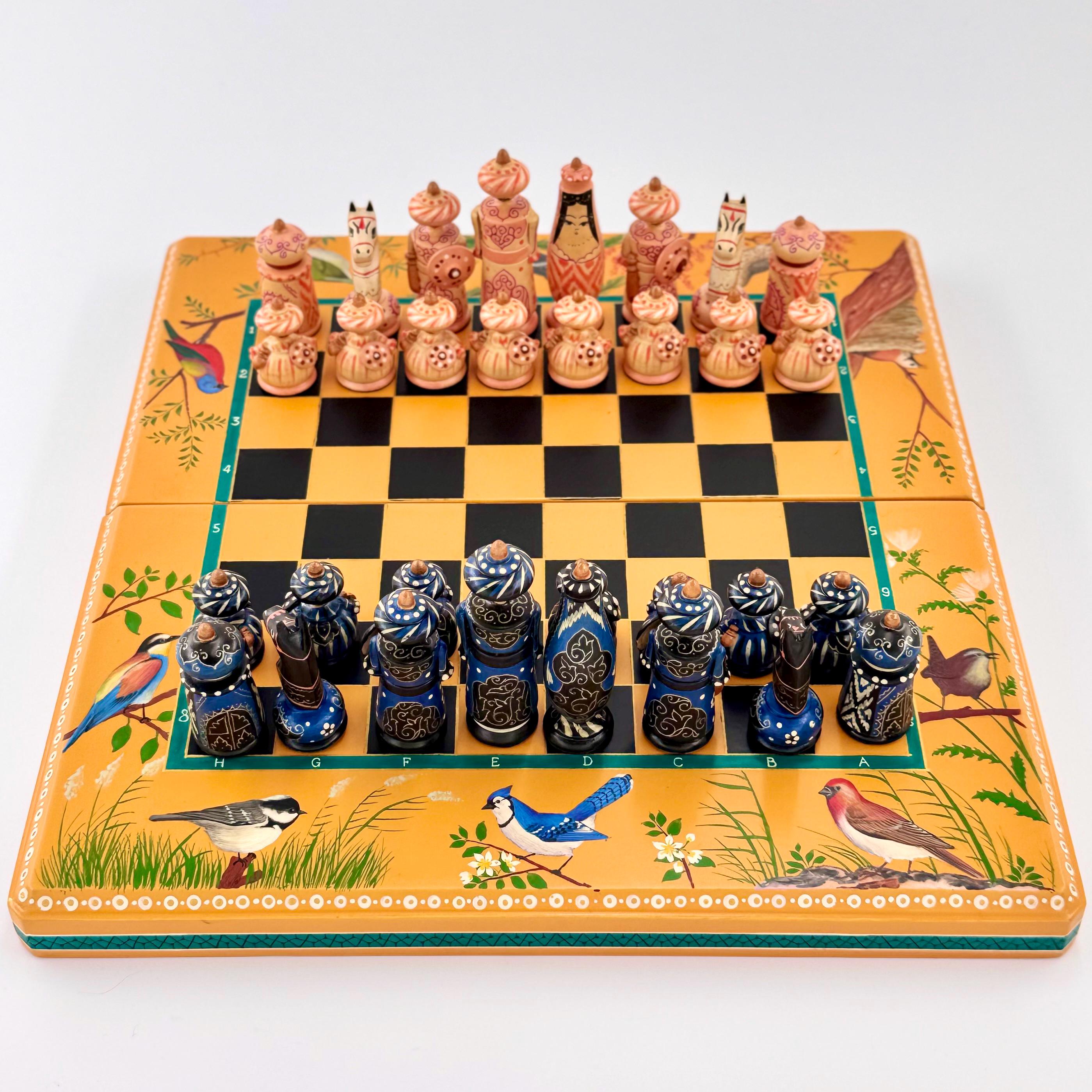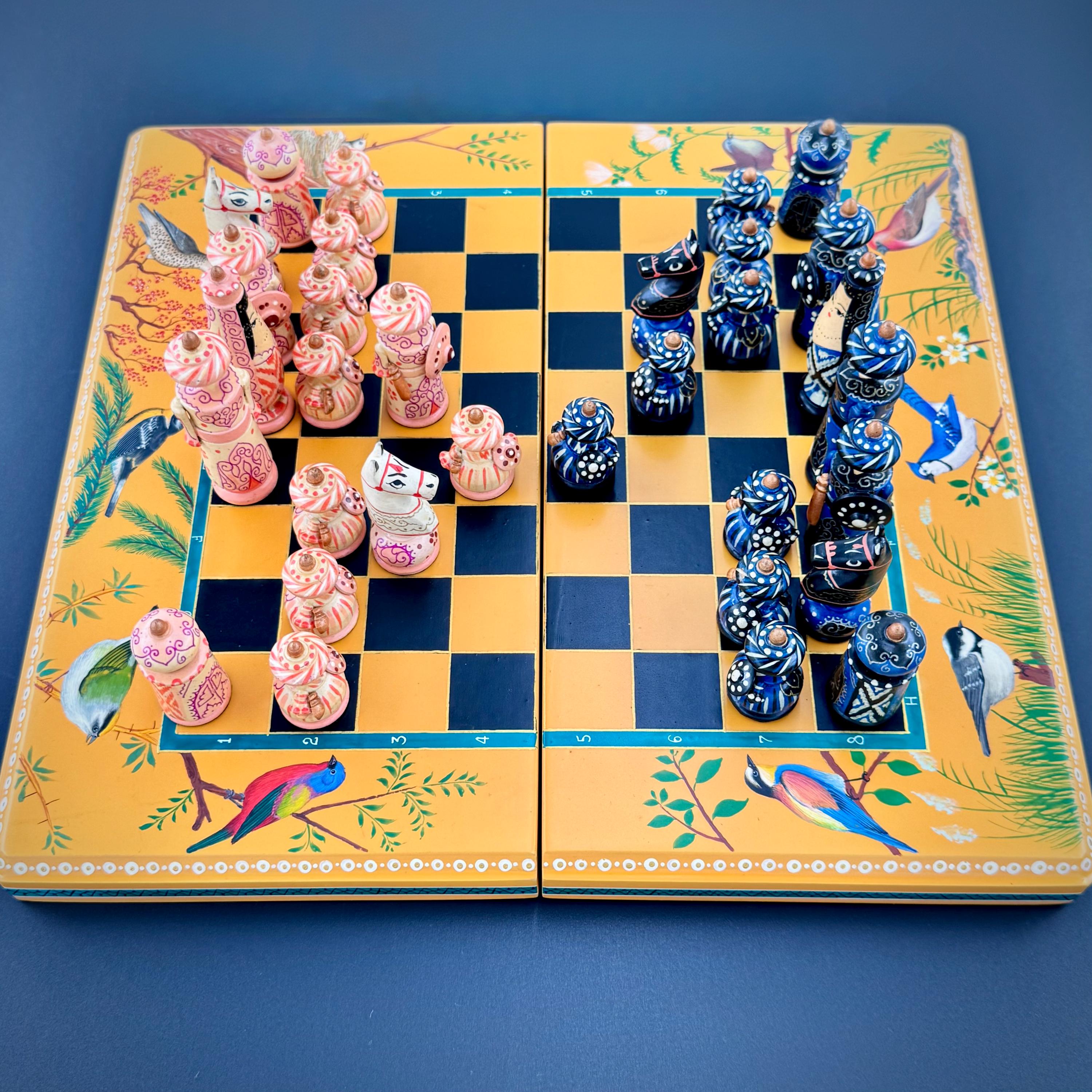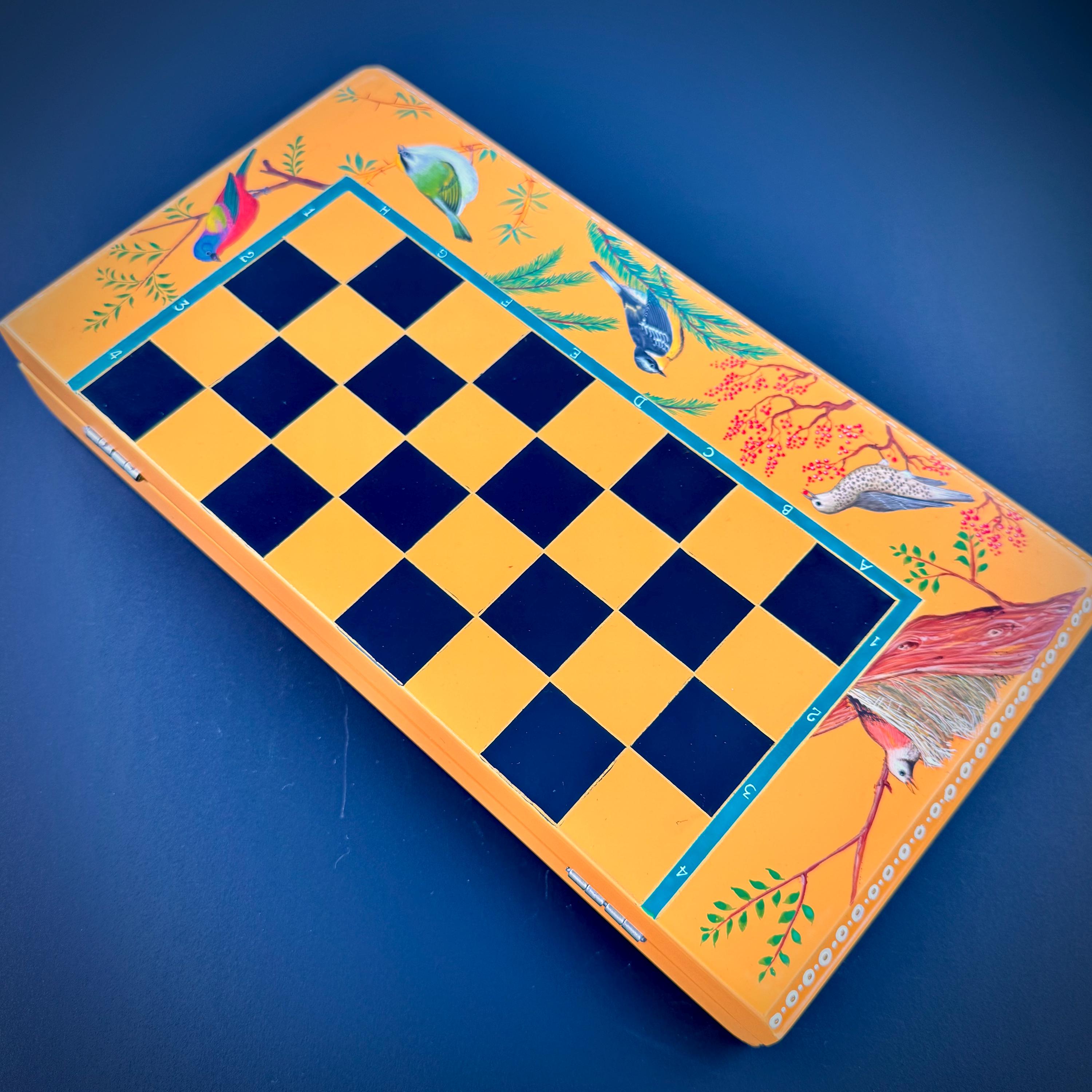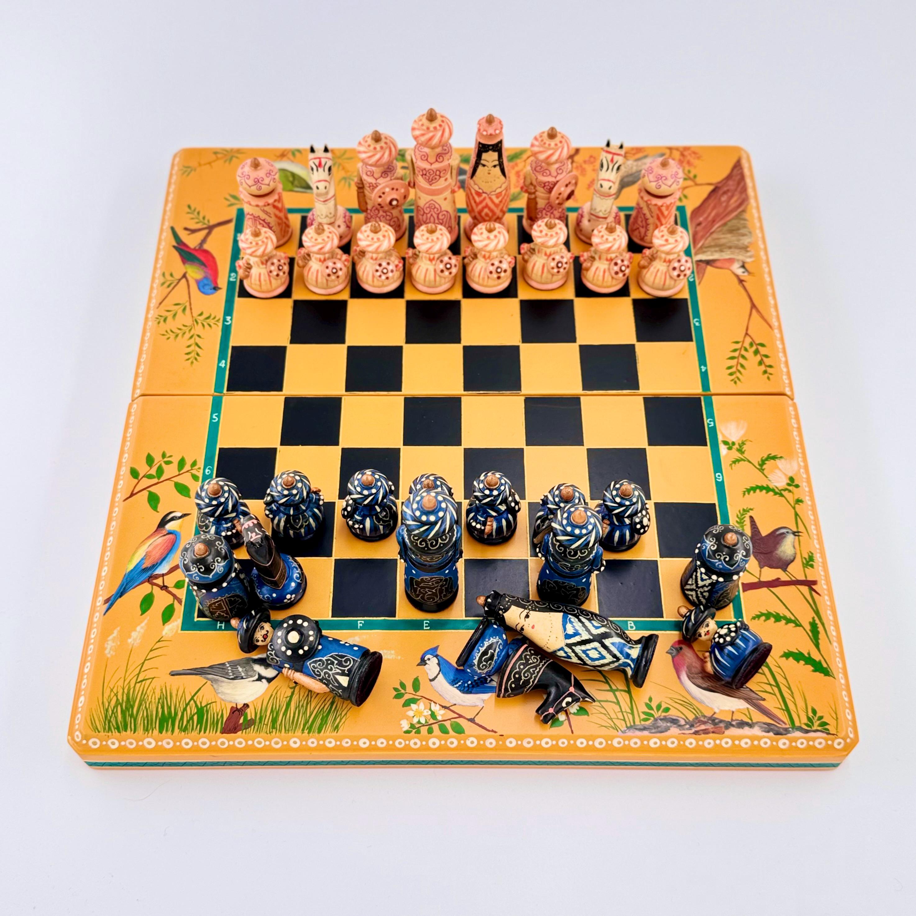 The foldable chessboard, with its secure locking mechanism, is adorned with stunning hand-painted designs inspired by nature, including delicate birds and floral patterns. Each chess piece is a miniature work of art, hand-painted with fine detail using vintage-style patterns and a step-by-step lacquer technique. This labor-intensive process ensures not only unmatched intricacy but also a durable, polished finish that will last for generations.