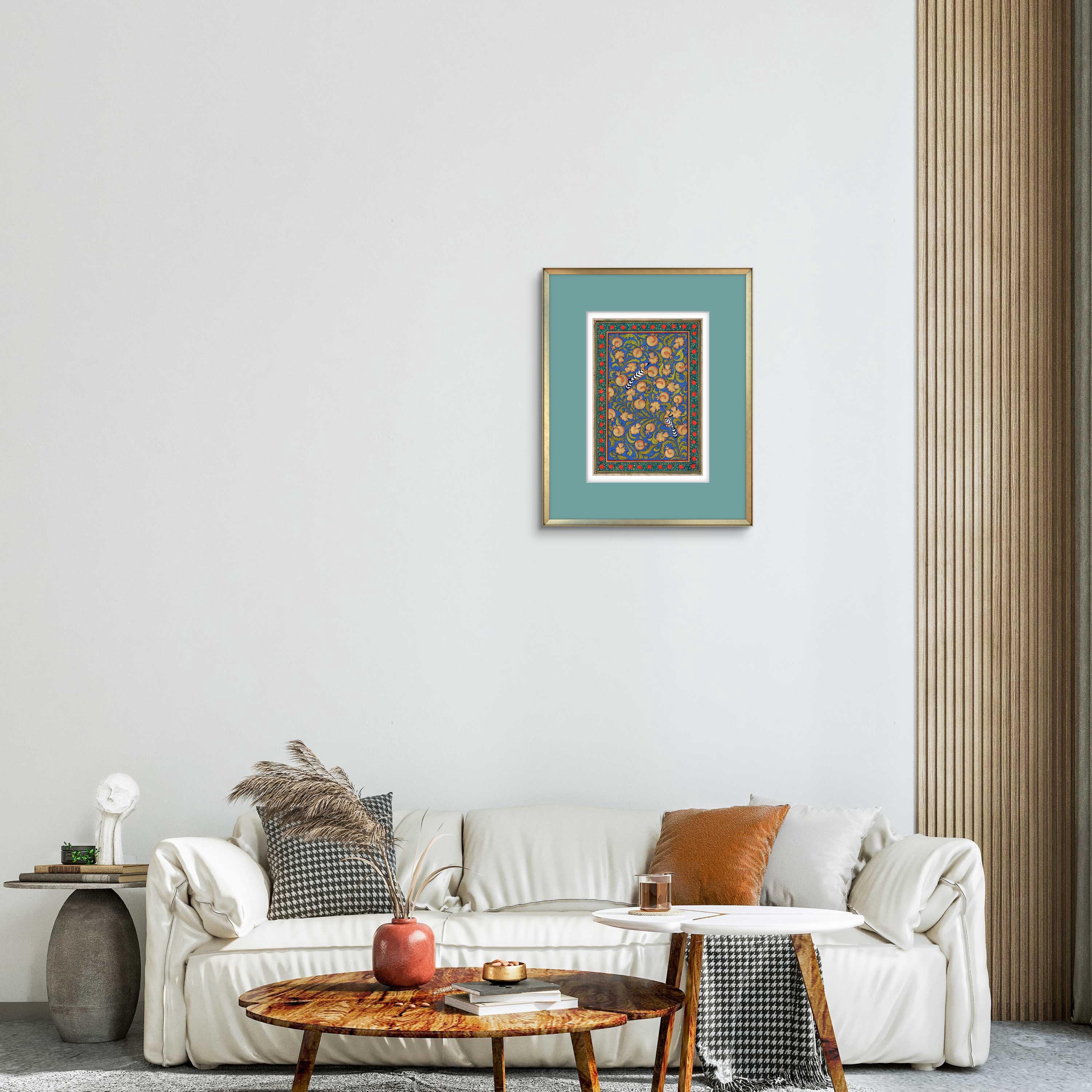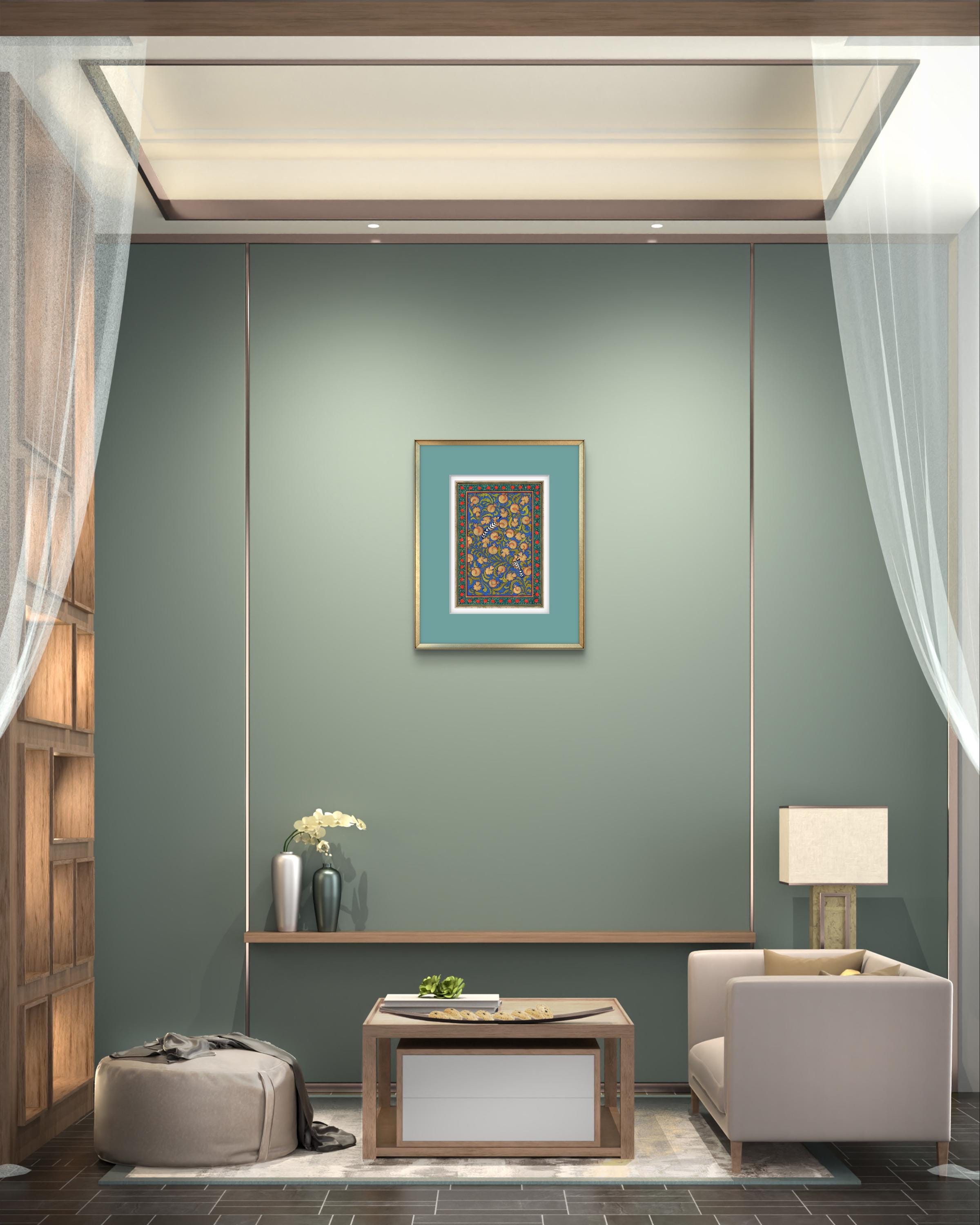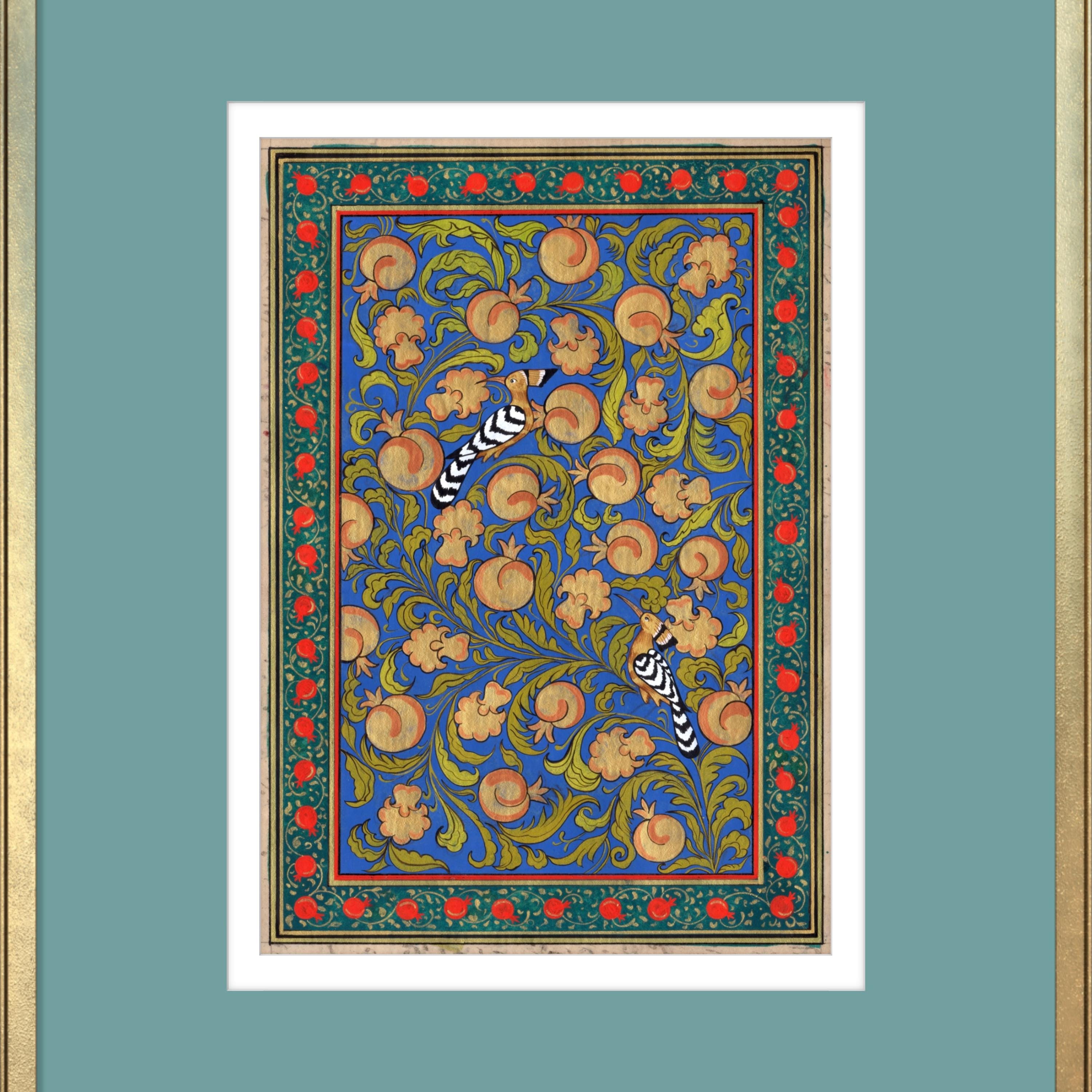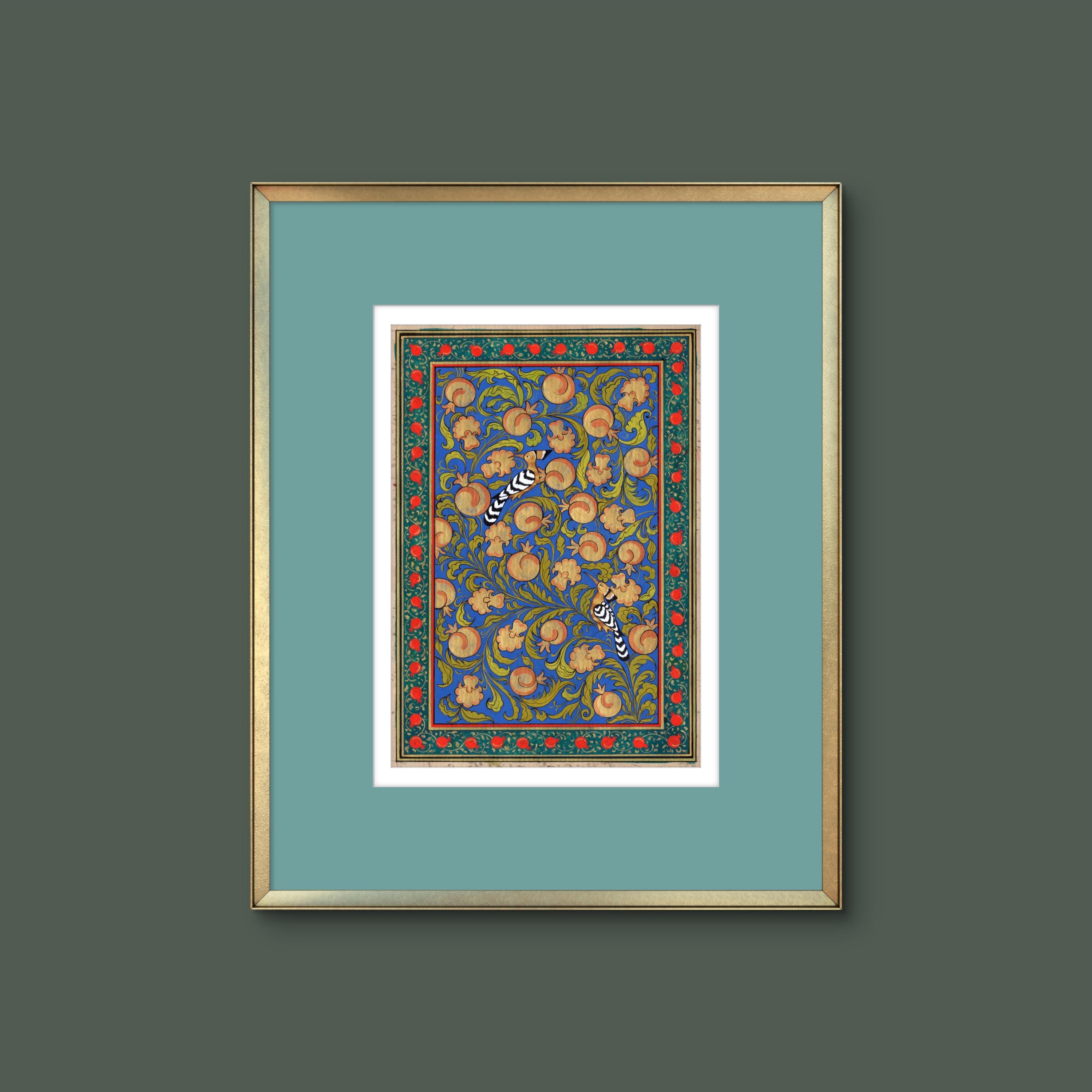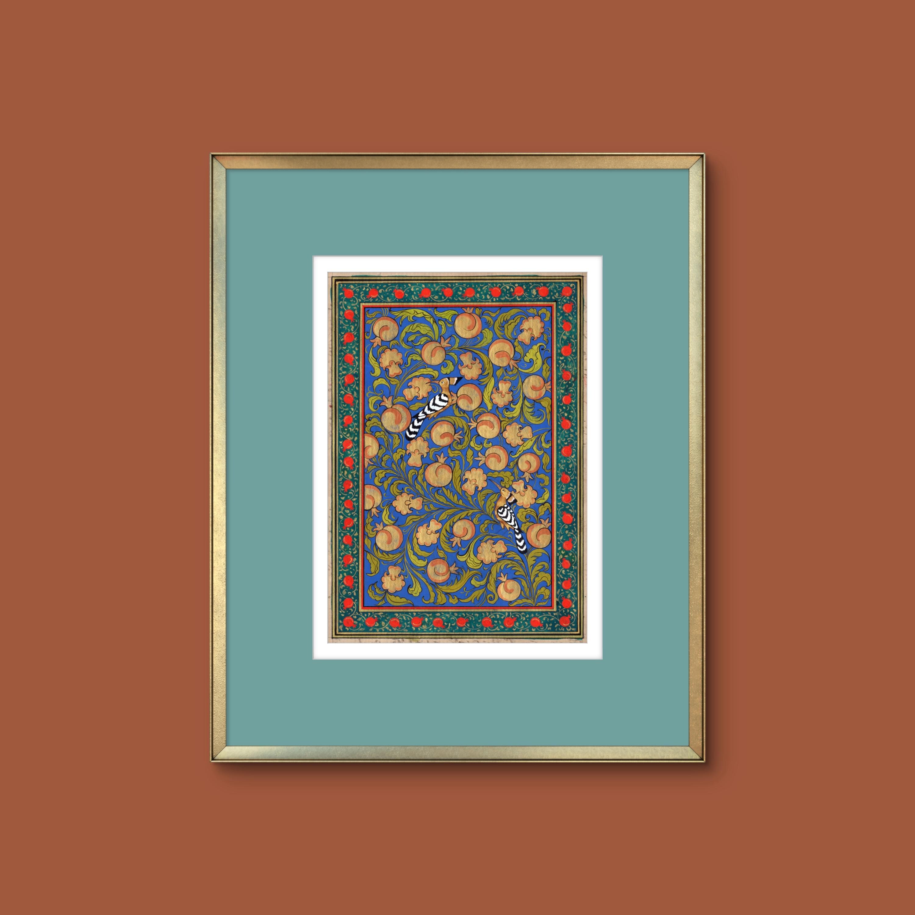 “Tree of Paradise: Pomegranates and Hoopoe Birds” captures the essence of spiritual beauty, the interconnectedness of life, and the serene balance of nature, all encapsulated in the timeless art of miniature painting.