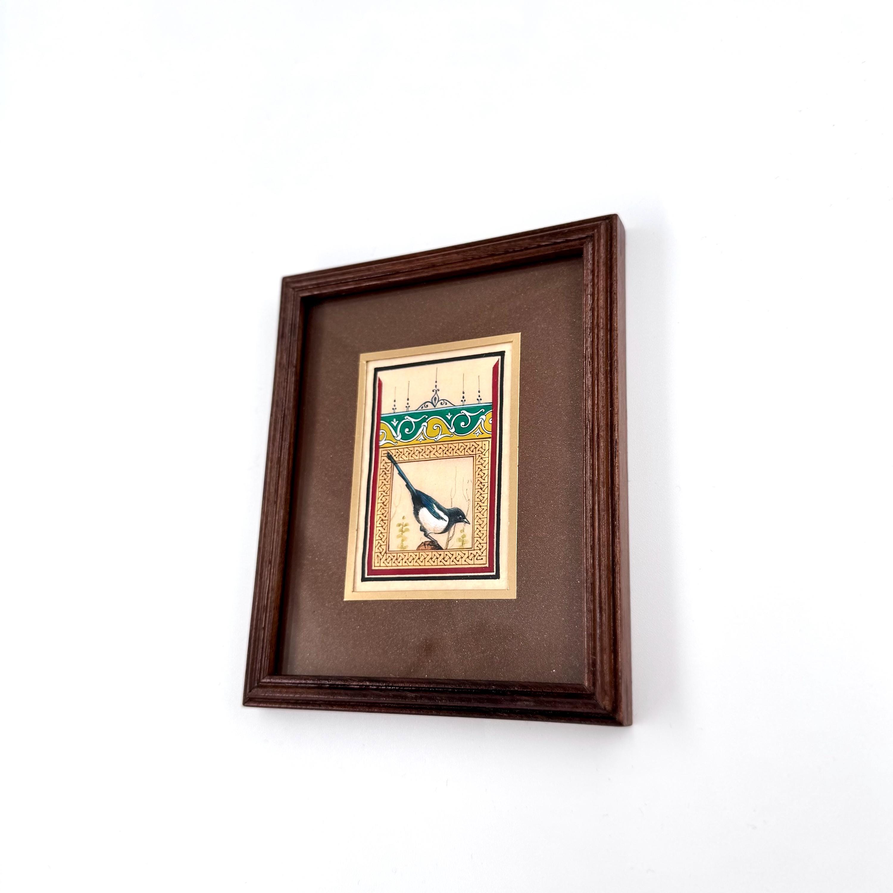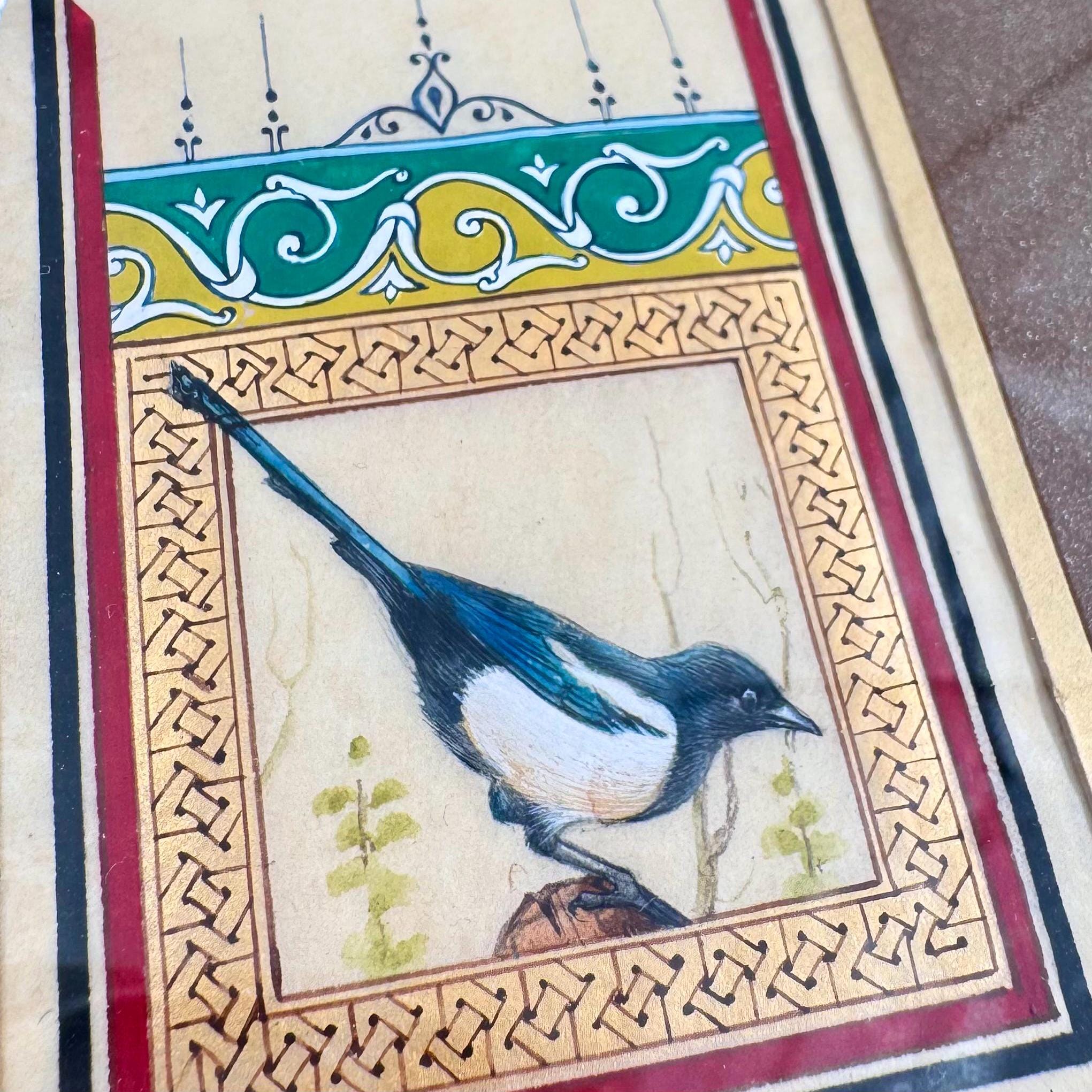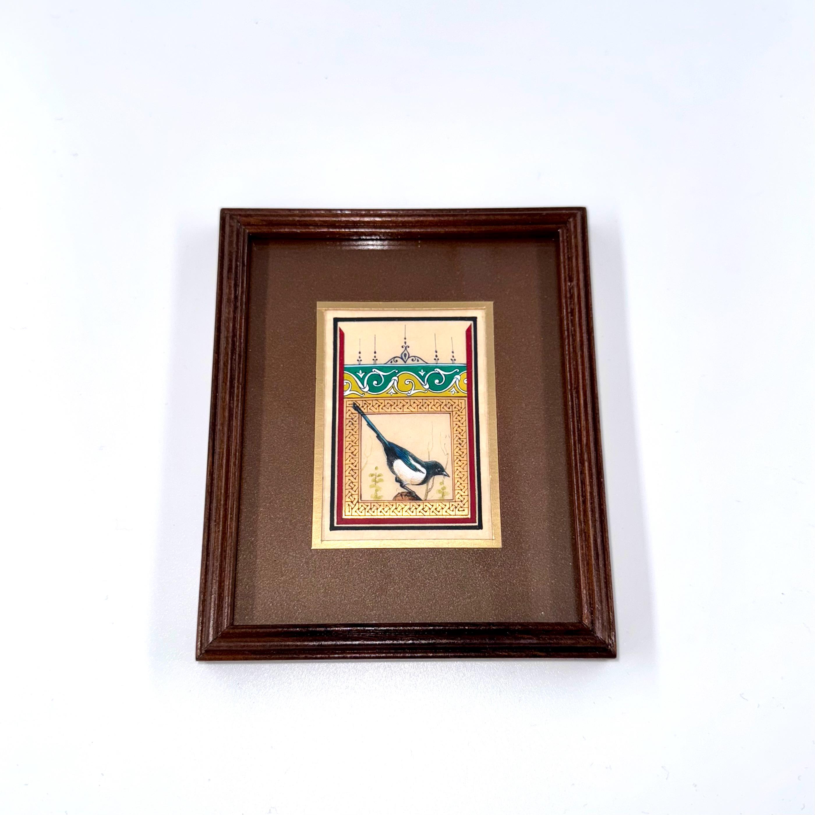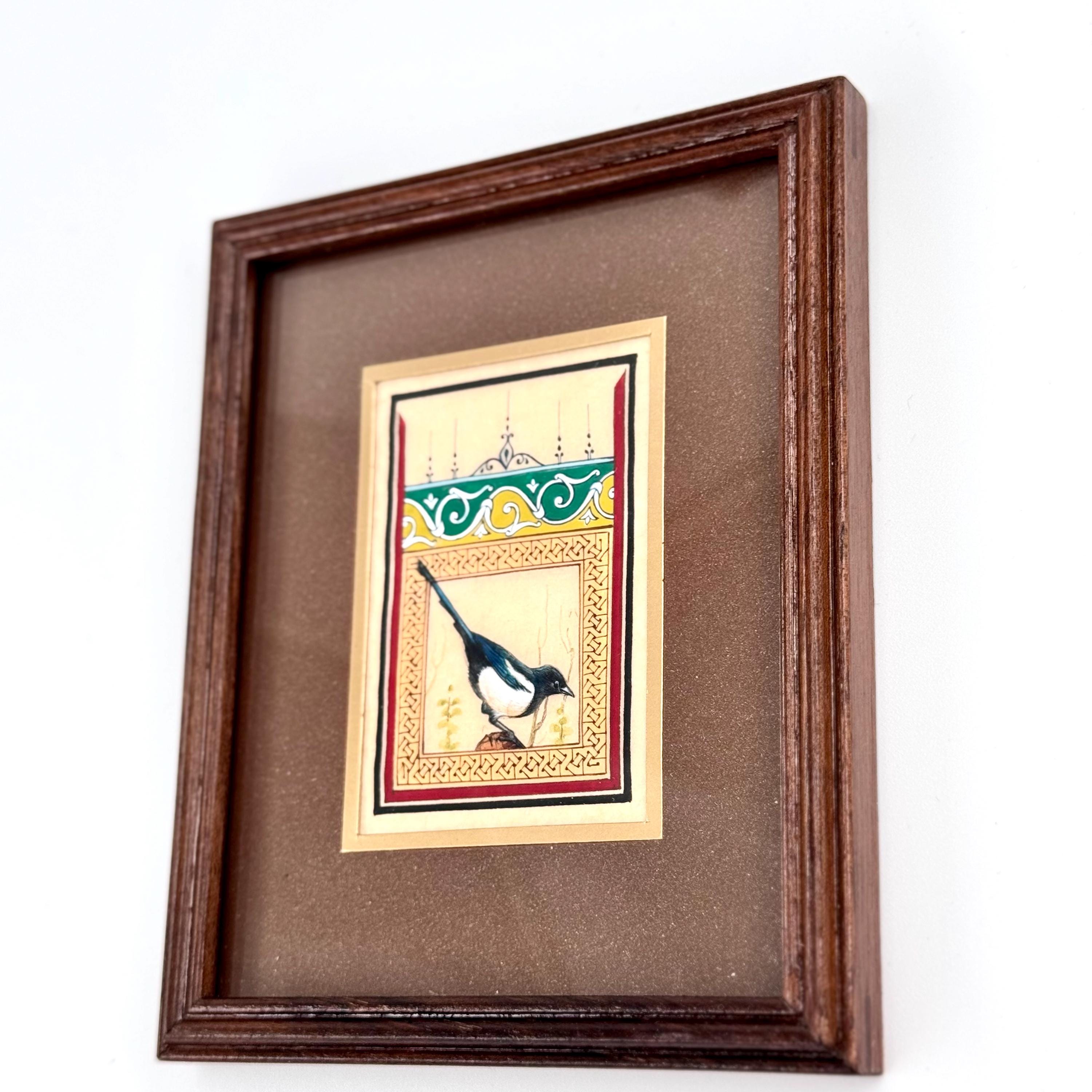 This extraordinary framed miniature painting is a masterful representation of Bird and ornaments, rendered in the intricate Central Asian miniature painting style. Each detail has been painstakingly painted under a magnifying glass, allowing for an exceptional level of precision. The finest brushes were used to create delicate lines, capturing the essence of movement and the intricate interplay between the characters and the natural world.