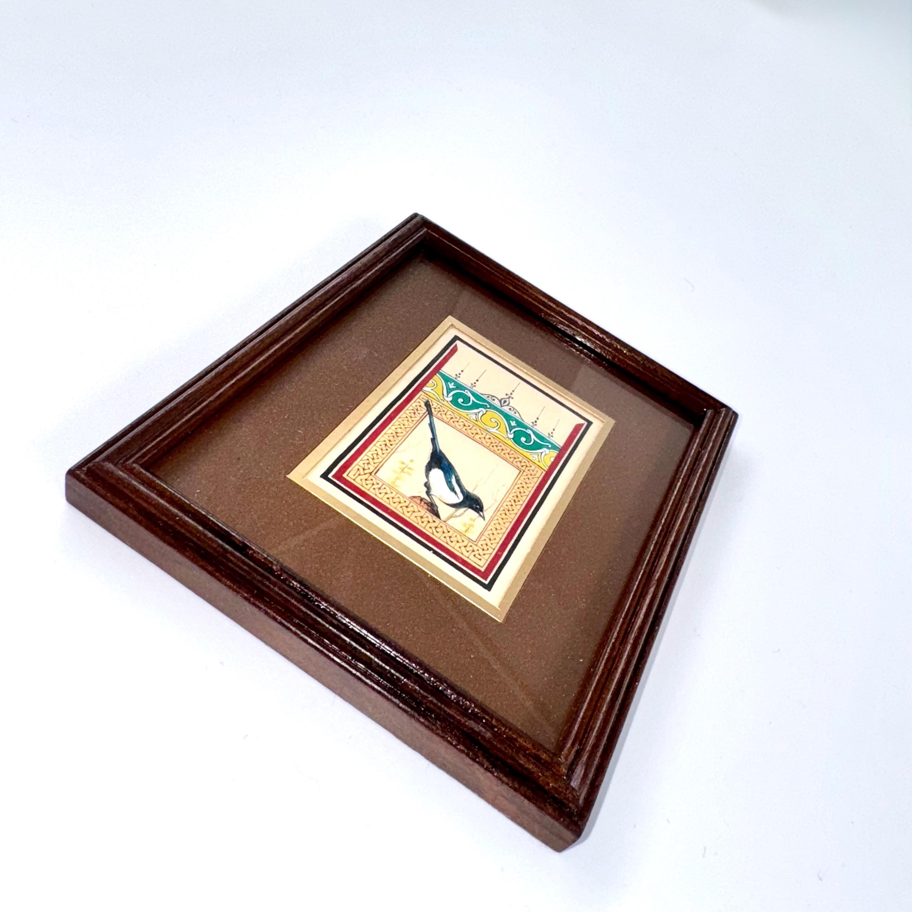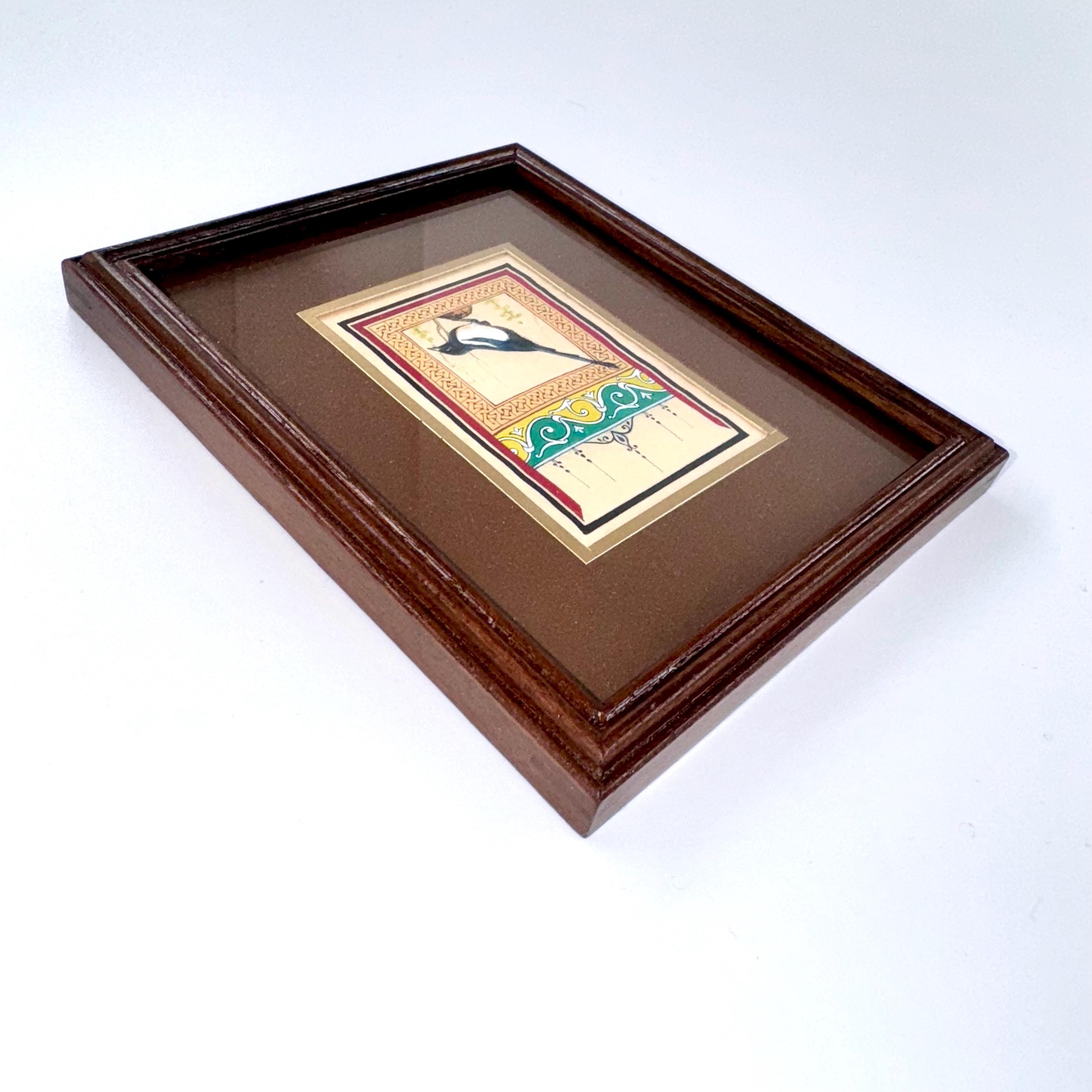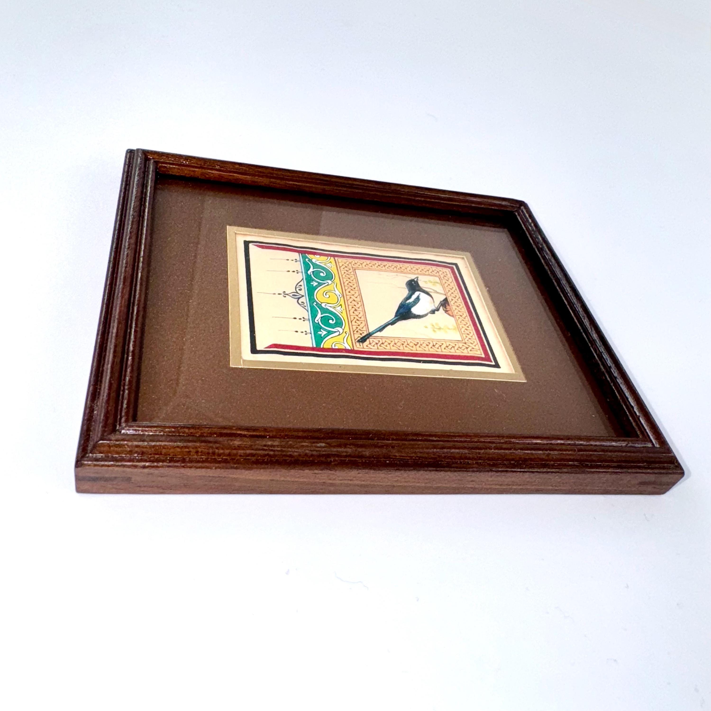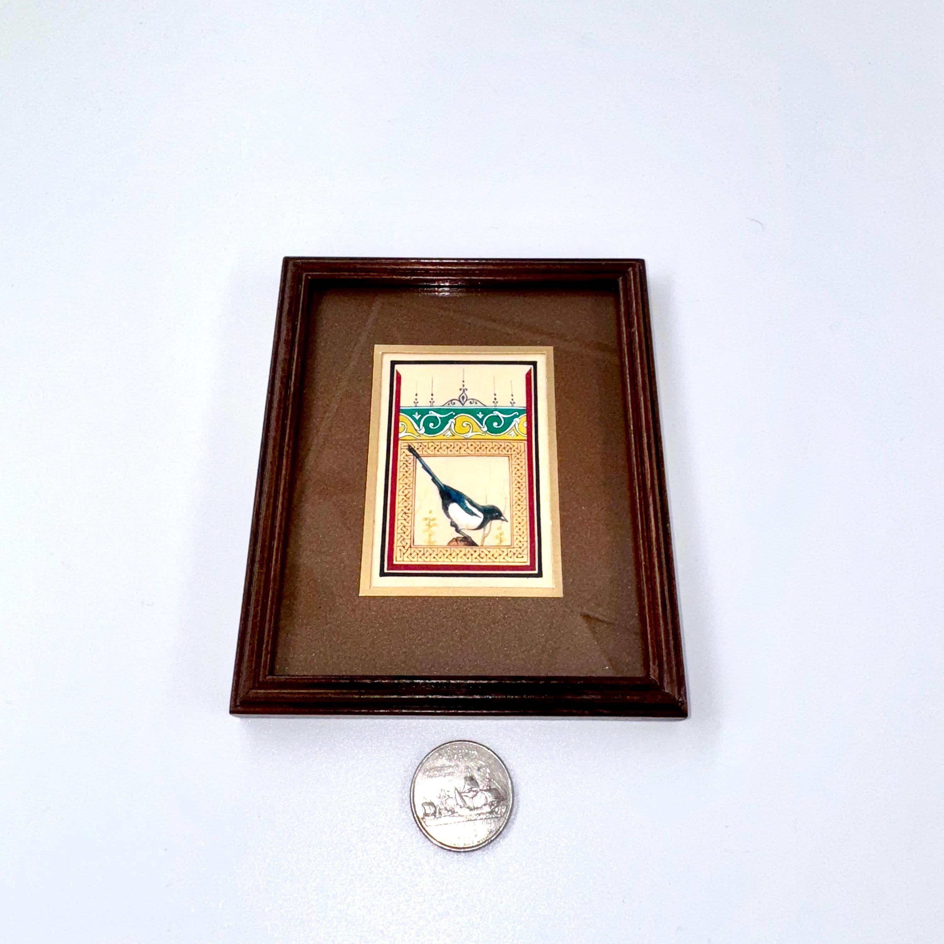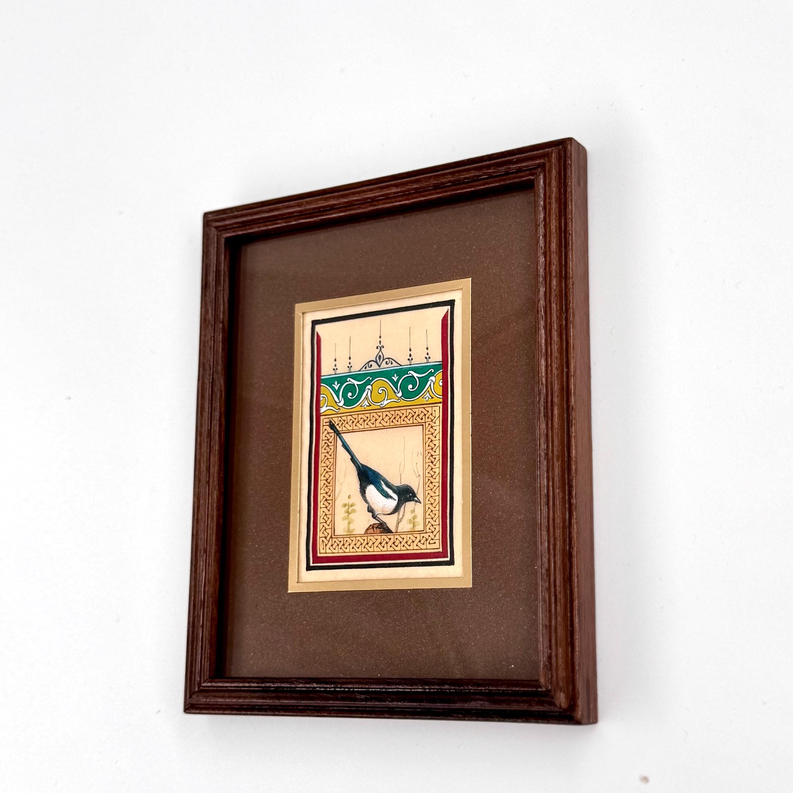 This extraordinary framed miniature painting is a masterful representation of Bird and ornaments, rendered in the intricate Central Asian miniature painting style. Each detail has been painstakingly painted under a magnifying glass, allowing for an exceptional level of precision. The finest brushes were used to create delicate lines, capturing the essence of movement and the intricate interplay between the characters and the natural world.