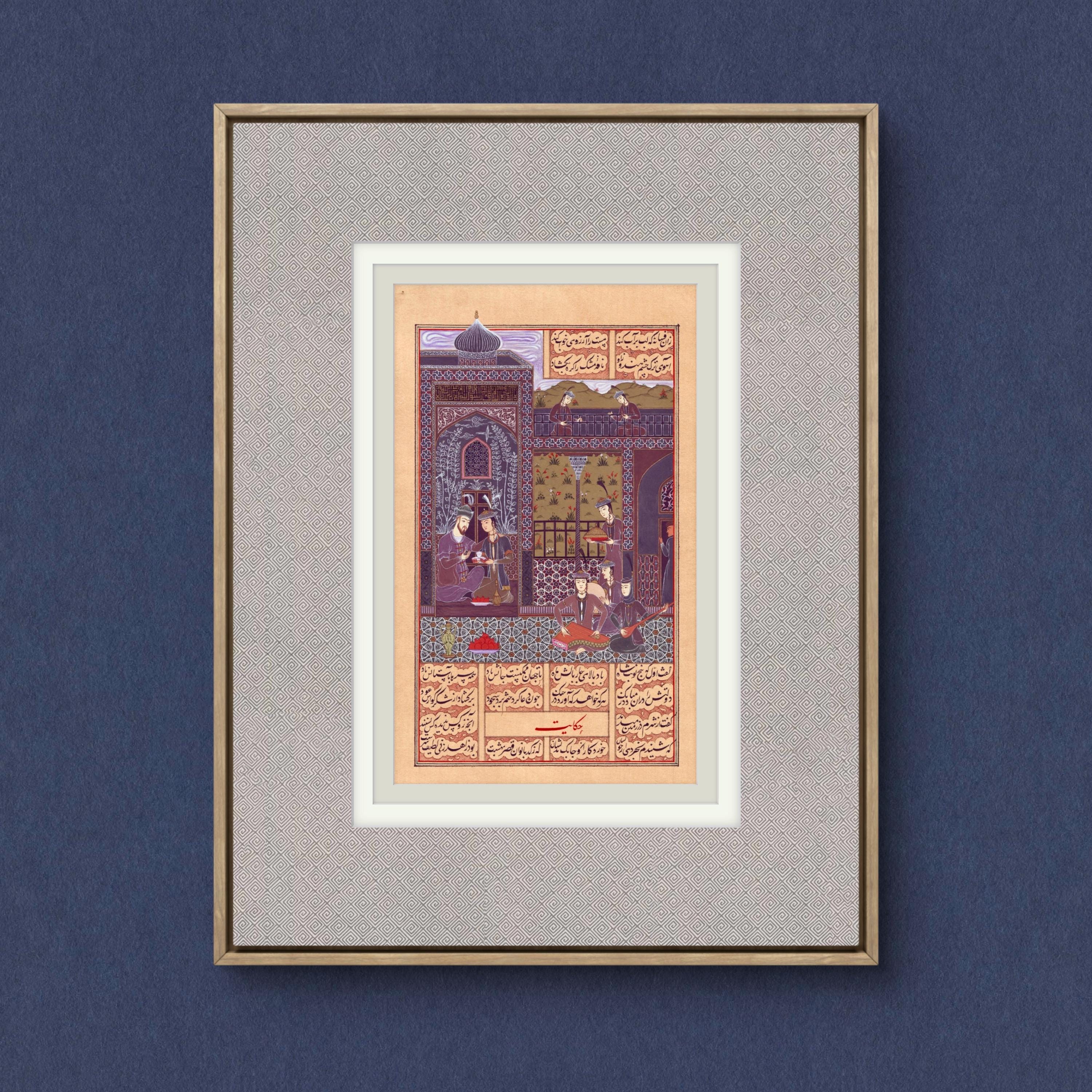 This exquisite miniature painting brings to life the legendary tale of Bahram Gur from Khamsa by Nizami Ganjavi, one of the greatest Persian poets of the 12th century. The scene depicts Bahram Gur in the magnificent Blue Pavilion, where he listens to the wisdom of the princess, enveloped in an atmosphere of luxury, romance, and mysticism. Each color in the series of seven pavilions symbolizes different aspects of fate and human experience, a theme deeply rooted in Persian literary and artistic traditions.