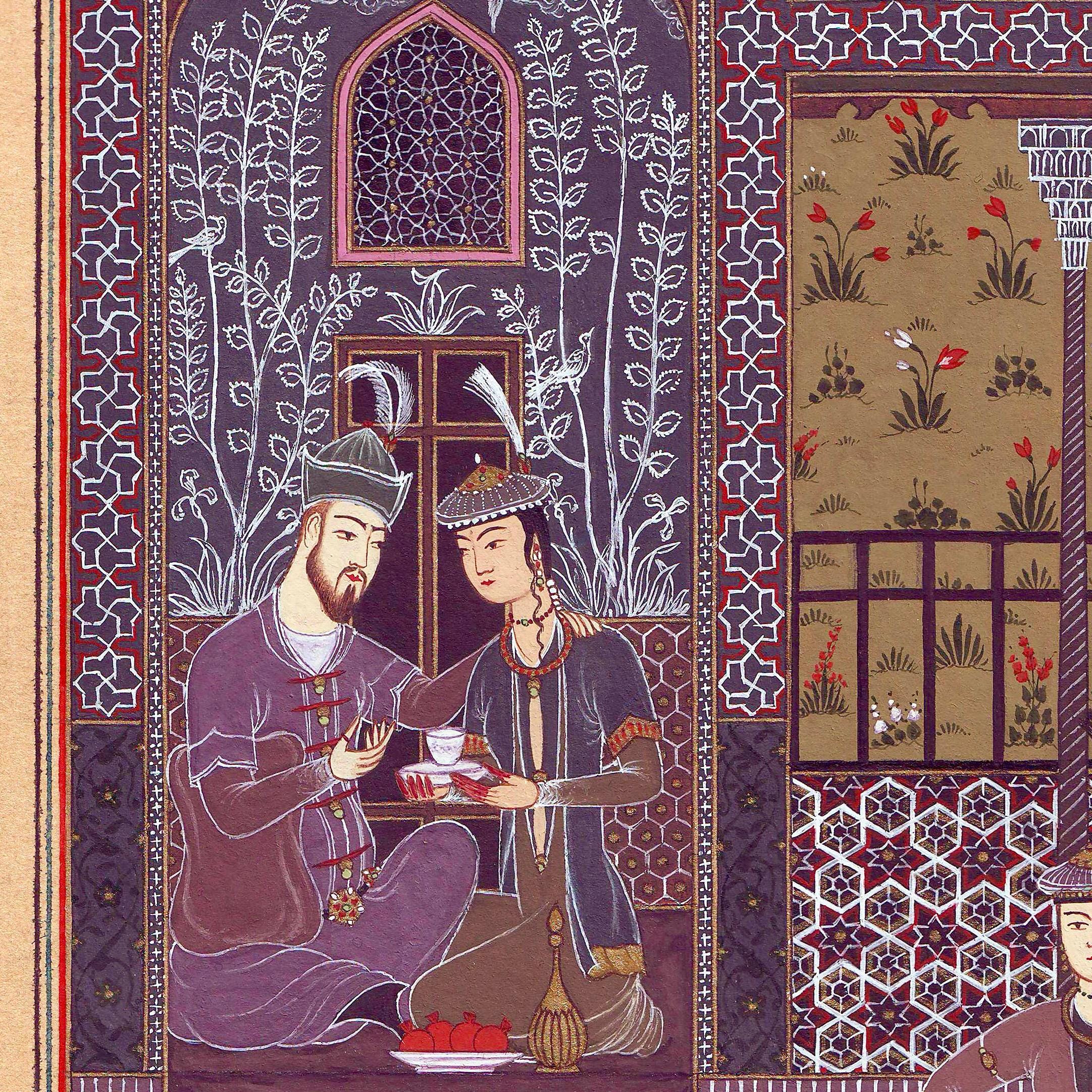 Meticulously crafted using the time-honored techniques of Persian and Central Asian miniature painting, this masterpiece is created on handcrafted mulberry silk paper, prepared with a special multi-stage polishing process to achieve a flawless surface. The finest watercolors, liquid inks, and delicate gold leaf embellishments enhance the intricate details, reflecting the unparalleled craftsmanship of this historic art form. Every brushstroke is applied with precision using a special fine brush, ensuring the richness of expression and depth of composition.