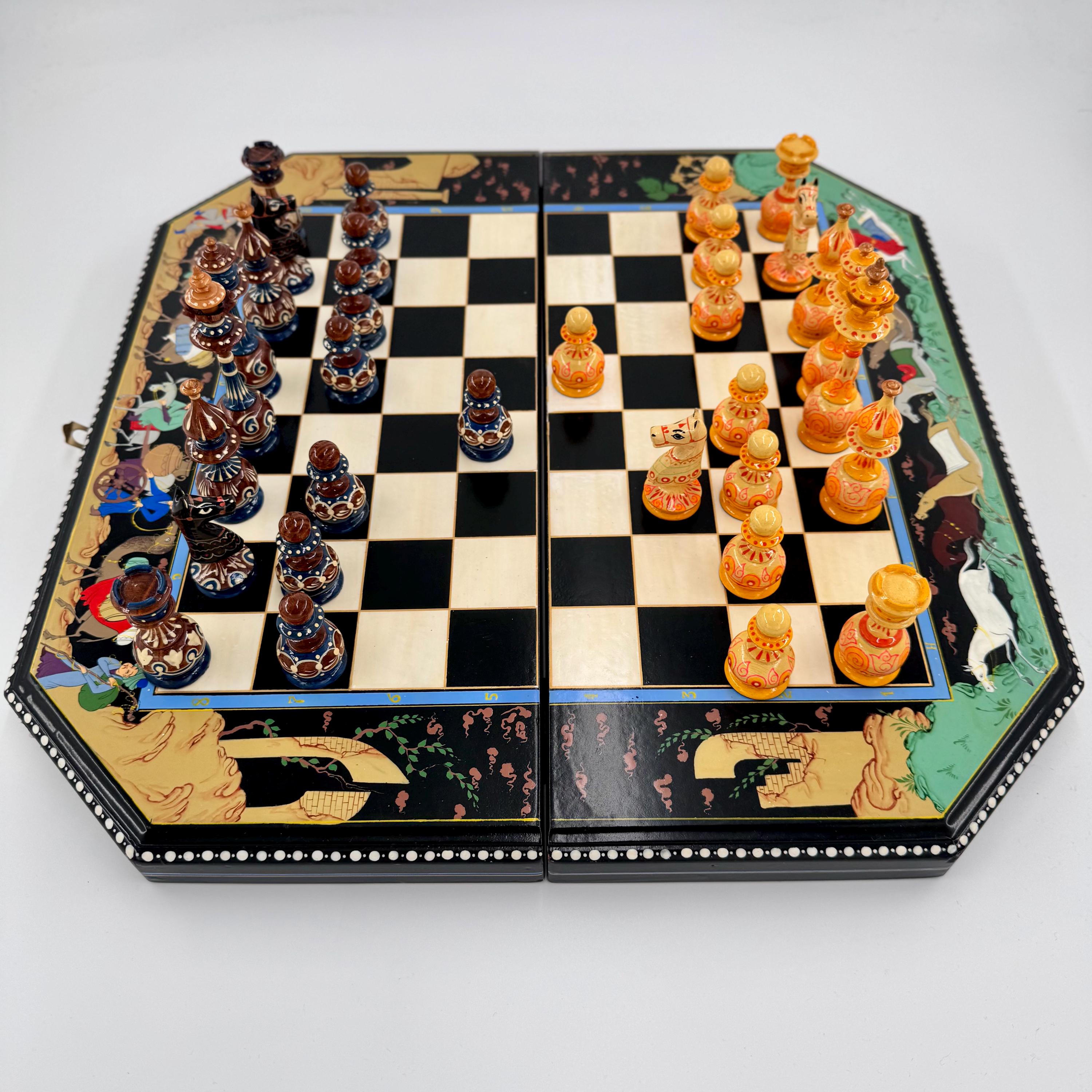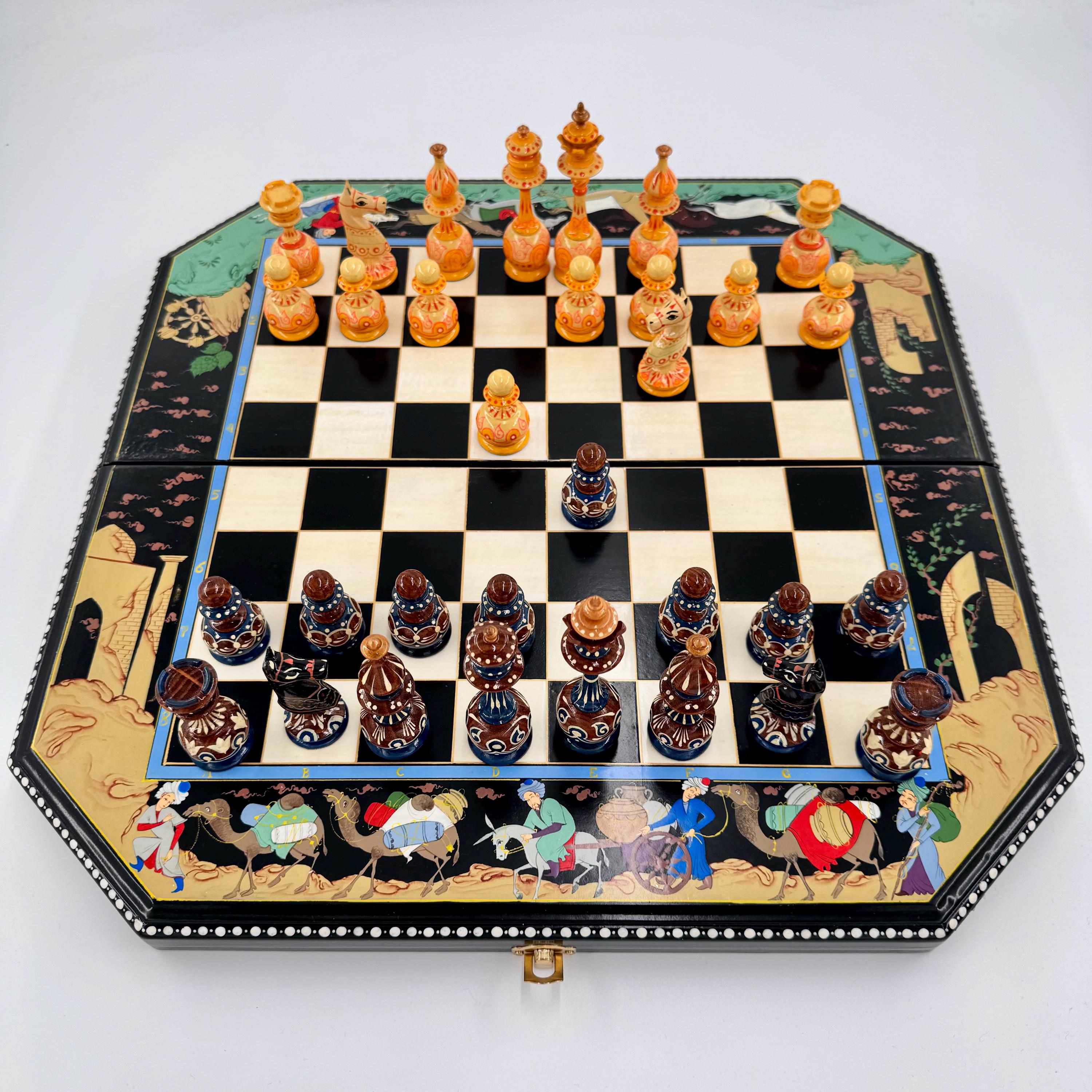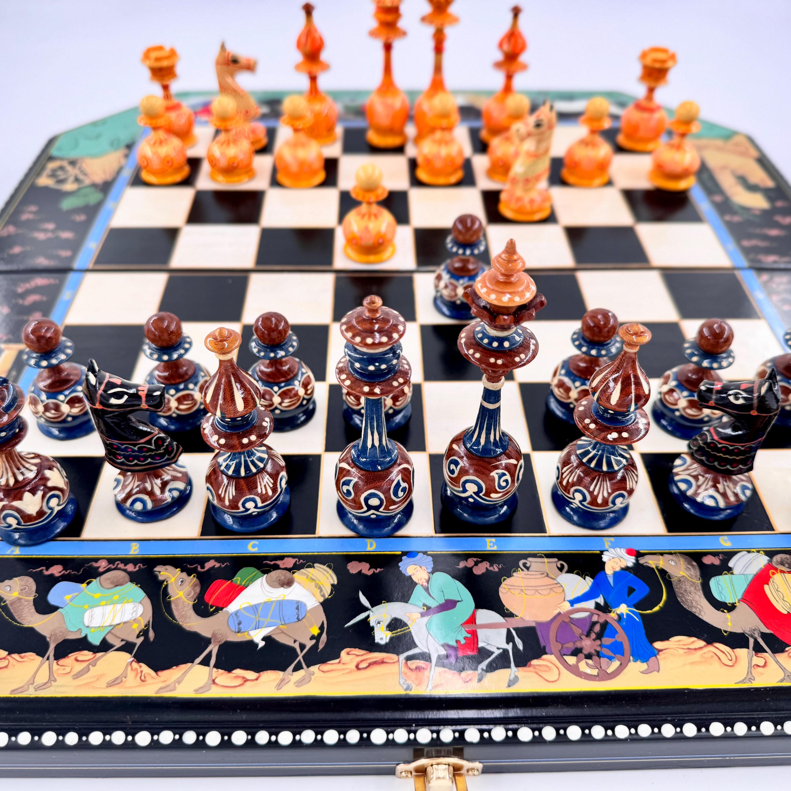 Experience the perfect fusion of artistry and functionality with this exceptional handcrafted chess set, made entirely from premium walnut wood. Renowned for its strength, smooth grain, and timeless beauty, walnut wood brings a natural warmth and elegance to this unique creation. Every element of this chess set—from the board to the intricately detailed pieces—has been expertly carved and painted by hand, showing the vibrant and rich artistic traditions of Central Asia.