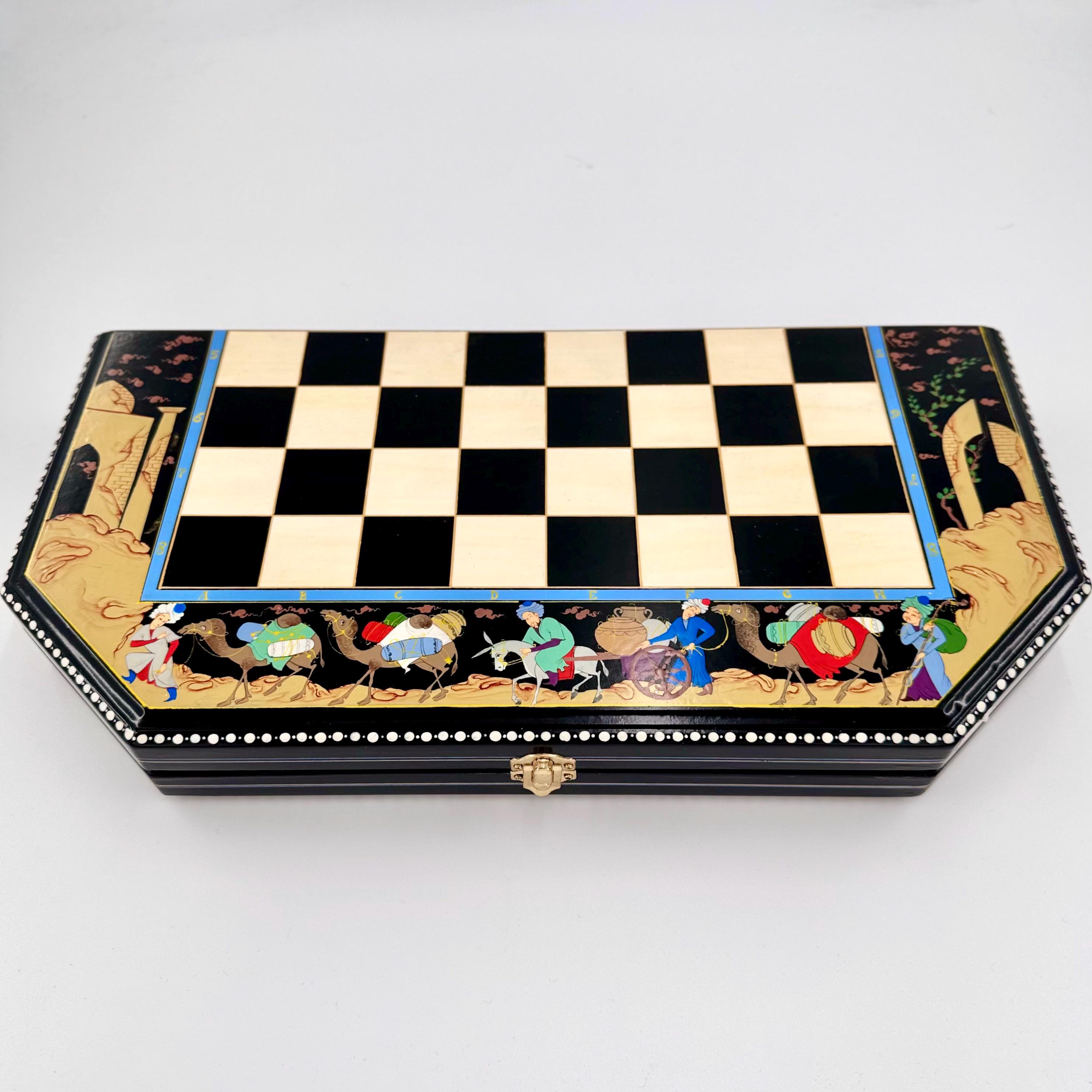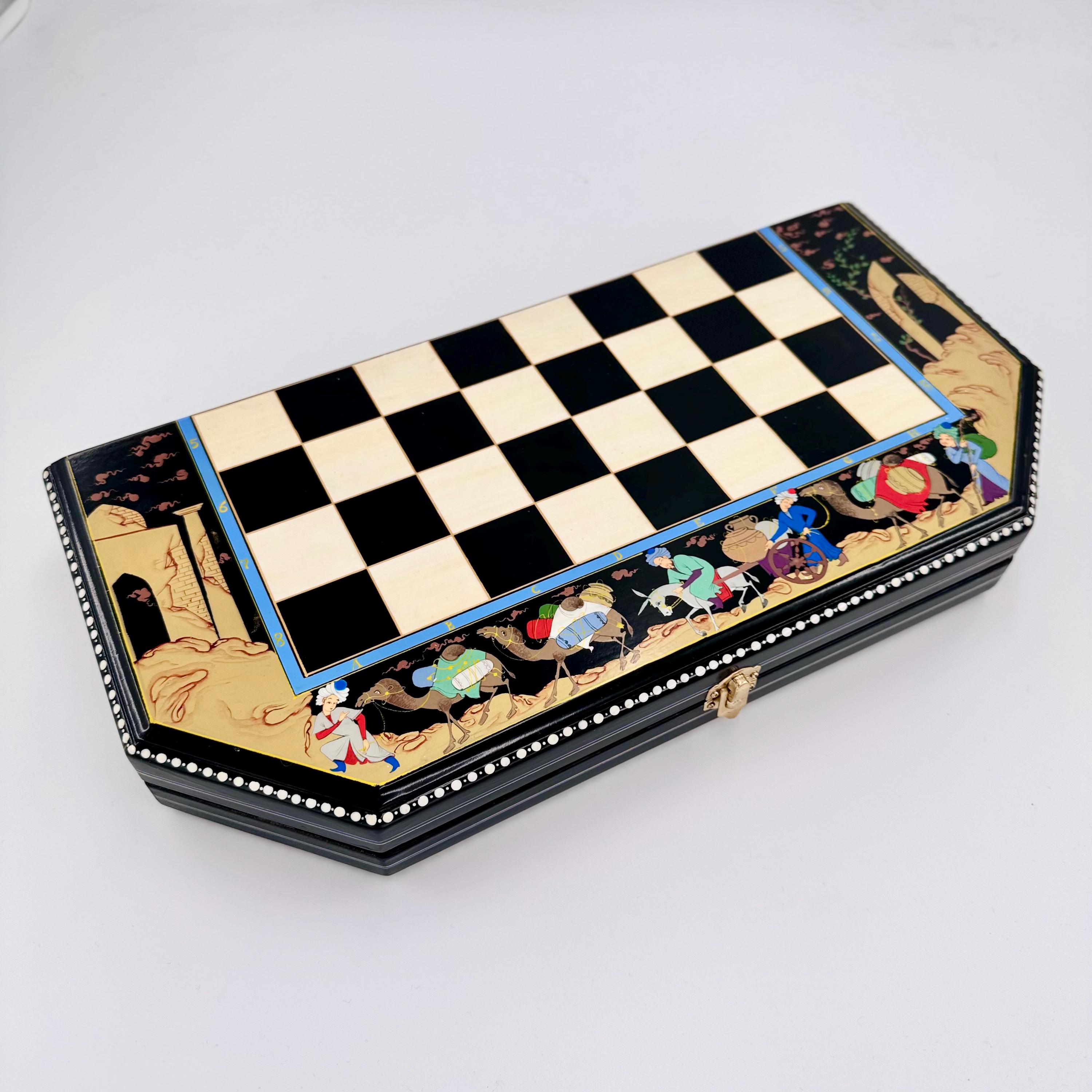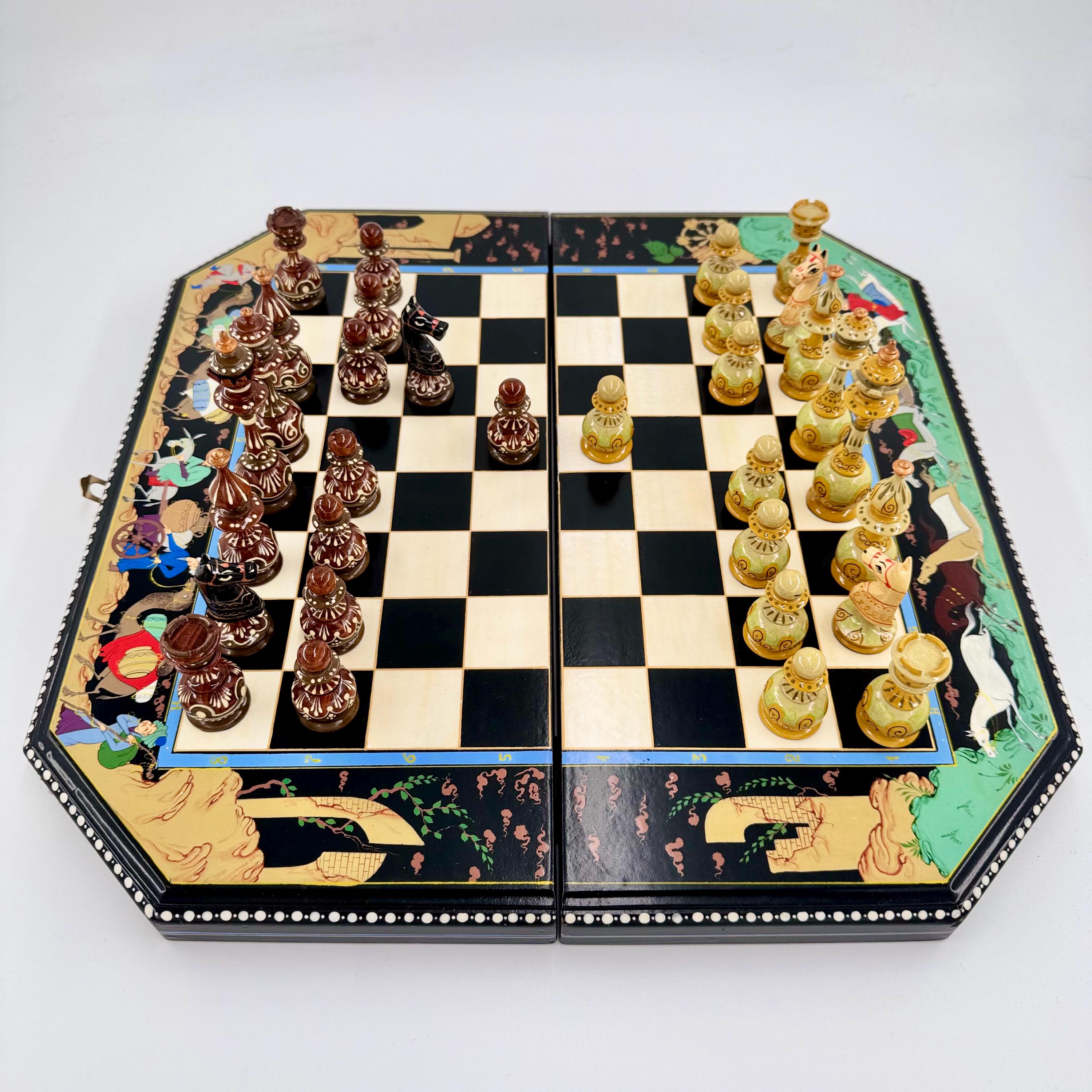 The foldable chessboard, with its secure locking mechanism, is adorned with stunning hand-painted designs inspired by nature, including delicate birds and floral patterns. Each chess piece is a miniature work of art, hand-painted with fine detail using vintage-style patterns and a step-by-step lacquer technique. This labor-intensive process ensures not only unmatched intricacy but also a durable, polished finish that will last for generations.