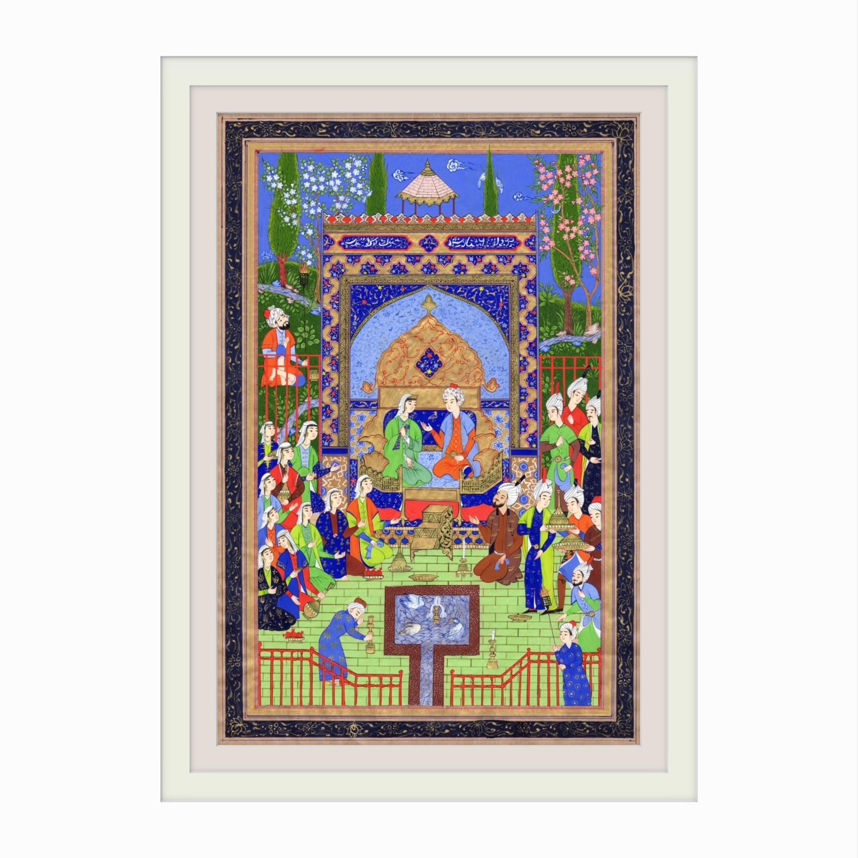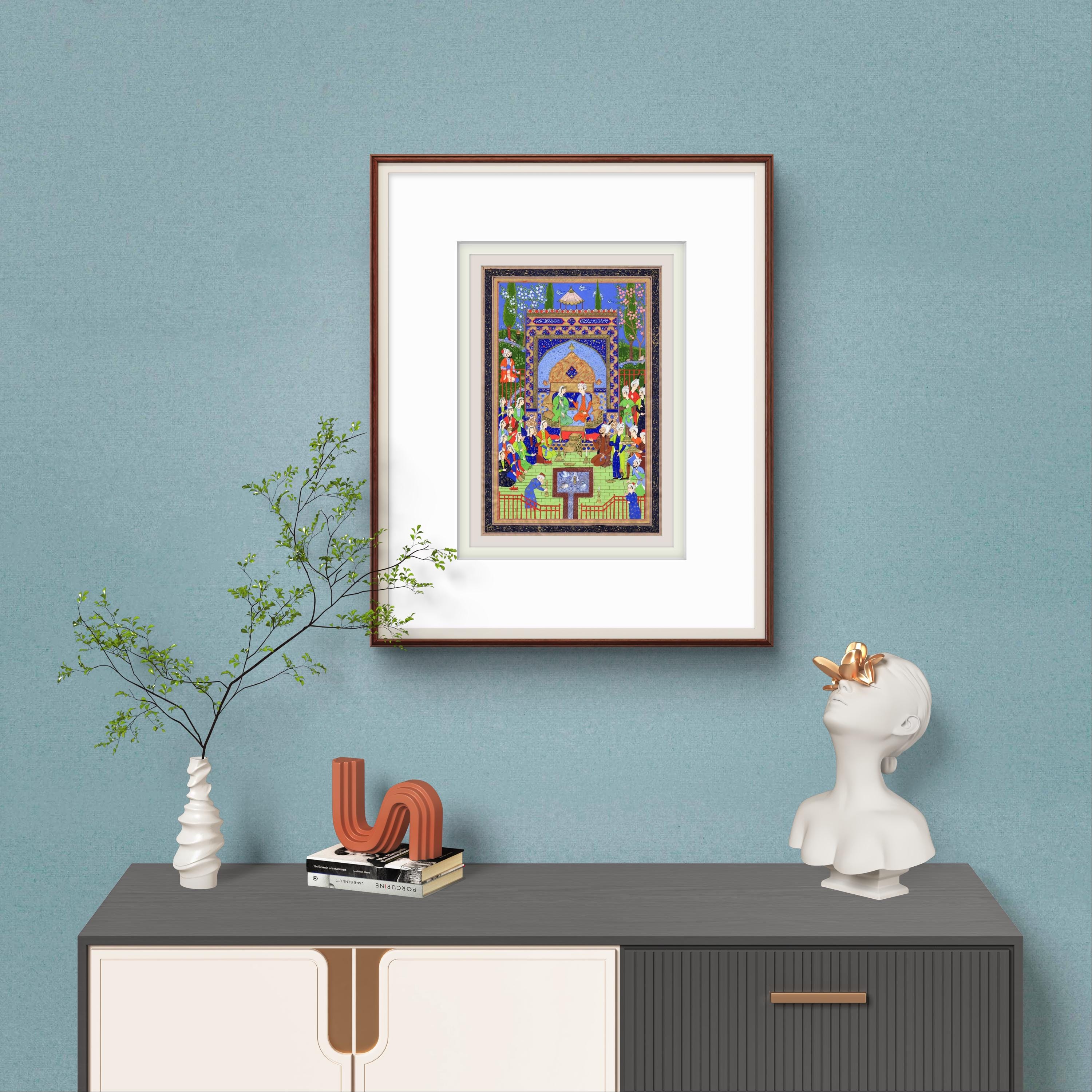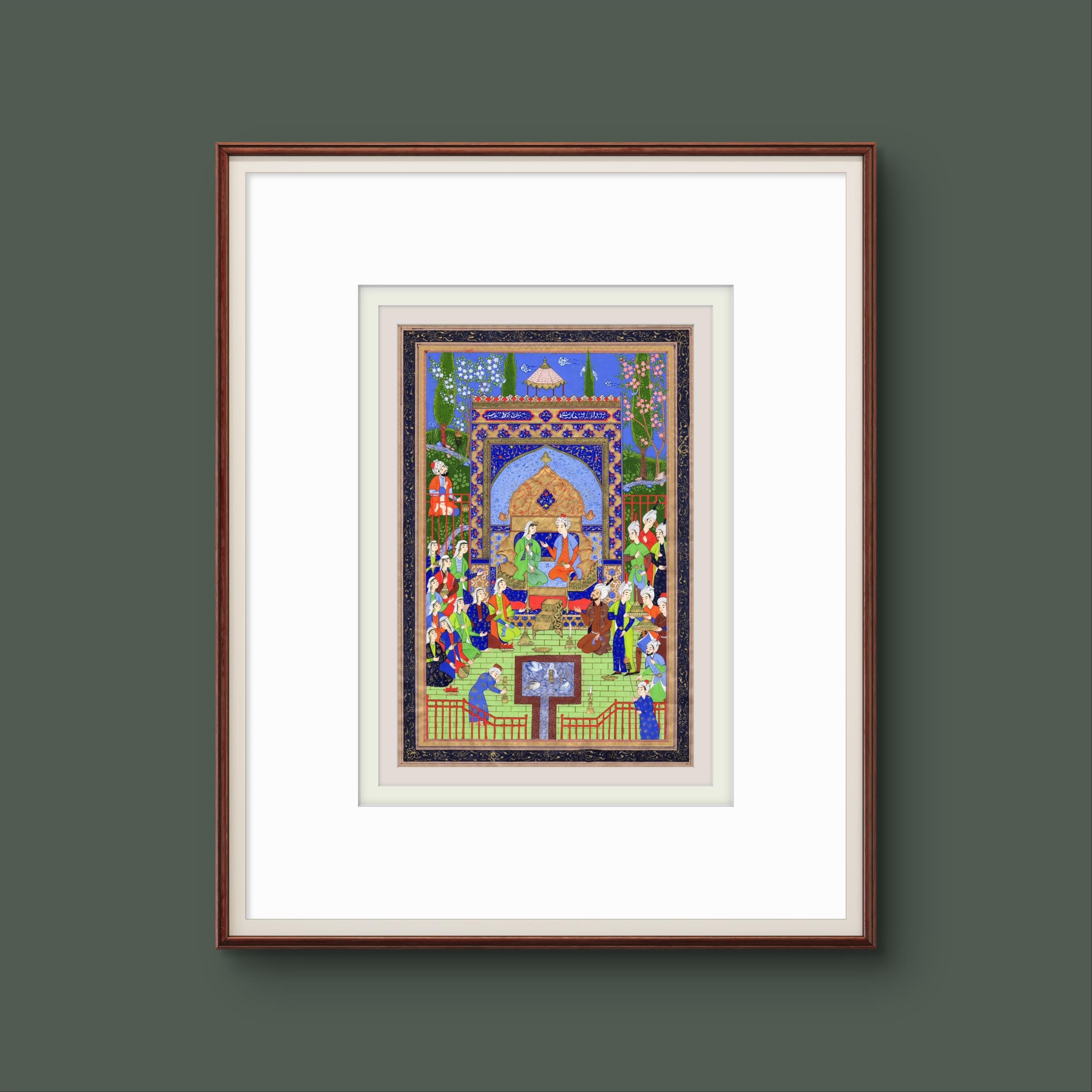 Painted meticulously on handcrafted mulberry paper, the reproduction showcases the vibrant palette, gold detailing, and precision brushwork true to the Tabriz school of miniature painting. Ornate textiles, intricate architecture, and expressive faces are rendered with masterful care—each element a tribute to the beauty and emotion woven into Persian art traditions.