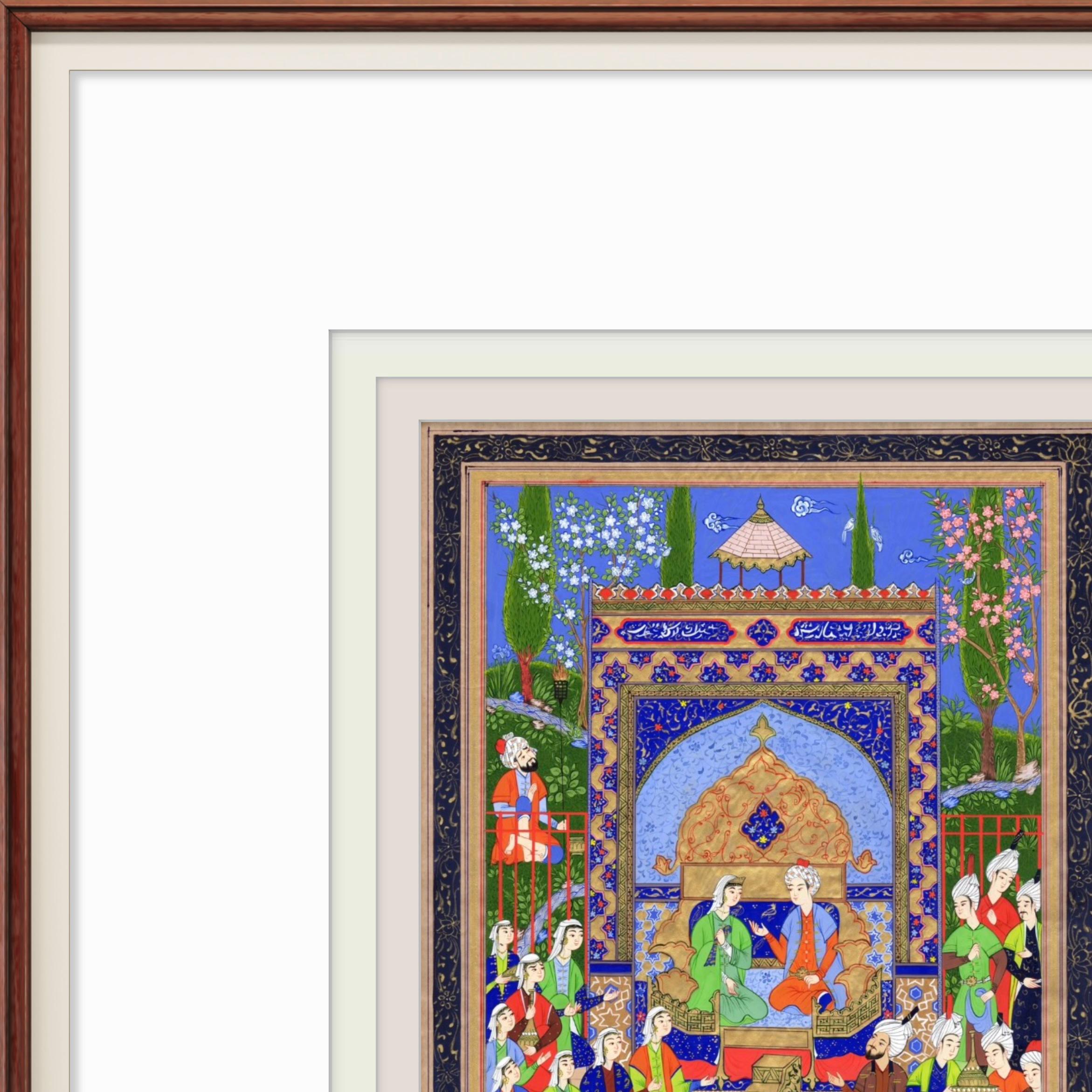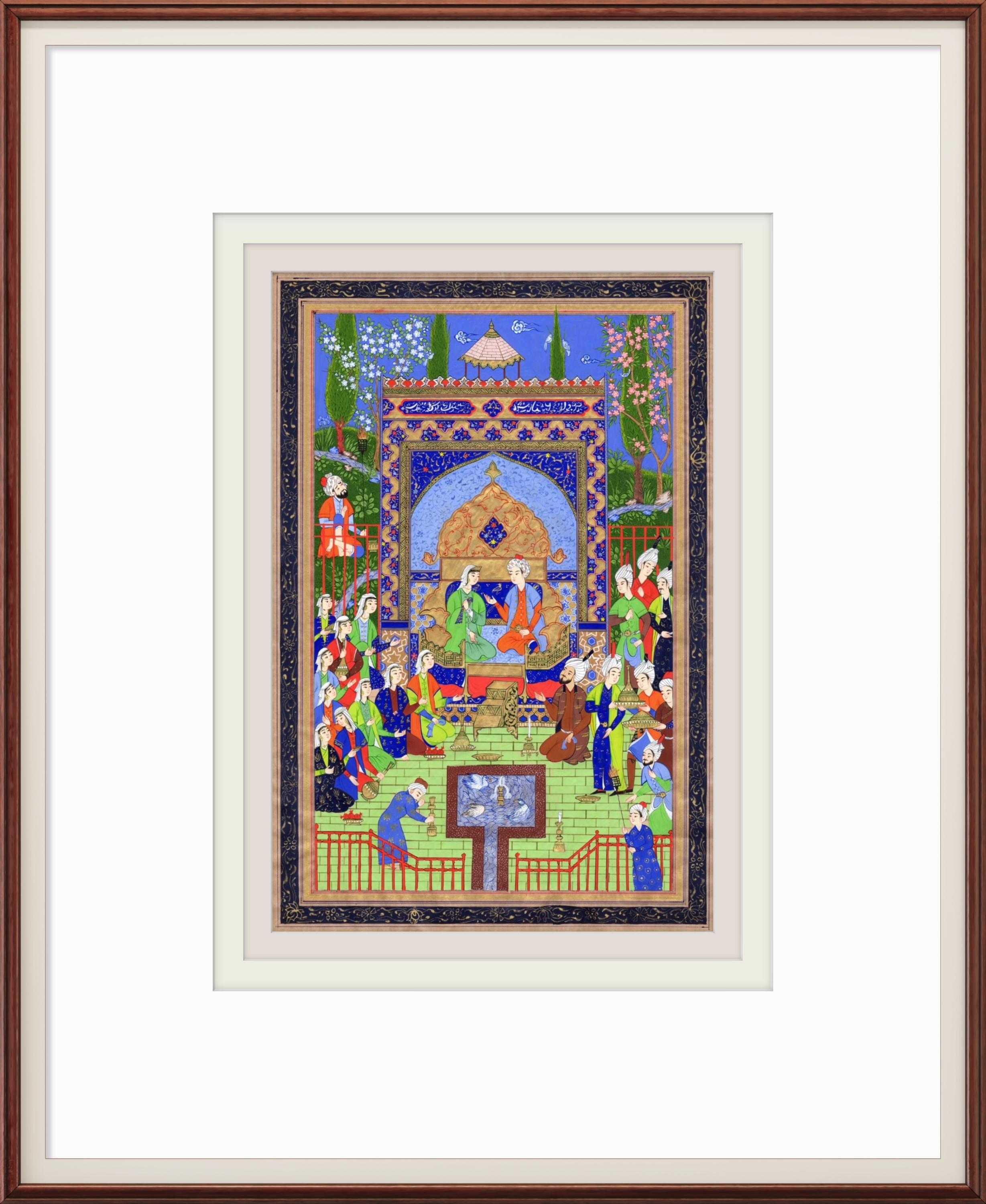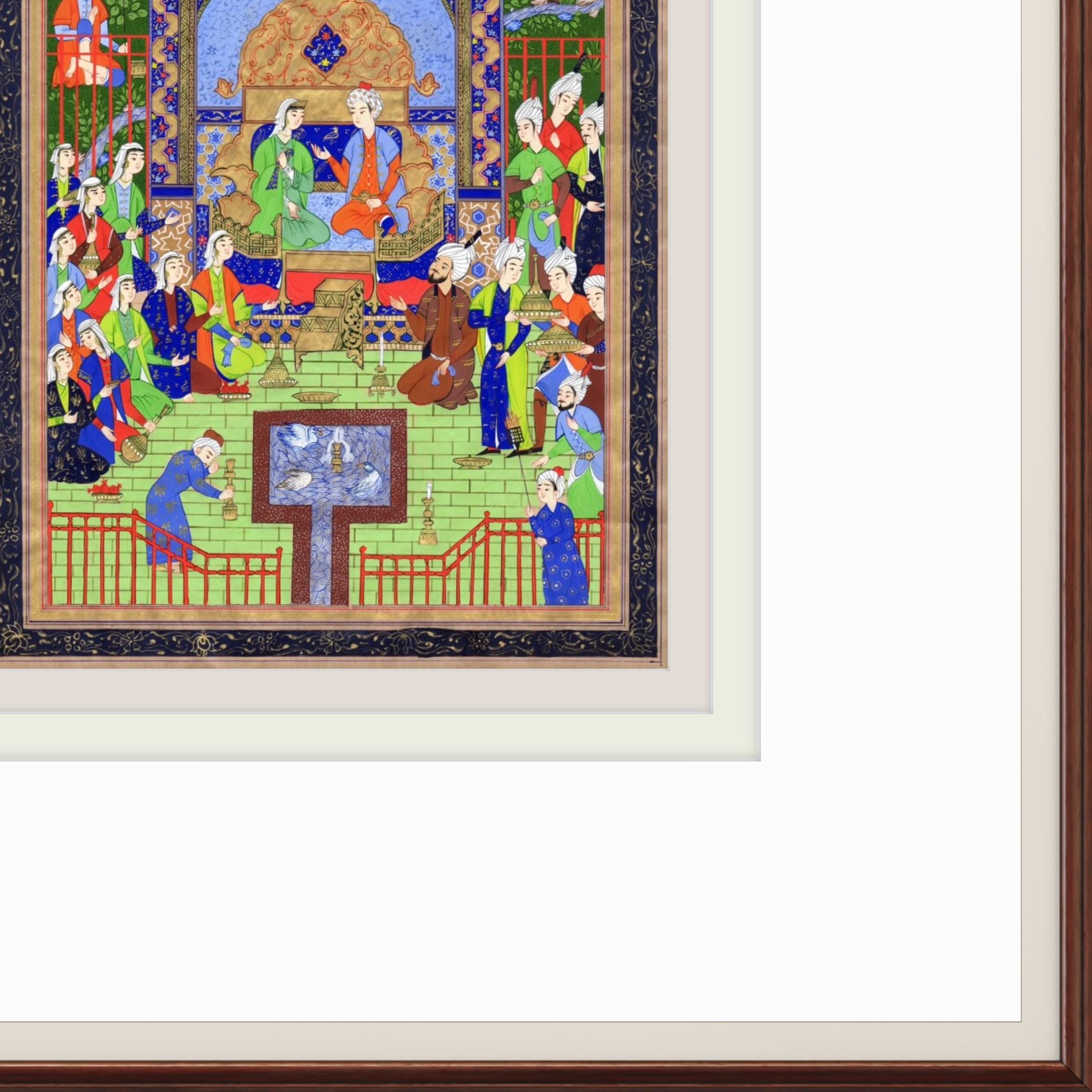Painted meticulously on handcrafted mulberry paper, the reproduction showcases the vibrant palette, gold detailing, and precision brushwork true to the Tabriz school of miniature painting. Ornate textiles, intricate architecture, and expressive faces are rendered with masterful care—each element a tribute to the beauty and emotion woven into Persian art traditions.