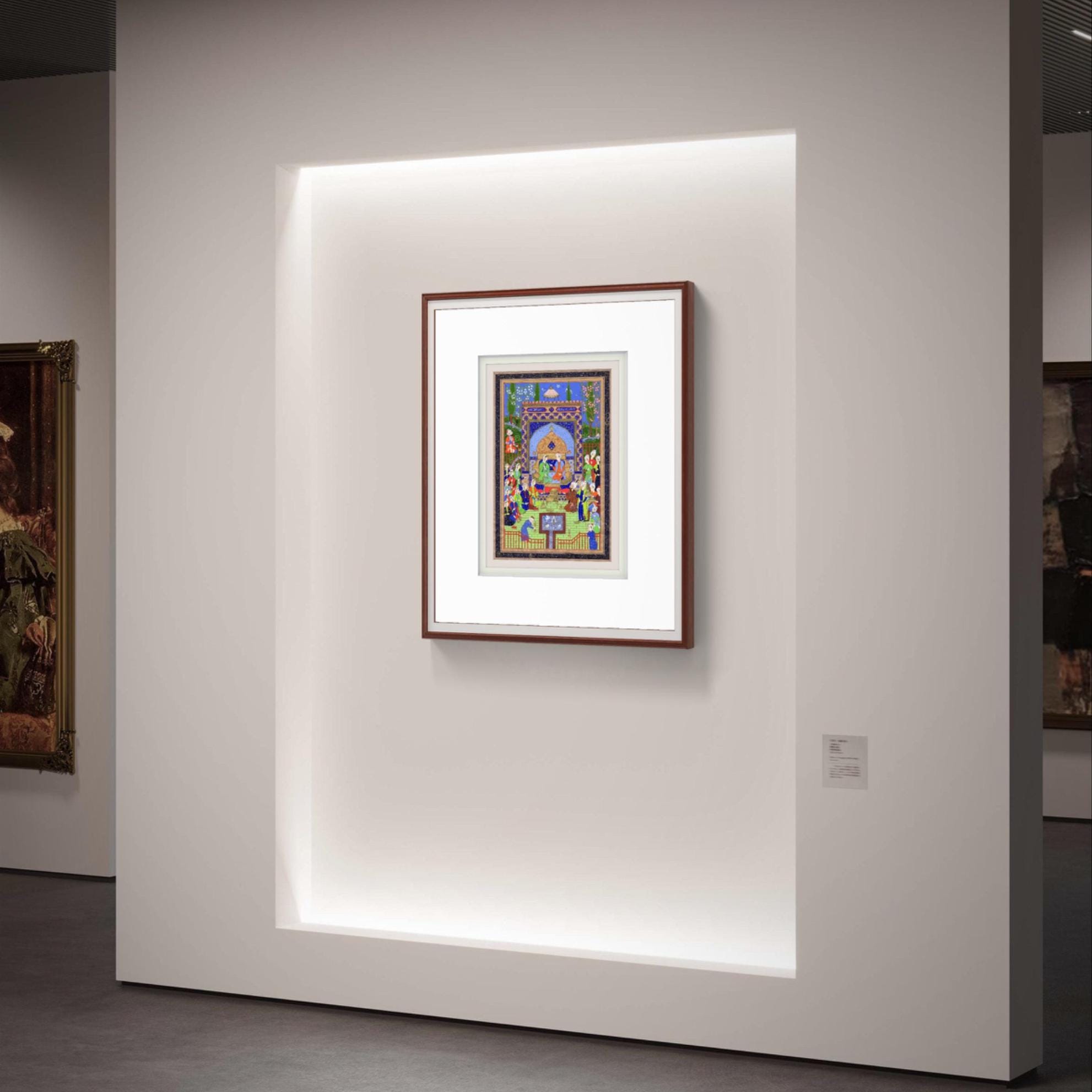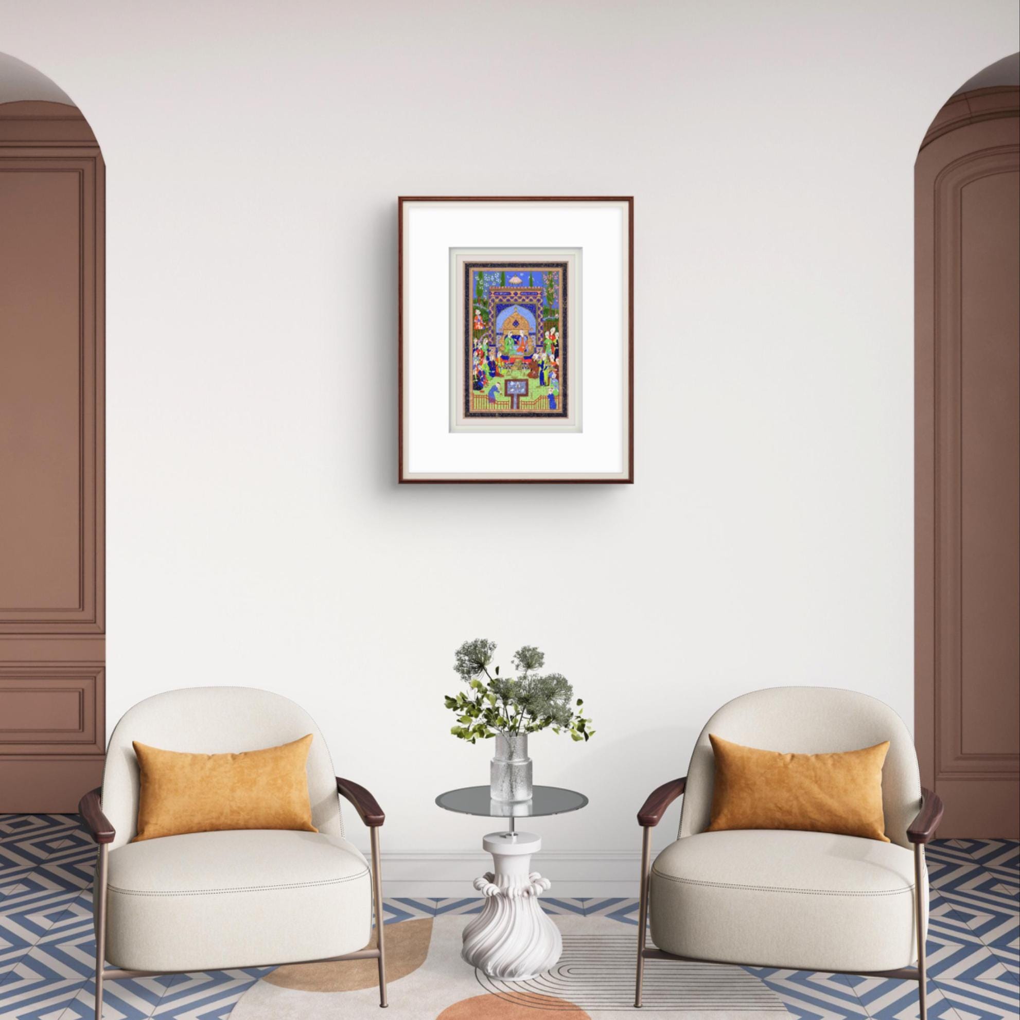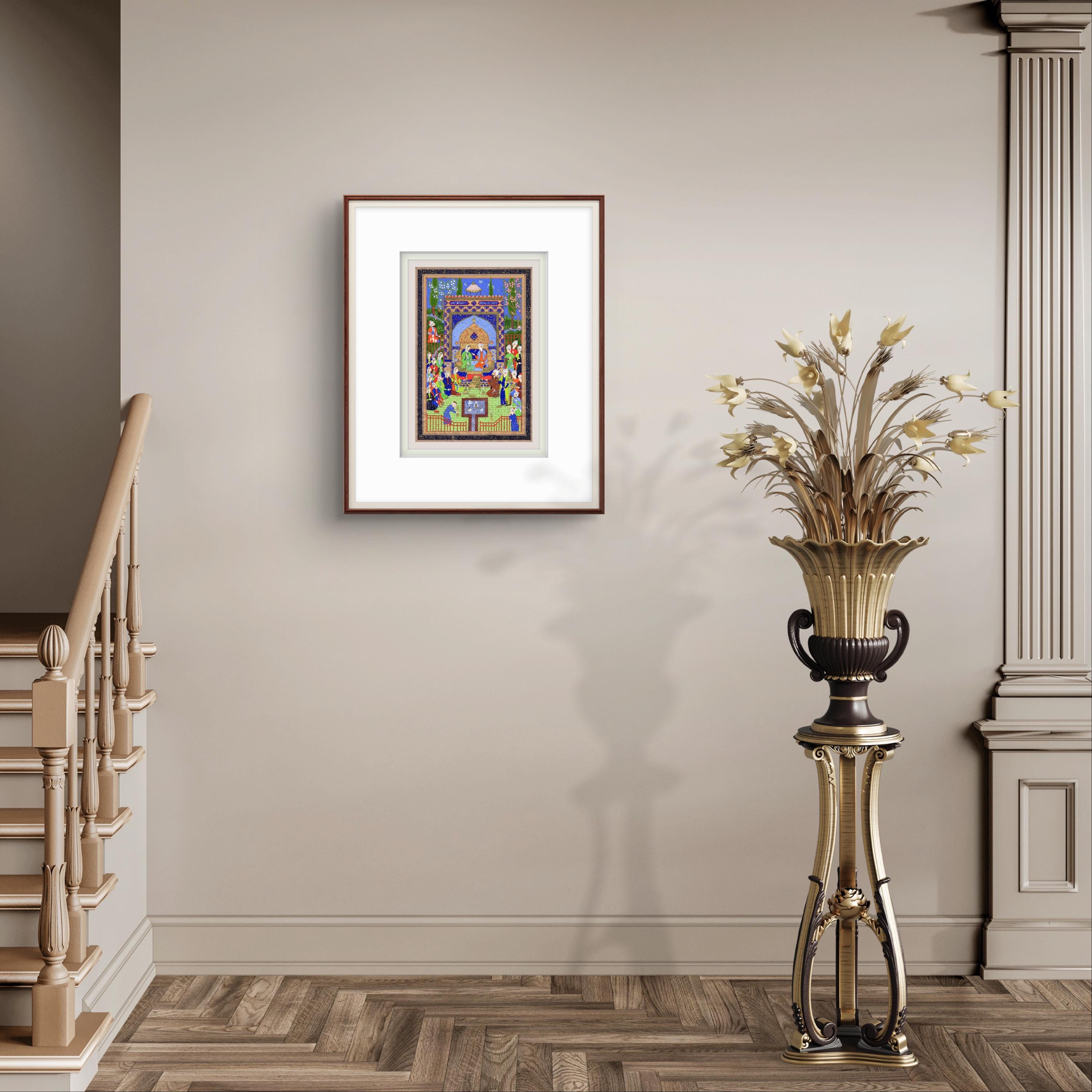 The scene portrays Khusraw and Shirin, one of Persian literature’s most beloved royal couples, seated gracefully and listening to tales told by Shirin’s maidens. Their romantic tale—filled with longing, loyalty, and cultural richness—has captivated hearts for centuries. This artwork brings that moment to life with elegance and intimacy, capturing the mood of a refined court gathering.