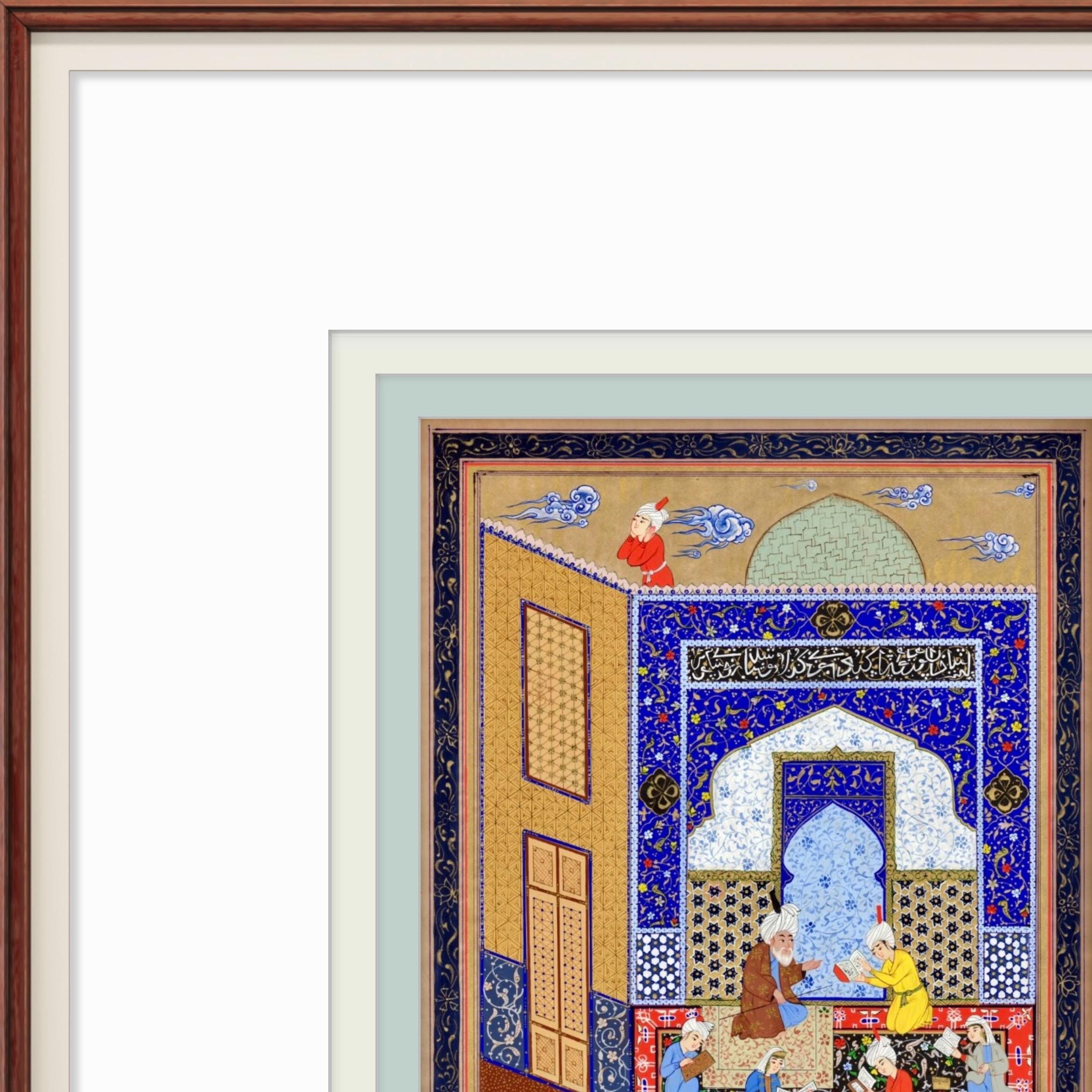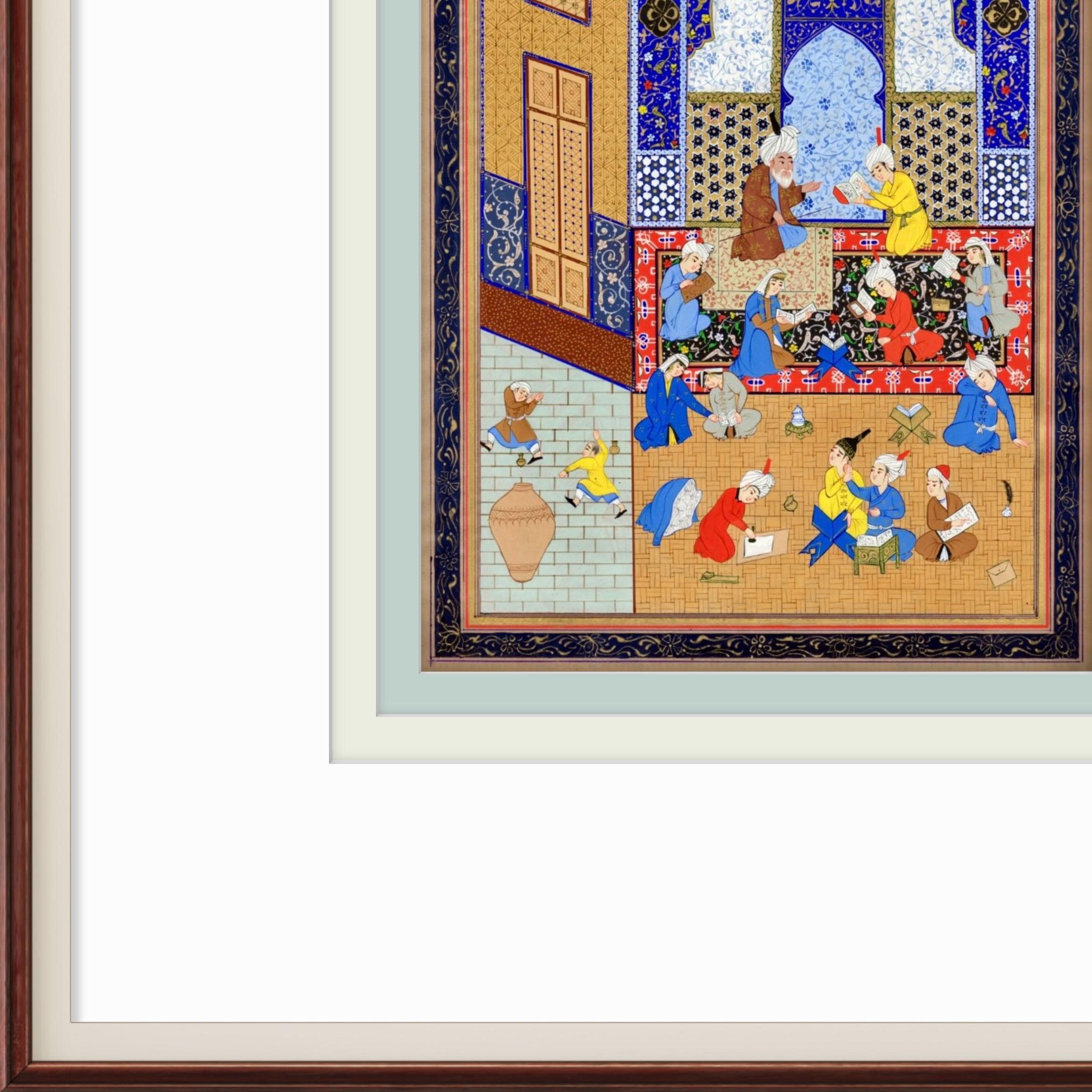 This hand-painted artwork is a faithful reproduction inspired by the celebrated Persian miniature “Laila and Majnun in the School,” Folio 129 from a Khamsa (Quintet) of Nizami Ganjavi, the great 12th-century Persian poet. The original masterpiece, created in the Safavid era (circa 1539–1543), is housed in The Metropolitan Museum of Art.