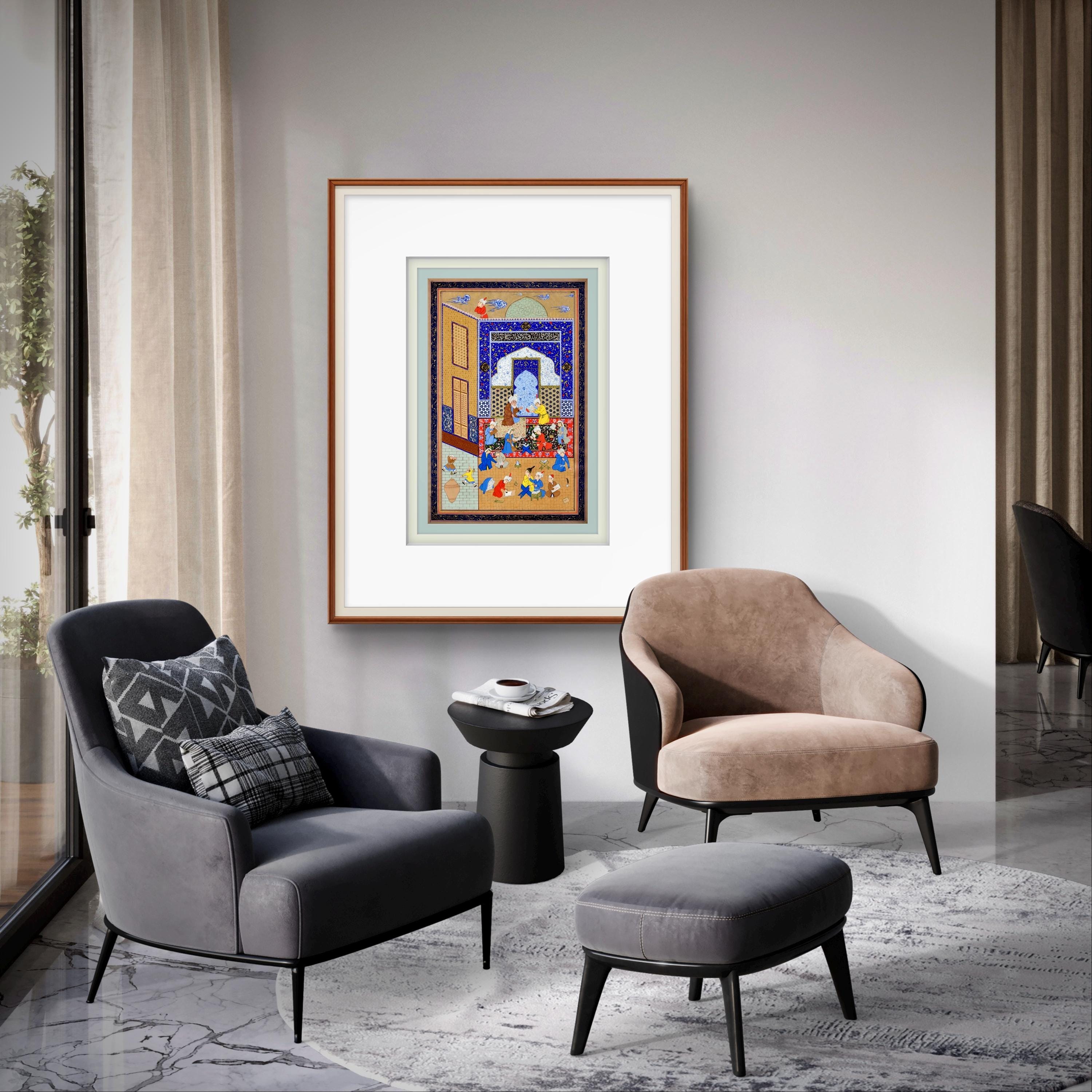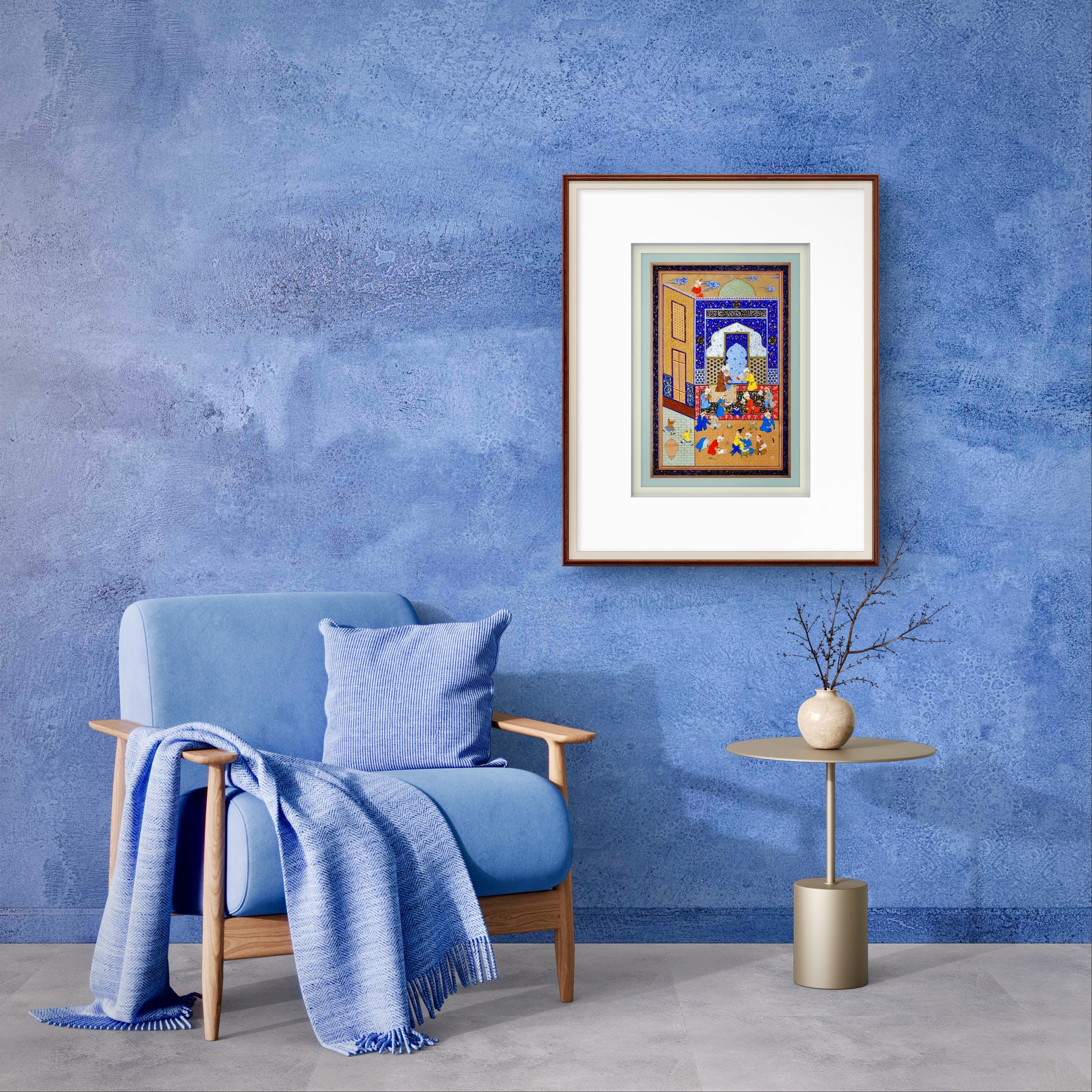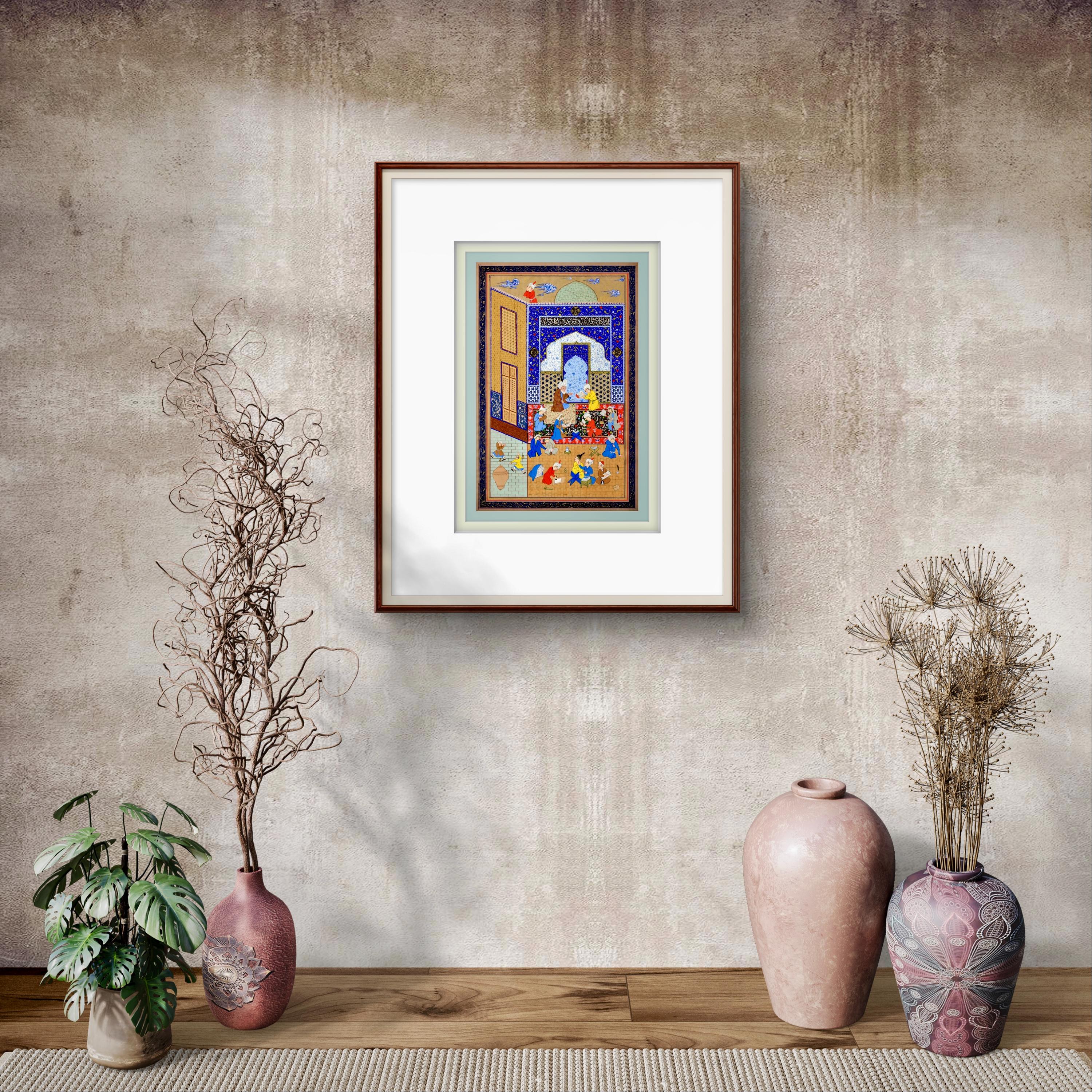 Rendered on handcrafted mulberry paper with the finest pigments, this reproduction reflects the brilliance of Safavid artistry. Every detail—from the tiled blue walls and richly woven carpets to the expressive figures—has been carefully revived to honor the spirit of Persian miniature tradition. The intricate linework, layered colors, and subtle gold accents capture the poetic beauty and emotional depth that define this timeless composition.